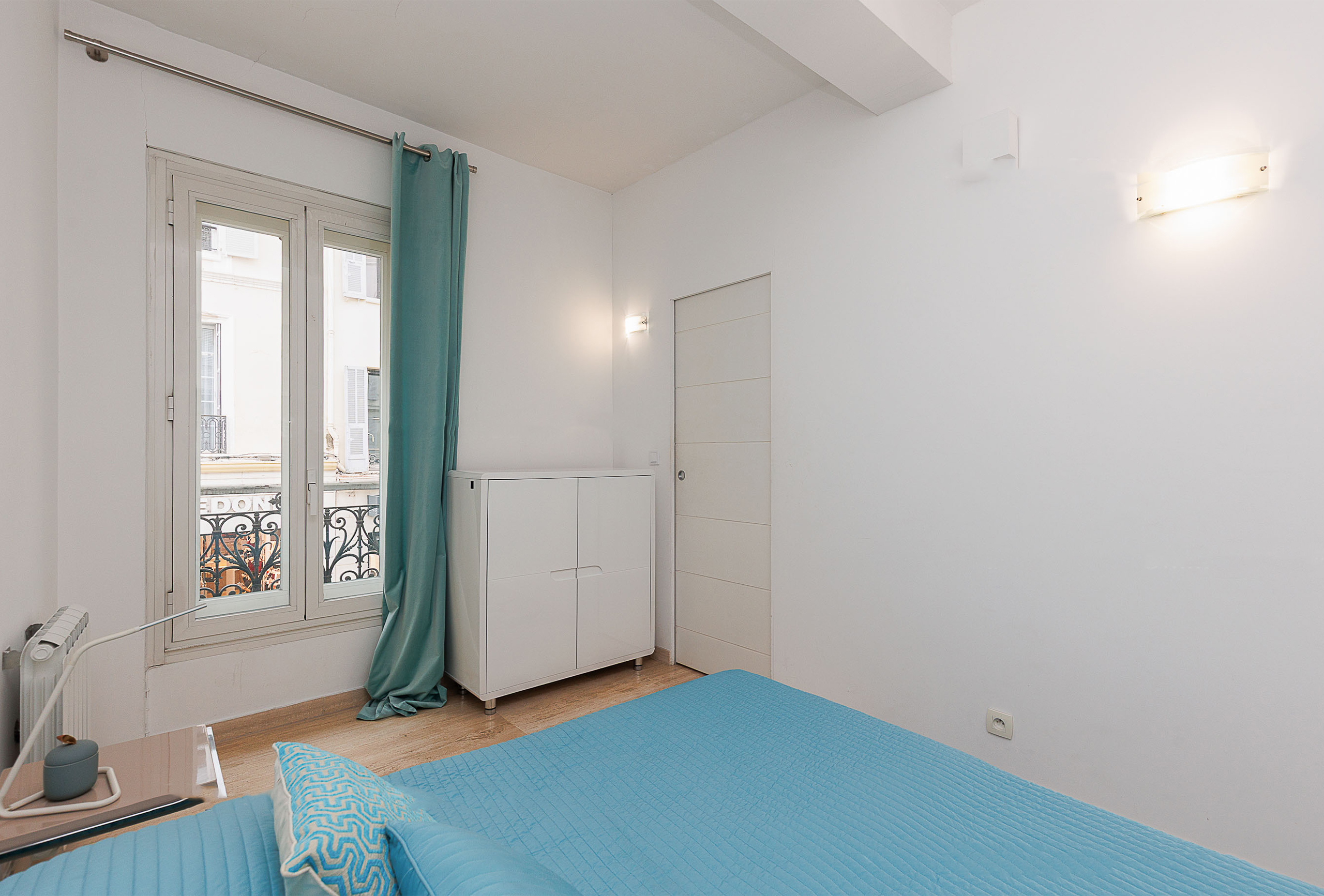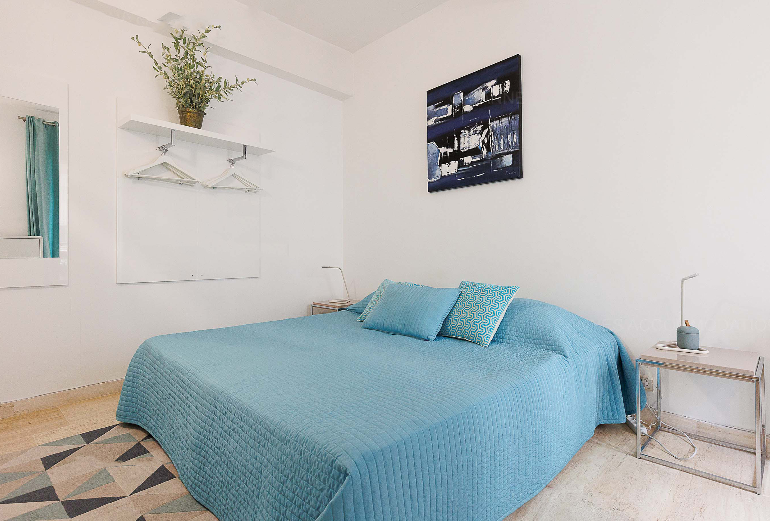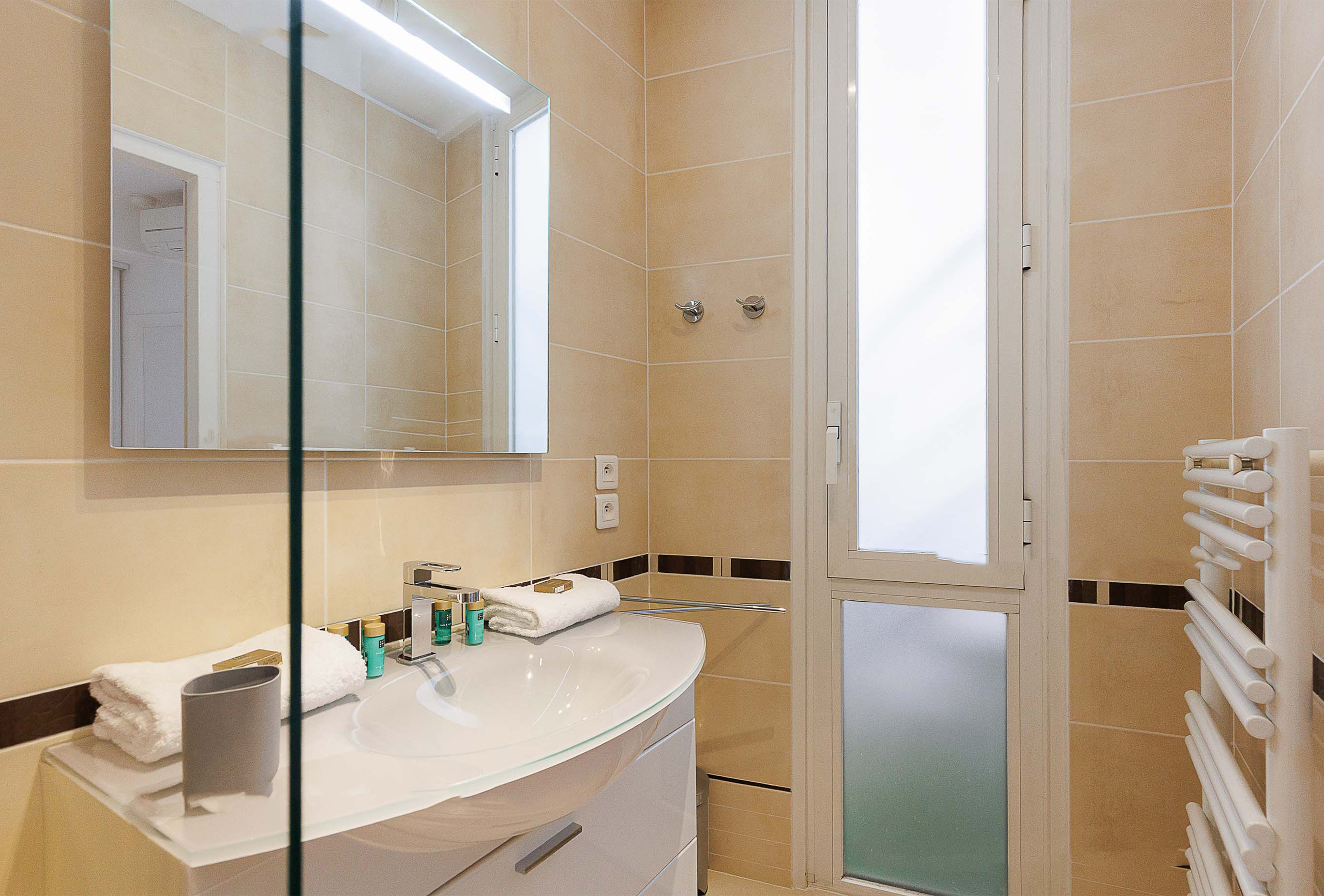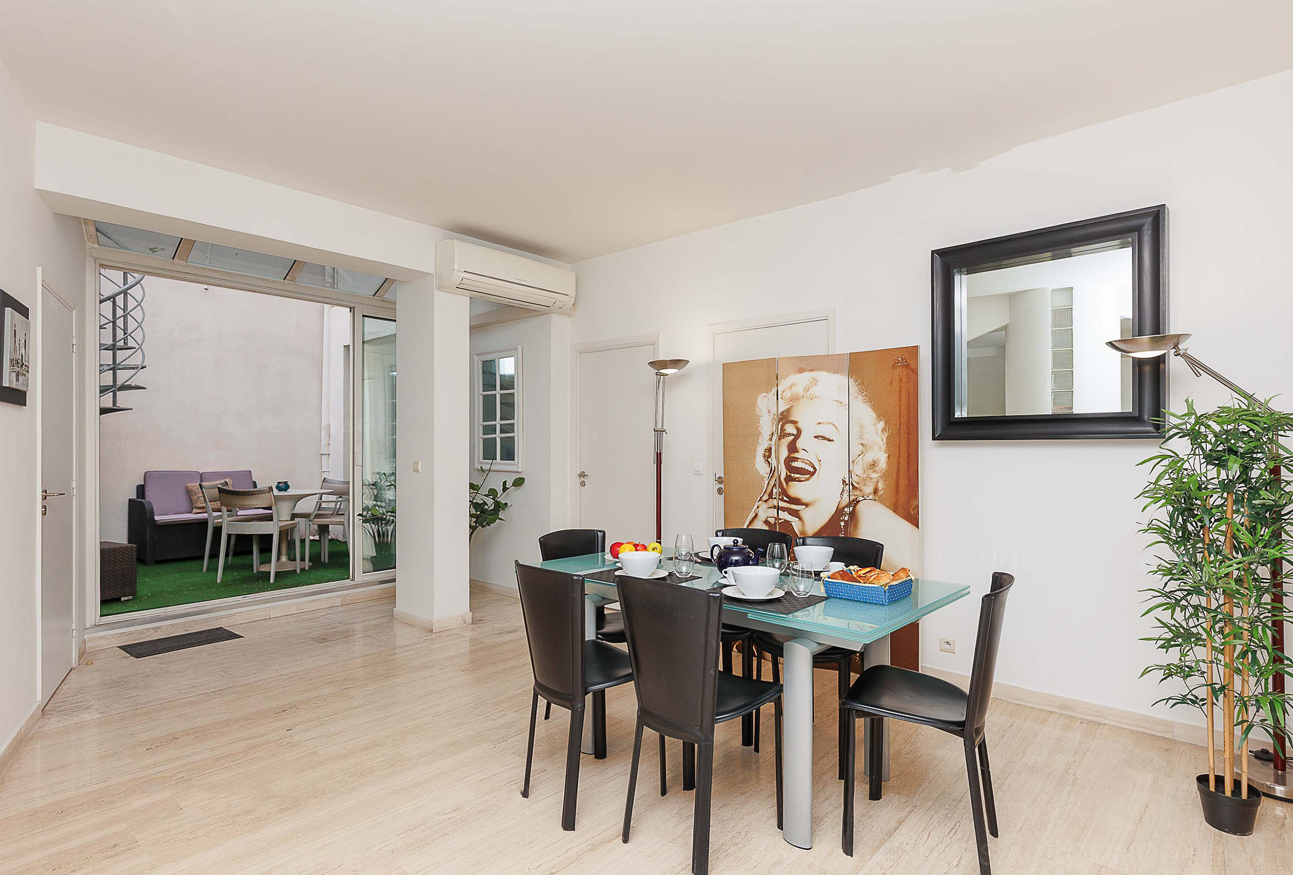 This light filled home benefits from an excellent location a couple of steps away only from the convention center. Nested on the first floor without lift of a small well-maintained residence, the apartment offers 3 bedrooms and 3 bathrooms in a sober modern décor. The vast main room is organized in two areas: the living area with TV and the dining area opening onto a sunny patio. The three bedrooms have each two single beds that we can combine into a double if you wish. Two of the rooms are at the back next to the patio. The third one looks over the rue d’Antibes but it is very well sound insulated thanks to a quadruple glazing. Two of the bedrooms have an en-suite bathroom with shower. One of them also has toilets. The third bathroom is independent. It has a shower cabin and toilets. The sophisticated kitchen, all in white, is fully equipped. You will be seduced by this modern minimalist apartment. You will be able to combine a perfect location with generous living spaces and the possibility to welcome up to 6 guests.