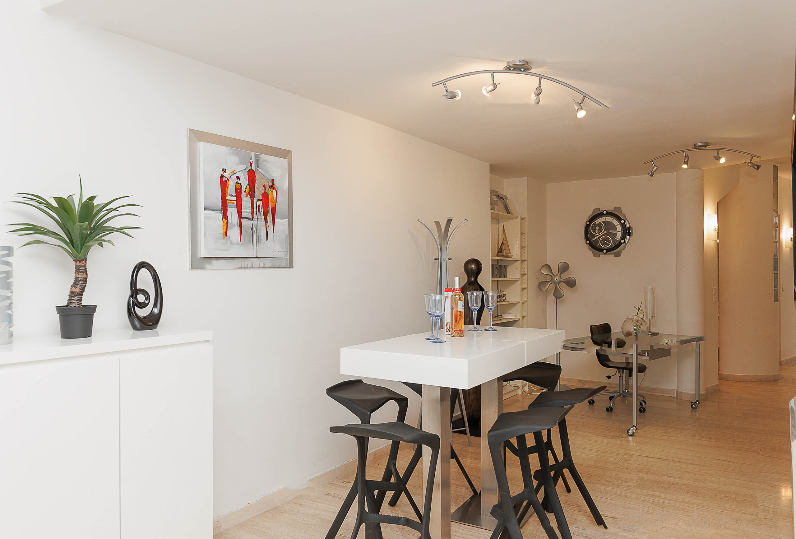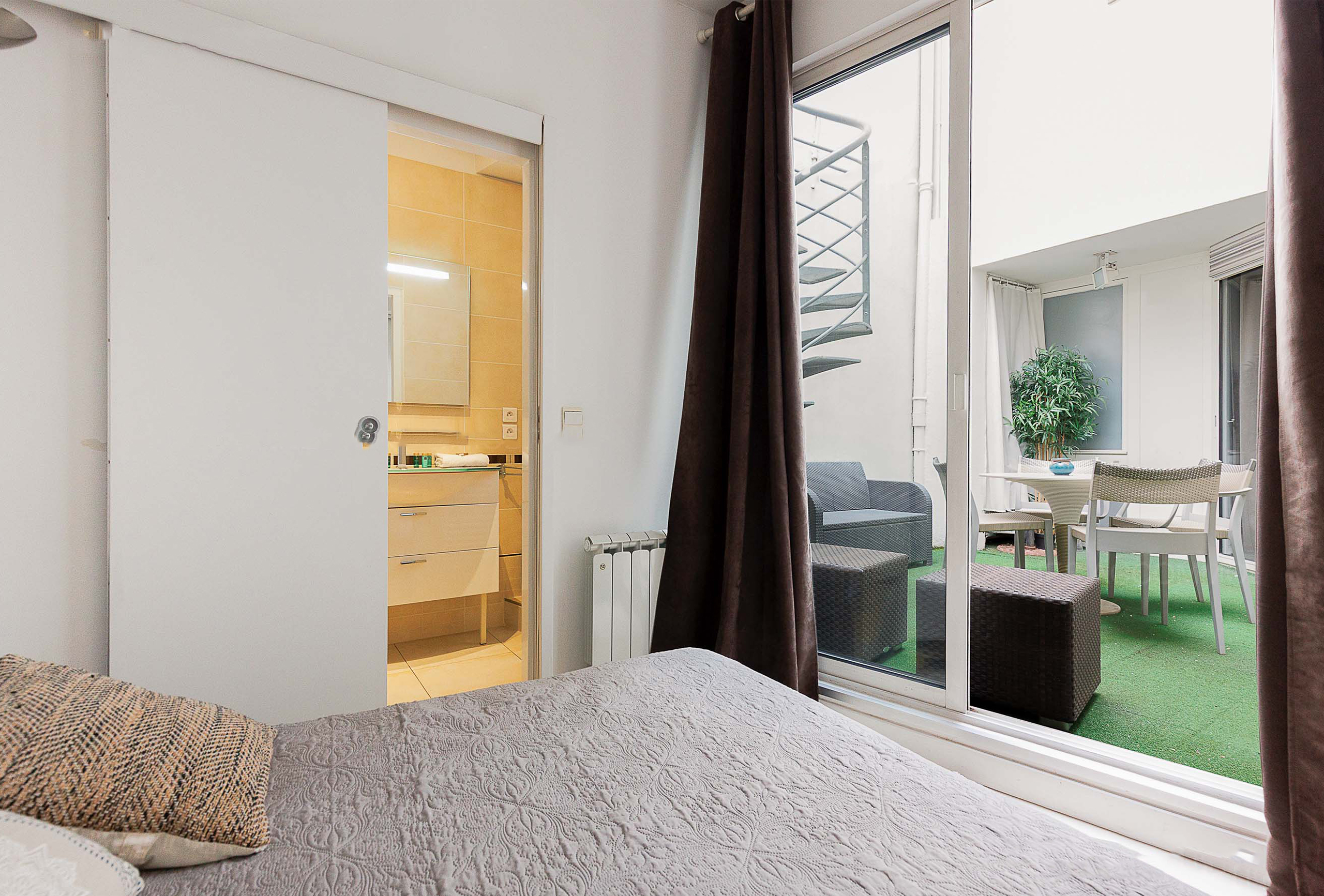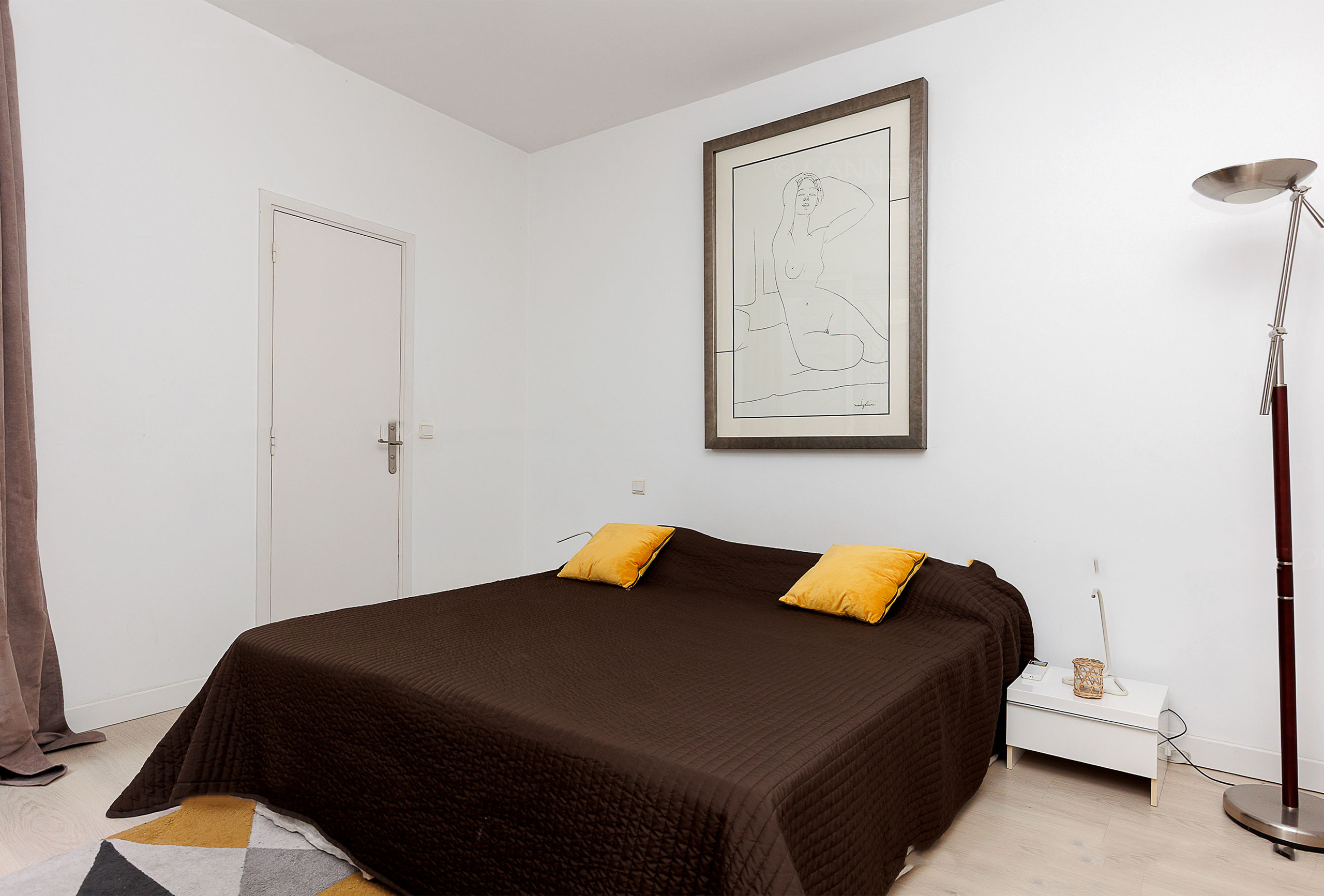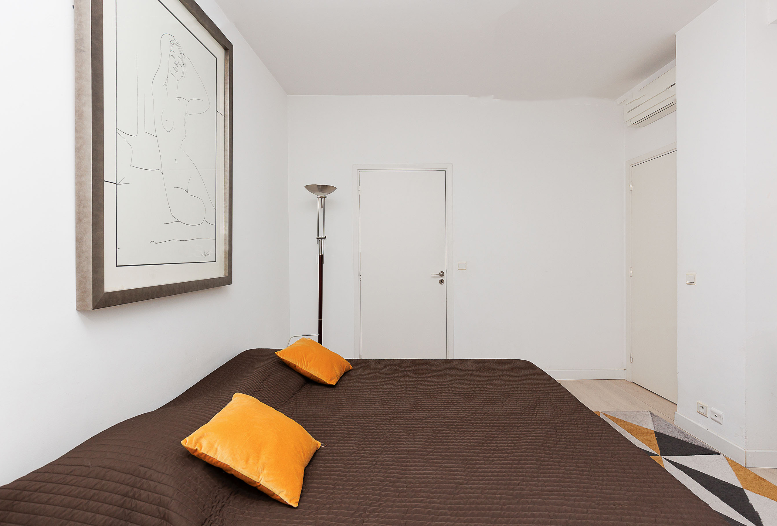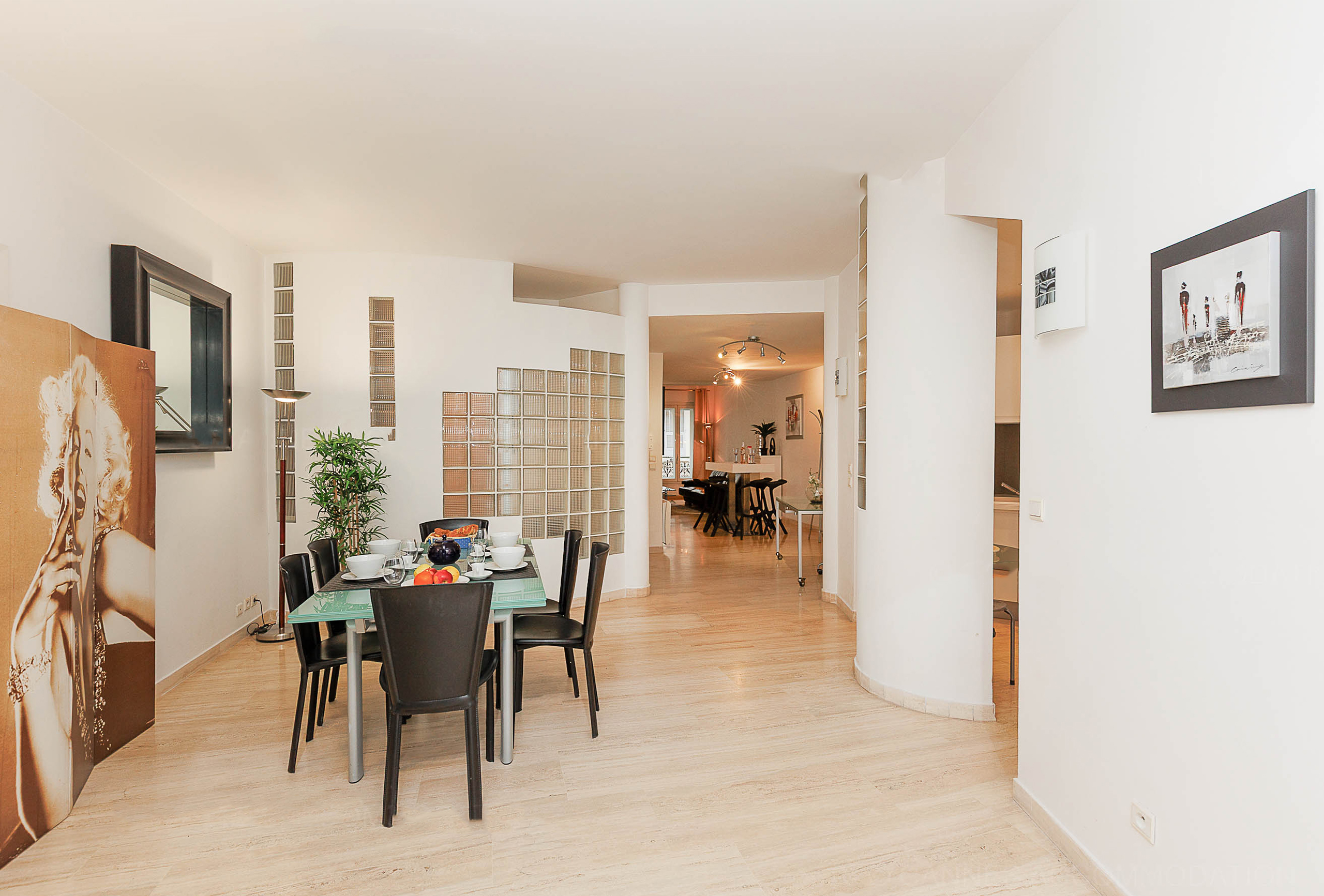 This light filled home benefits from an excellent location a couple of steps away only from the convention center. Nested on the first floor without lift of a small well-maintained residence, the apartment offers 3 bedrooms and 3 bathrooms in a sober modern décor. The vast main room is organized in two areas: the living area with TV and the dining area opening onto a sunny patio. The three bedrooms have each two single beds that we can combine into a double if you wish. Two of the rooms are at the back next to the patio. The third one looks over the rue d’Antibes but it is very well sound insulated thanks to a quadruple glazing. Two of the bedrooms have an en-suite bathroom with shower. One of them also has toilets. The third bathroom is independent. It has a shower cabin and toilets. The sophisticated kitchen, all in white, is fully equipped. You will be seduced by this modern minimalist apartment. You will be able to combine a perfect location with generous living spaces and the possibility to welcome up to 6 guests.