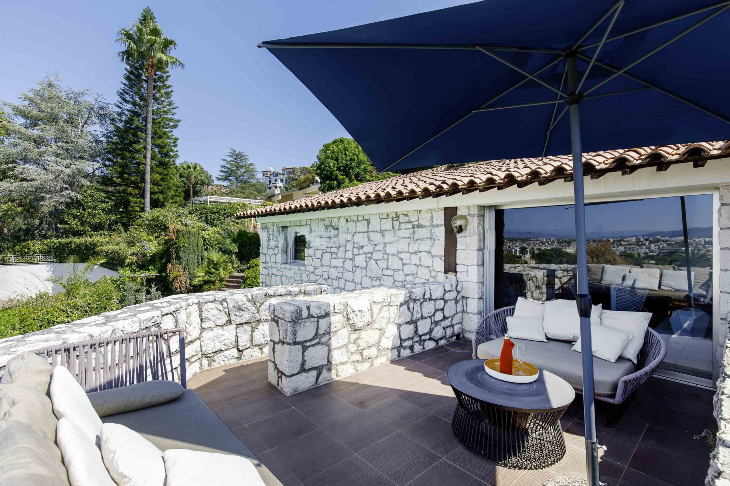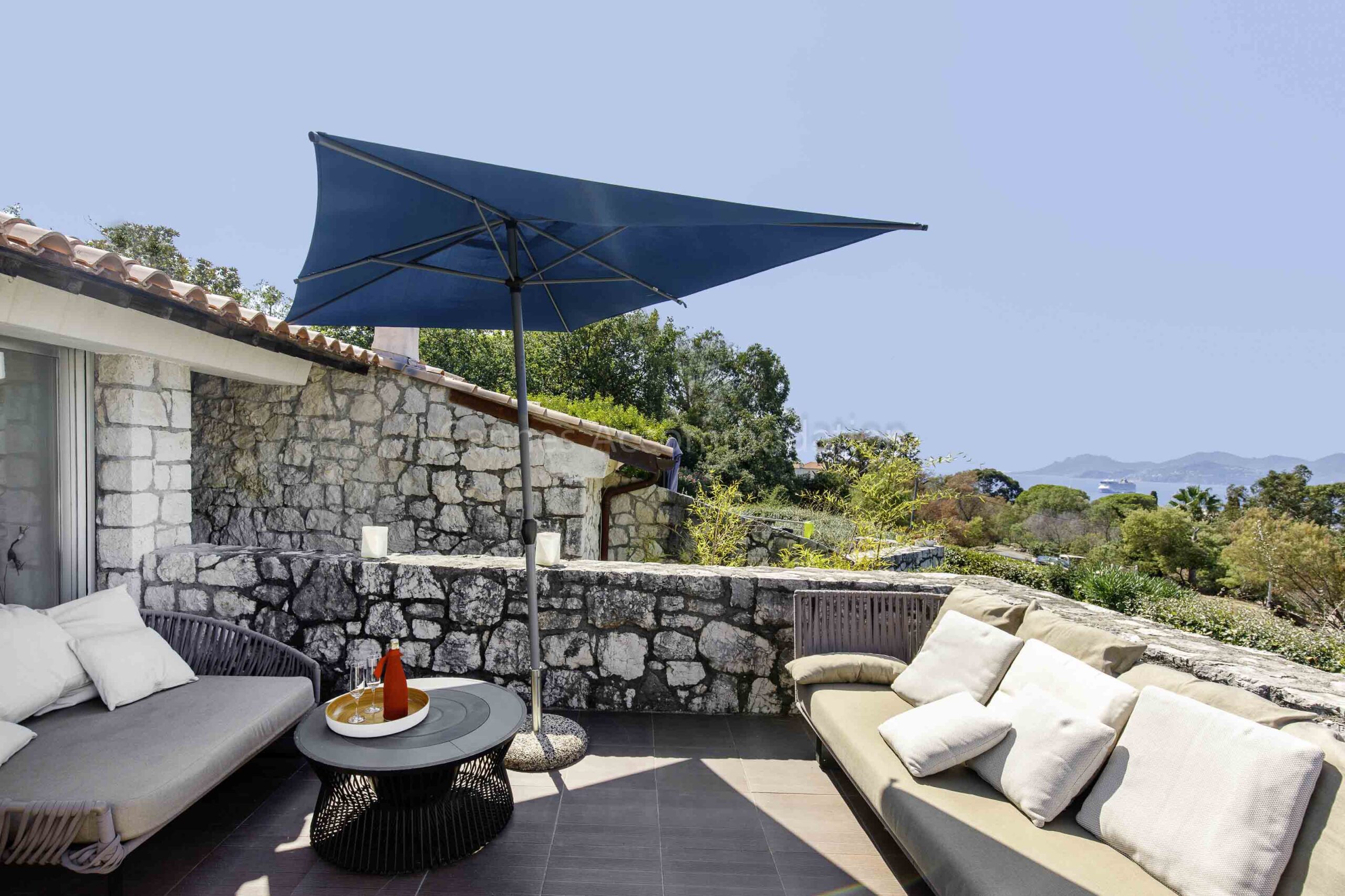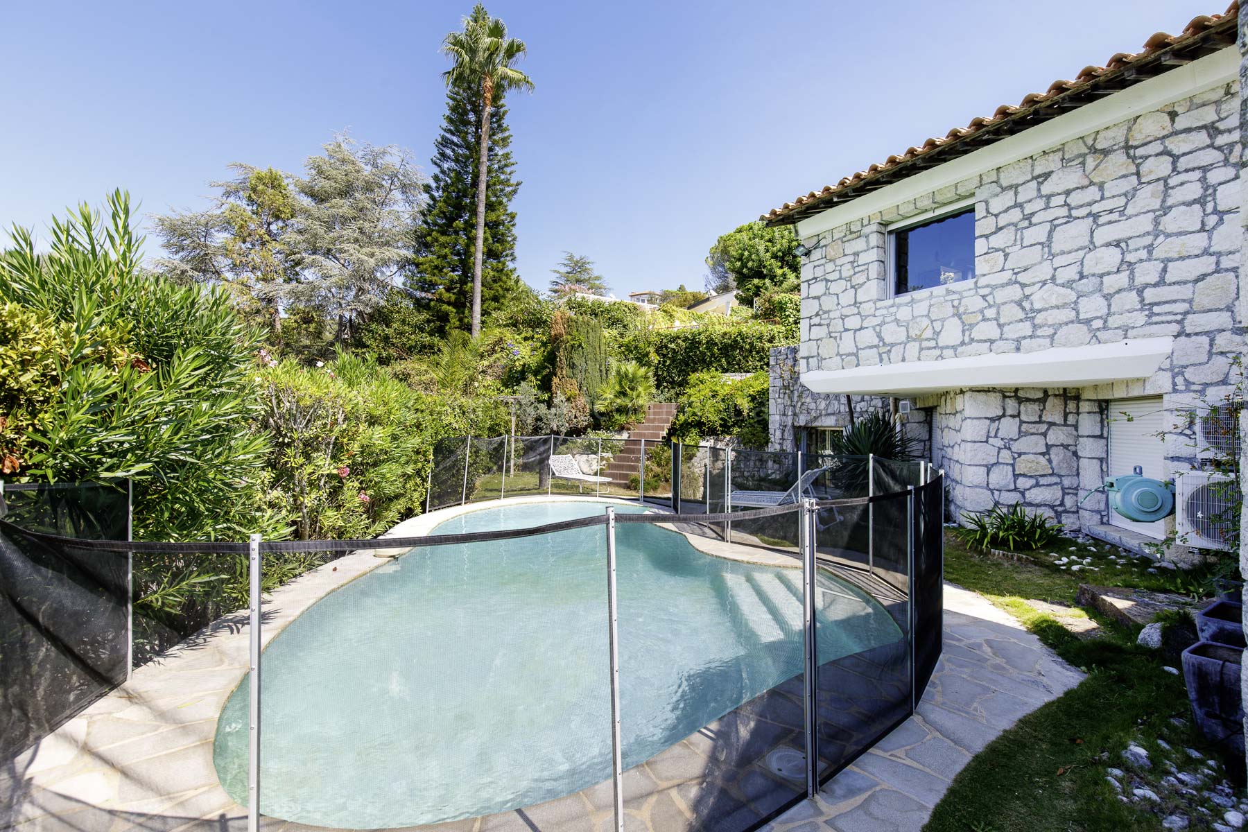 Located in the heart of Cannes, about 1.4 km from the Croisette and the beaches, this charming sea view villa sits in a small, secure residential domain of 12 villas. Set on a 500 sqm plot, it features a private fenced swimming pool with steps (8 m x 4 m, depth 0.80 m to 2.20 m), plus terraces furnished with outdoor seating and sun loungers. There’s also on site parking. A bus stop is right outside the domain, with shops and restaurants around 500 m away. The Palais des Festivals is about 3 km from the villa.