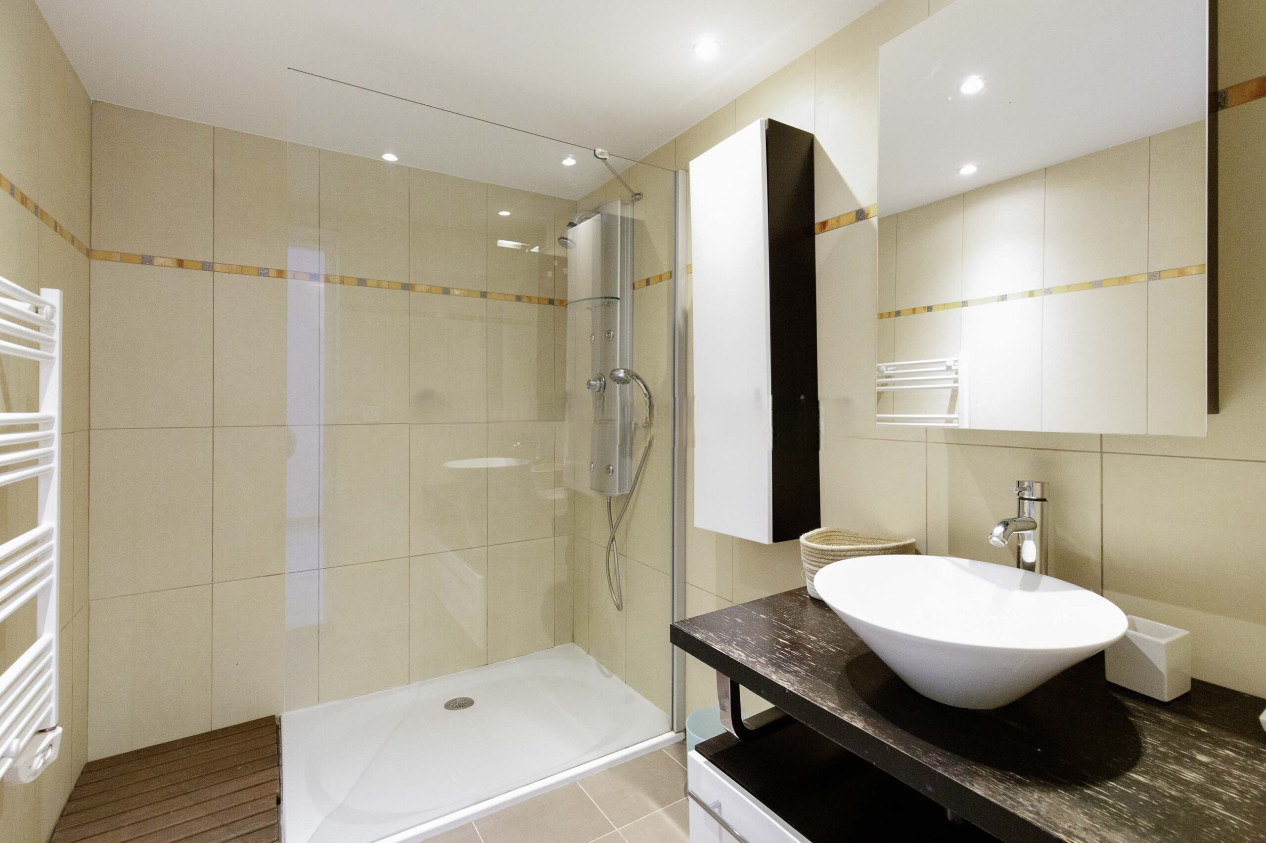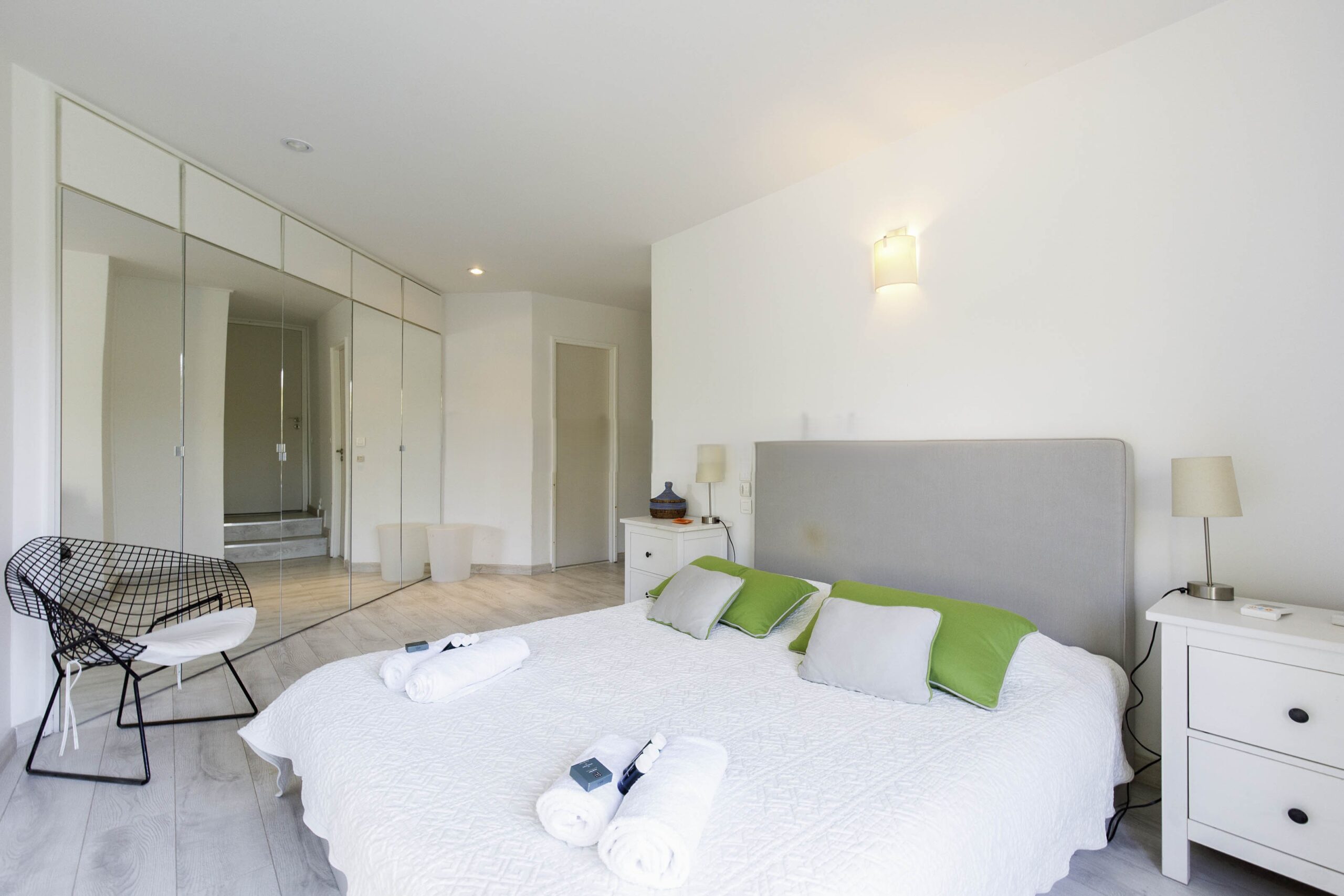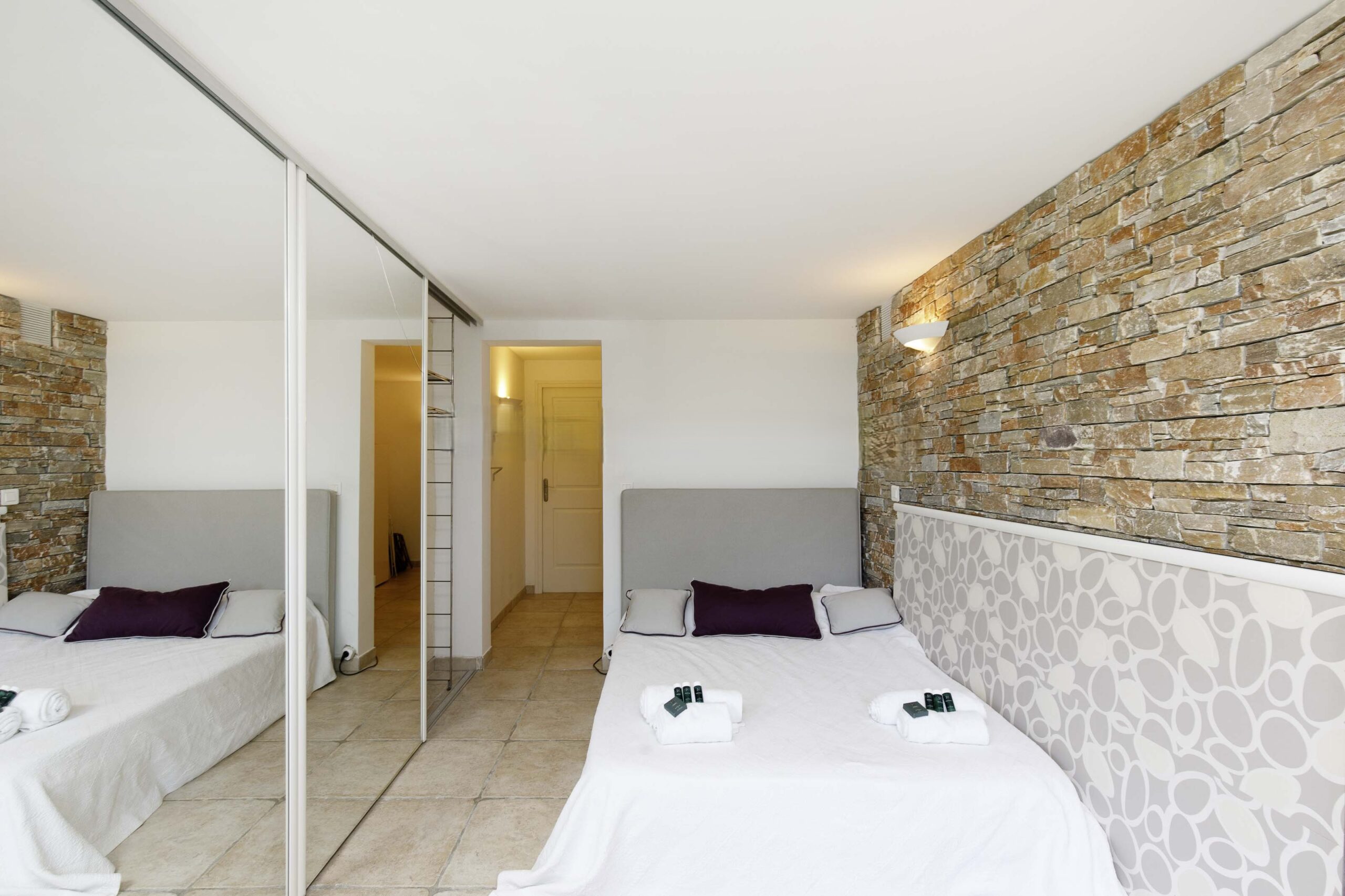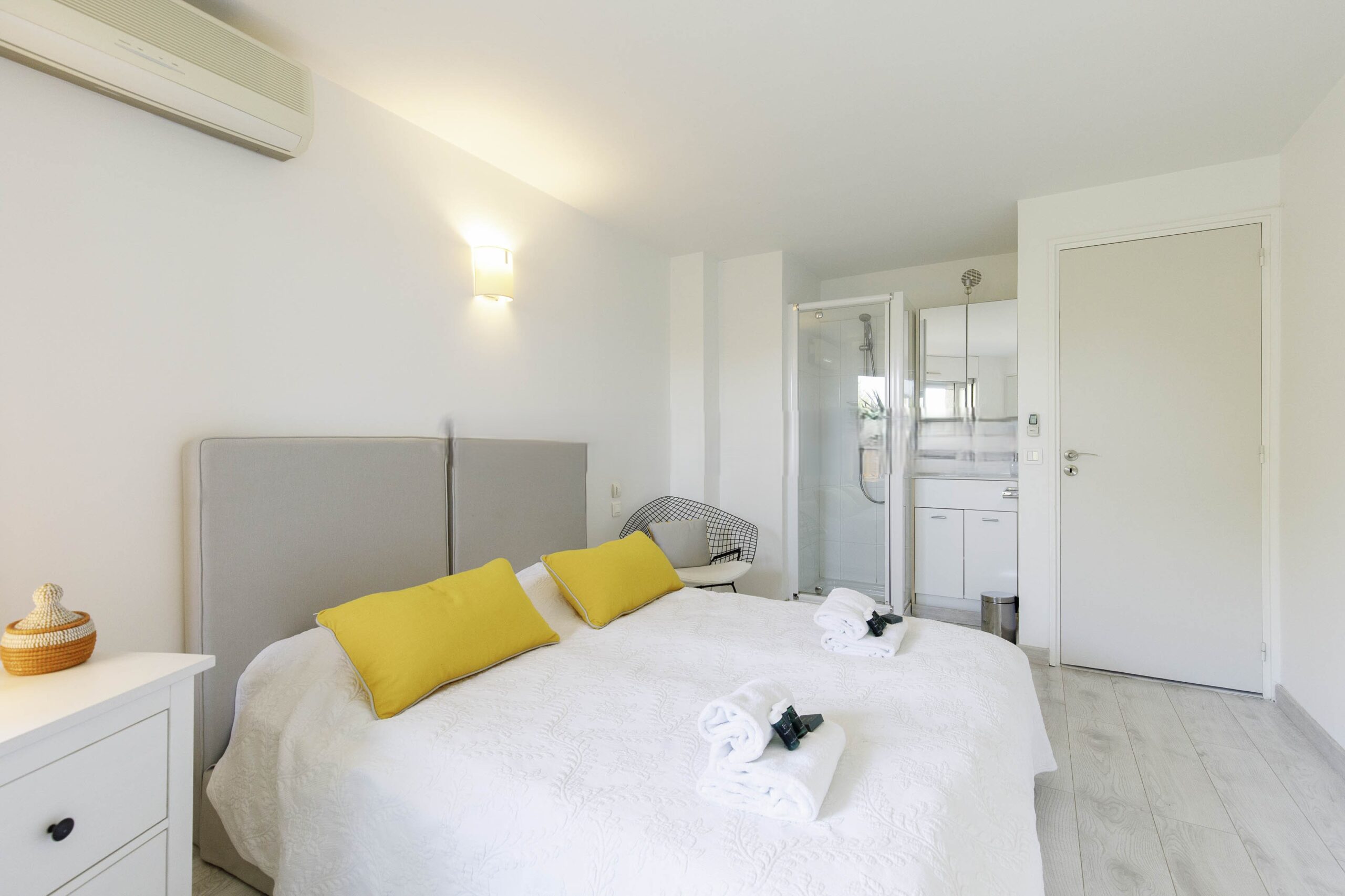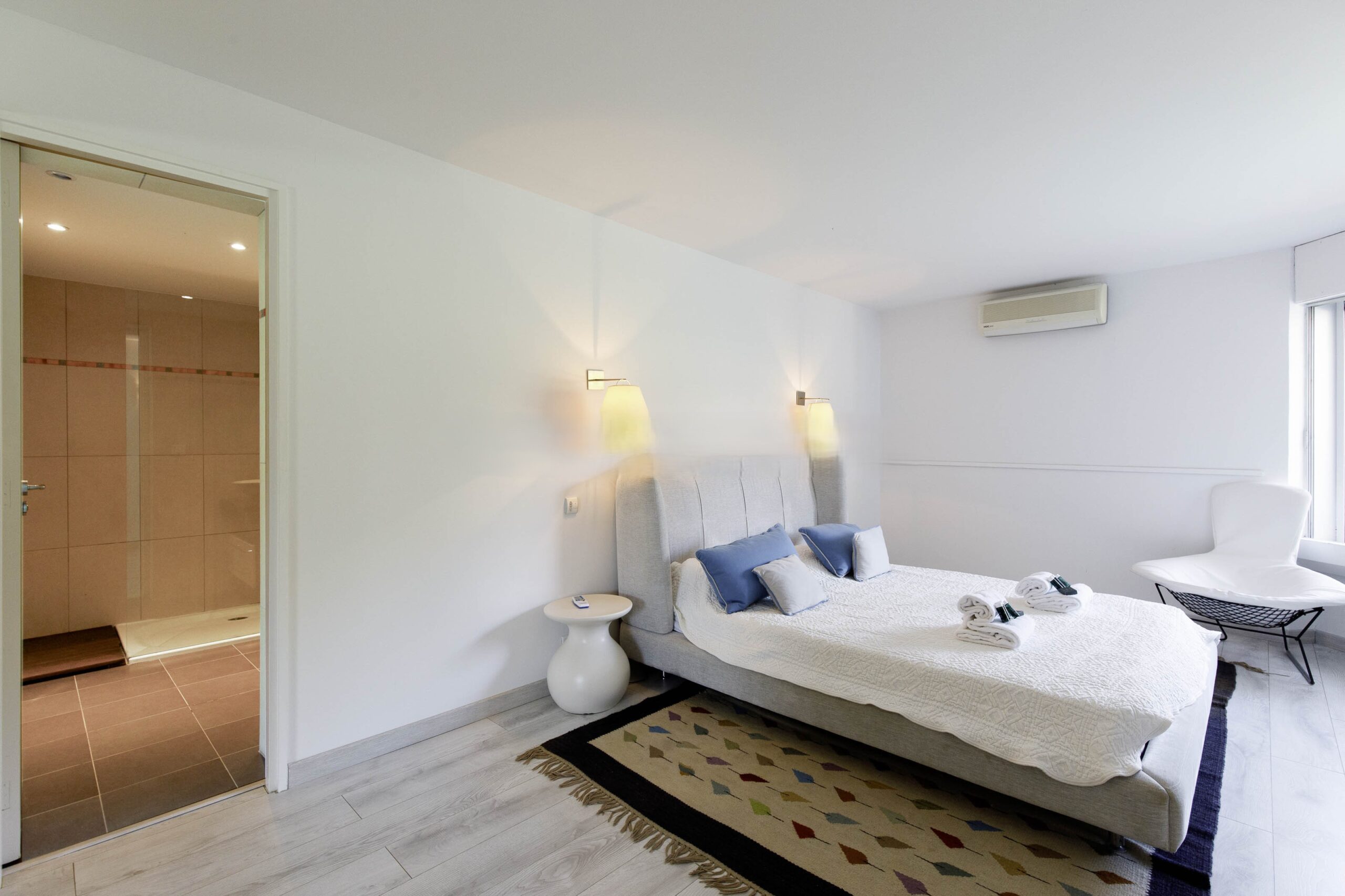 On the pool level, there is a master bedroom with a 160 cm double bed and an en suite shower room. A second bedroom has two single beds (2 x 80 cm) and its own shower room. There is also a separate toilet. A third bedroom has a 140 cm double bed and direct access to the pool, with a bathroom. In addition, the pool house includes an independent bedroom with a 140 cm double bed, plus a bathroom with shower and a separate toilet.