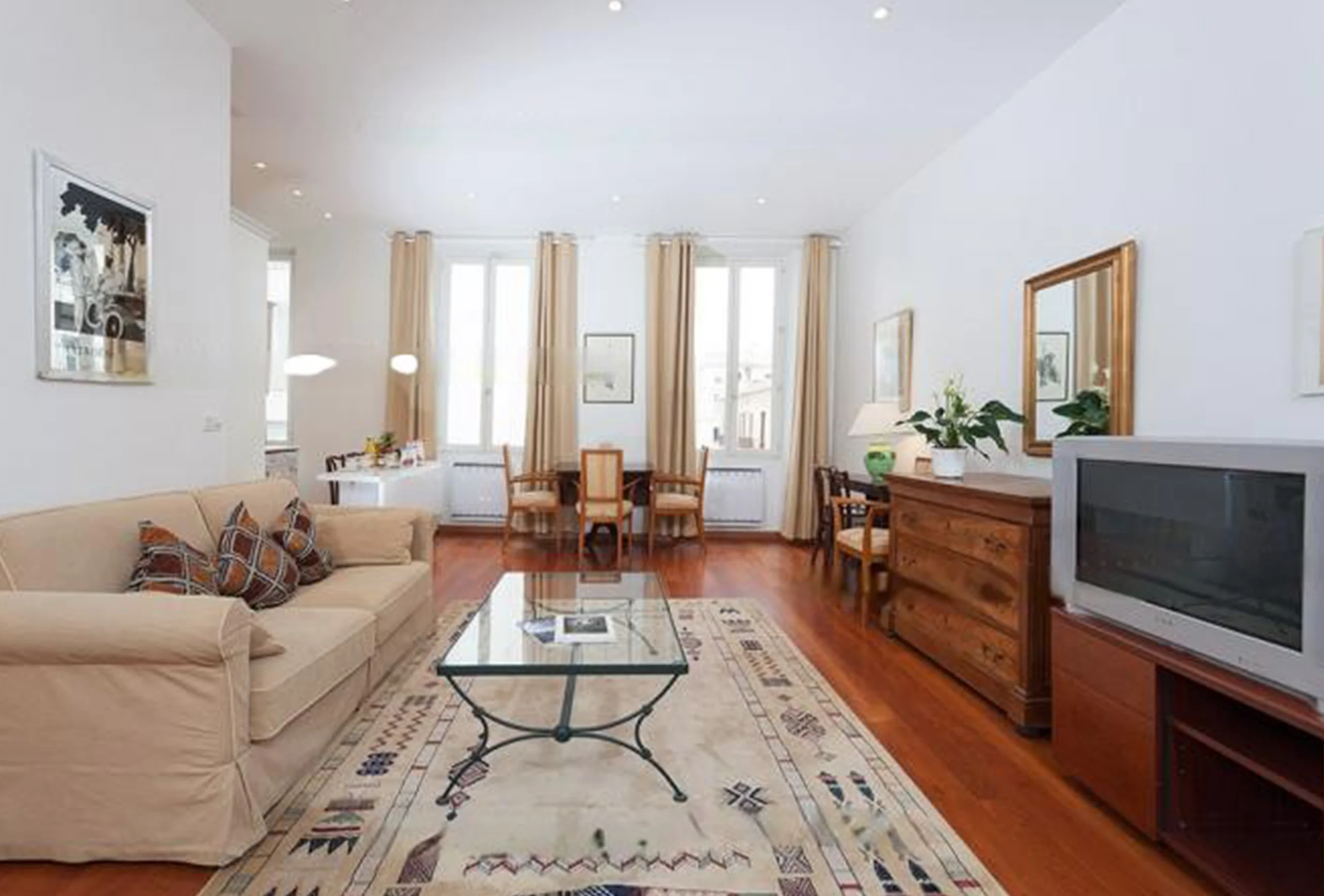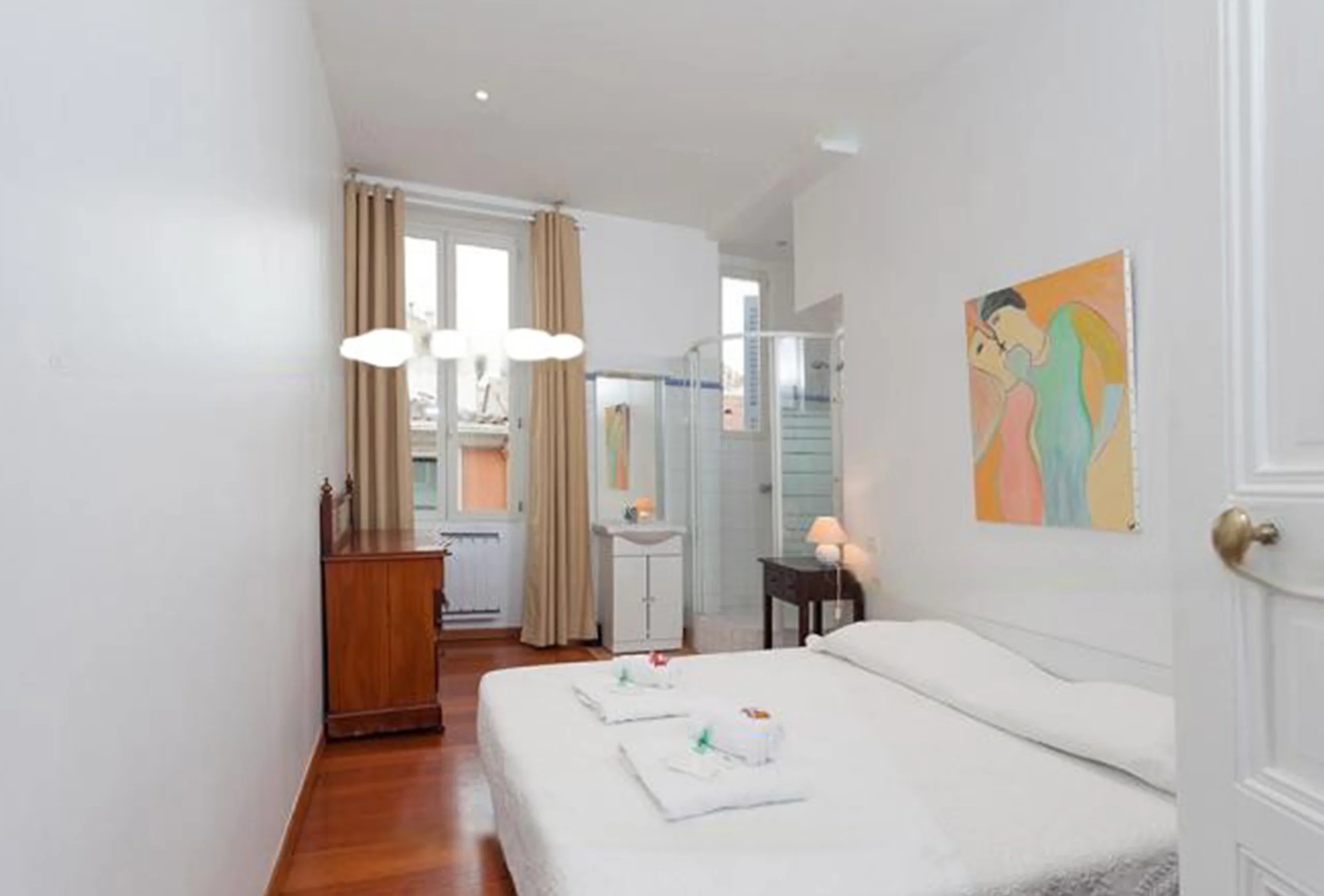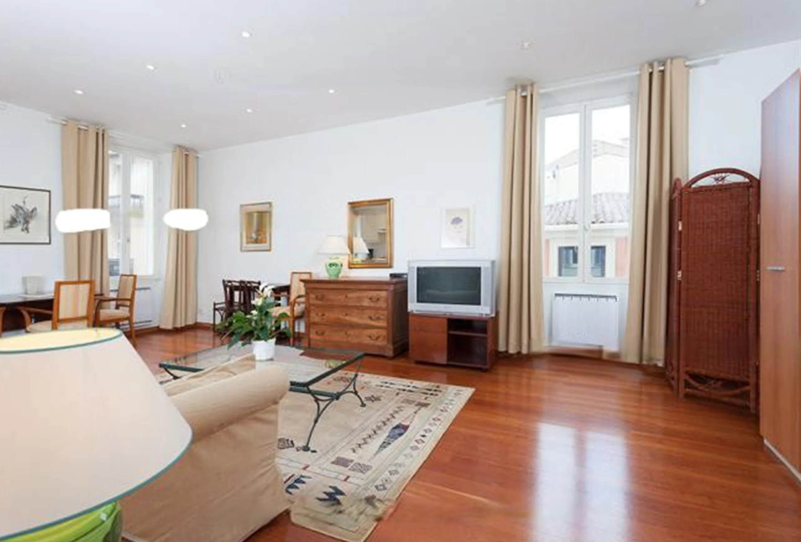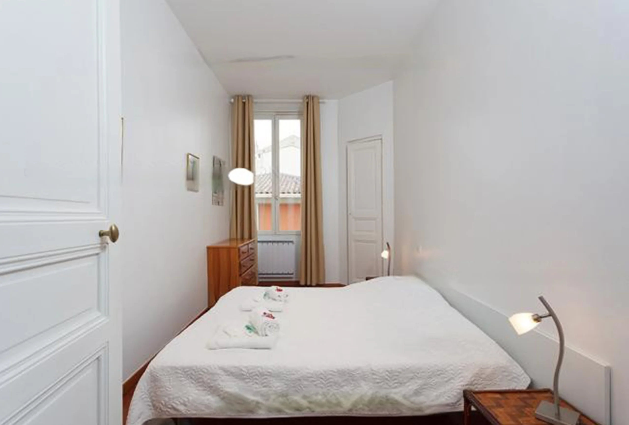 This is a two-bedroom apartment in the centre of Cannes, only four minutes’ walk from the convention center, on the 2nd floor with lift. It features a living room with generous volumes and lots of light. It has a double sofa bed and dining area. There are two bedrooms, each with two single beds, which can be arranged as a double. In one of these bedrooms, there is a shower cabin. The bathroom is equipped with a bath with shower over and a toilet. The kitchen is equipped and opens onto the living room across a breakfast bar. The apartment has an independent second toilet. The apartment has good volumes and a pleasant ambiance, in close proximity to the Palais. You will find quite a lot to appreciate.