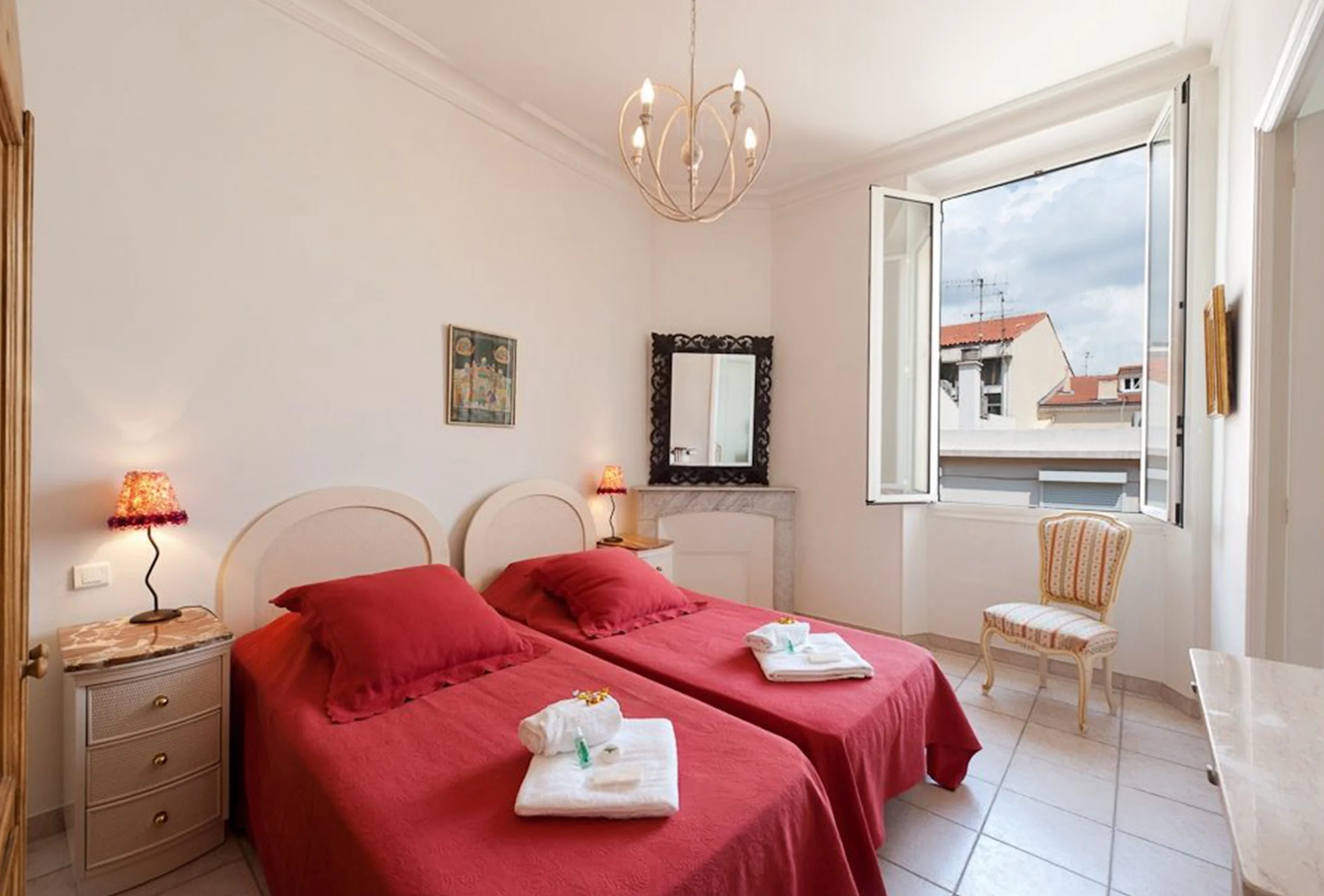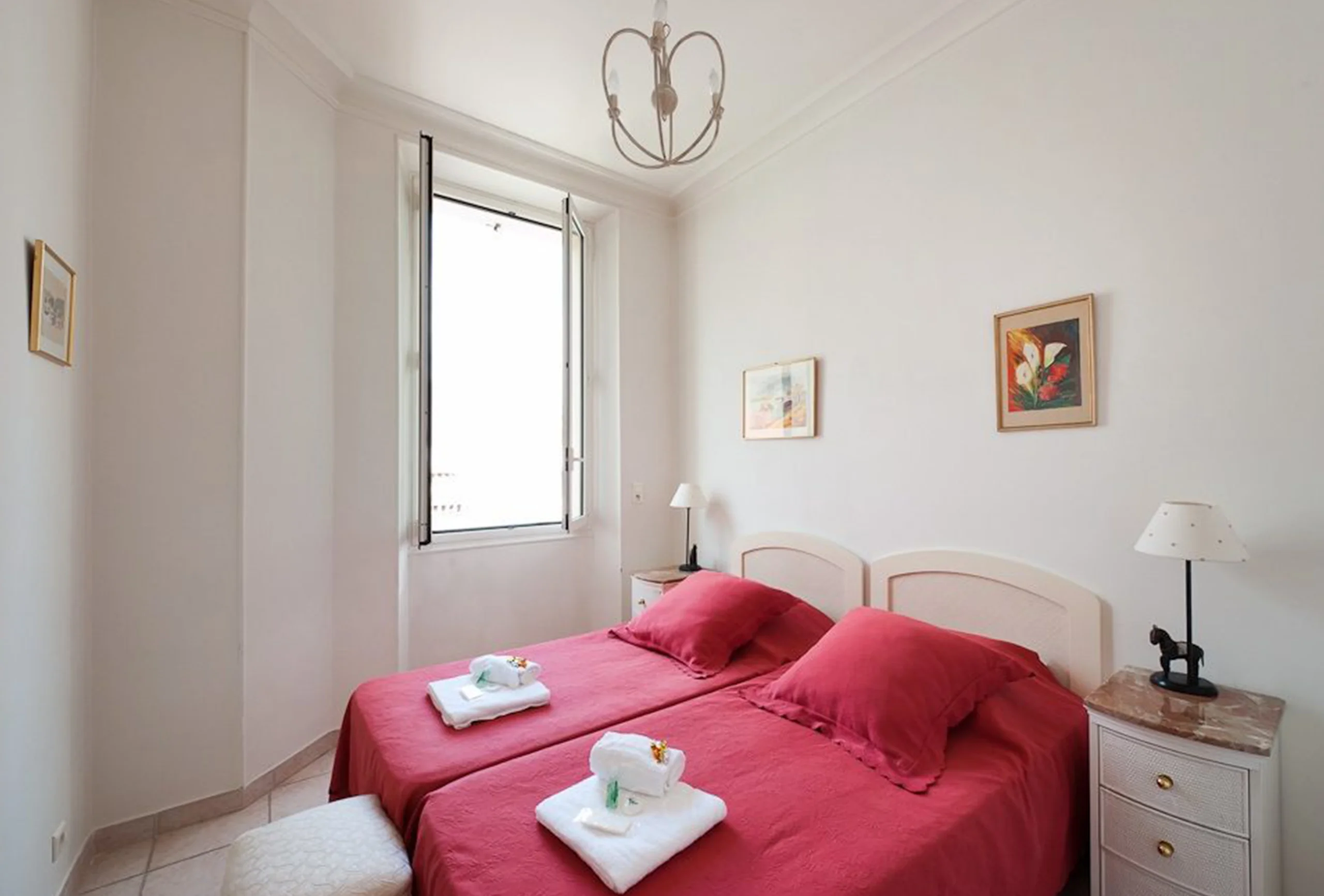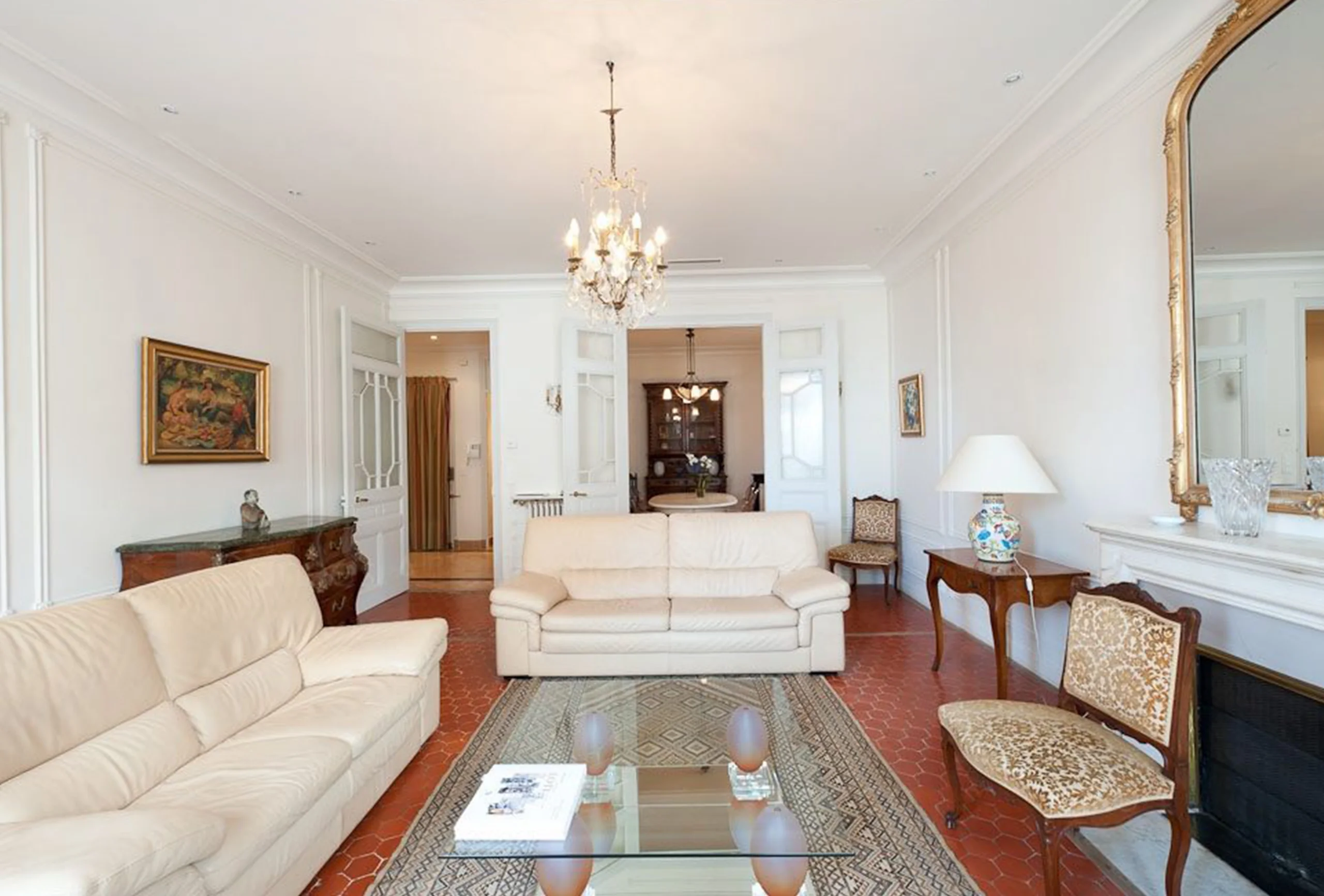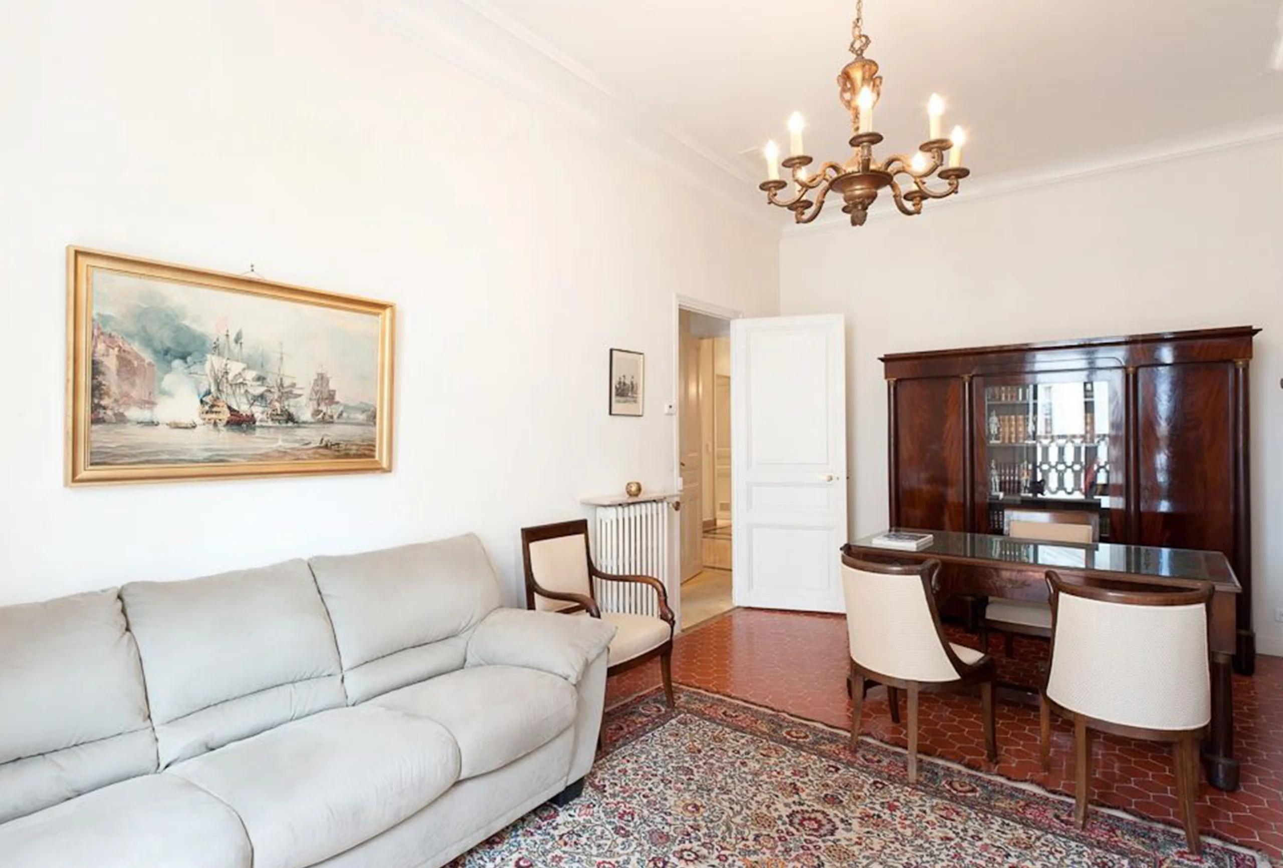 This superb four-bedroom apartment is located on Square Merimée, which takes its name from a famous French writer and archeologist who used to live in Cannes. Partial air-conditionning. You will be just across from the Palais, overlooking the old harbor and close to all amenities. The luxurious high-ceilinged property is on the 3rd floor of an early XIXth century building. You walk in through a large hallway opening onto an elegant saloon overlooking the Palais. The exquisite dining room can seat up to eight guests or can be used as a meeting room. A study room with sofa bed features an antique desk, a quiet spot to work or relax. These three rooms are interconnected offering an attractive ensemble for your cocktail parties, receptions… The first bedroom has a romantic look with its canopy and Italian-style decoration. Very roomy, it is equipped with a comfortable double bed. Just off is a very pleasant shower room with toilet. The second bedroom faces the… Palais. Bright and roomy, it features two single beds that combine into a double if preferred. This bedroom has an en suite bathroom with toilet. The third and fourth bedrooms are at the rear of the apartment. Slightly smaller than the other two, they nevertheless offer the possibility to accommodate four more guests, as each is equipped with two single beds that combine into a double. Next to them is a shower room with toilet. The kitchen is bright, modern and fully-equipped. Double glazing completes the equipment of this exceptional apartment. Two bedrooms only dont feature air-conditionning.