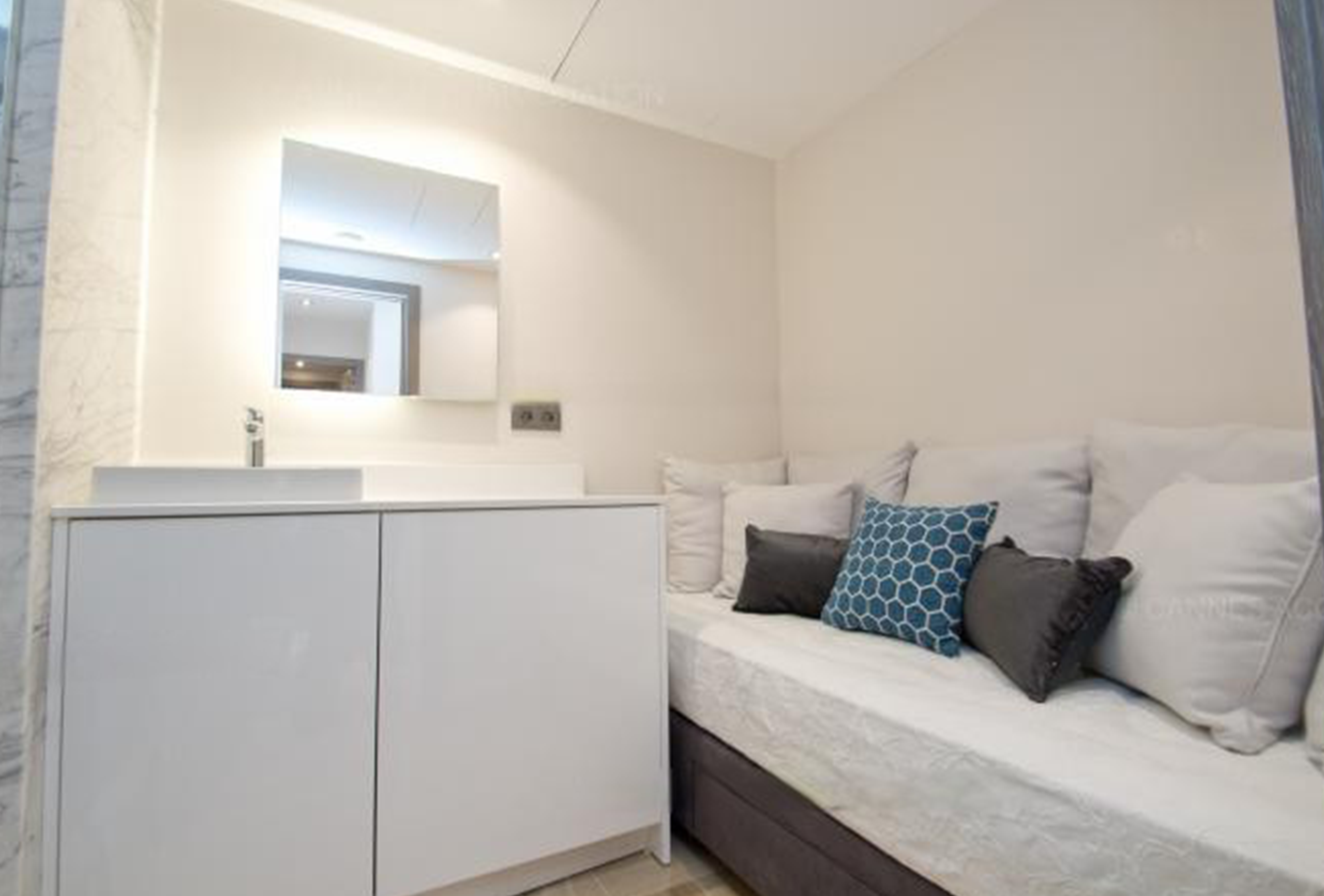 Furnished with taste, you will be able to relax while enjoying the sun or welcome your guests or your business meetings during the festivals. Next to the living-room is the fully equipped contemporary kitchen, built in marble. Two bedrooms are at your disposal. Both have king size beds and ensuite shower rooms (with toilets). A third tiny shower room/toilets is available for you guest.
