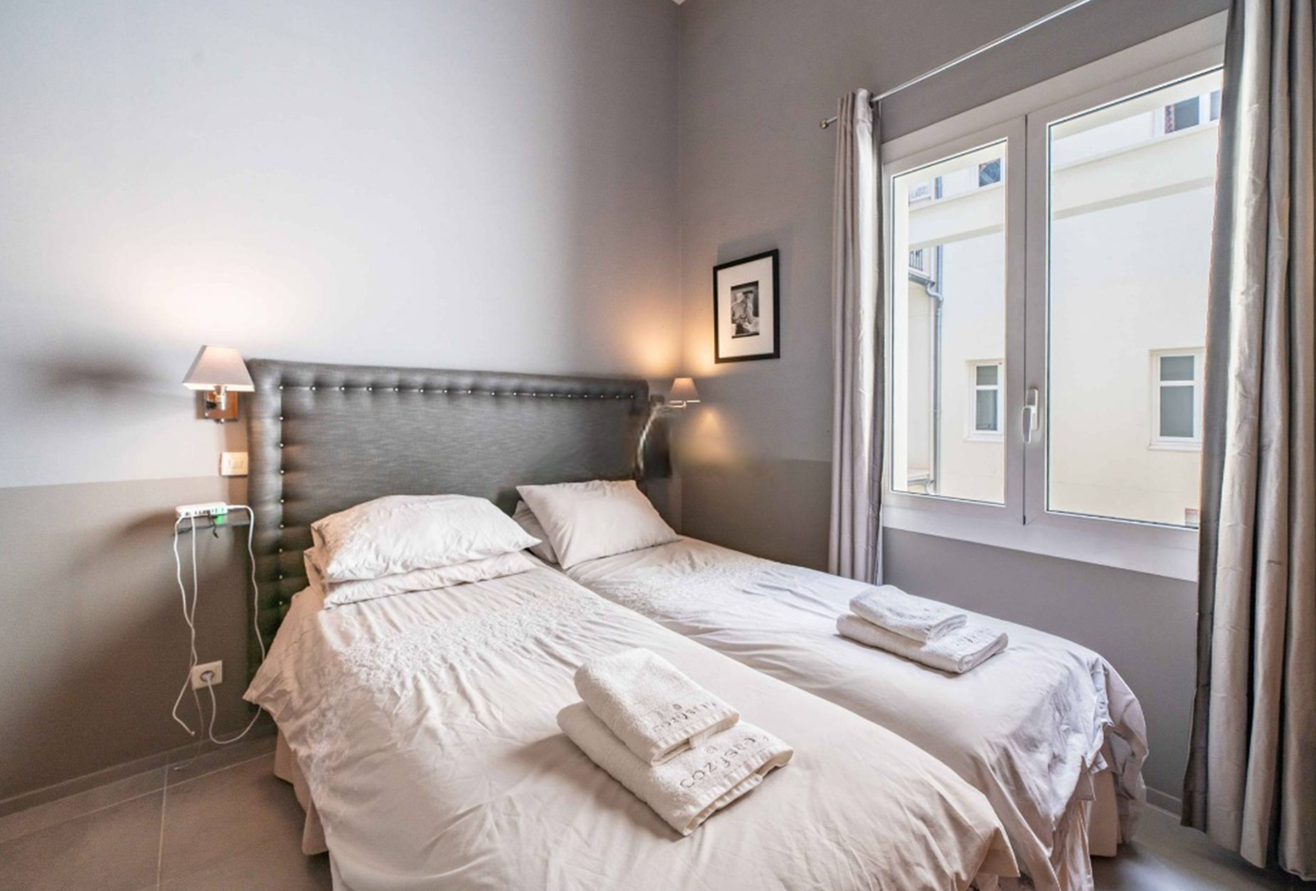 This magnificent, fully renovated 2 bedroom apartment is ideally located in the heart of Cannes, between the famous Rue d’Antibes and the prestigious Boulevard de la Croisette. Its ideal location means you can reach the Palais des Festivals in just 4 minutes on foot. The beaches are just 80 meters away. Located in a very quiet middle-class building, it comprises an entrance hall with luggage rack, a living room with open-plan kitchen, two bedrooms and a shower room with toilet. It can welcome up to 6 guests, with two single beds in each bedroom (they can be joined together to create a double bed) and a sofa bed in the living room. Fully air-conditioned and equipped, this property will delight you with its comfort and tasteful decor. Ideal for business or tourism rentals.