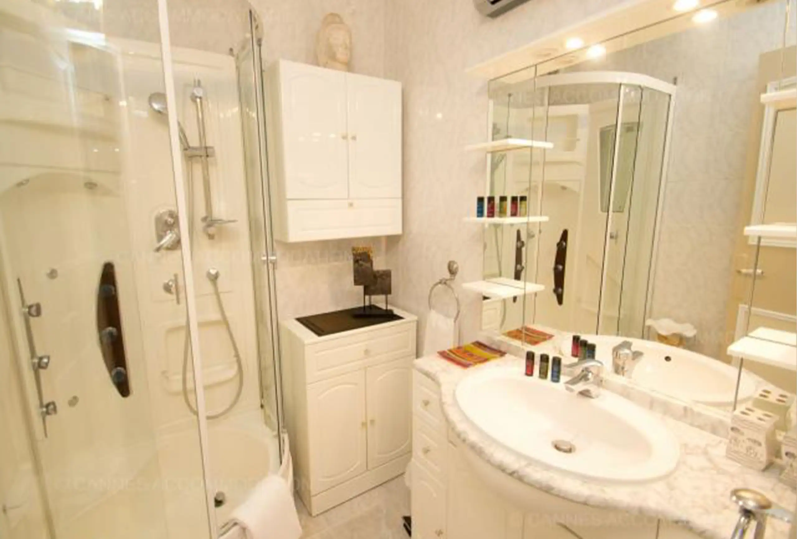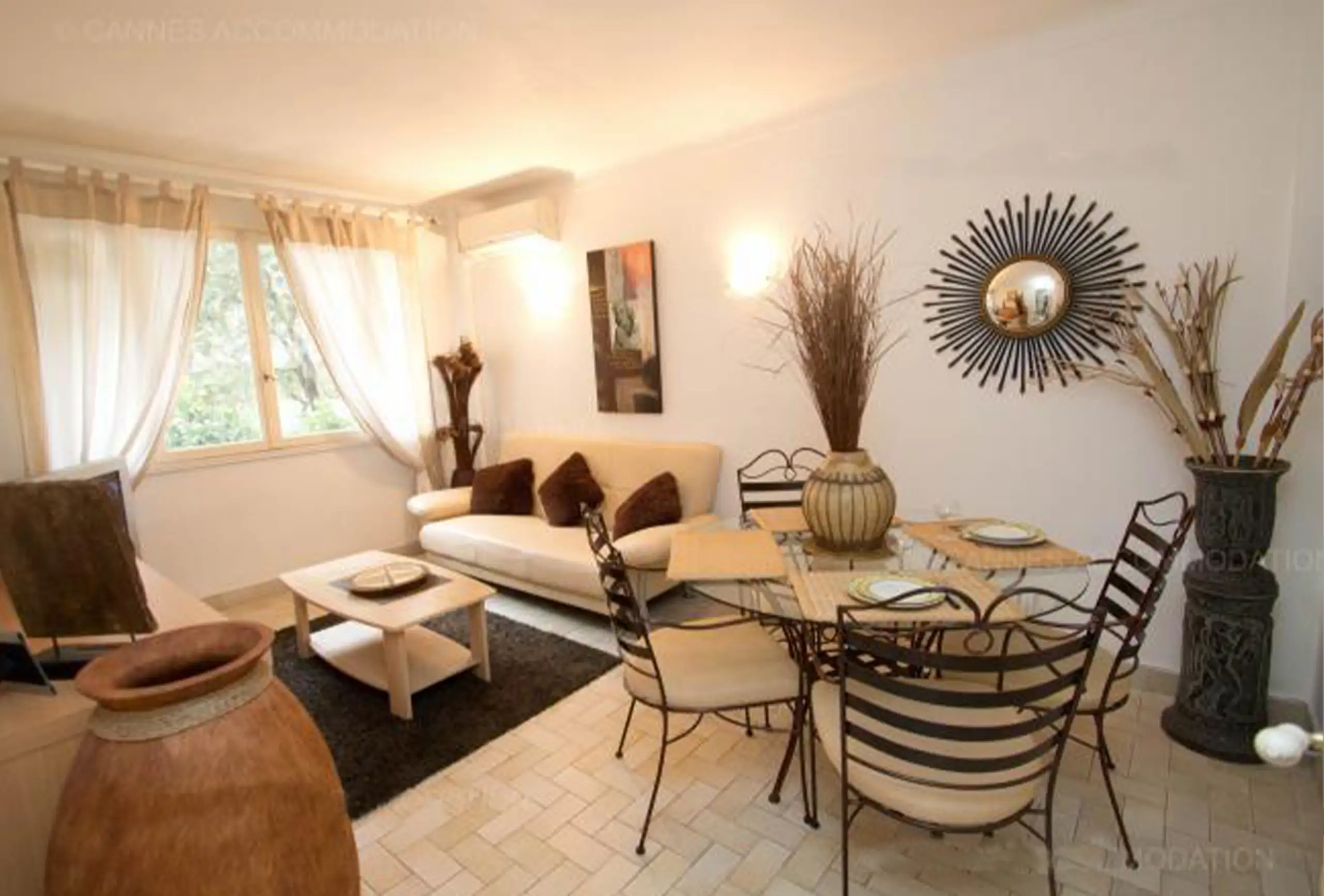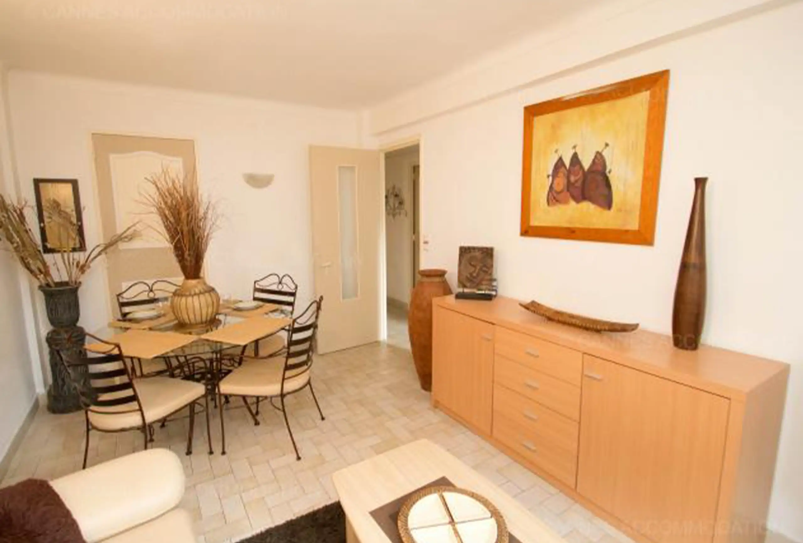 This pretty two-bedroom apartment is located between the Carlton and Martinez hotels and several streets back from the Croisette, twelve minutes’ walk from the Palais. It is on the ground floor, in a quiet street, looking out onto the garden. The living room has a dining area. One bedroom has twin beds. The second bedroom has a double bed. There is a bathroom with shower cabin. The kitchen is fully equipped. The toilet is independent.