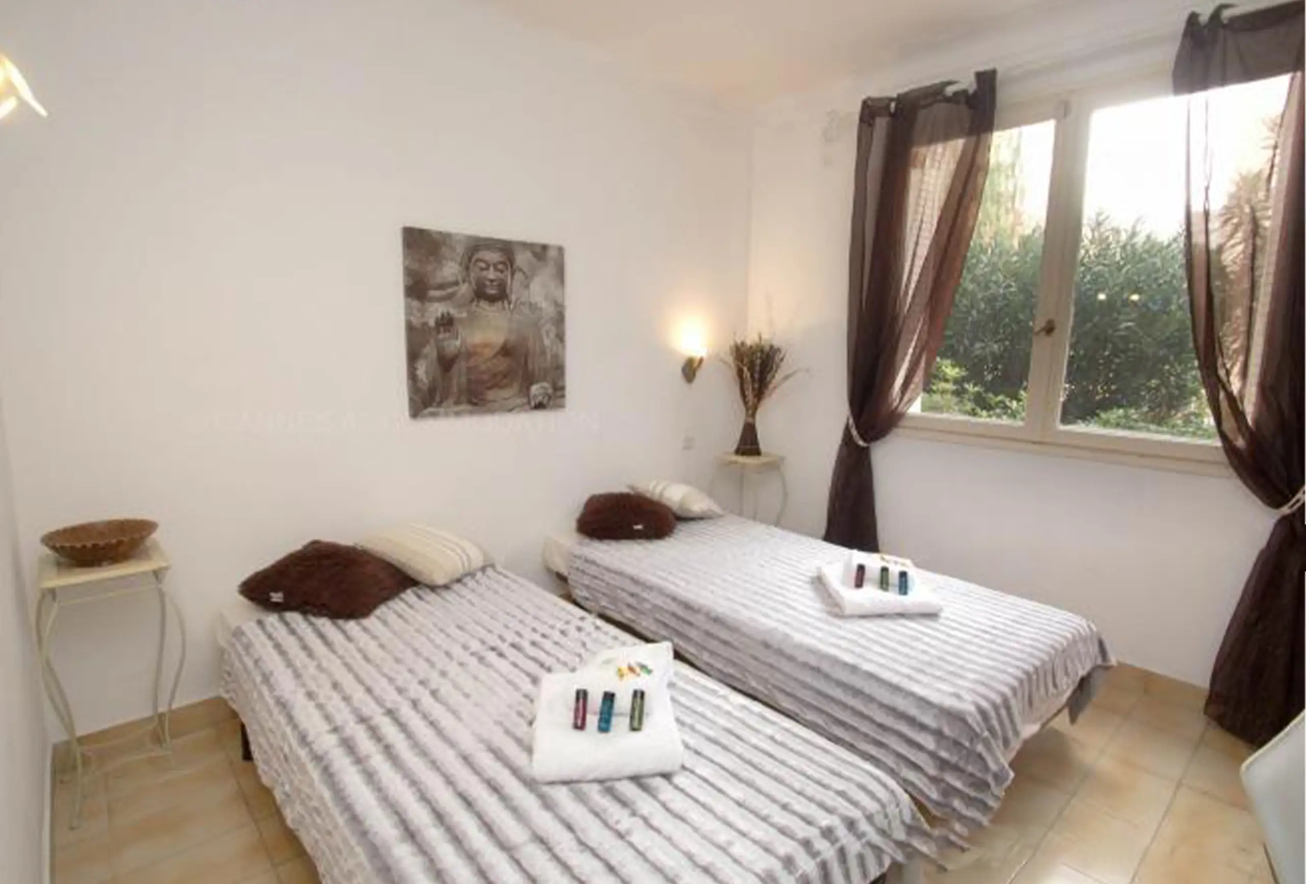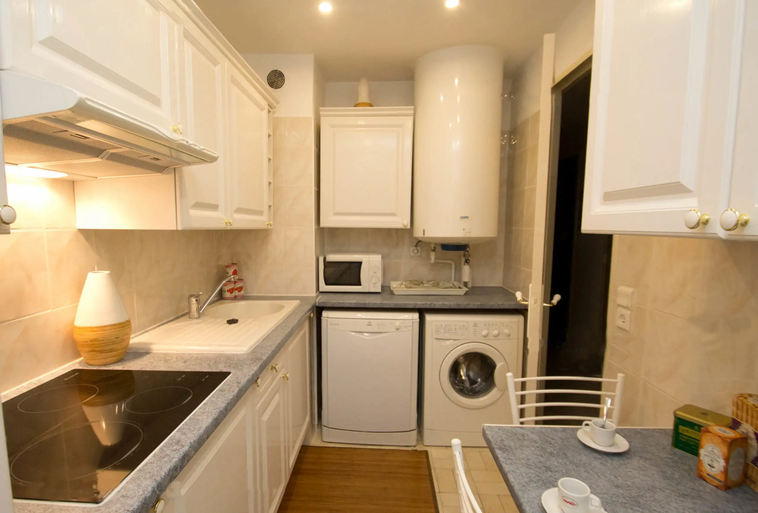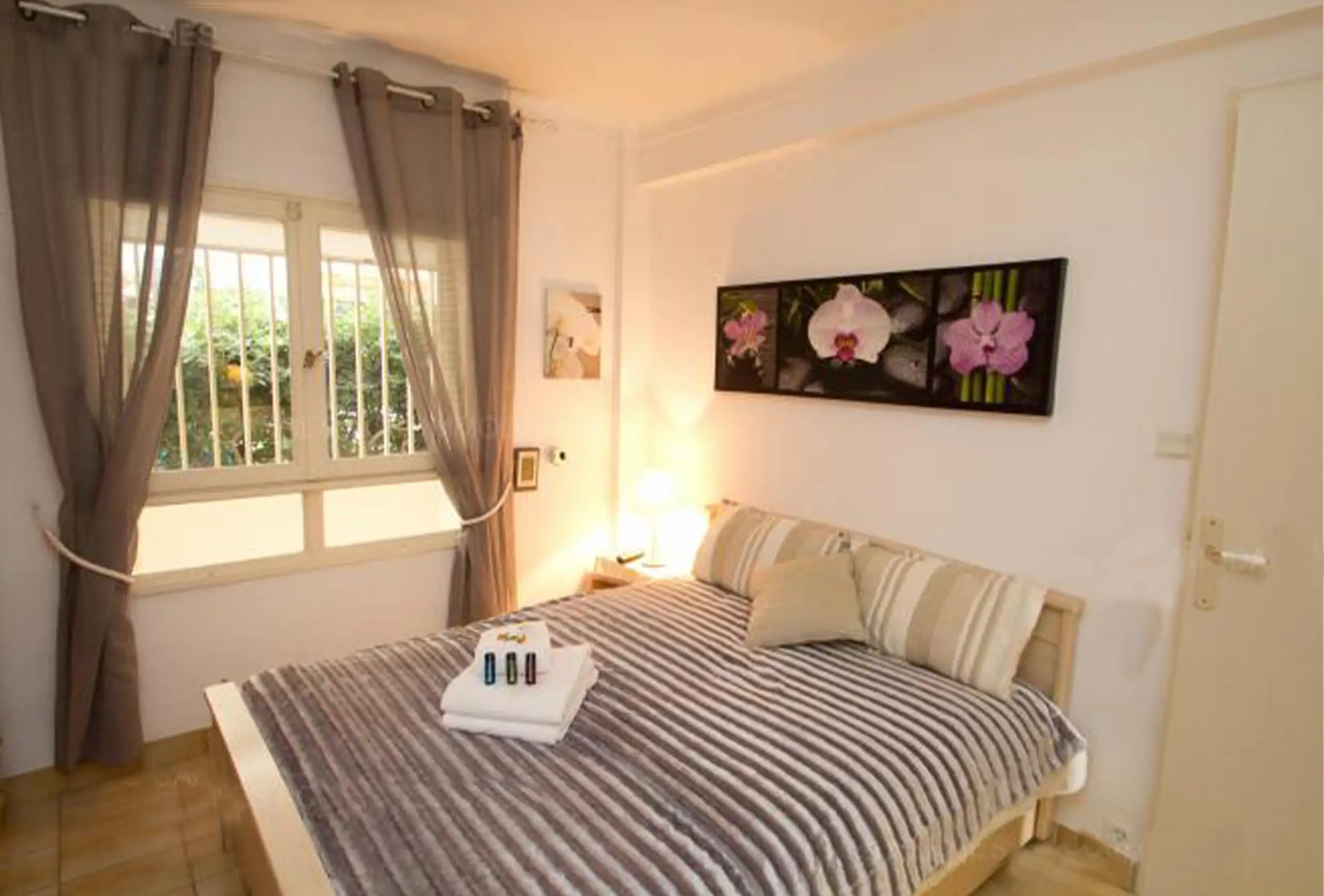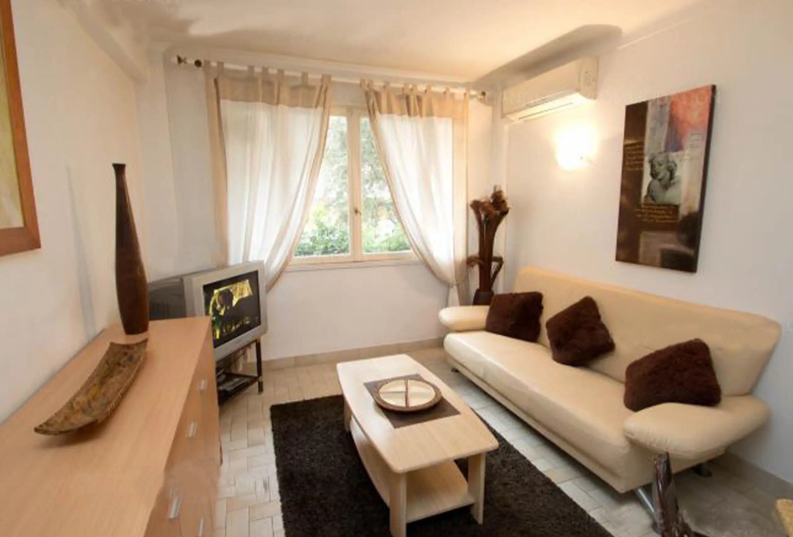 This pretty two-bedroom apartment is located between the Carlton and Martinez hotels and several streets back from the Croisette, twelve minutes’ walk from the Palais. It is on the ground floor, in a quiet street, looking out onto the garden. The living room has a dining area. One bedroom has twin beds. The second bedroom has a double bed. There is a bathroom with shower cabin. The kitchen is fully equipped. The toilet is independent.