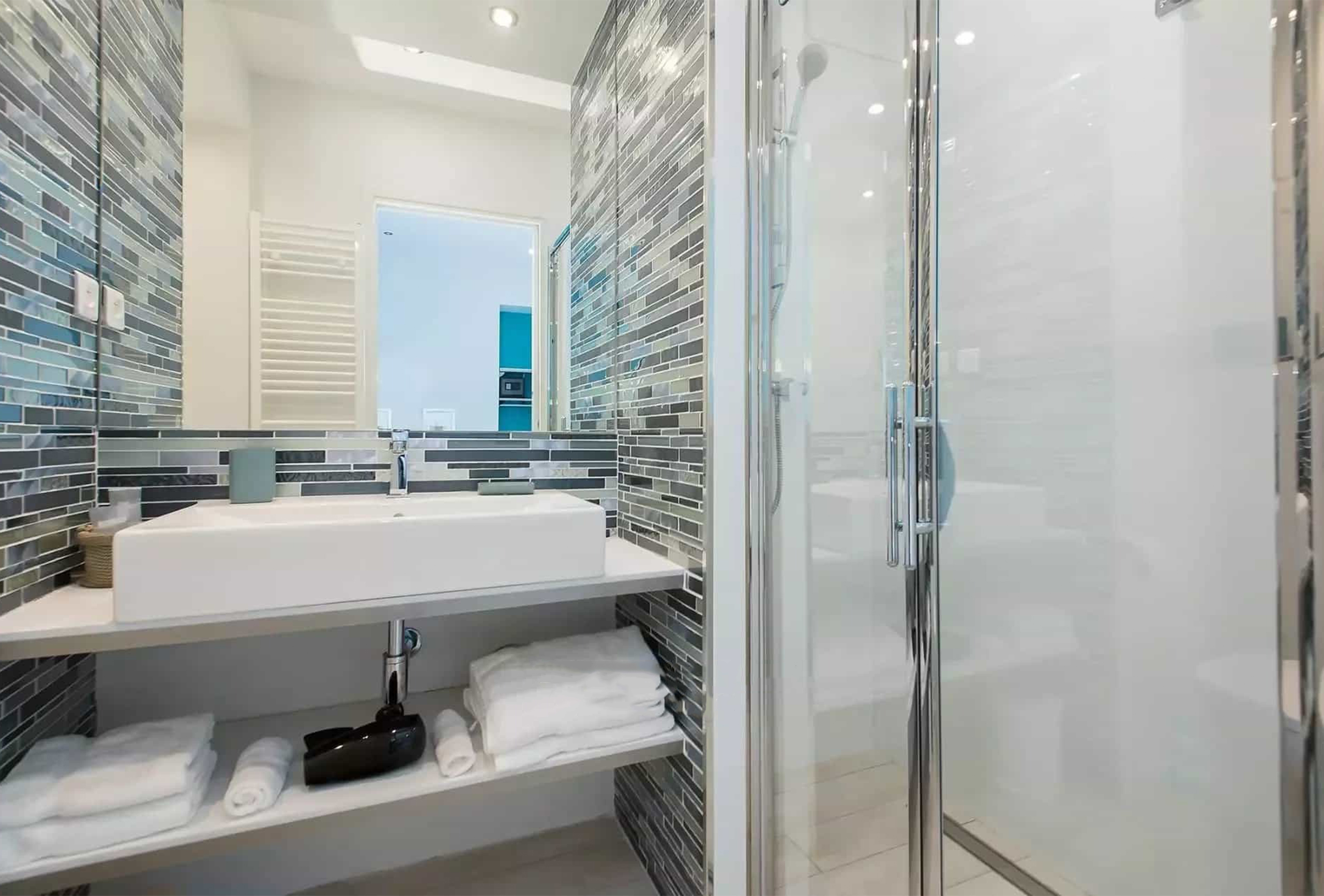 – Spacious living area with two “real” twin beds (can be made up as a King-size bed) and flat screen TV.