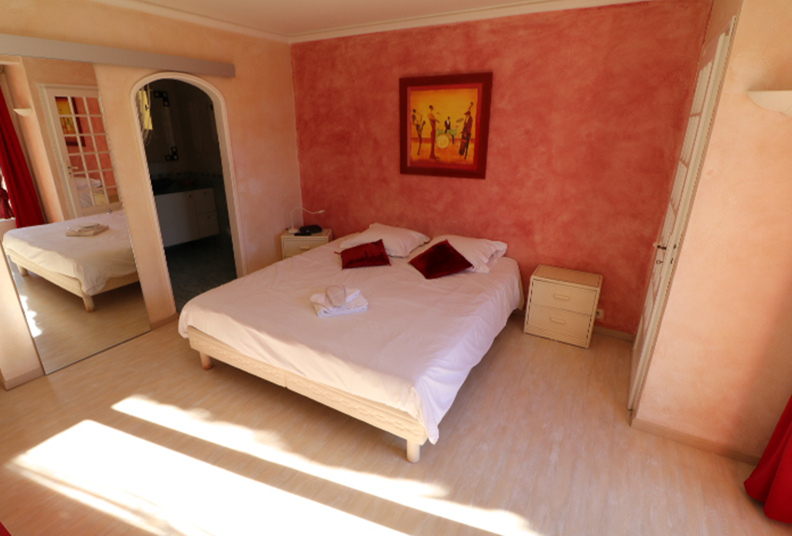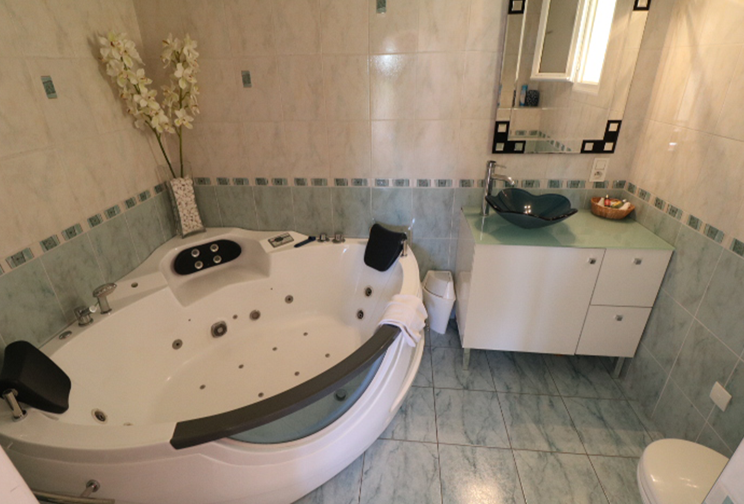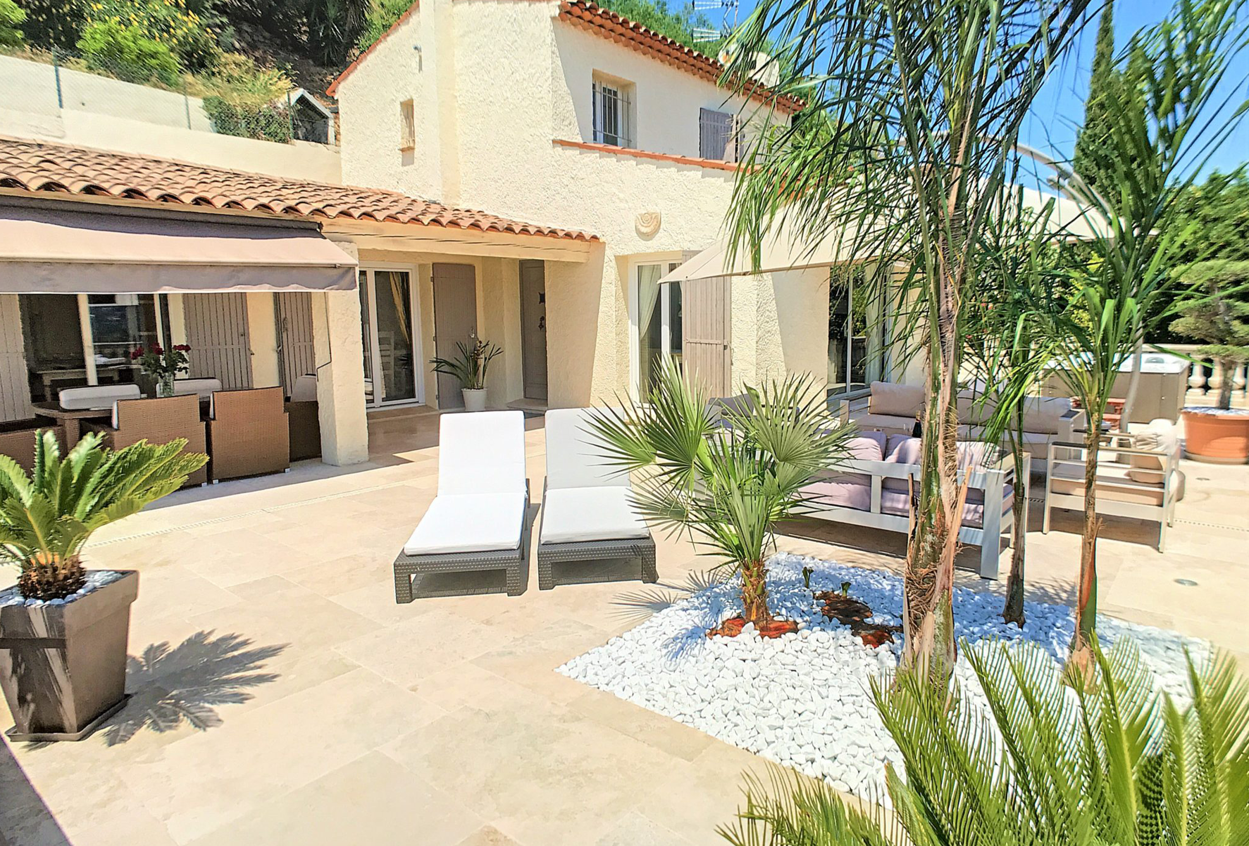 Large provencal style villa, fully refurbished. Located in Mandelieu la Napoule, about 15 min drive from Cannes. Large Terrace with swimming pool,  jacuzzi,  outside kitchen and bbq. Very quiet, little sea view. Spacious living room, dining room. Internet, air conditioning. 1 bedroom with one queen size bed and en suite bathroom with balneo and toilet. 1 bedroom with 2 electric twin beds and en suite bathroom with shower. On second level 1 bedroom with 2 electric twin beds and ensuite bathroom with shower and toilet.