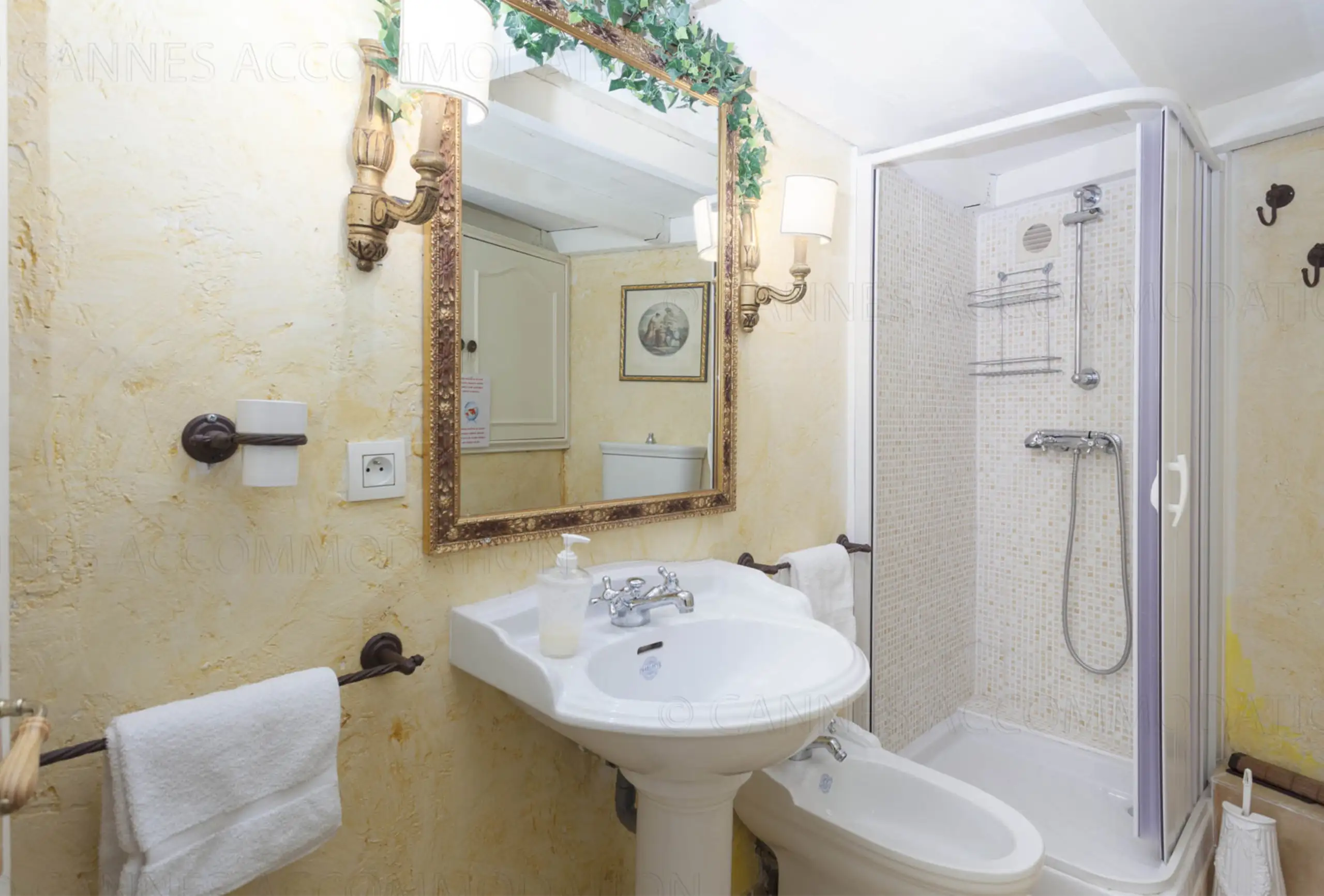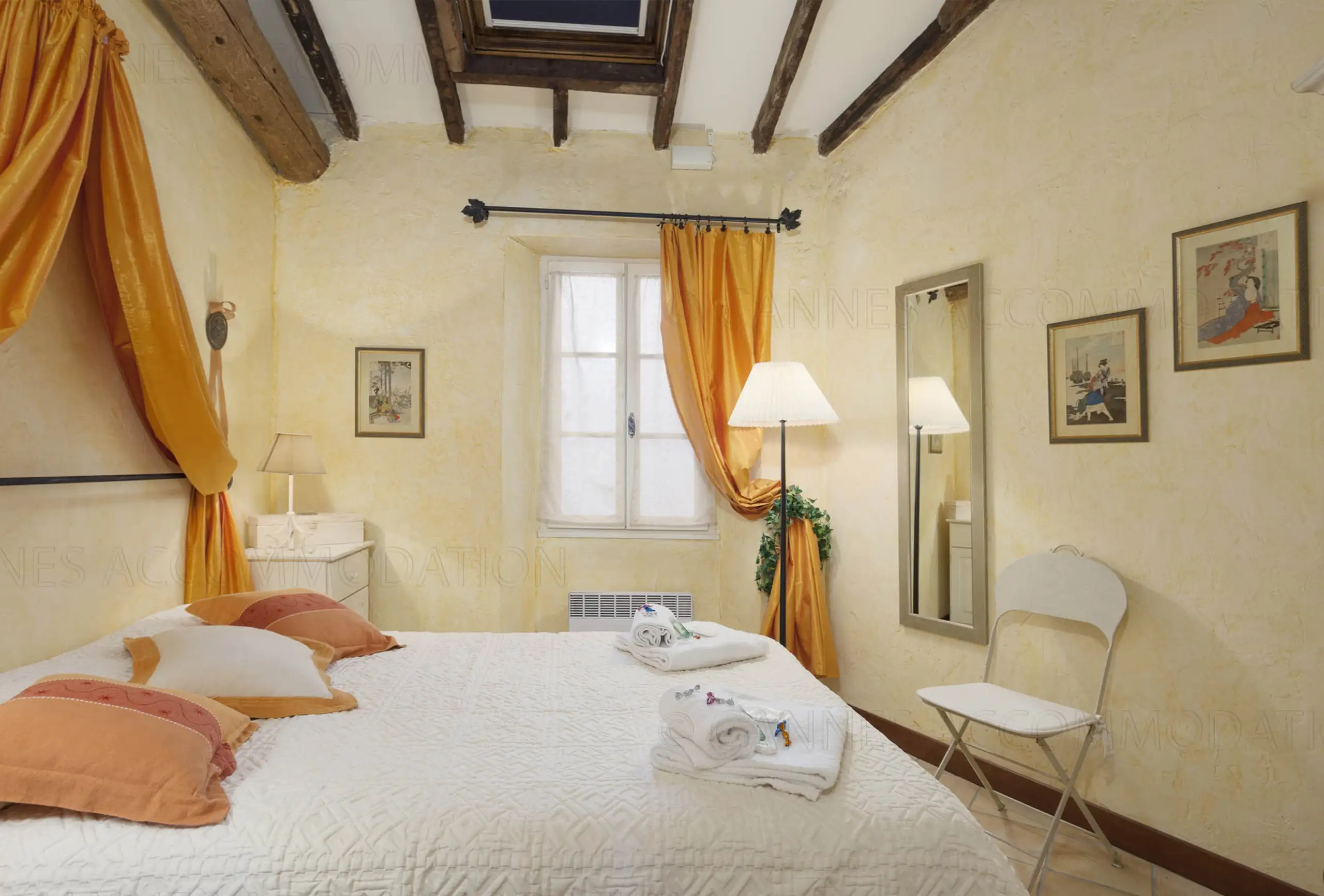 A beautifull three-bedroom duplex apartment located in the heart of the old town, twelve minutes’ walk from the convention center. It is on the first floor without lift. The spacious living room is an attic room with generous volumes and a lot of character. There is a terrace with a charming view over the rooftops and very attractive decoration throughout. The large living room is under the roof, but boasts a high sloping ceiling. In fact it is on the first level, the same as the entrance to the apartment. The room has numerous features: exposed beams, exposed stone wall, fire place, etc. There are two double bedrooms on the same level. There is a generous bathroom on the way up from the first to second level, beautifully equipped with shower cabin and toilet. Still on the first level there is an equipped open kitchen. On the second level is the third bedroom with double sofa bed. The room opens onto a small terrace overlooking the city rooftops. There is an independent bathroom with shower and toilet.