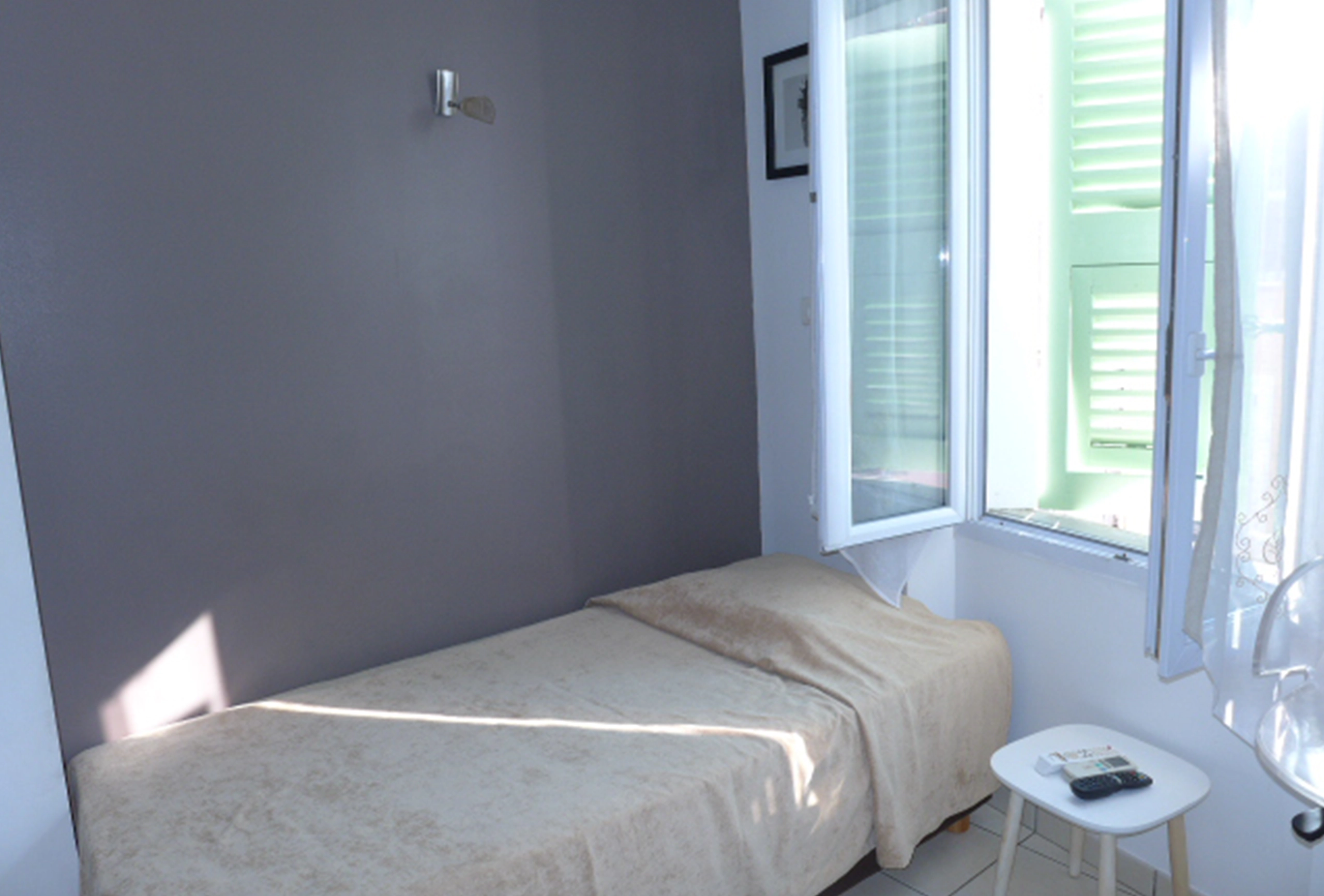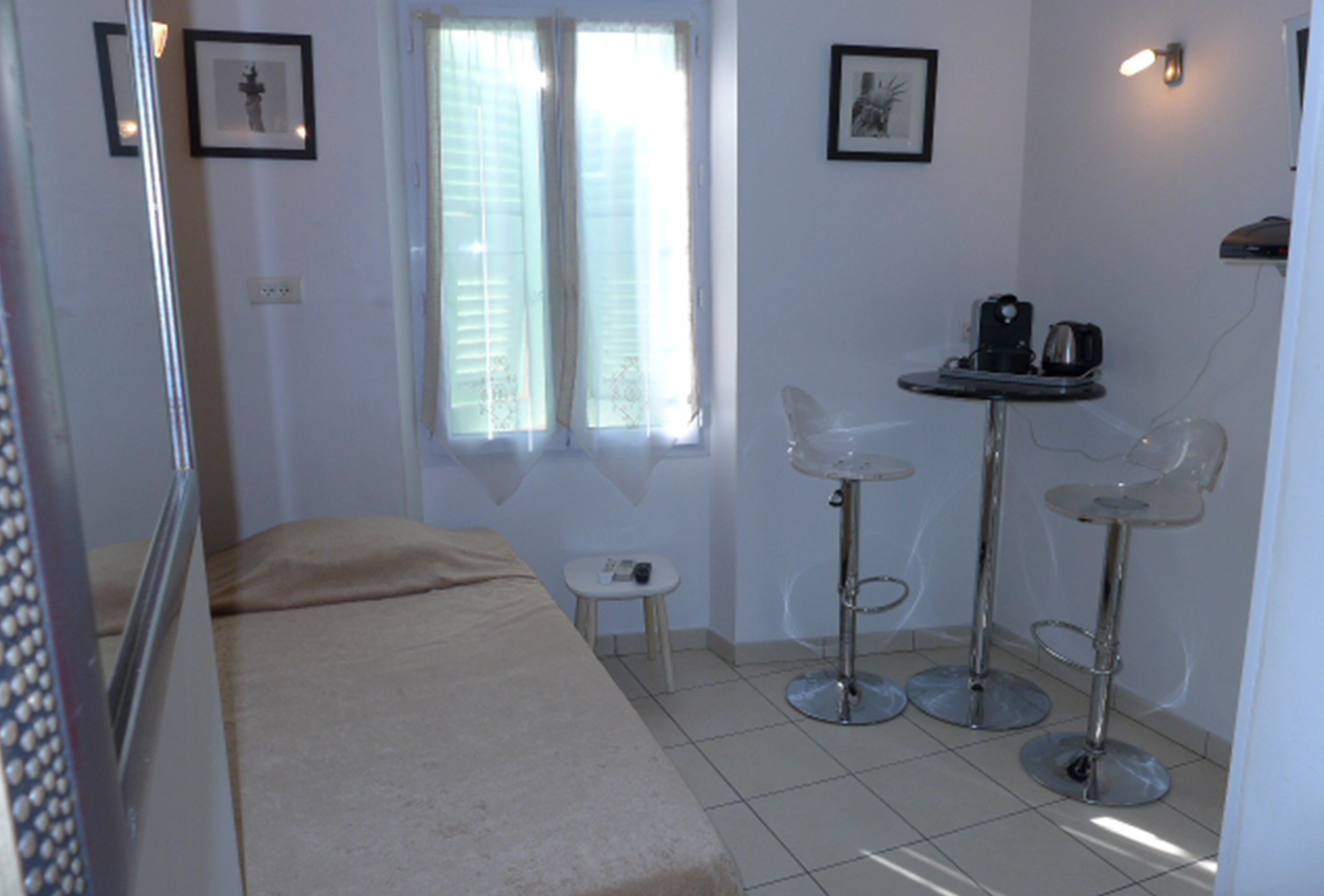 Well located bedroom, in the centre of Cannes, 2 min from the Palais des Festivals and the Croisette, 3rd floor without lift in an old building. Fully refurbished, modern and good quality materials and furniture. Clean and neat. One single bed. TV, air conditioning, internet in wifi. Bathroom with shower, basin and toilet , hair dryer. Kitchenette, concealed  in a cupboard with sink, micro wave oven, fridge, kettle, coffee machine.