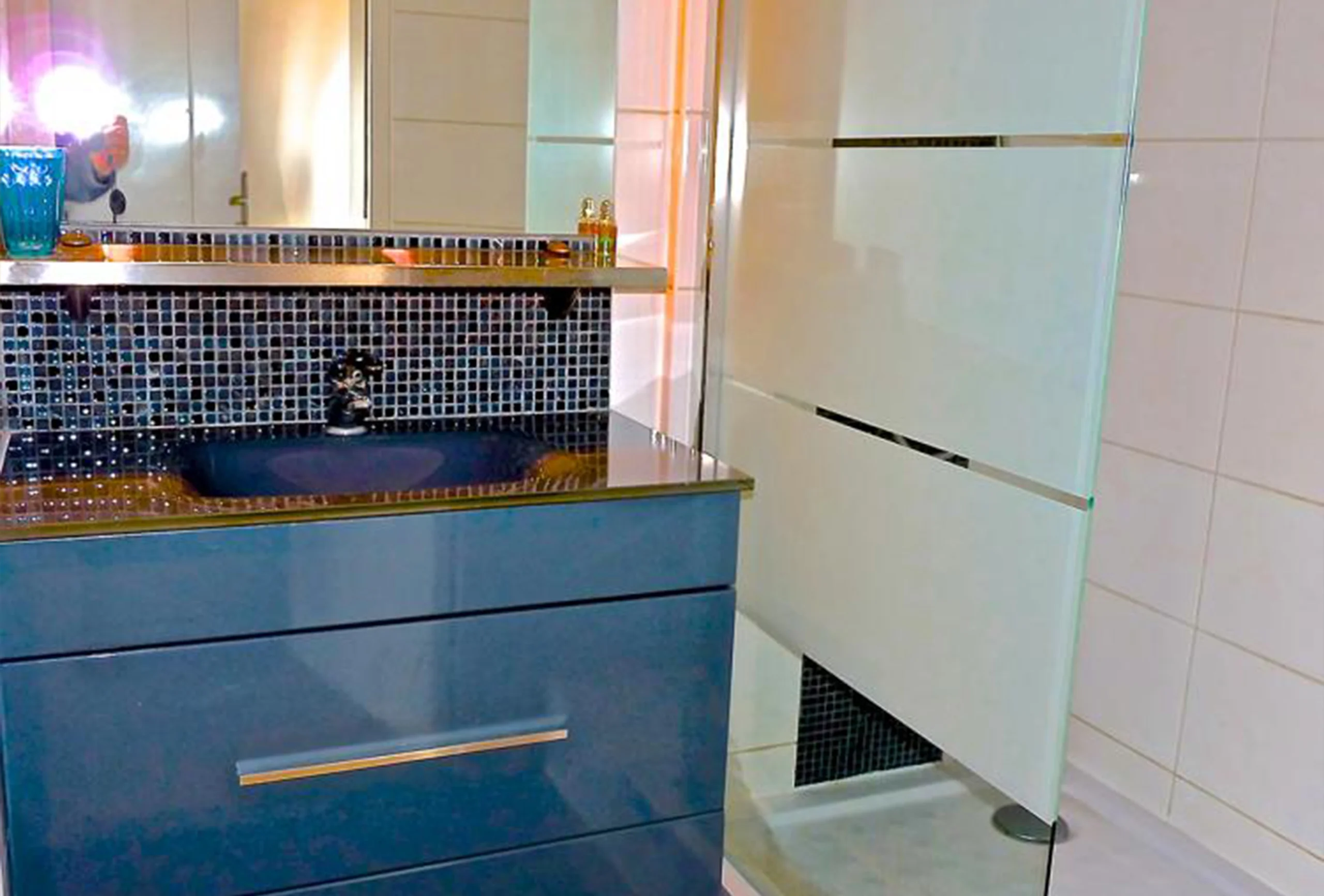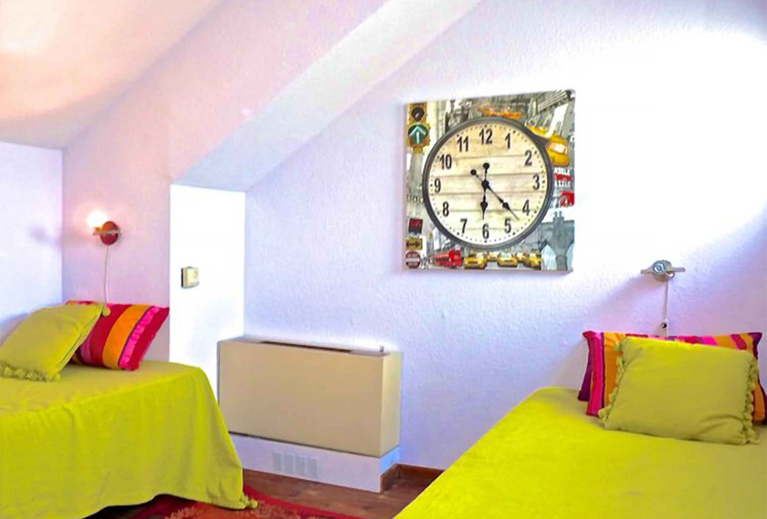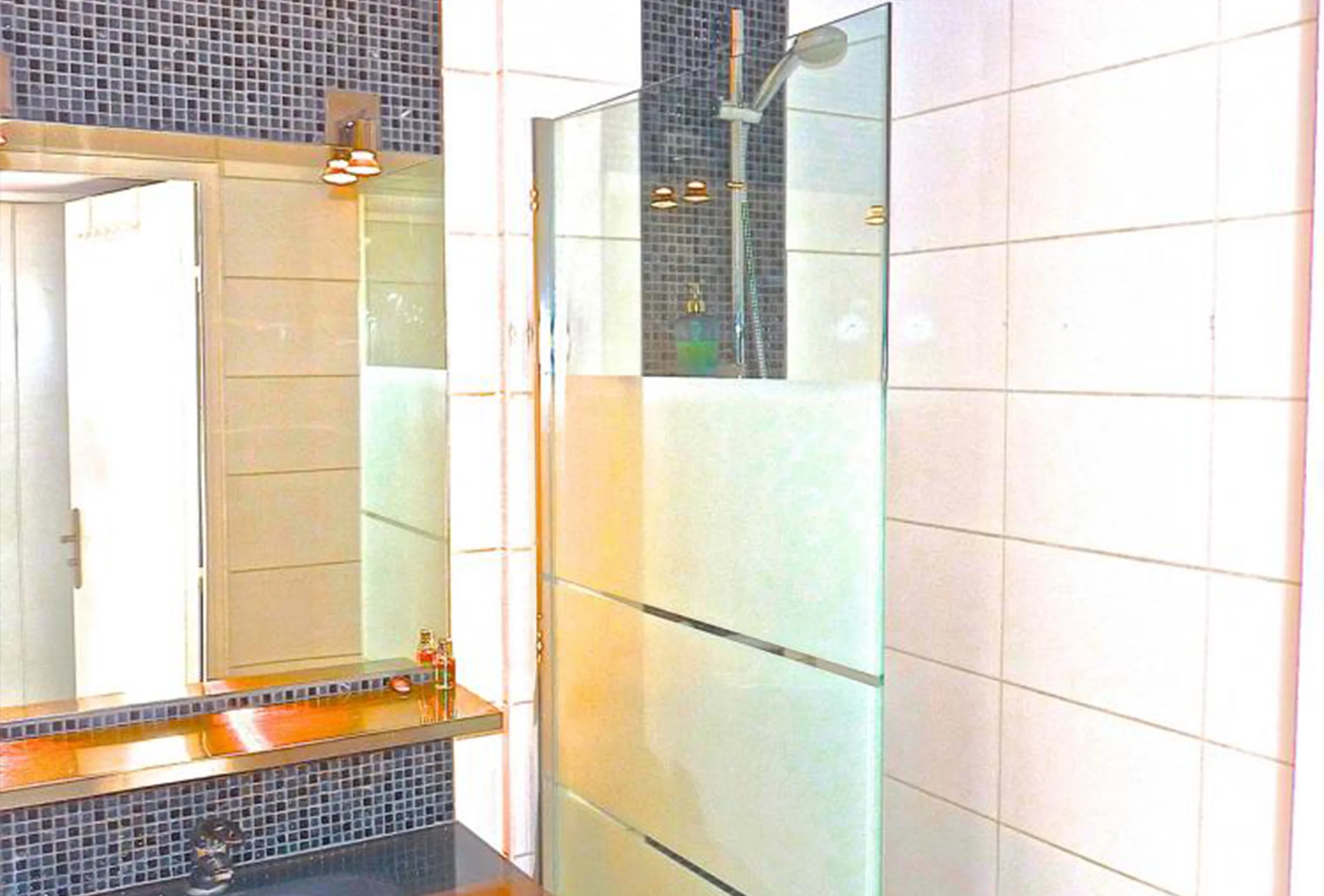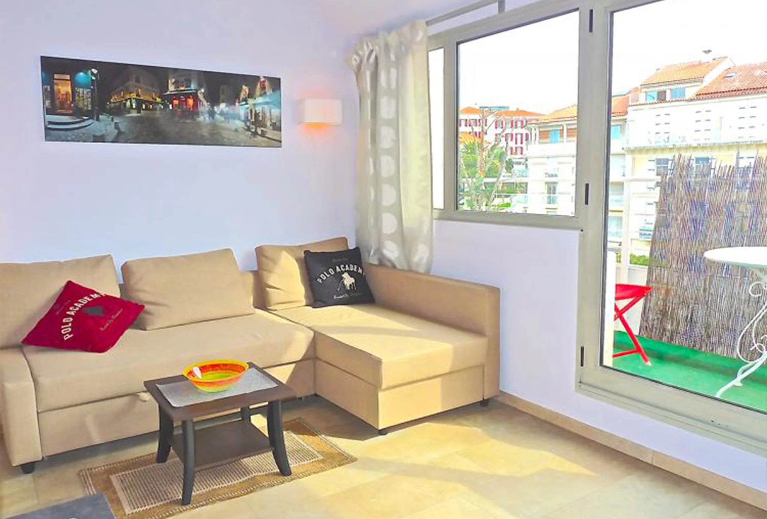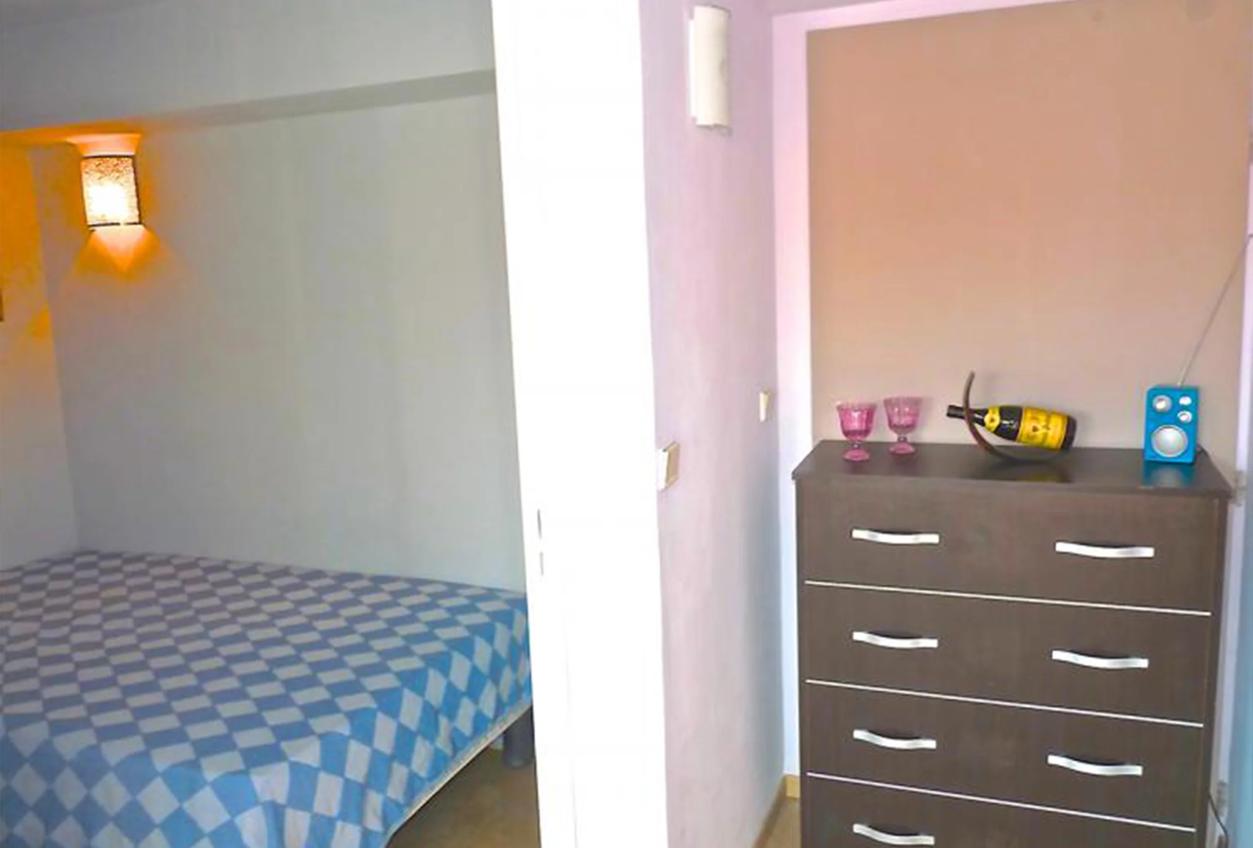 A topfloor apartment in a secure high quality residence shared with a Hotel, giving guests the benefit of having Hotel facilities available, along with the convenience, amenities and freedom associated with a furnished apartment suite. This property used to be 2 seperate units which have been tastefully combined to produce a large 65 M2 modern apartment As one enters the apatment you are struck by the light and space afforded by the high level and the open views. To the left is a living area with comfortable furnishings and all mod cons, and to the right is an open plan kitchen and dining area. Leading through to the right too is a small double bedroom (the bed is 120 x 180) and bathroom. There is a small terrace which faces South/South East gaining benefit from daily and evening sun. Up a small staircase there is a 2nd bedroom which has two single beds in it.
