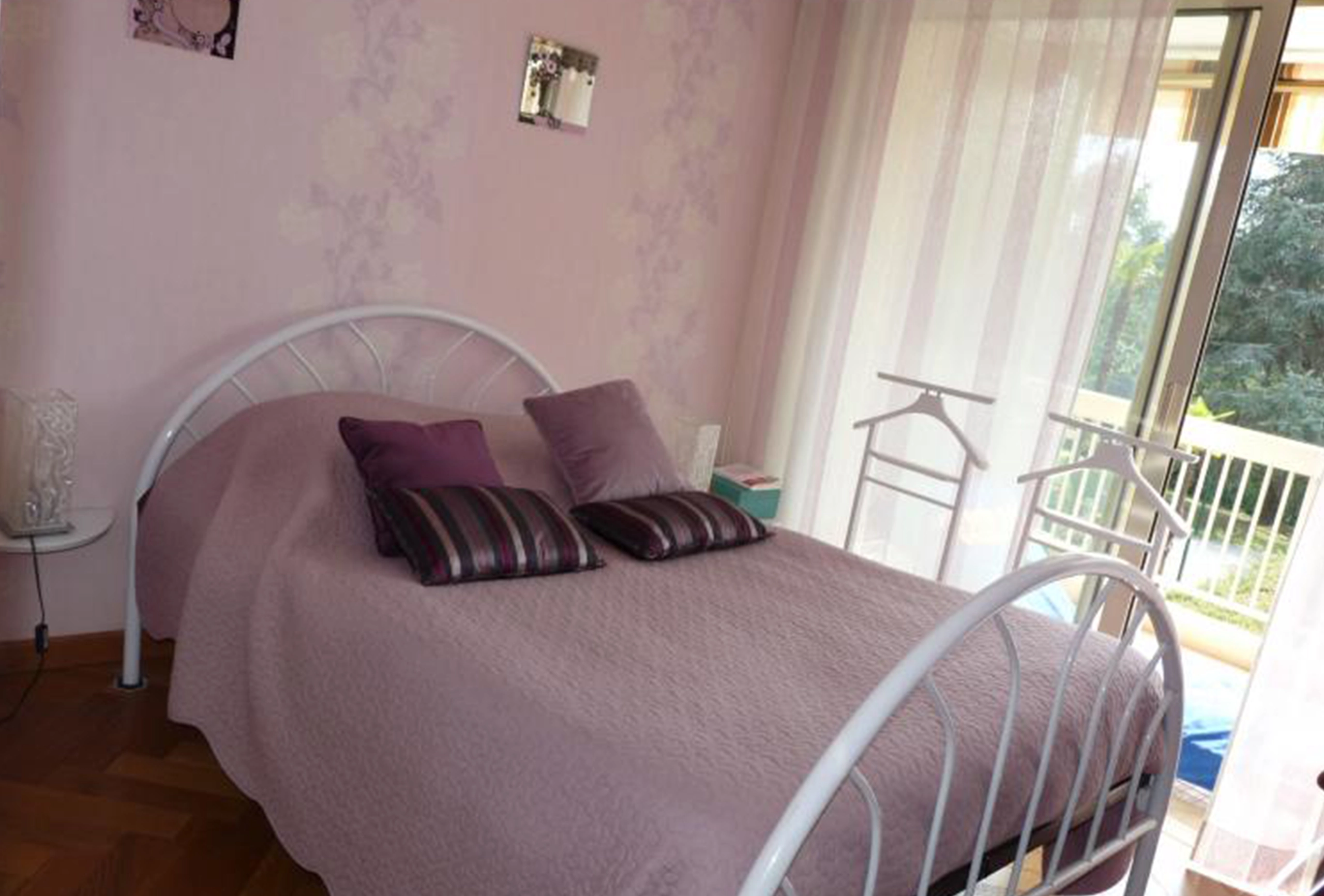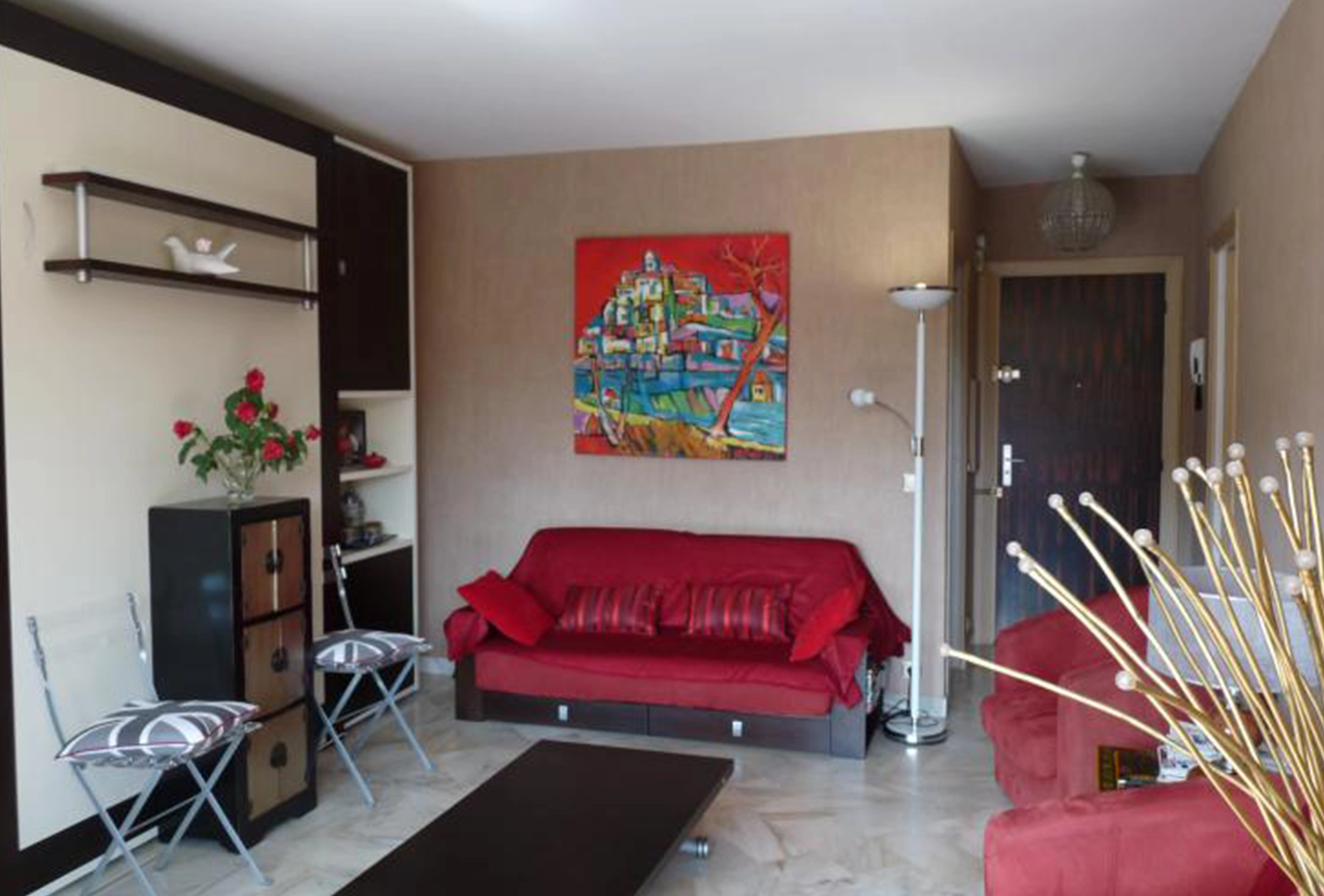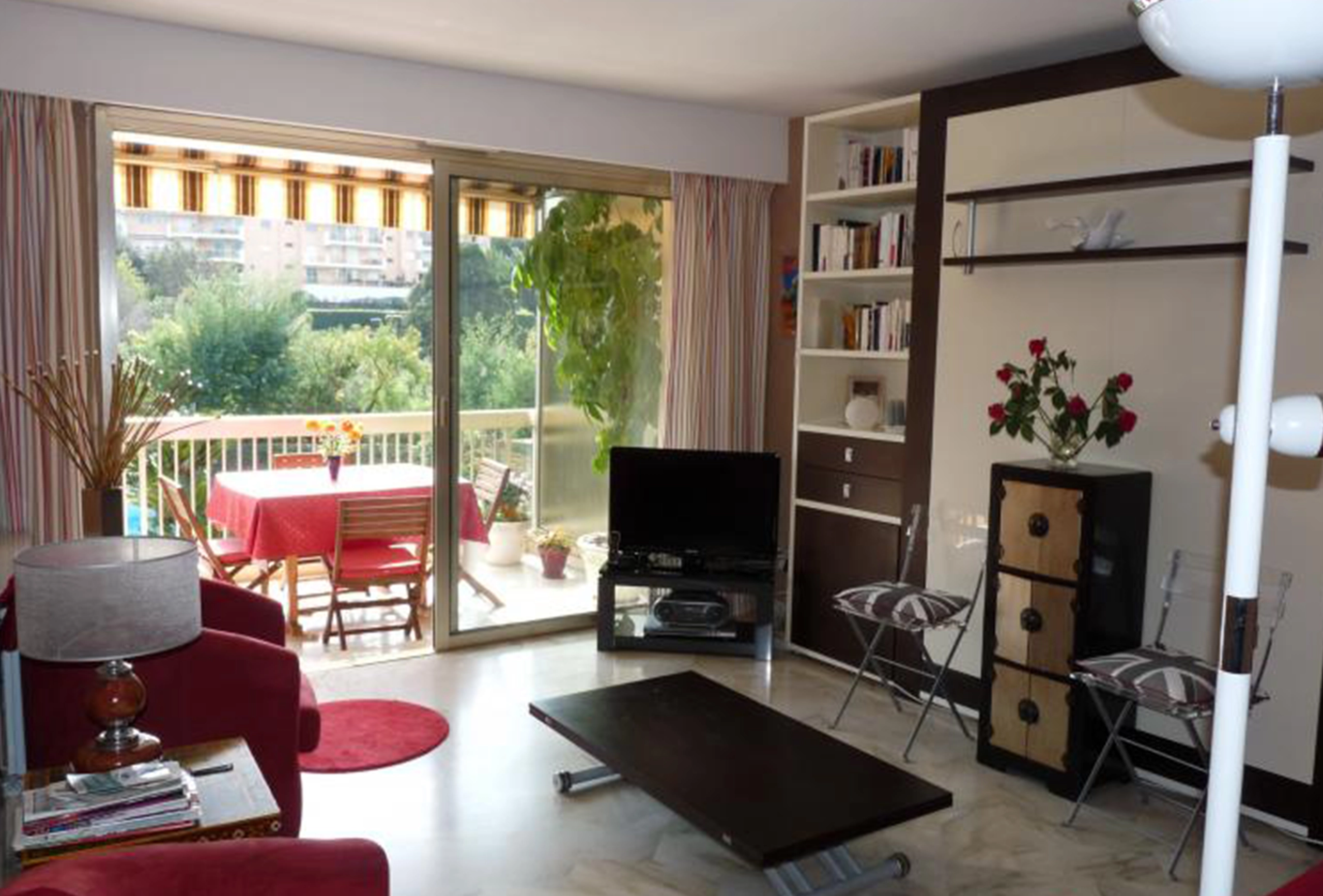 bedroom, one bathroom apartment in the quiet and high end area of Petit Juas in Cannes. Set in a very green and well maintained park residence, with a shared pool and open views, this one bedroom apartment is perfect for attending the many conferences in Cannes and coming home to some peace and quiet in the evening, or just for a relaxing holiday to enjoy the quiet and the proximity to the town center. A 20 minute walk to the Palais des Festival, and a little less to the first part of the Croisette, this one bedroom apartment is comfortable and very well kept. In an older and more comfortable style, the owner has put a lot of attention to detail and equipment. On entering the apartment the bedroom and bathroom are to your left and can be closed off with a door to completely separate the living and sleeping area, direclty ahead of you is the main living and sitting area and to your right is the kitchen. The bedroom has a double bed and large sliding windows out onto the terrace, with nice bright and open views. The bathroom has a bathtub with shower attachment and a washbasin. There is a separaate guest toilet. The kitchen is small but very well equipped, just what you need to cook a proper meal or just have a quick breakfast. The living are is very comfortable with a nice sofa and two armchairs, a coffee table (which can be lifted up into a dining table) and flat screen TV. Behind the shelves to your right is a double pull down bed. The terrace is large and well equipped, with a nice sun lounger, a table and chairs for 4 and very nice open views over the green and tidy park and the shared pool on the grounds.