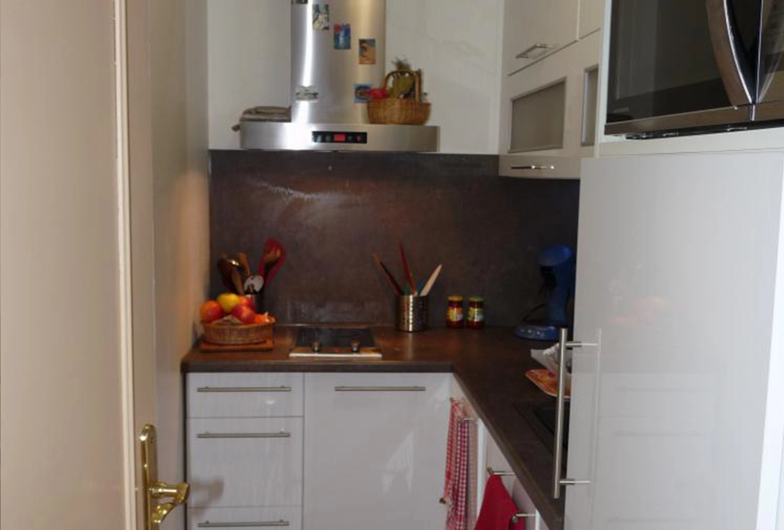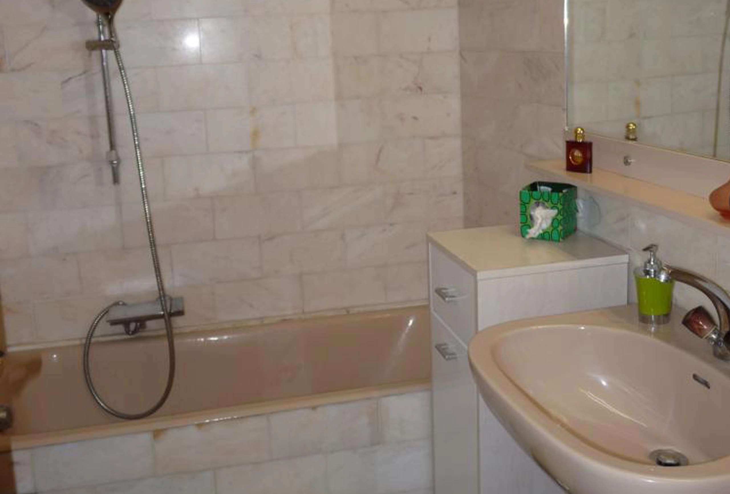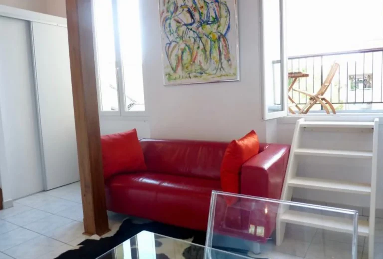 bedroom, one bathroom apartment in the quiet and high end area of Petit Juas in Cannes. Set in a very green and well maintained park residence, with a shared pool and open views, this one bedroom apartment is perfect for attending the many conferences in Cannes and coming home to some peace and quiet in the evening, or just for a relaxing holiday to enjoy the quiet and the proximity to the town center. A 20 minute walk to the Palais des Festival, and a little less to the first part of the Croisette, this one bedroom apartment is comfortable and very well kept. In an older and more comfortable style, the owner has put a lot of attention to detail and equipment. On entering the apartment the bedroom and bathroom are to your left and can be closed off with a door to completely separate the living and sleeping area, direclty ahead of you is the main living and sitting area and to your right is the kitchen. The bedroom has a double bed and large sliding windows out onto the terrace, with nice bright and open views. The bathroom has a bathtub with shower attachment and a washbasin. There is a separaate guest toilet. The kitchen is small but very well equipped, just what you need to cook a proper meal or just have a quick breakfast. The living are is very comfortable with a nice sofa and two armchairs, a coffee table (which can be lifted up into a dining table) and flat screen TV. Behind the shelves to your right is a double pull down bed. The terrace is large and well equipped, with a nice sun lounger, a table and chairs for 4 and very nice open views over the green and tidy park and the shared pool on the grounds.