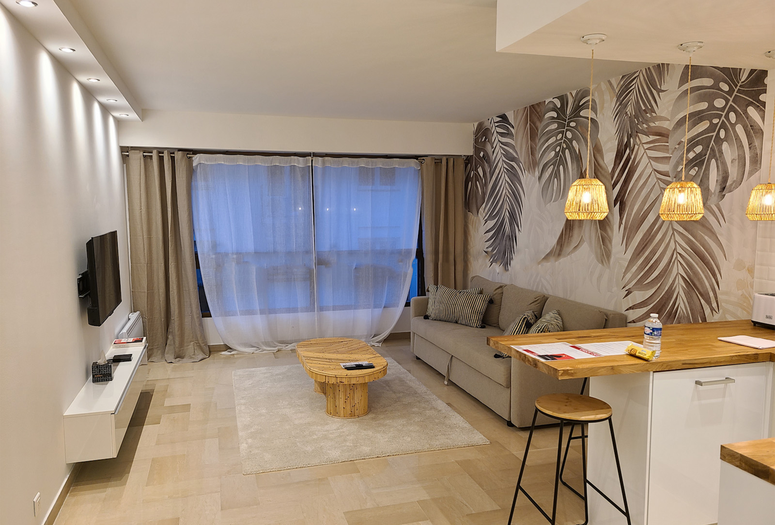 Small luxurious one-bedroom apartment in the prestigious Gray d’Albion residence, a two-minute walk from the convention centre and only a few metres from the Croisette. The apartment is on the 4th floor with lift.The property looks out on a small pedestrian-only arcade of good boutiques. The living room has a sofa bed and an attractive dining corner. The small double bedroom has no window onto the exterior, but ample light filters in from the living area through an opaque glass block screen in the partition wall. The bathroom proposes a bath with shower over. The toilets are independent. There is an equipped open kitchen with breakfast bar. Everything you could want in terms of luxury and compact practicality. Very well situated to boot!