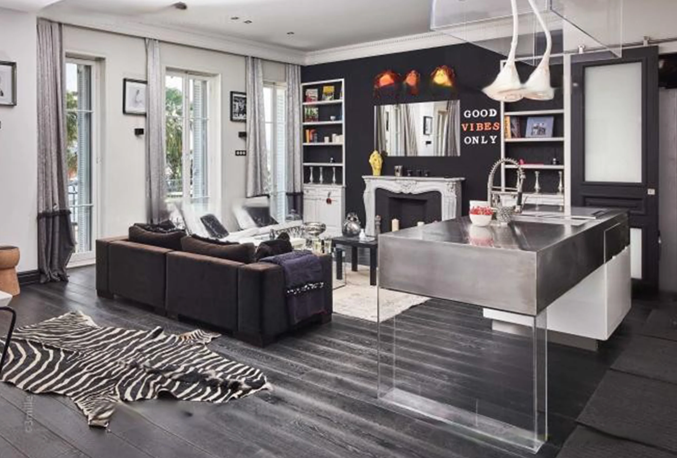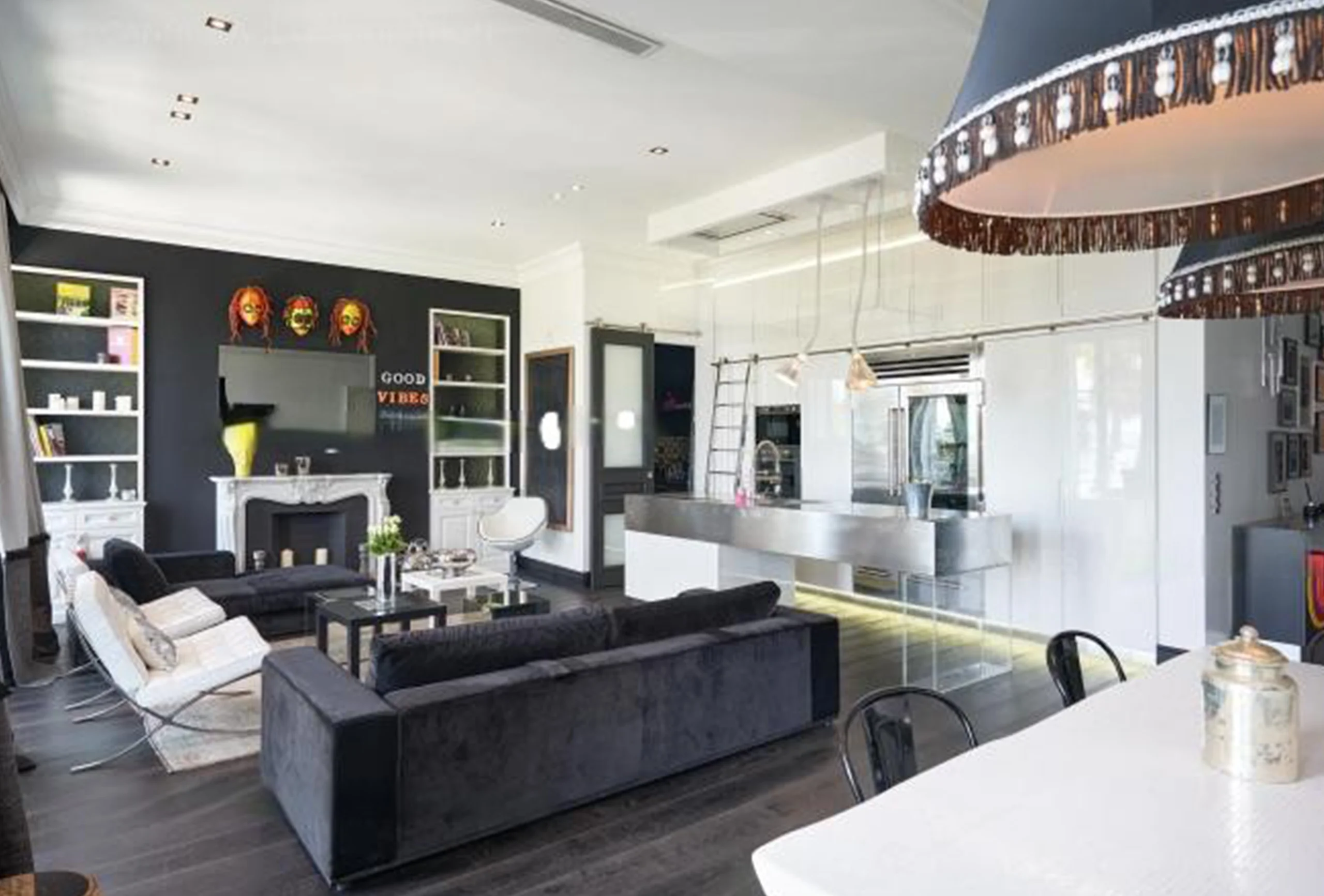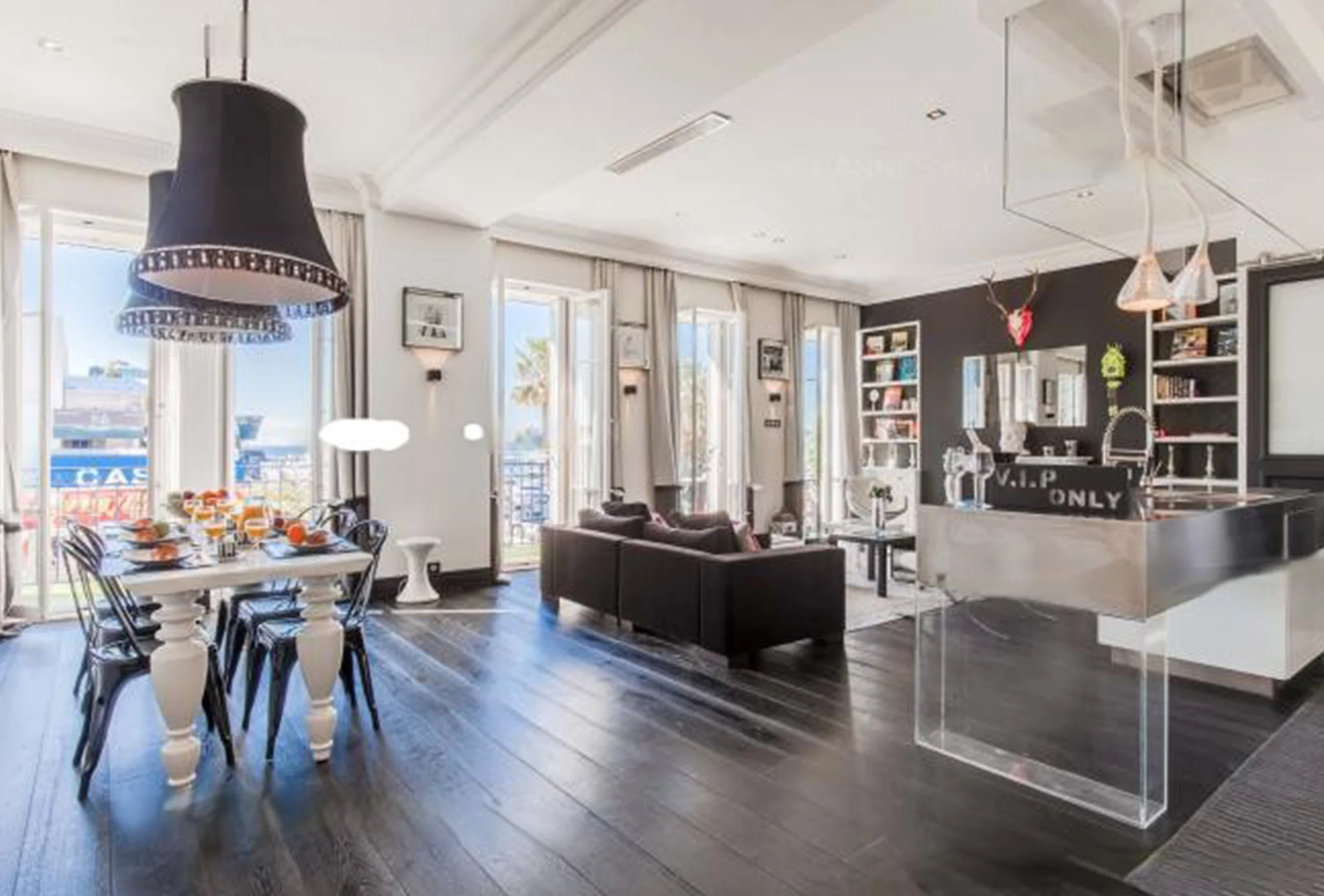 A magnificent three-bedroom apartment just opposite the Palais des Festivals, on Square Mérimée. It is on the 3rd floor with lift service from the 1st floor in a well maintained bourgeois style building. It is fully renovated with high quality equipment. The decoration is modern and uncluttered. It features a long balcony of 12 meters long with magnificent views over the harbor, the Palais des Festivals and the start of the Croisette. The vast living room features just about everything – a high sloping ceiling, generous sitting, dining and working areas and a beautiful ‘space-age’ kitchen which is an integral part of the room and lots of light. Receptions, meetings, cocktails, there is potential for all. The bedrooms are located to the rear of the apartment, above rue Bivouac Napoleon.