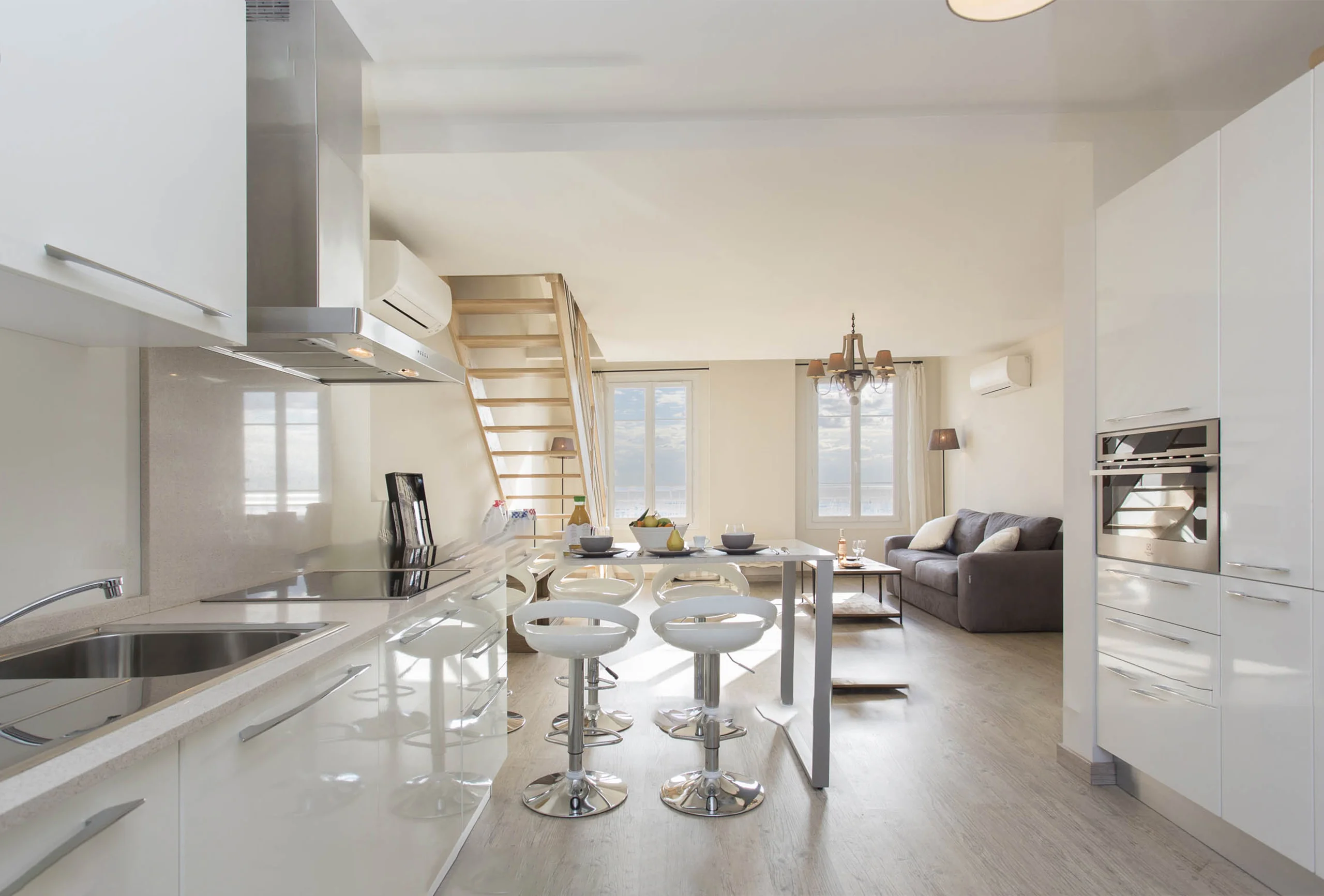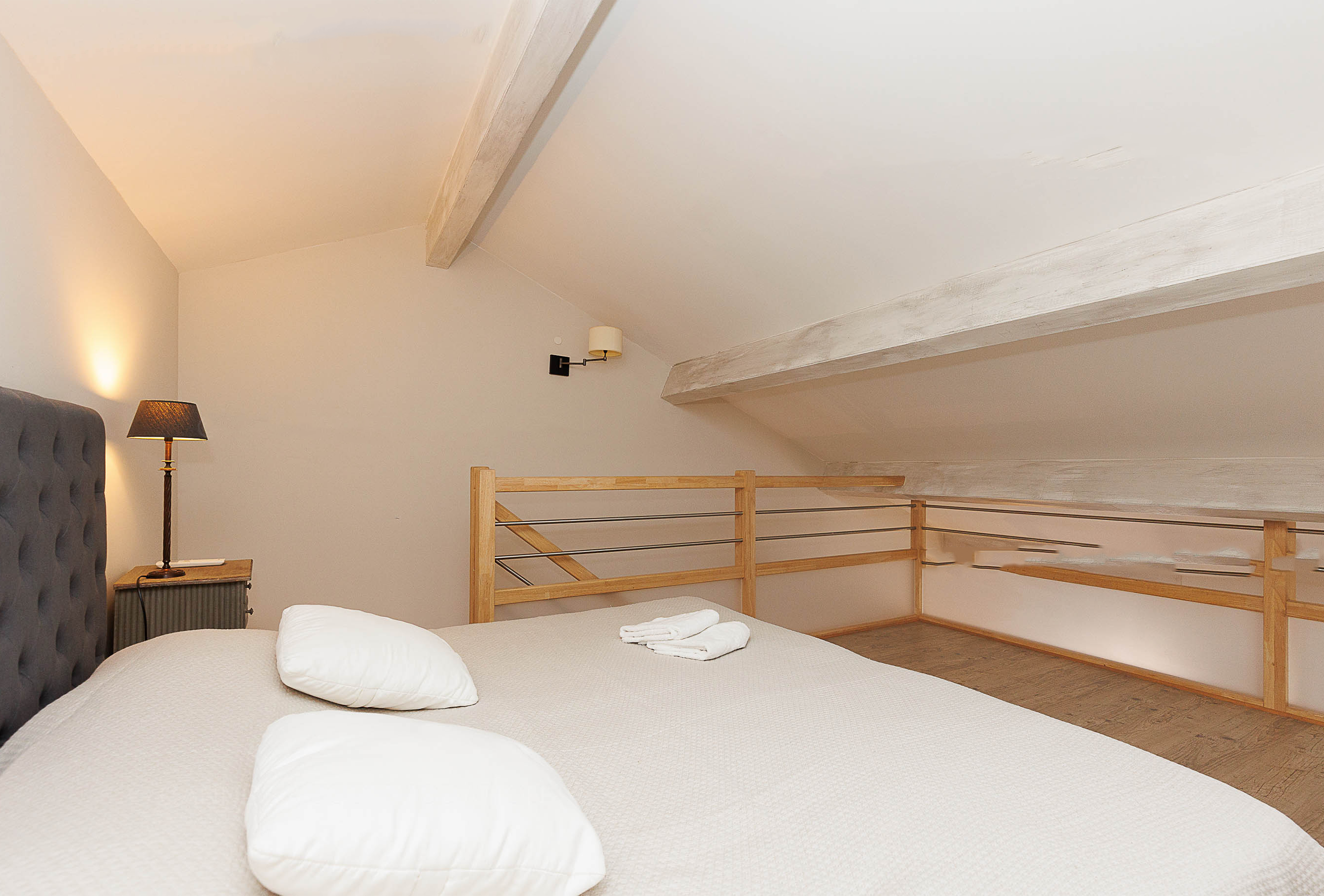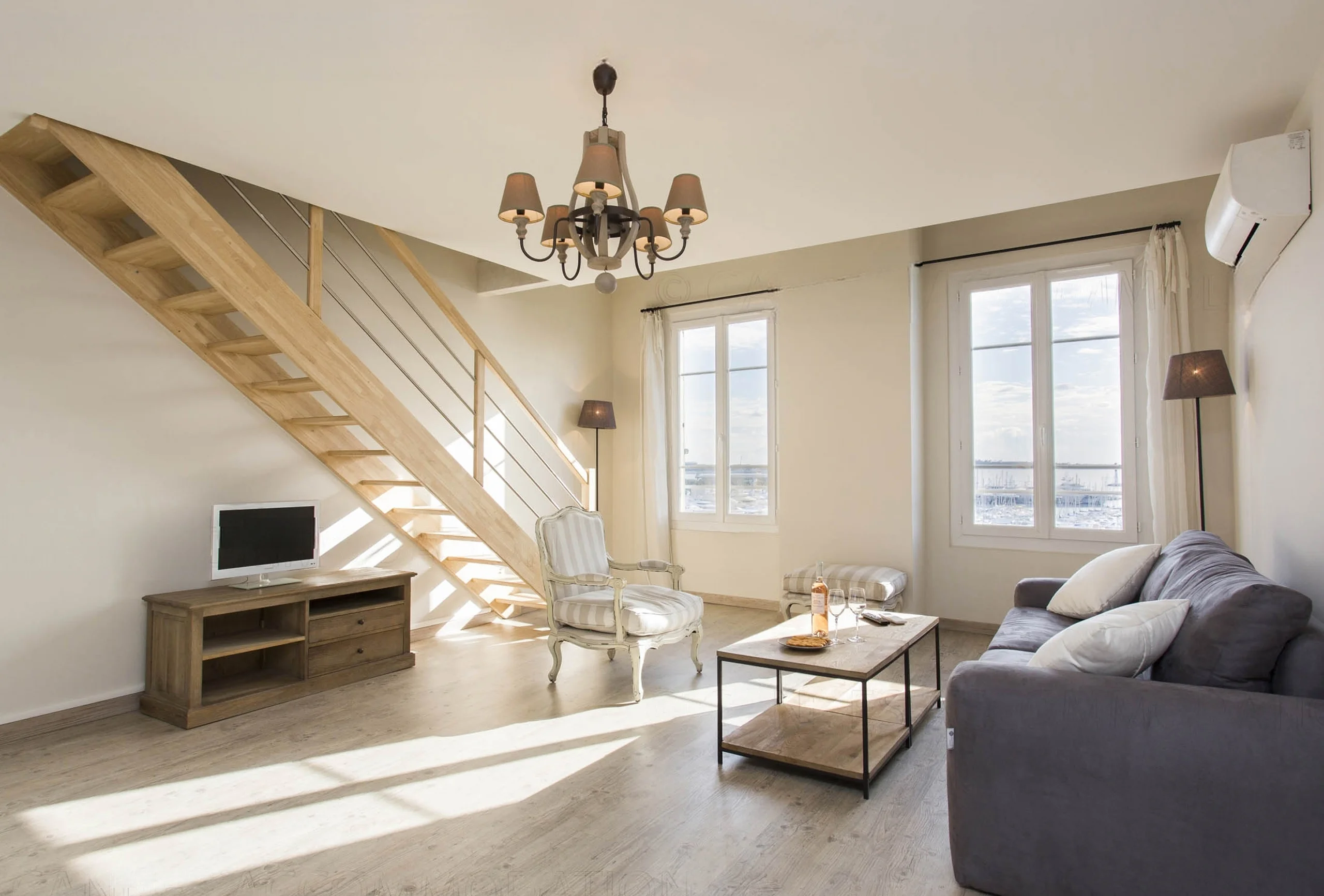 This building offers the possibility to rent two apartments. Those splendid apartments have a fantastic view of the old harbour and the old town. And it is just five minutes’ walk from the Palais! They have been renovated in elegant fashion. This two-bedroom apartment is on the 5th and last floor with lift. The good-sized living room has a modern feel and provides comfortable sitting. The attractive first bedroom is equipped with twin single beds which can be transformed into a double. In the living room there are stairs up to the upper floor with the second bedroom. It offers twin single beds which can be transformed into a double. The modern kitchen is fully-equipped and has a breakfast bar giving onto the living room. The bathroom has a shower and toilet. It is a truly exceptional property, you will appreciate the volume, the decoration and the proximity from the Palais.