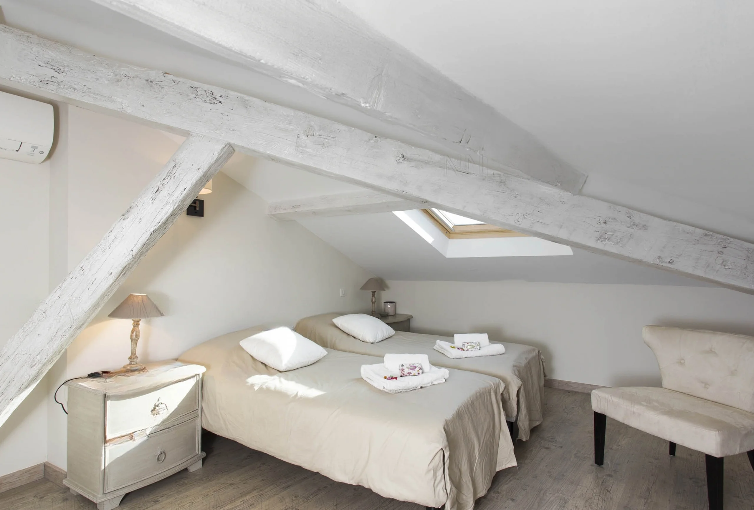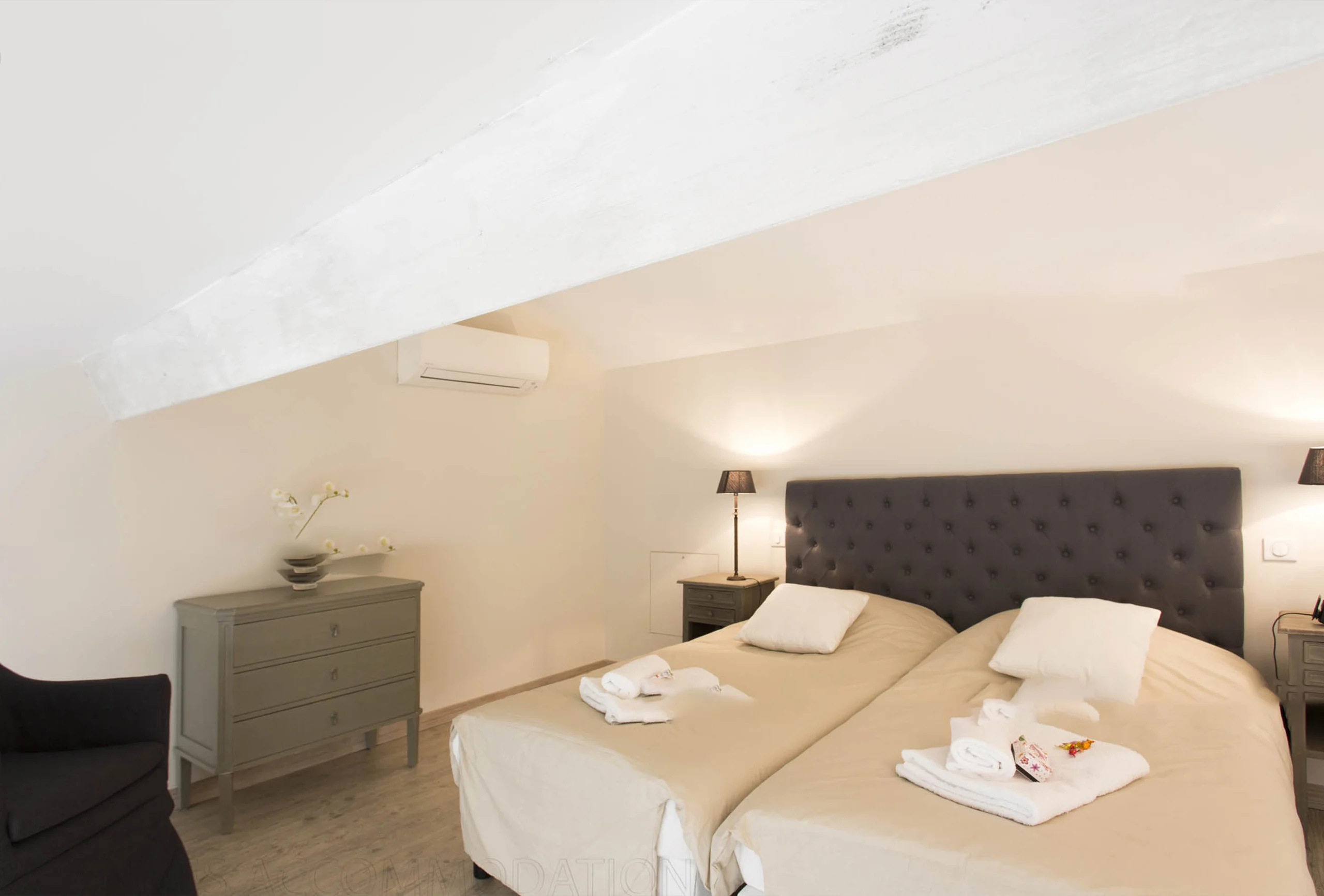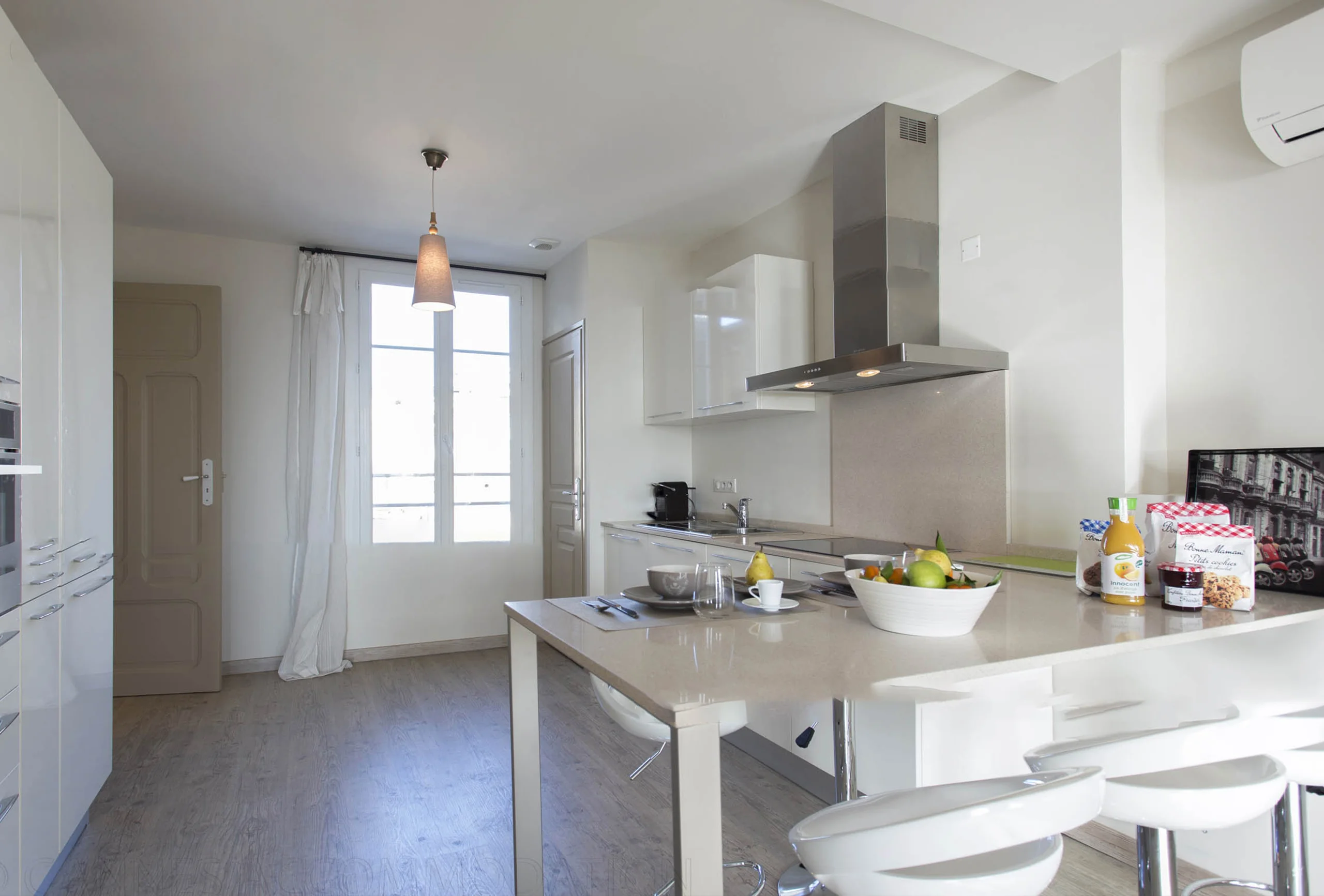 This building offers the possibility to rent two apartments. Those splendid apartments have a fantastic view of the old harbour and the old town. And it is just five minutes’ walk from the Palais! They have been renovated in elegant fashion. This two-bedroom apartment is on the 5th and last floor with lift. The good-sized living room has a modern feel and provides comfortable sitting. The attractive first bedroom is equipped with twin single beds which can be transformed into a double. In the living room there are stairs up to the upper floor with the second bedroom. It offers twin single beds which can be transformed into a double. The modern kitchen is fully-equipped and has a breakfast bar giving onto the living room. The bathroom has a shower and toilet. It is a truly exceptional property, you will appreciate the volume, the decoration and the proximity from the Palais.