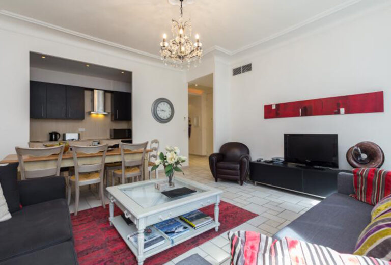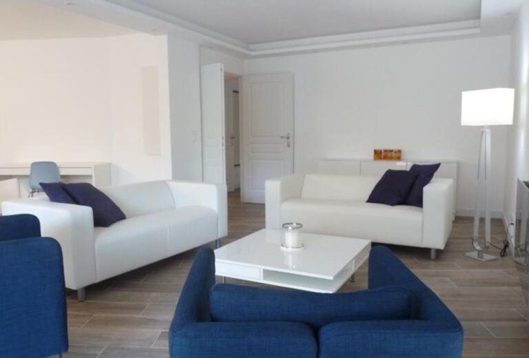600 meters from the Palais des Festival, done is a short 5 minute walk and under a 7 minute walk to the nearest beaches, this apartment is in a perfect location for either attending one of the many conferences in Cannes, or just having a relaxing holiday. On entering the apartment you face the vast living area. It has a fully equipped modern kitchen facing the main room, a dining table for up to 8 people, a comfortable sitting area with a flat screen TV, sofa and armchairs. This room has high ceilings making it all feel very grand. There are 3 sets of tall French windows looking out on the Marché Forville and letting plenty of natural light. All 3 bedrooms are a good size and each has a double bed and an en-suite bathroom room and toilet, they look out on to the courtyard at the entrance of the building. The apartment was renovated to a very high standard, very modern and stylishly furnished.