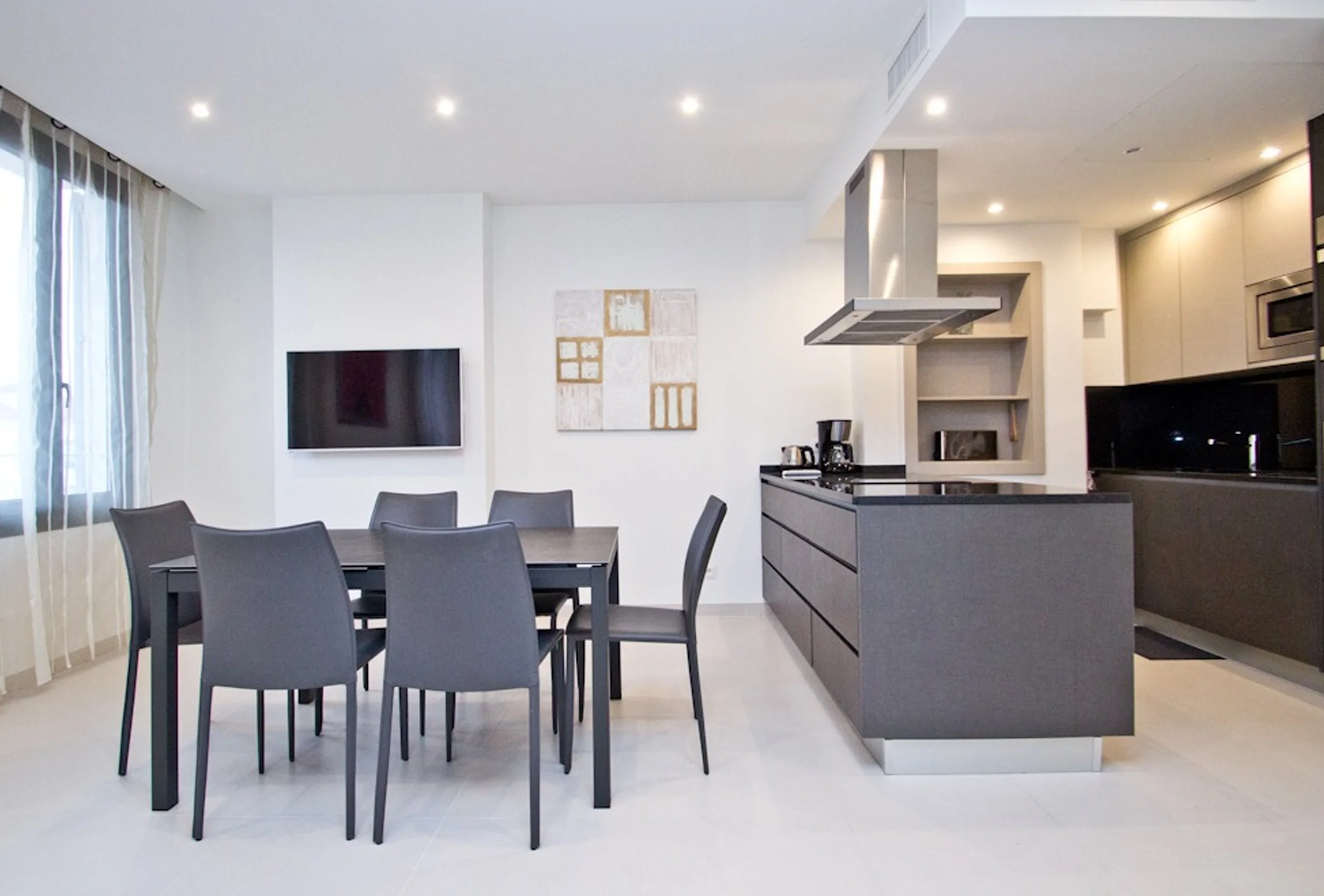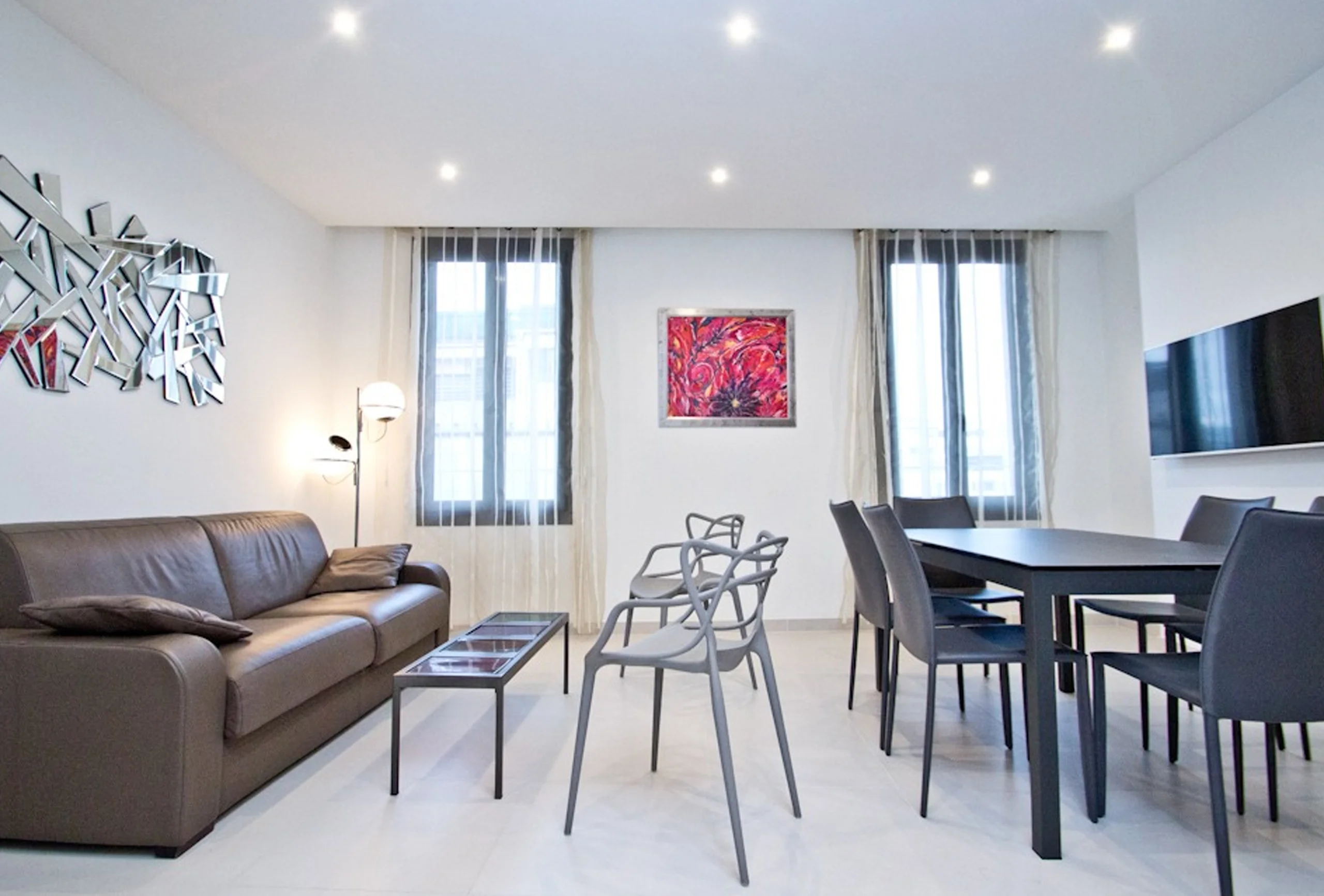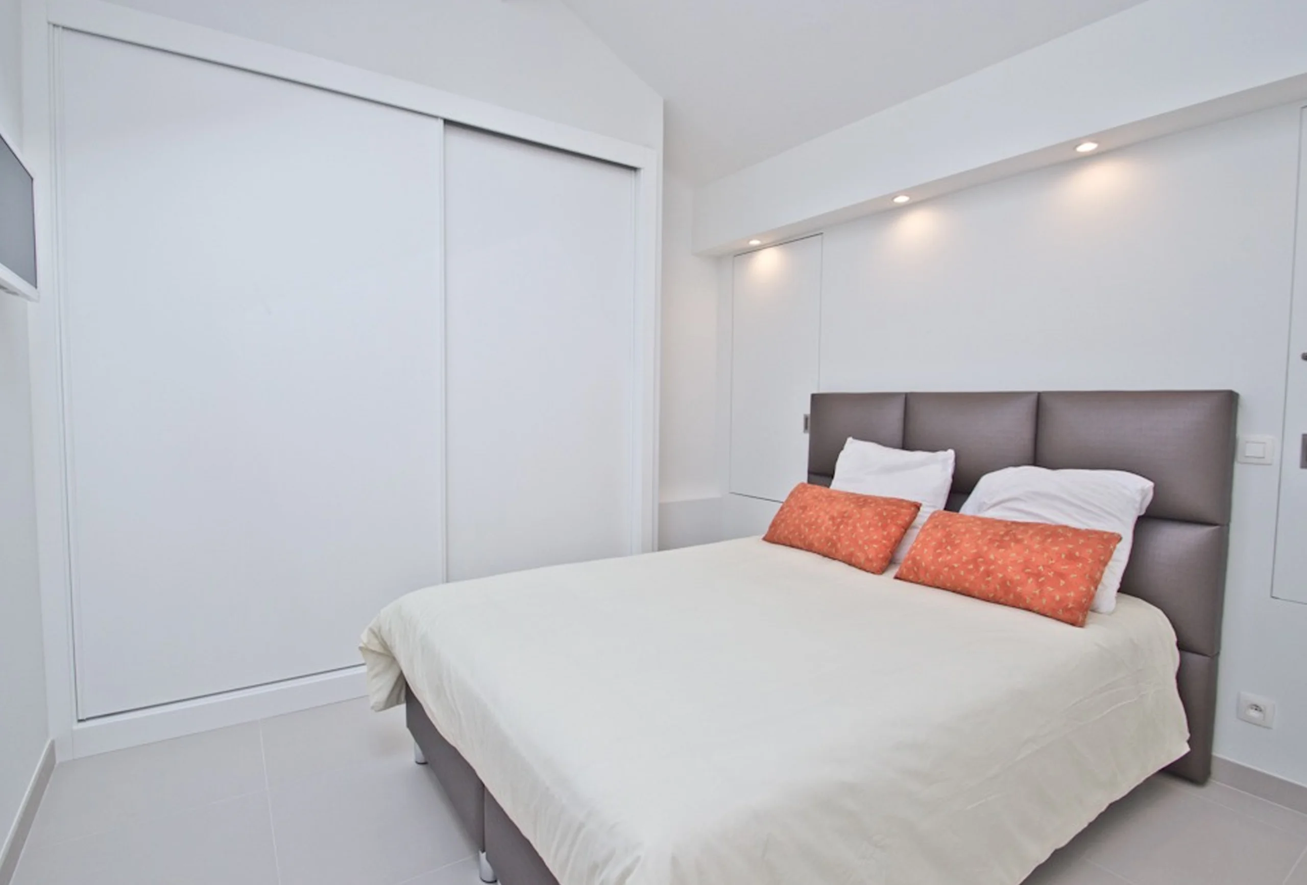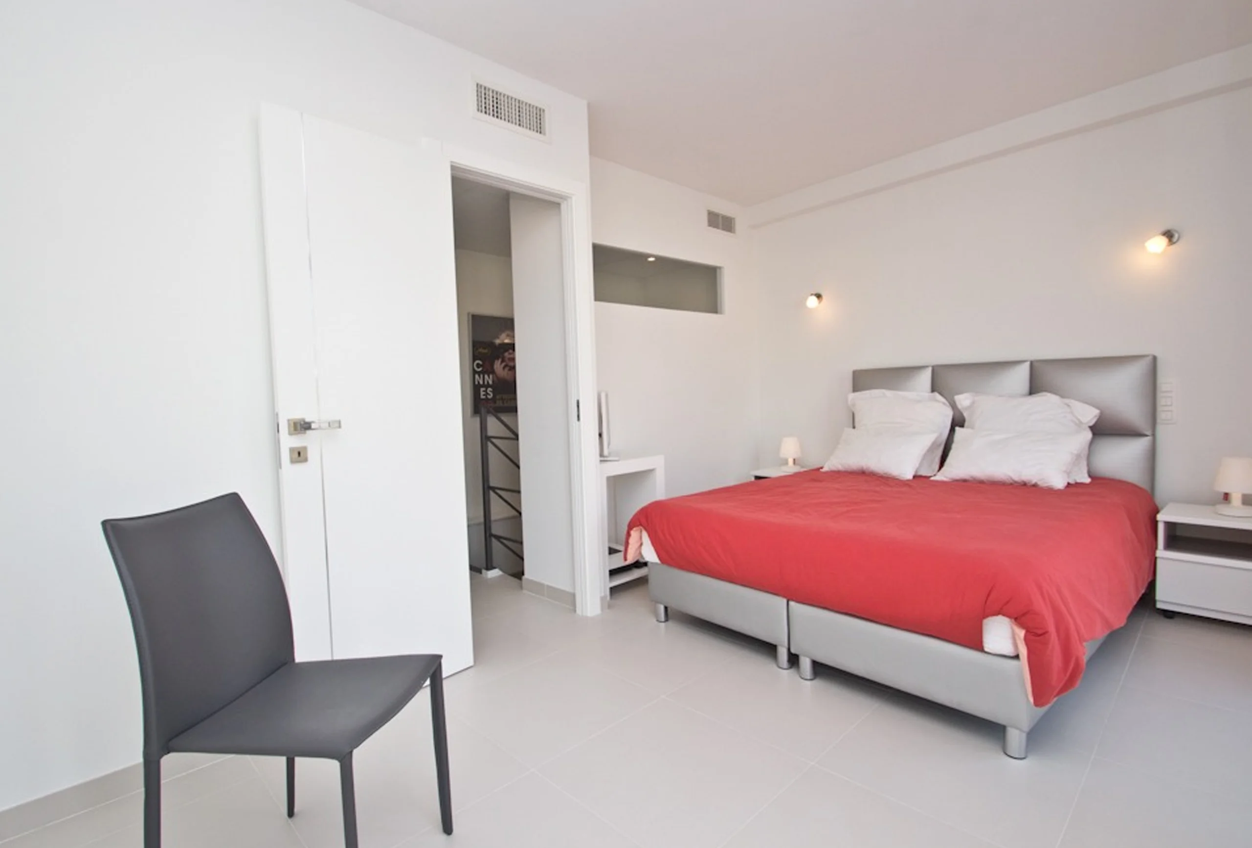 This beautiful duplex is located just four minutes walking from the Convention Centre in the very chic area called “carré d’or”. It has been renovated in a very modern way. This two-bedroom apartment is on the 4th floor without lift. The living room is quite roomy and offers a sofa bed, a dining area and an elegant, very modern and very well equipped kitchen. The attractive first bedroom is equipped with twin single beds which can be transformed into a double. This bedroom has a balcony. The first bathroom has a shower and toilet. The second bedroom has a double bed and an en-suite bathroom with shower This apartment is worth walking up four floors. You will appreciate its volumes, its modernity and the Palais just nearby.