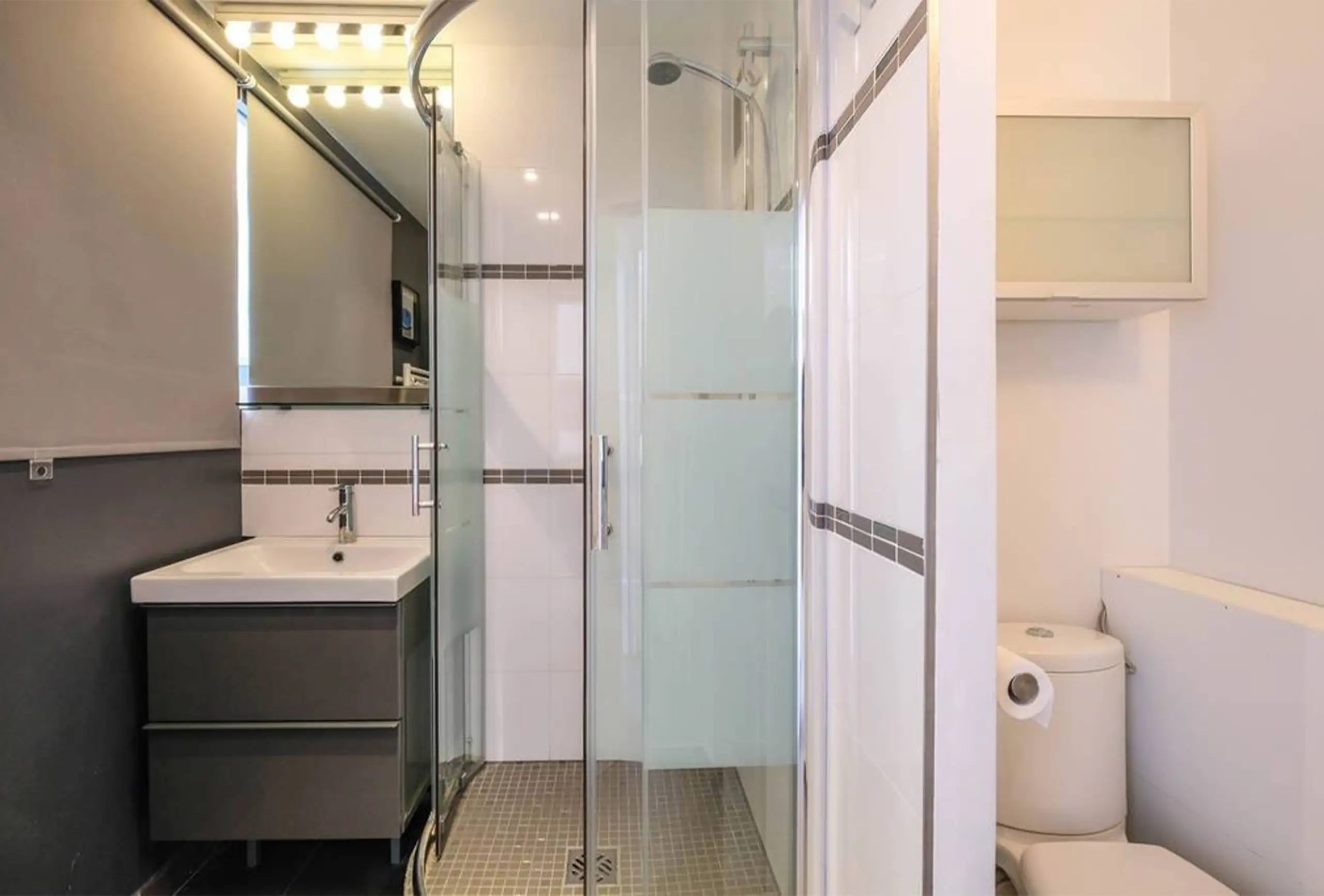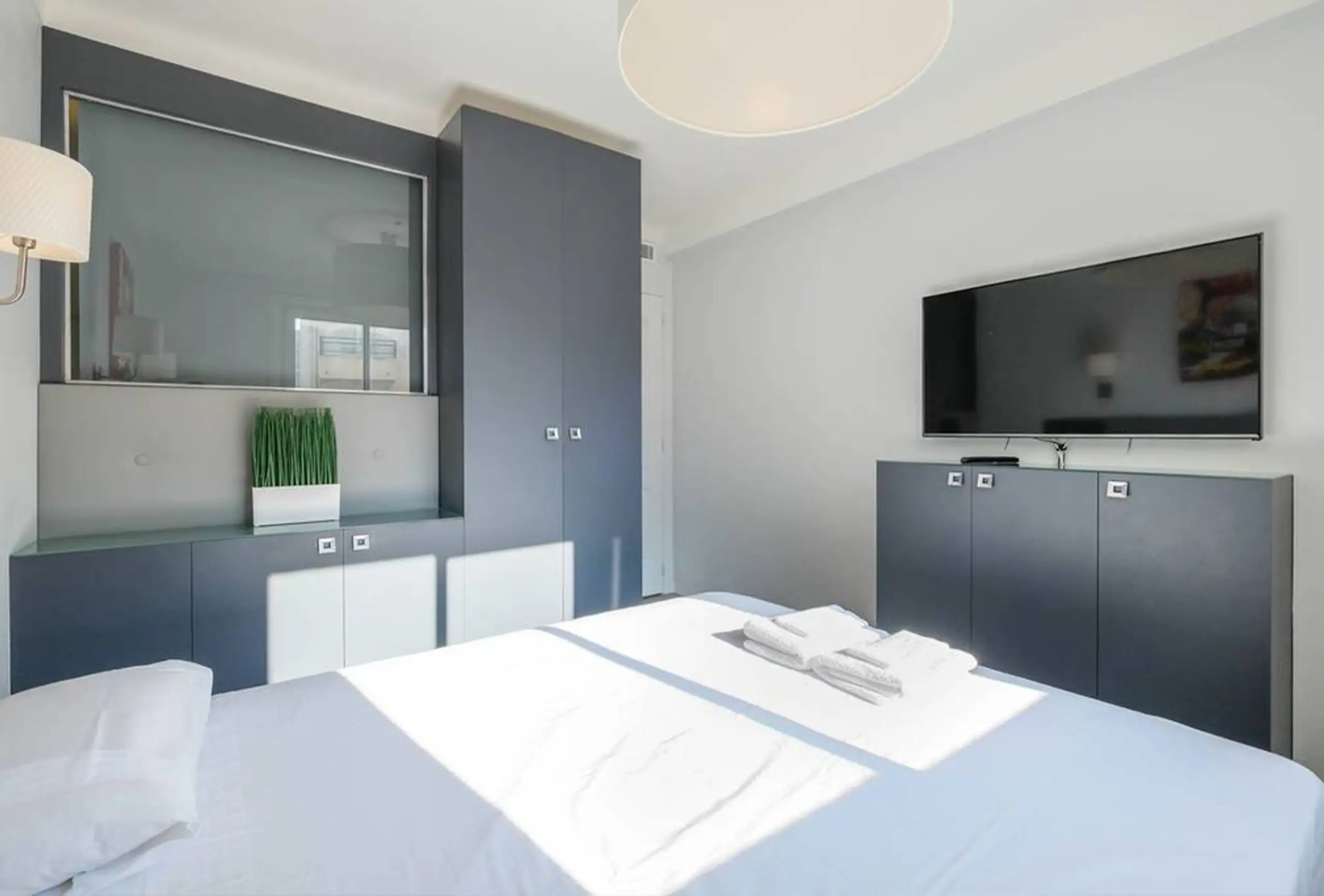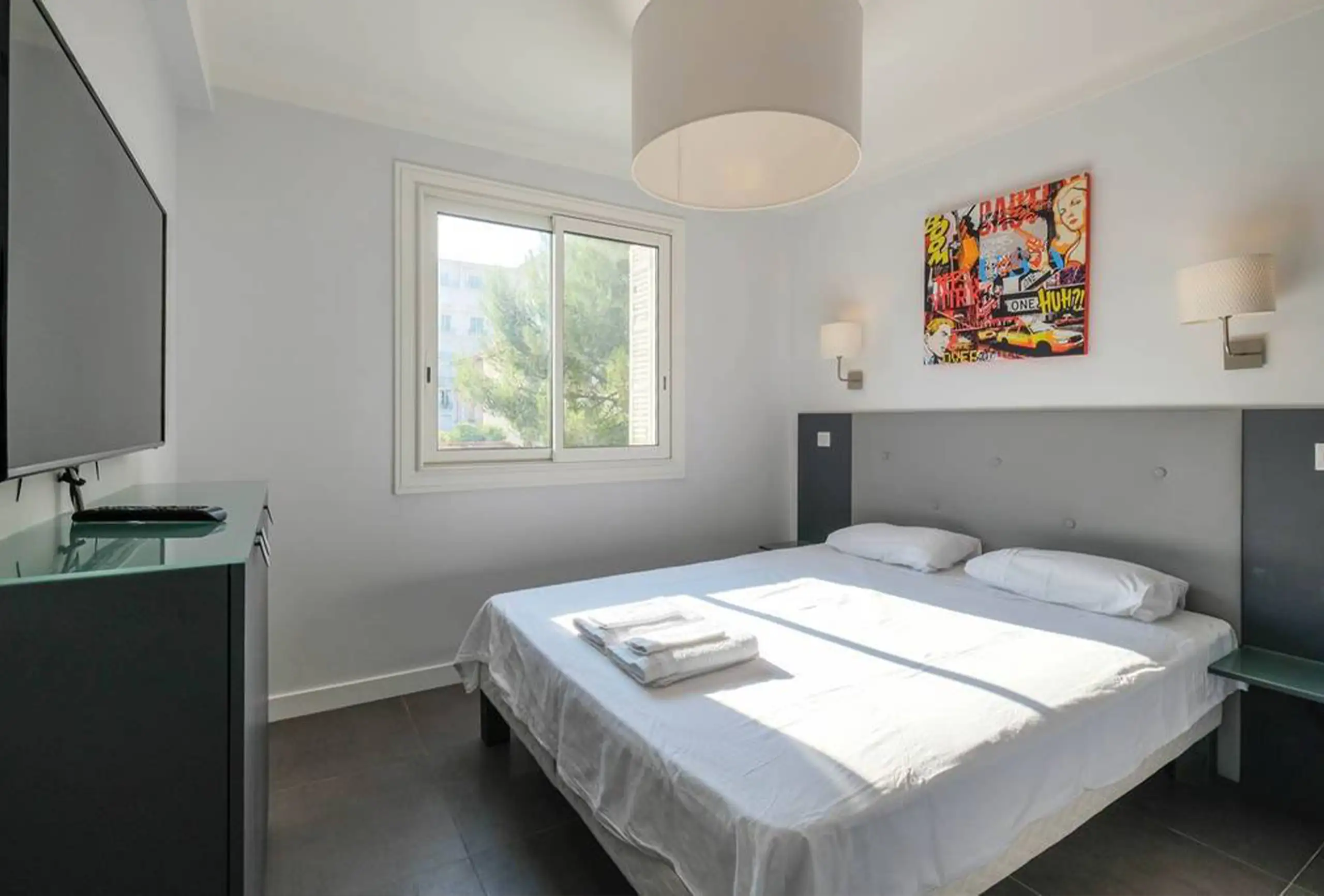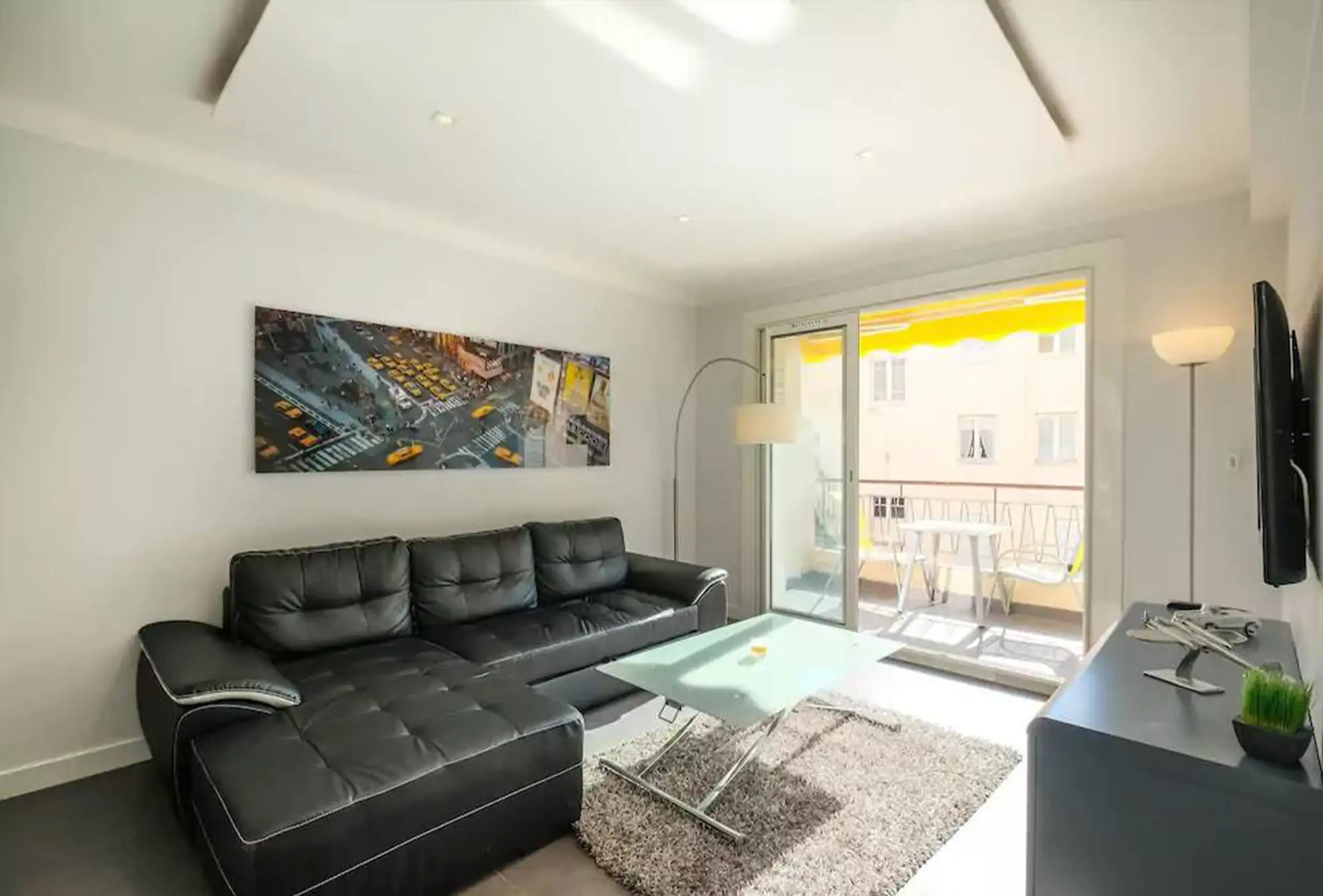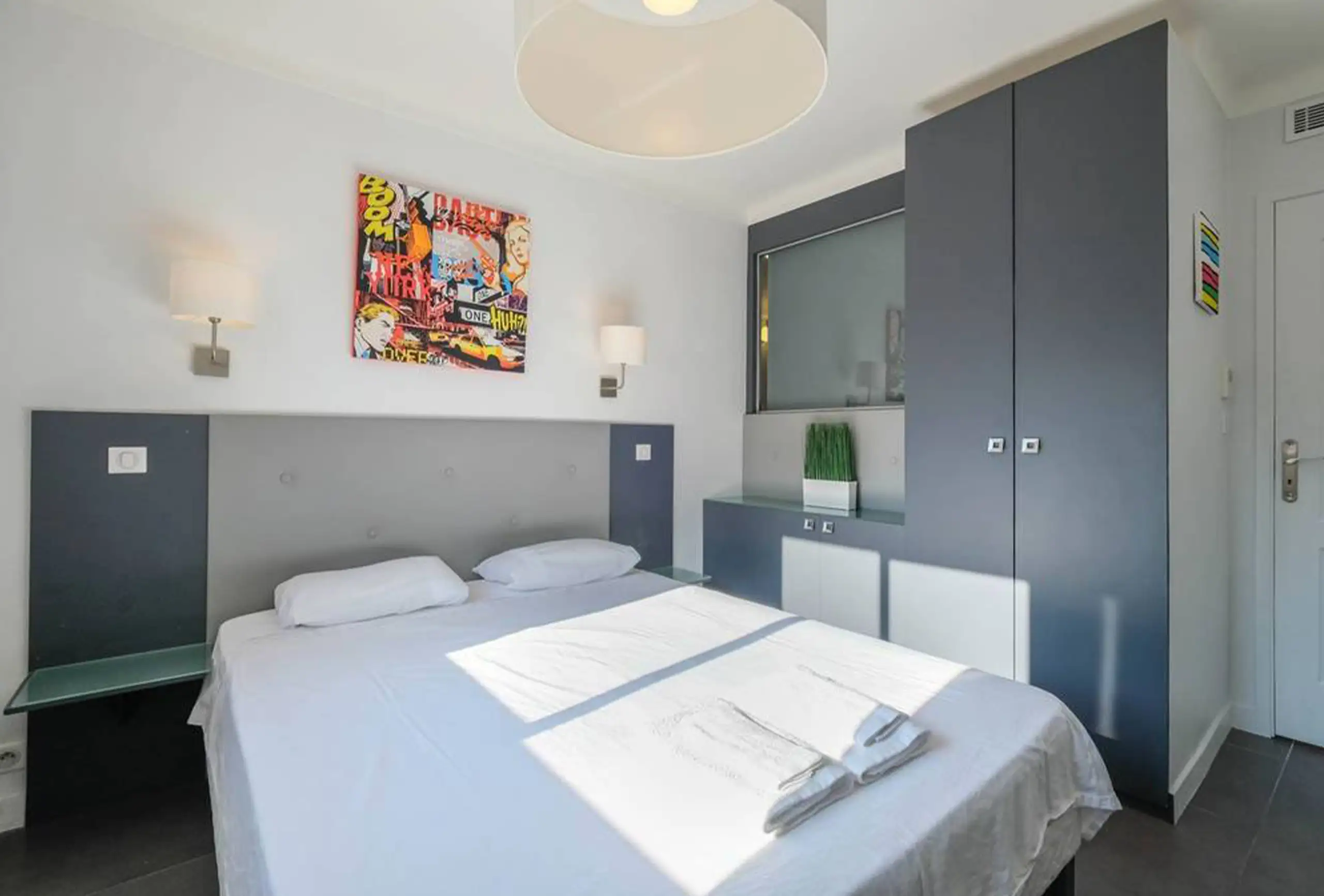 This is a nicely refurbished apartment with great amenities, a sheltered balcony, wonderful view of the beach and easy walk to the Croisette. Really comfortable bed and good shower. One bedroom with comfortable bed. Bright living room with TV. Kitchen fully equipped.
