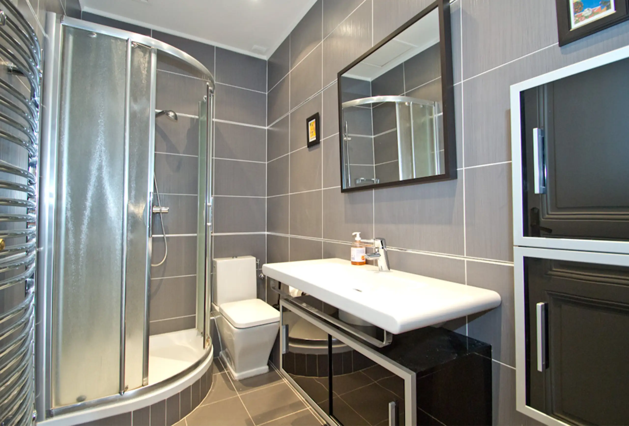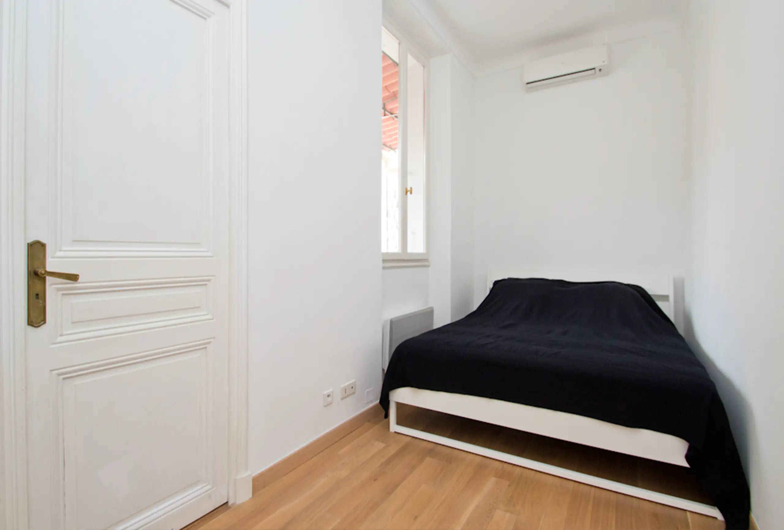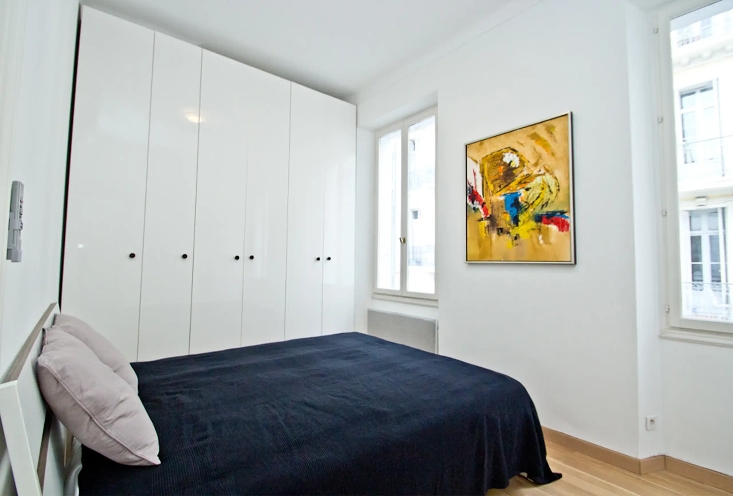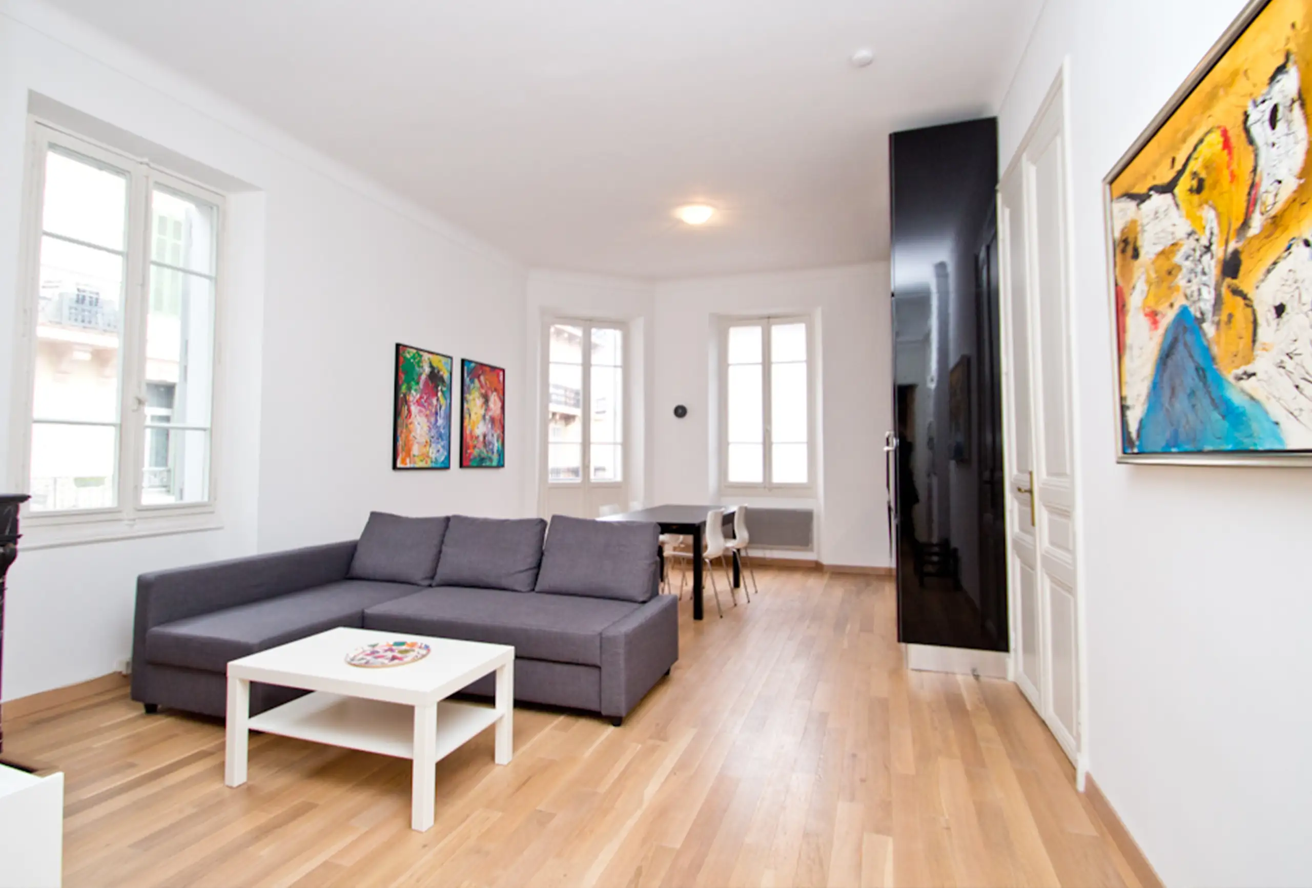 A splendid apartment, with generous volumes and wooden floors throughout. It offers all tmodern comforts and a very pleasant Scandinavian decor. The apartment is on the 2nd floor without lift. It is only 6 minutes’ walk from the Palais des Festivals, a few steps from the charming Forville market and the delicious restaurant of the old town. The light, pleasant and well-proportioned living room has a sofa bed, a nice dining area and an open kitchen. There are two bedrooms each with double beds. Each bedroom has an a bathroom with toilets, one with shower and the other has a bath. The terrace at the back of the apartment is the perfect spot to relax after a long and busy day. The property boasts all that is required in the way of comfort, plus a modern decor and close proximity to the Palais.