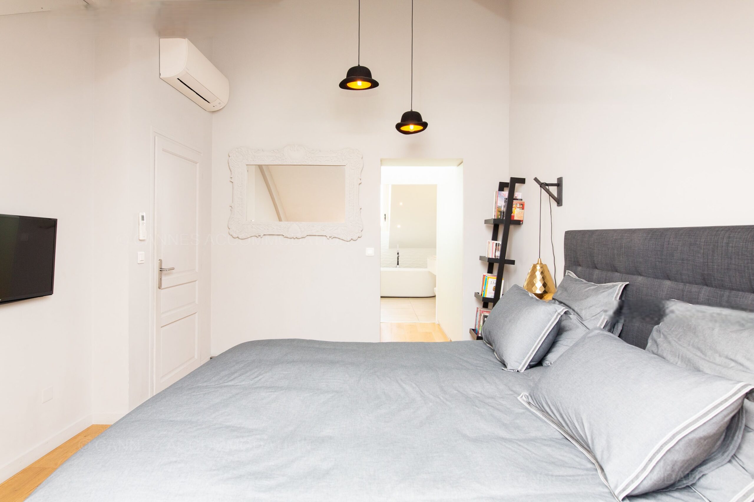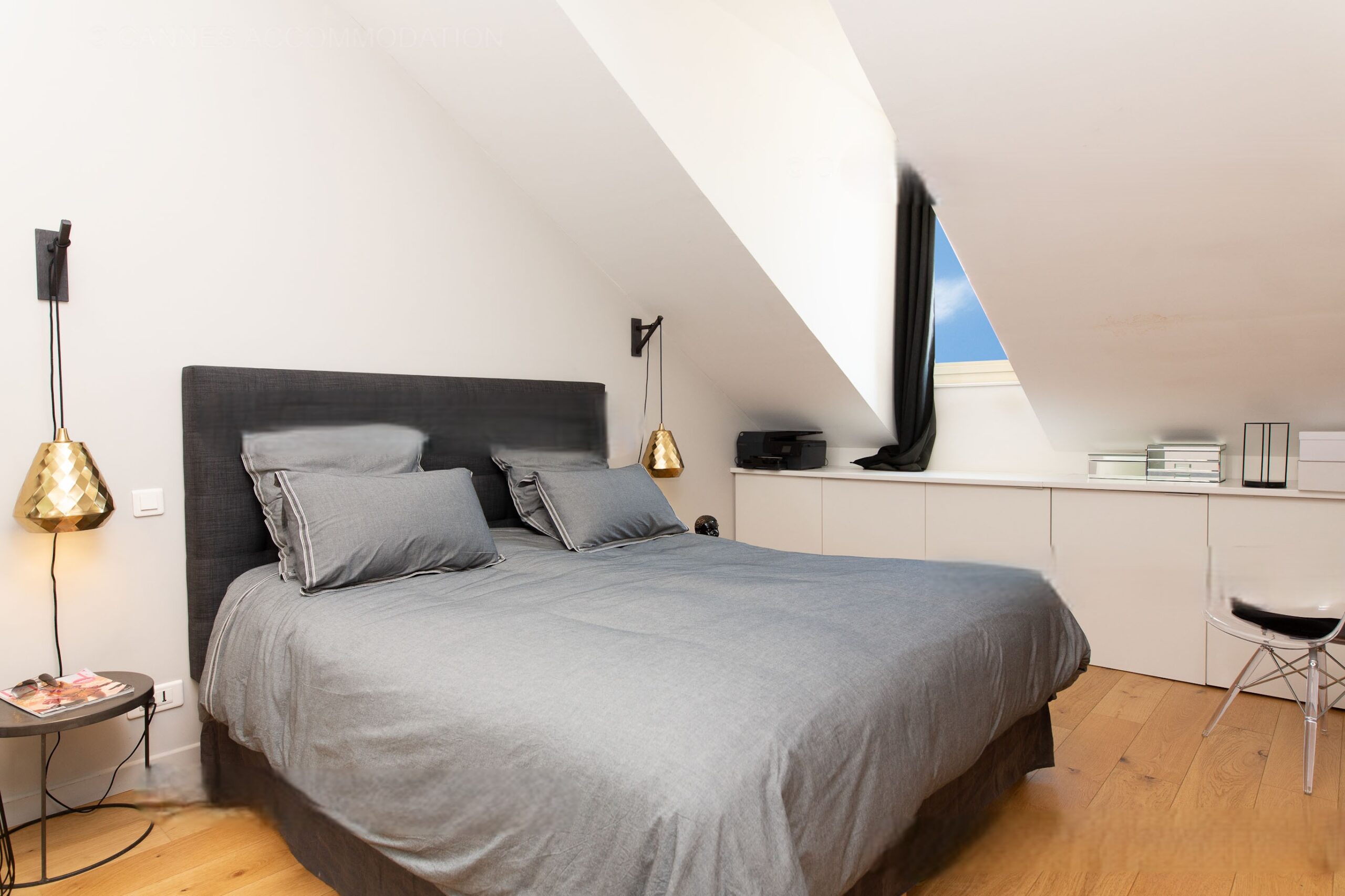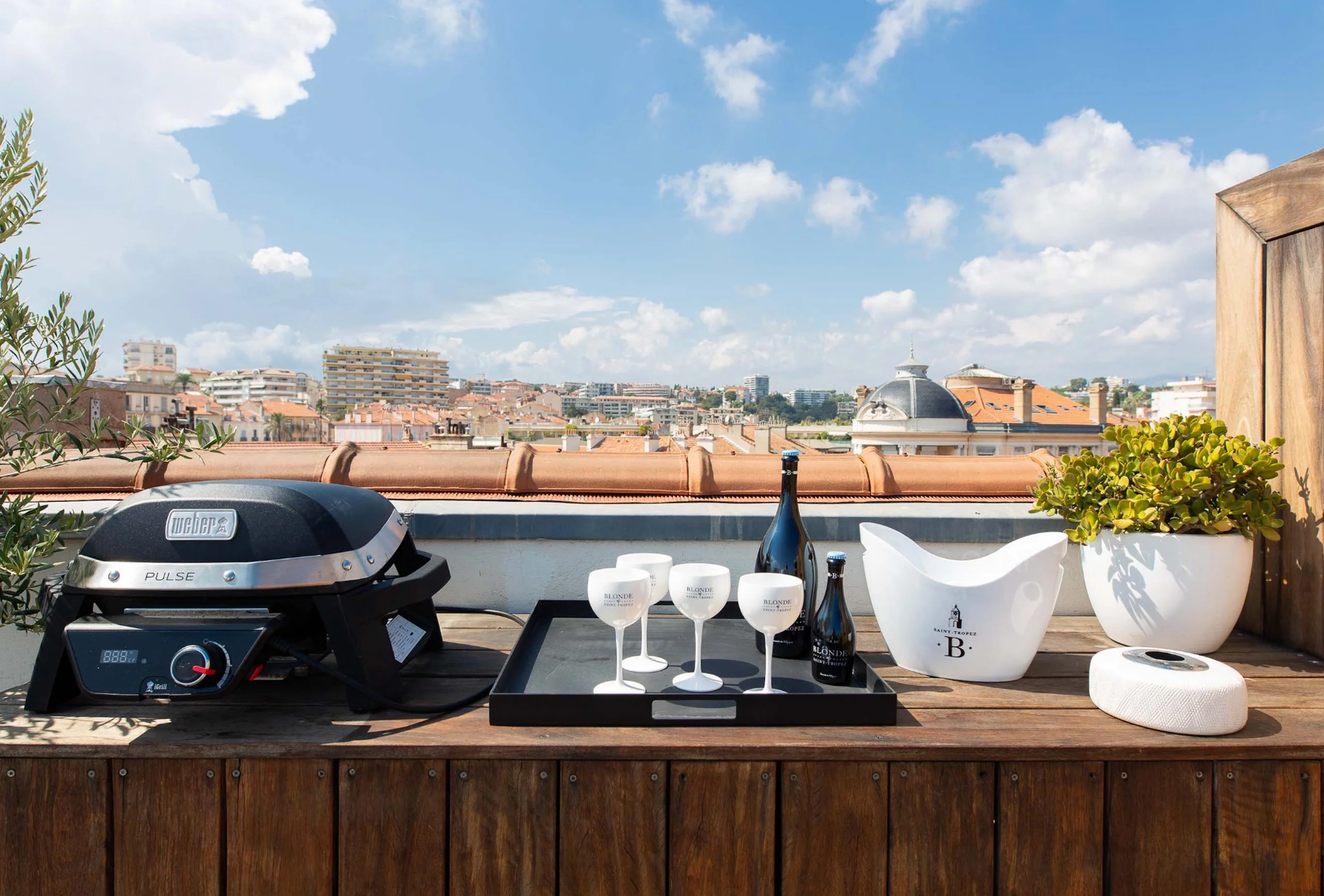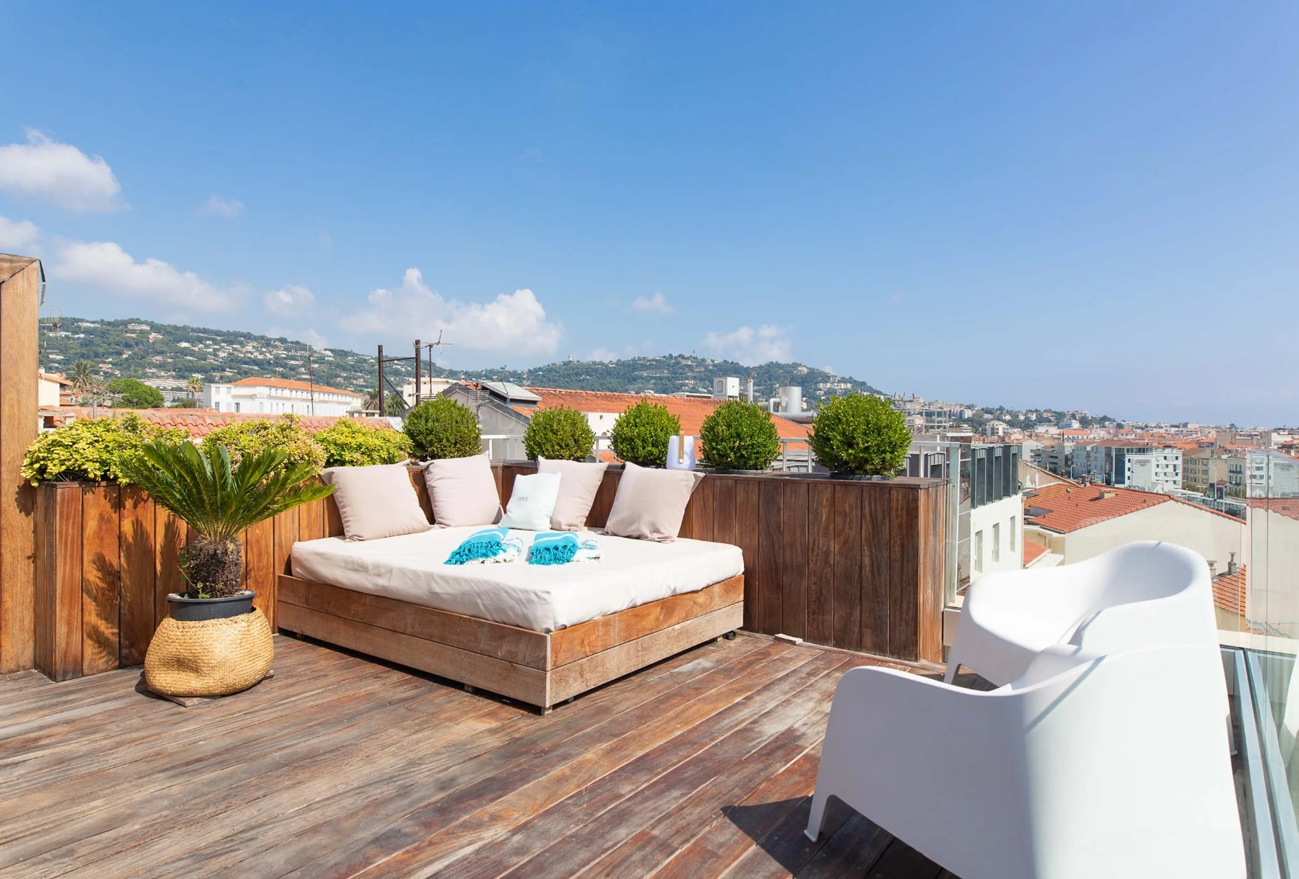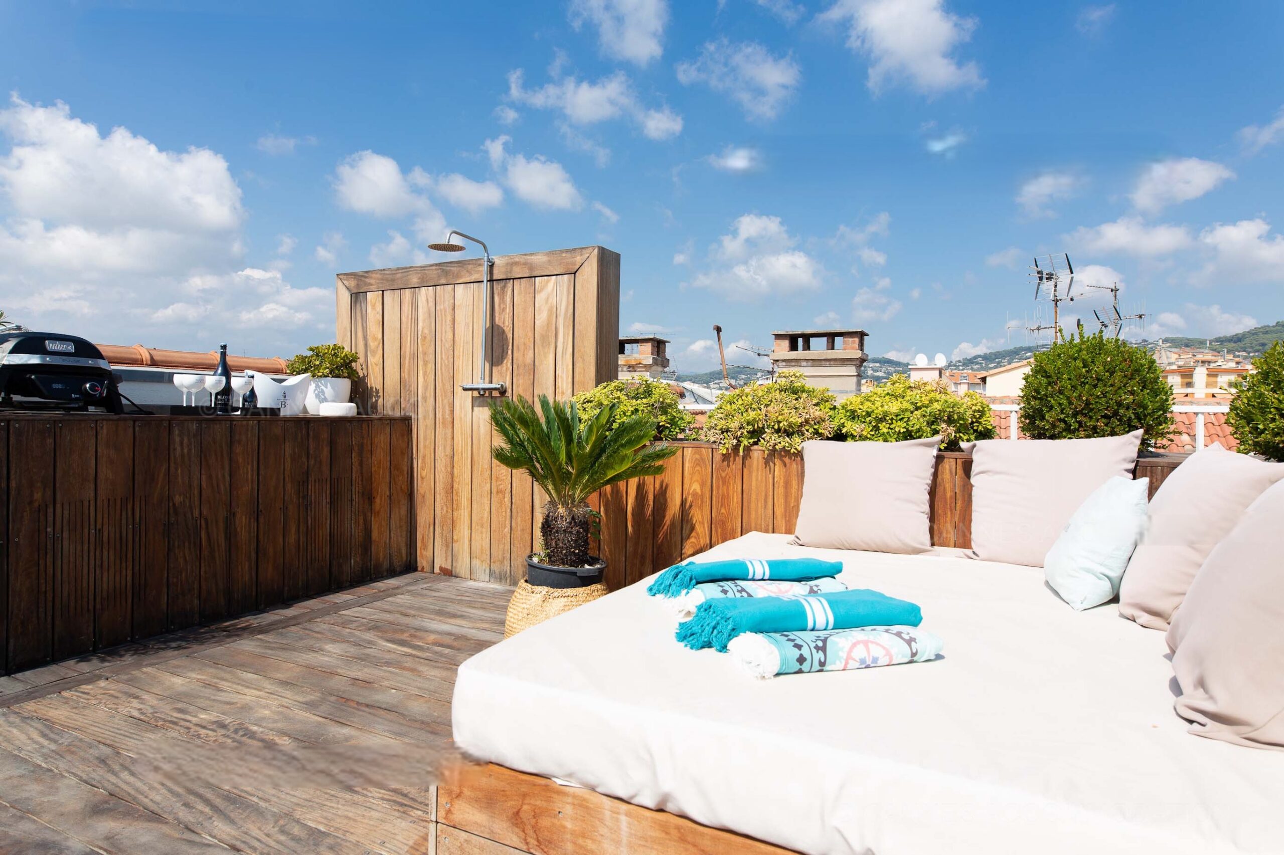 The terrace is accessed via the staircase in the living room, leading up to the rooftop with beautiful views over the Cannes rooftops. It’s the perfect spot to unwind after a busy day, complete with an outdoor shower and a bar area.