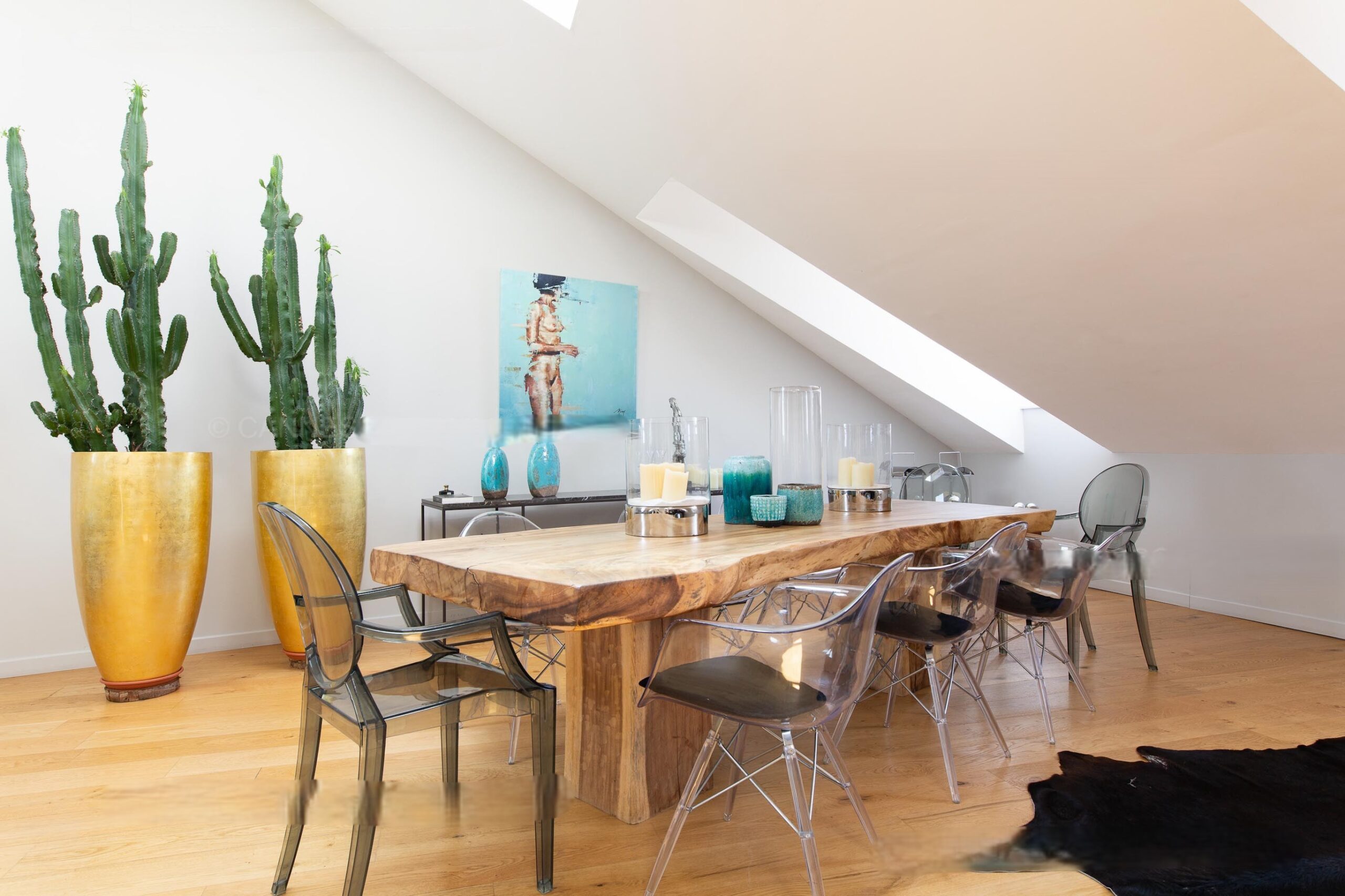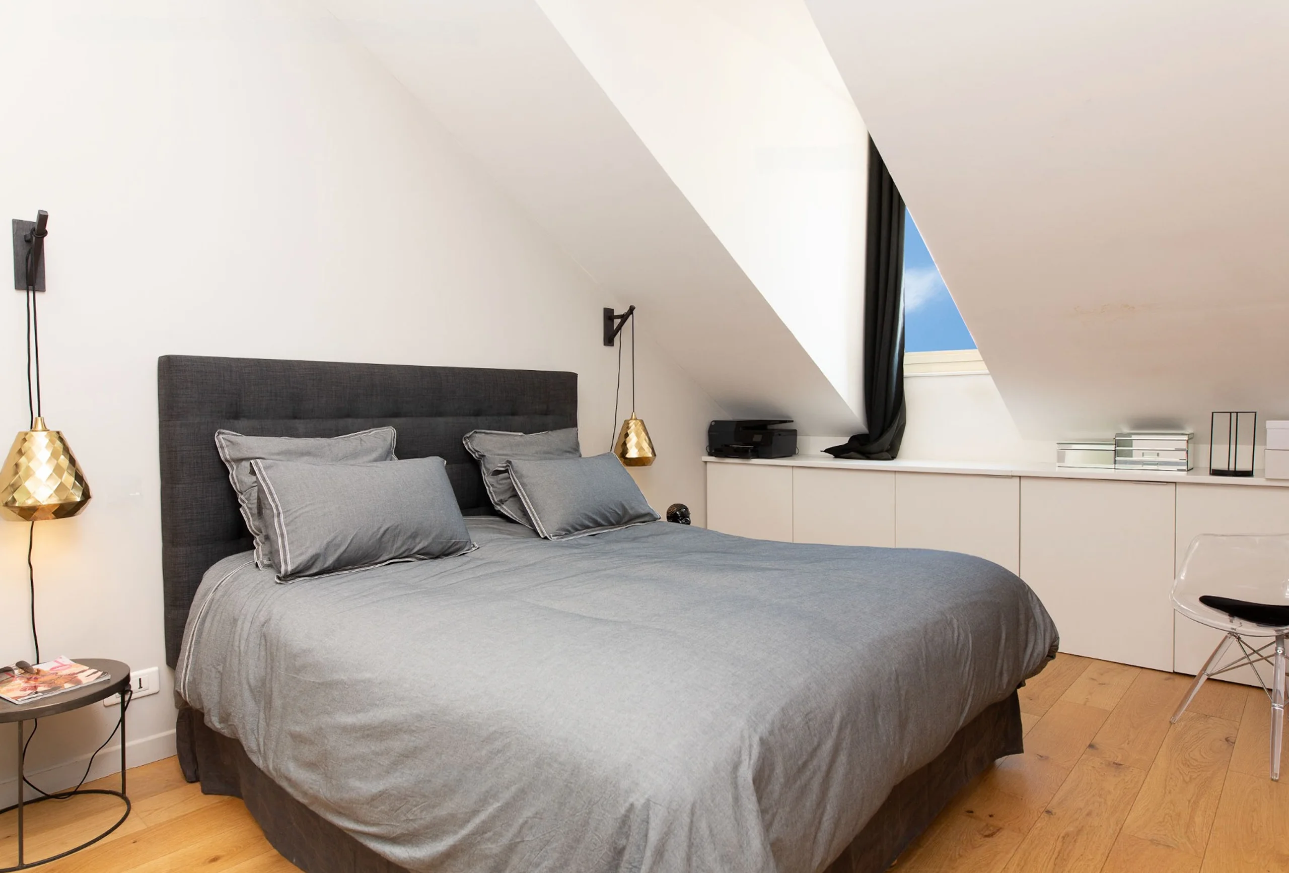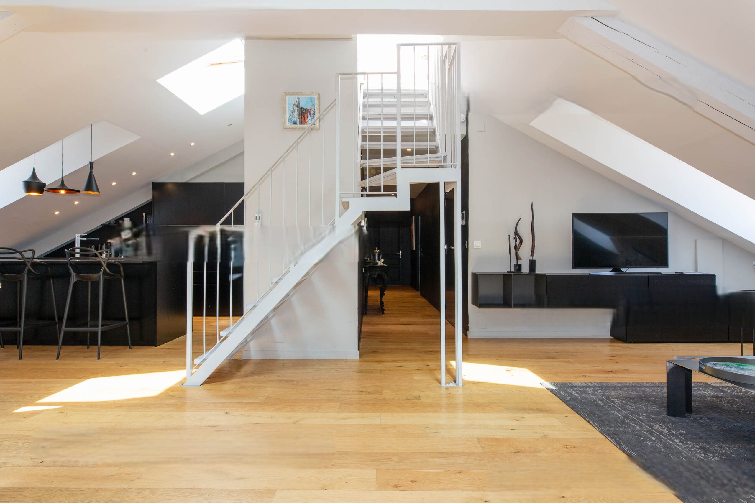 Set on the fourth and top floor of a classic bourgeois style building, this spacious 180 sqm home has been architect renovated. Tucked under the eaves, it still feels wonderfully open thanks to its high ceilings.