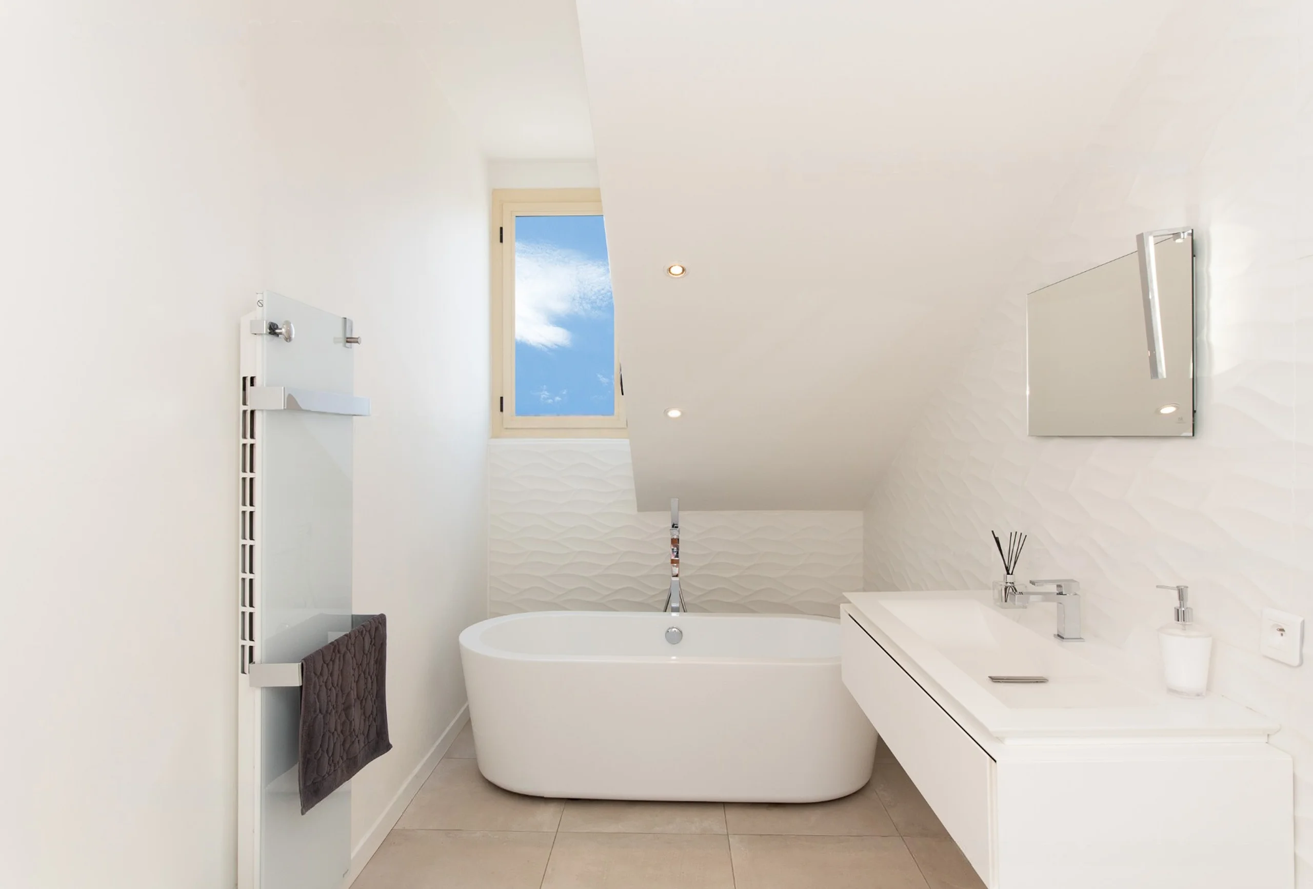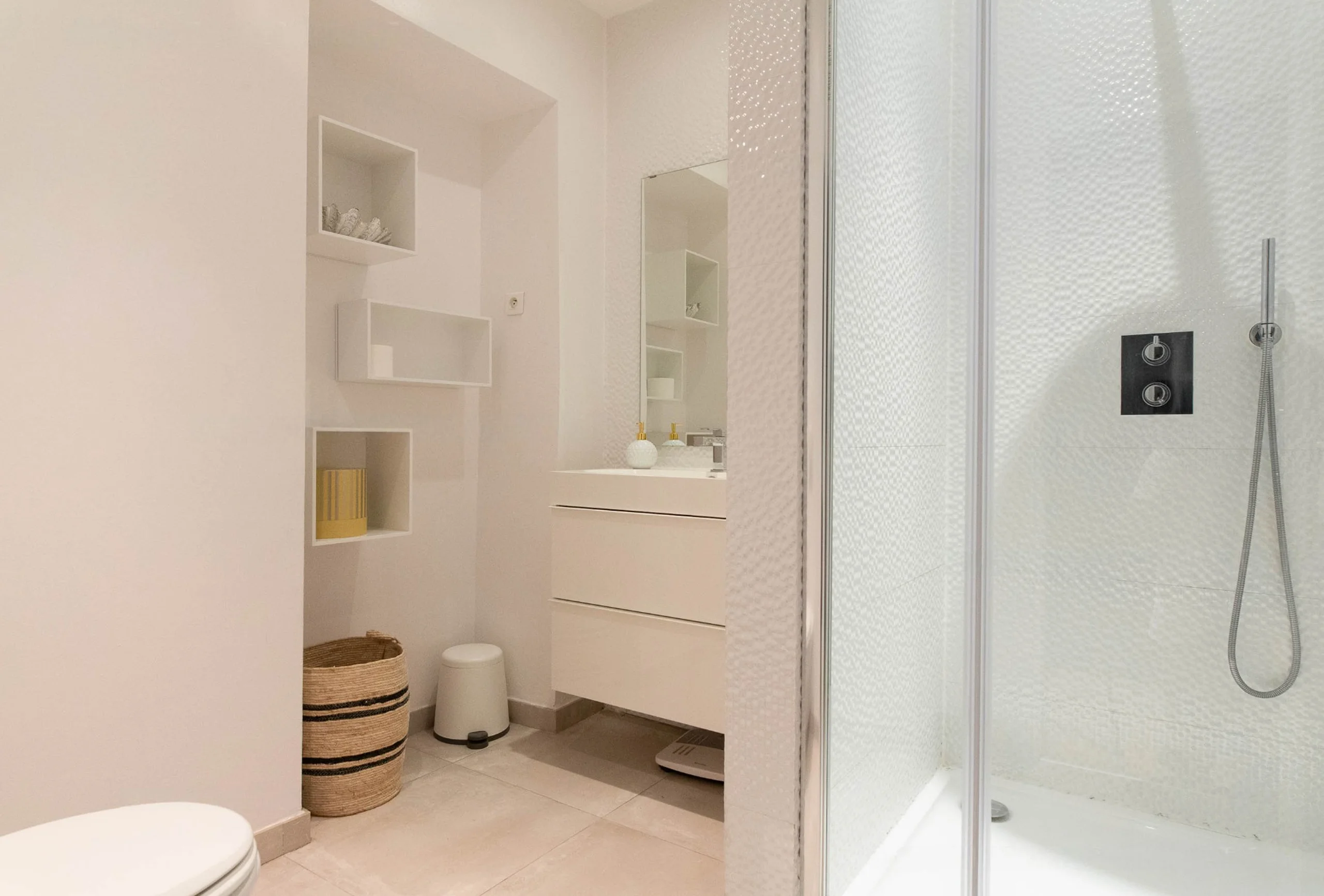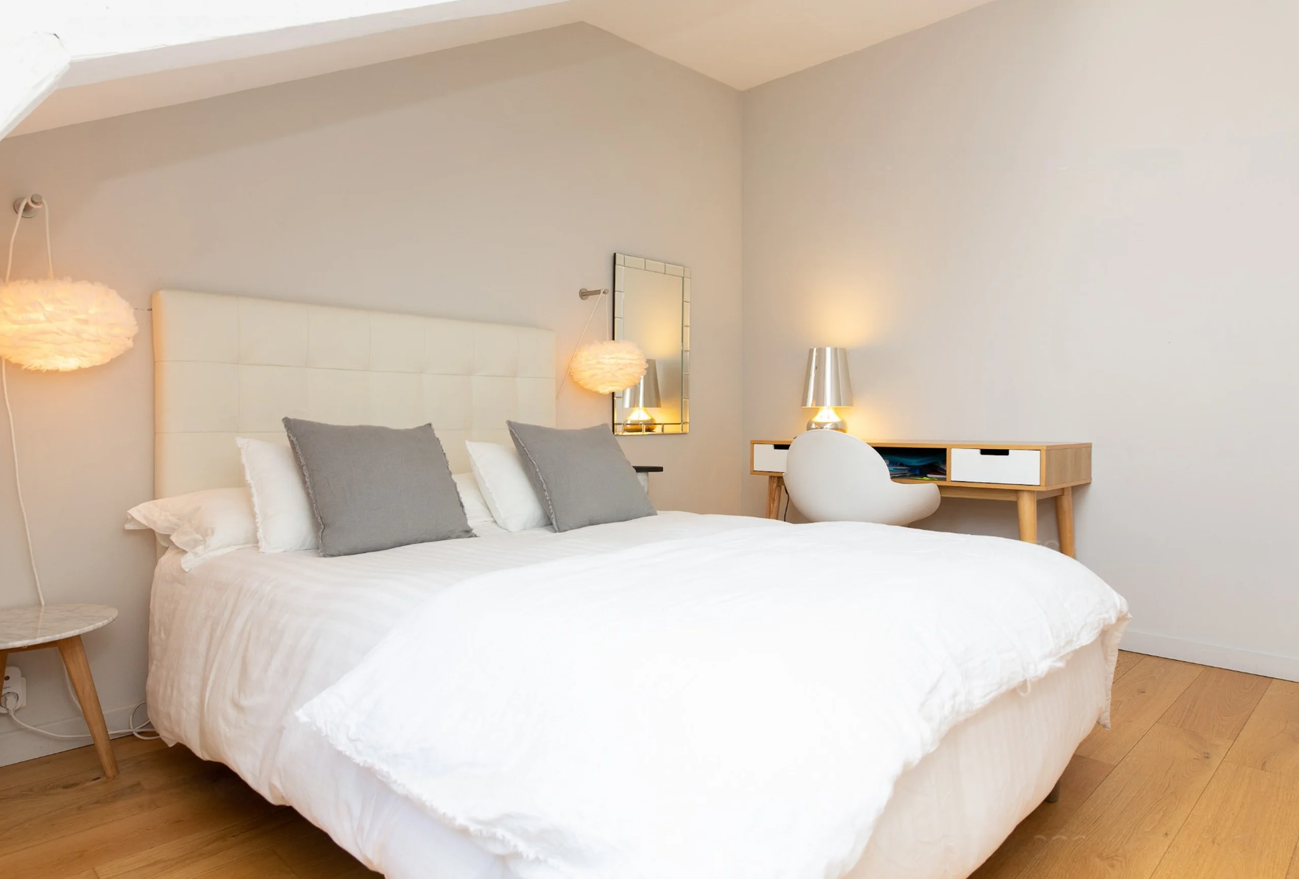 The apartment offers four double bedrooms in light tones with a warm, relaxing feel. The main bedroom includes a bright en suite bathroom with a bathtub and toilet. A second separate bathroom is also available, with a shower and toilet.
