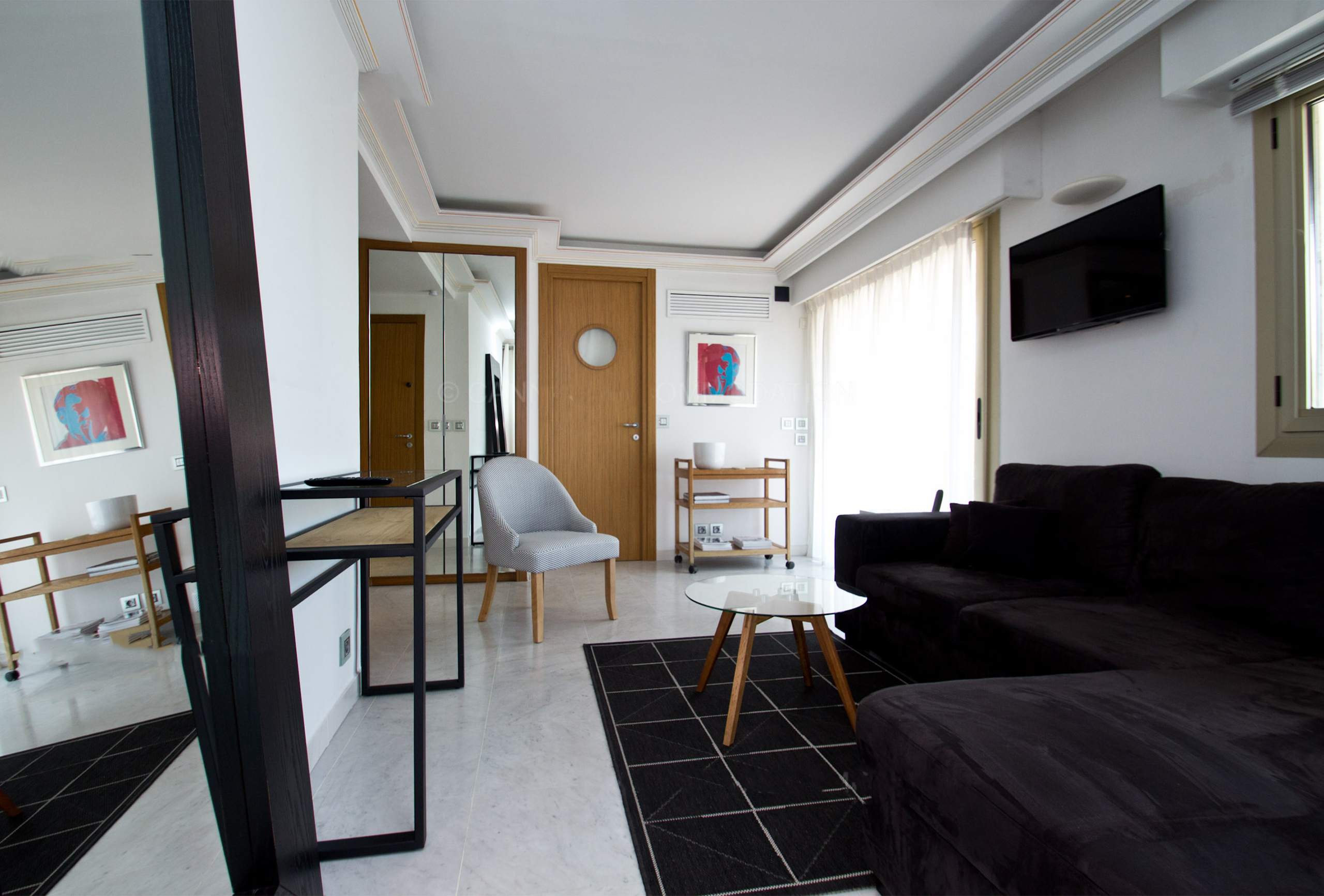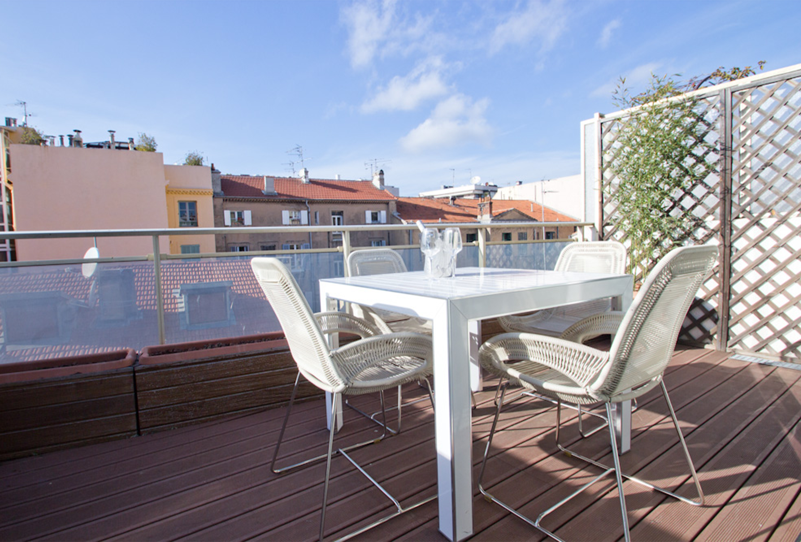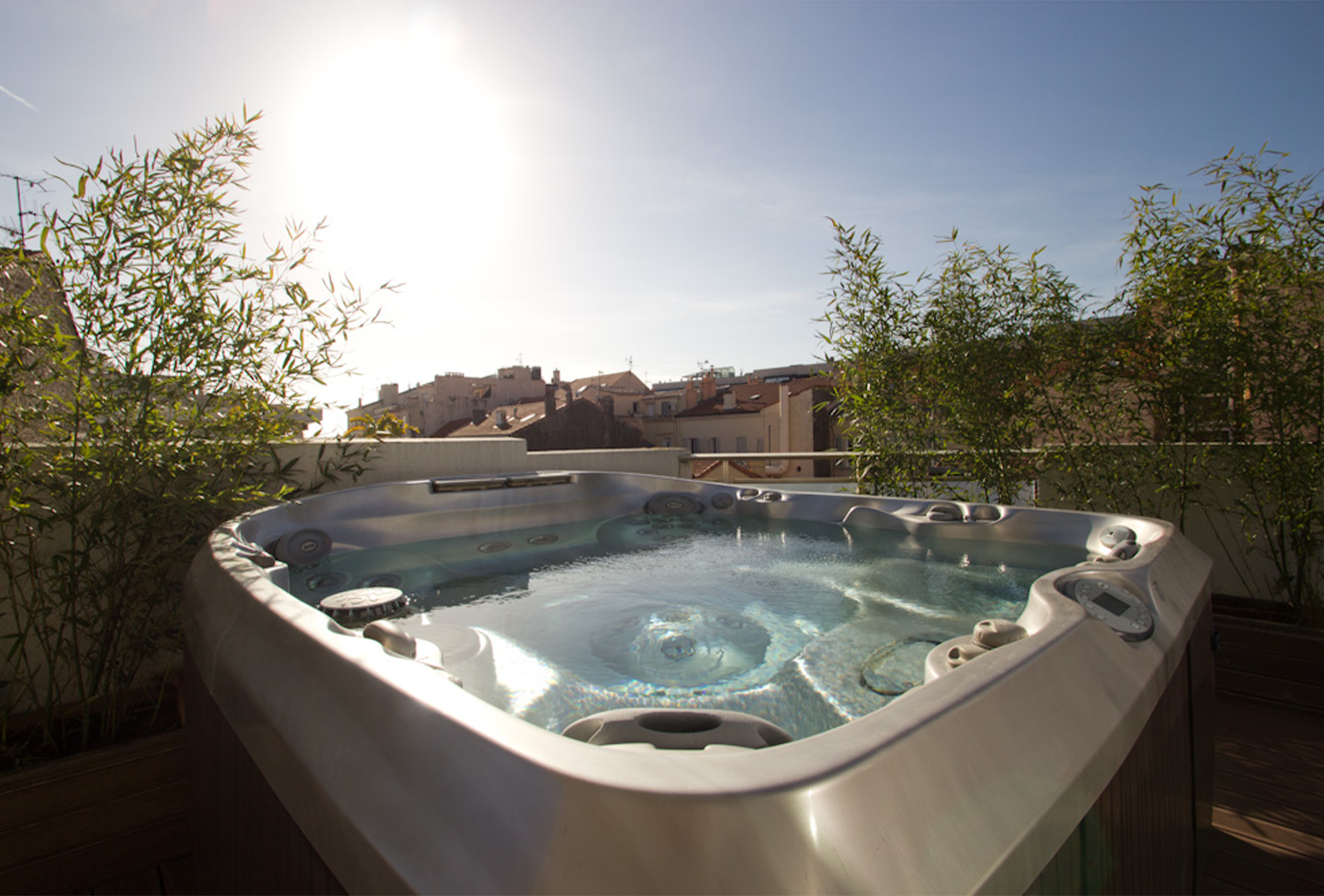 A second shower room with toilets, a smaller one, is in the living room. The white kitchen is very well equipped. All rooms of this apartment look out on an outstanding terrace. You will feel very relaxed on the sofa, or in the Jacuzzi. Choosing this apartment means a chic, a comfortable and a unique stay in Cannes.