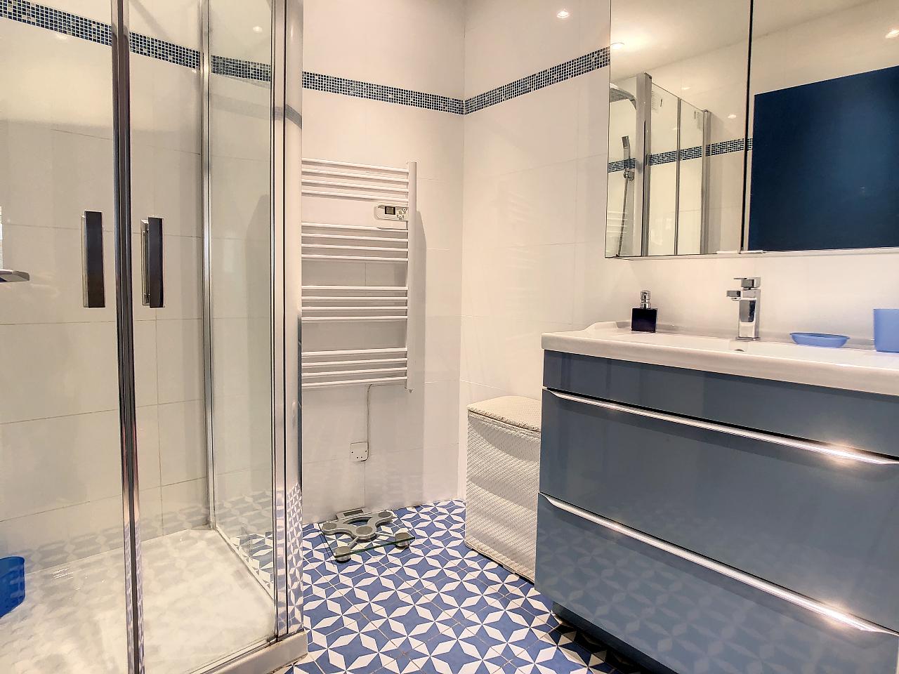 The bedroom includes a comfortable double bed, while the bathroom is equipped with a modern shower. A separate toilet adds convenience, and amenities such as air conditioning and WiFi ensure a pleasant and connected stay in Cannes.