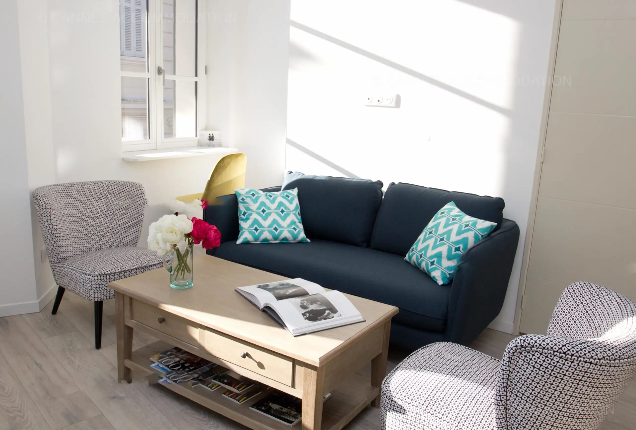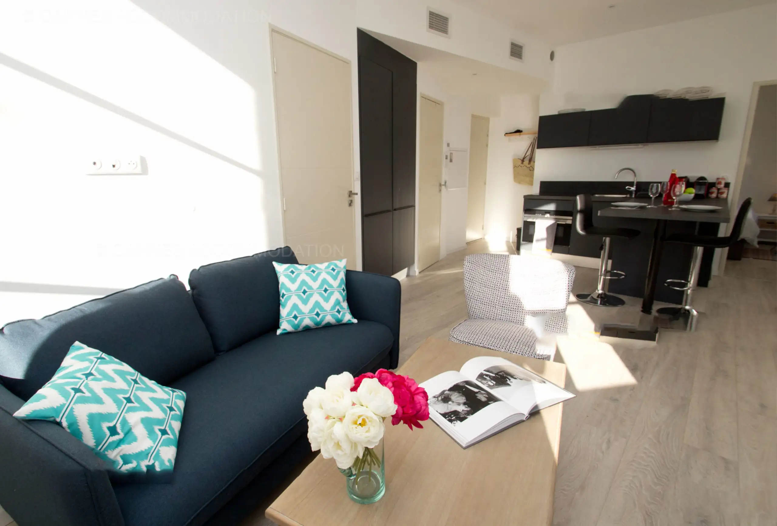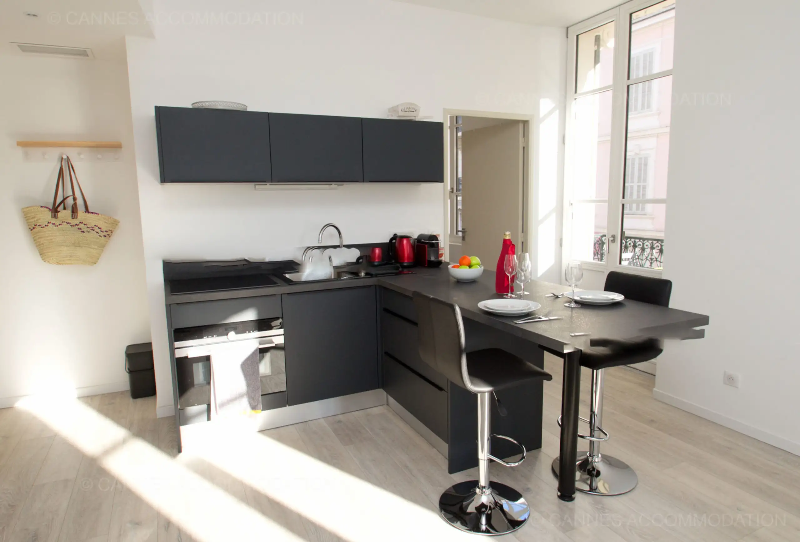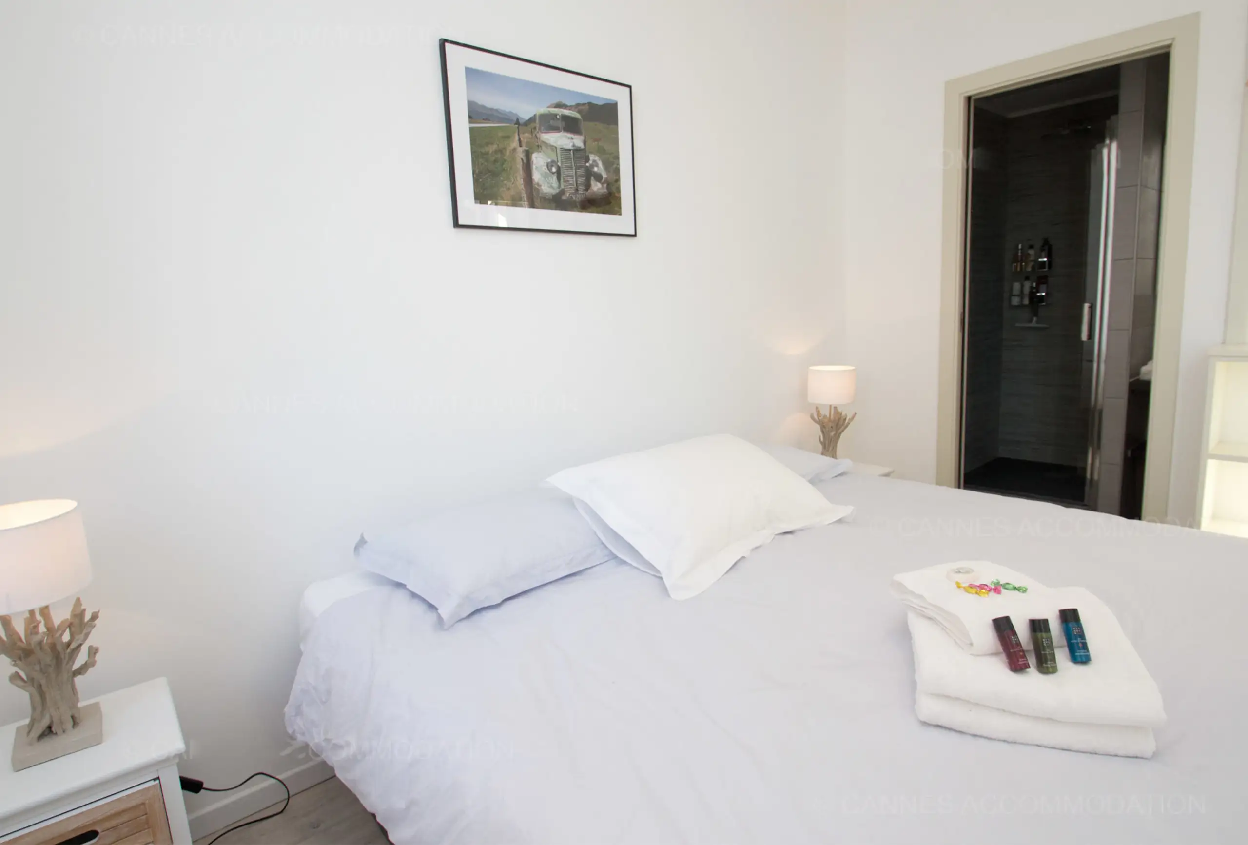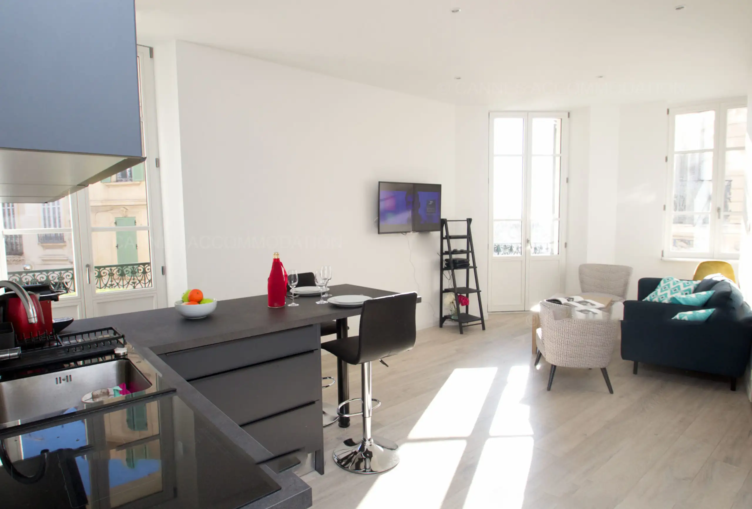 This nice two bedroom apartment is ideally located in the old town overlooking the Forville market. The Forville Market is an ideal picnic stop before heading up to the old town “Le Suquet”, or down to the beach. It is just five minutes’ walk from the convention center. The apartment is entirely renovated in a refined modern style and offers quality equipment. The living area opened onto a balcony with a very nice view of the harbor. There is two bedrooms each have two single beds that can combine into a double. They also have an en-suite bathroom with shower. A separate toilet is available. The fully equipped kitchen opens onto the dining area.