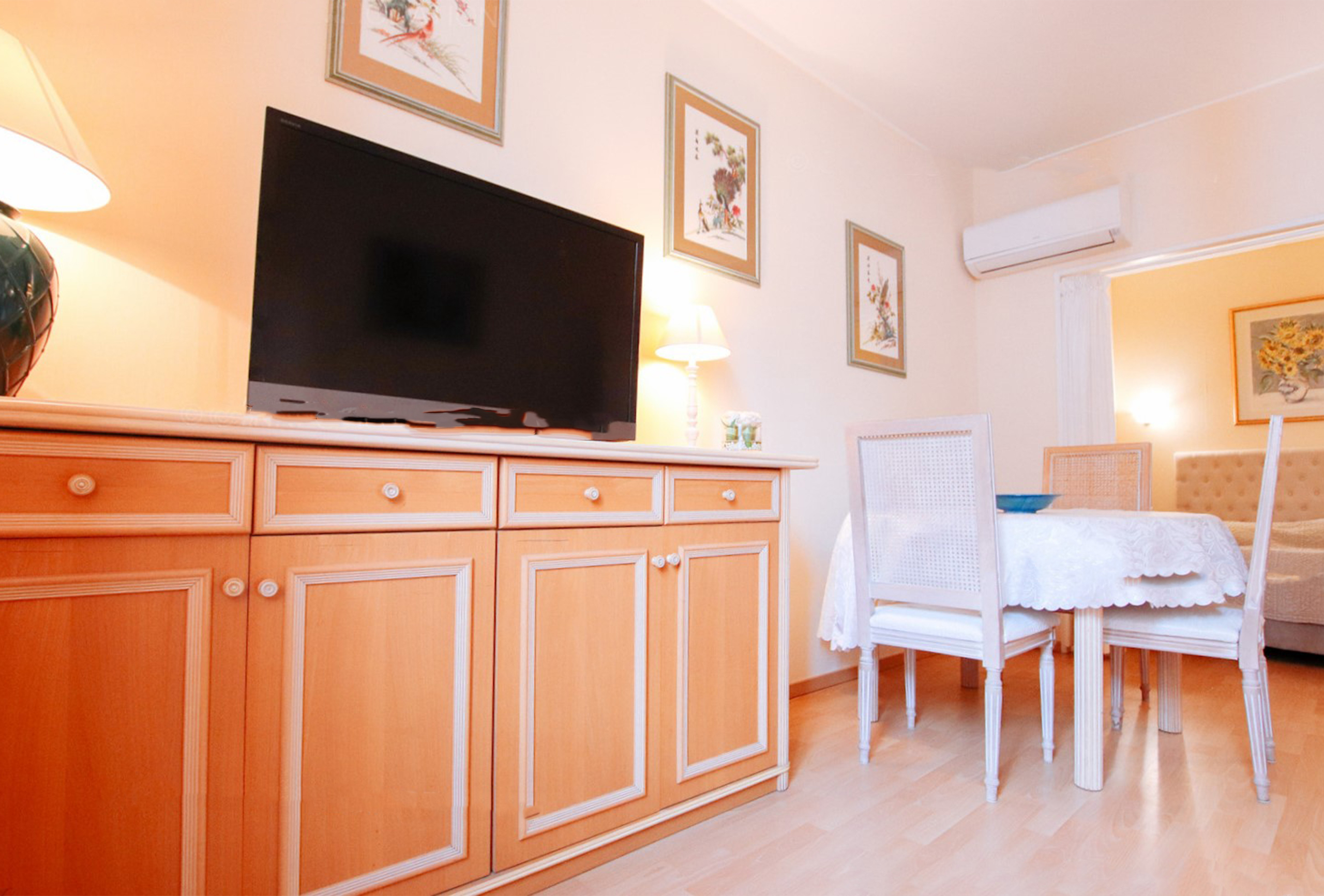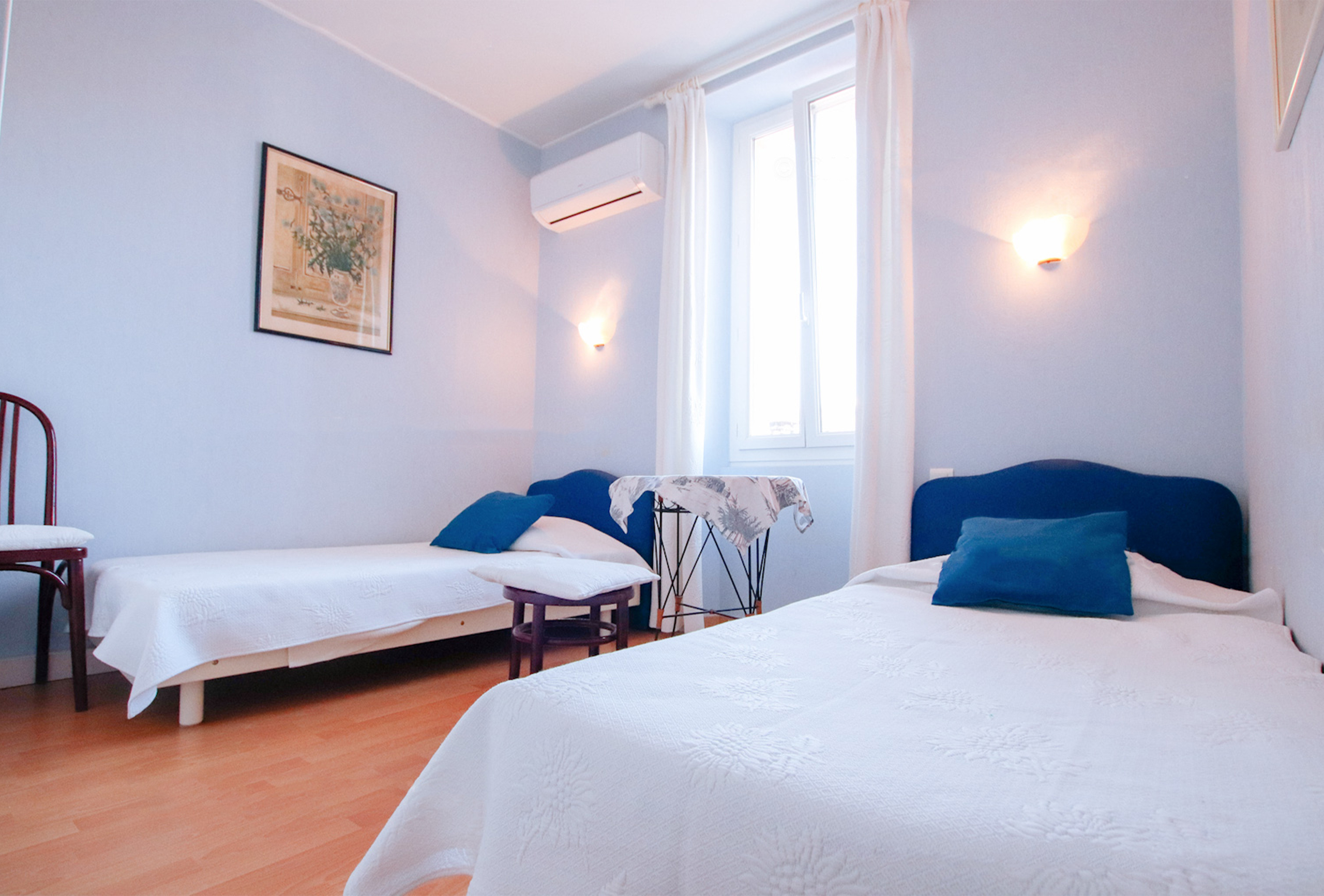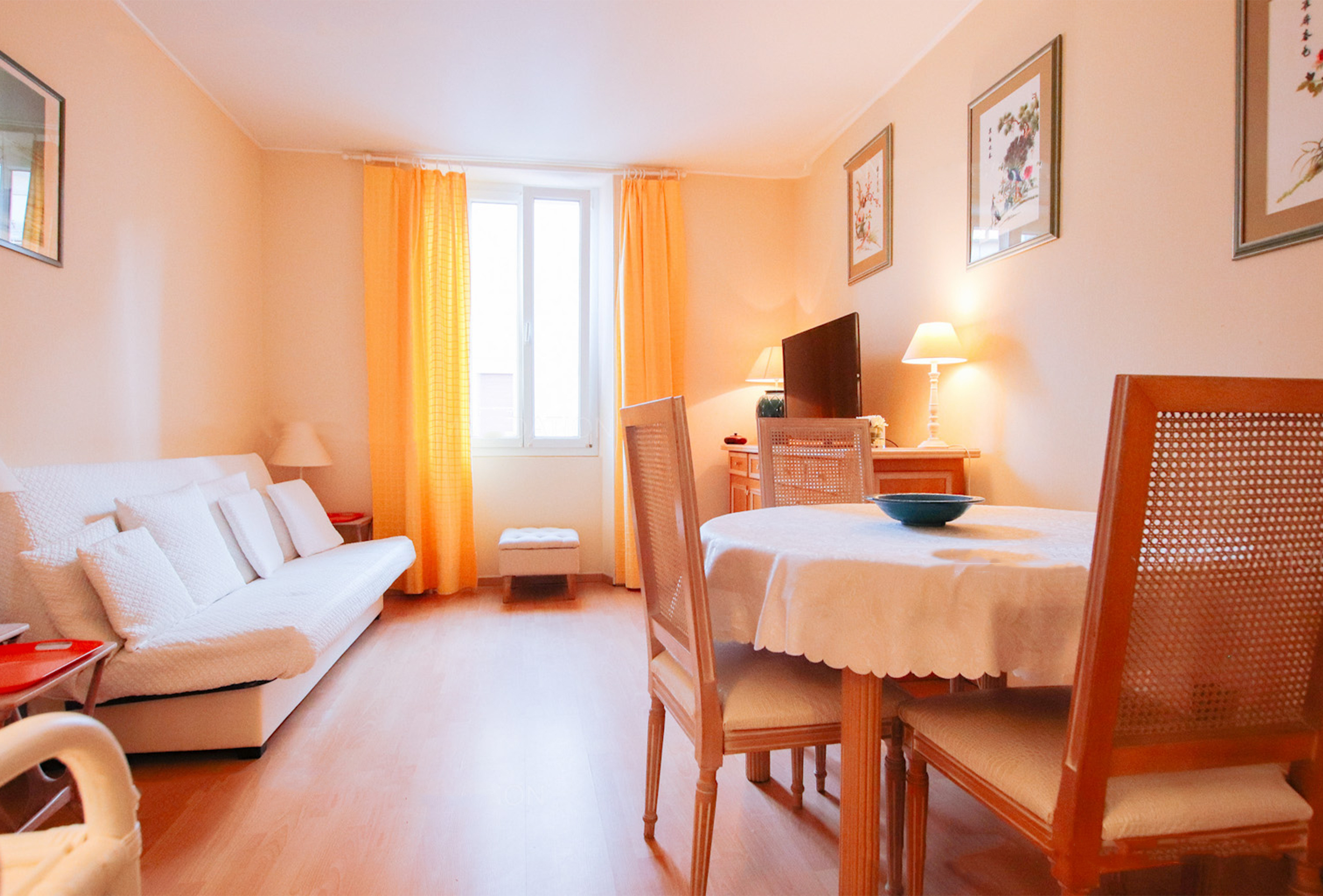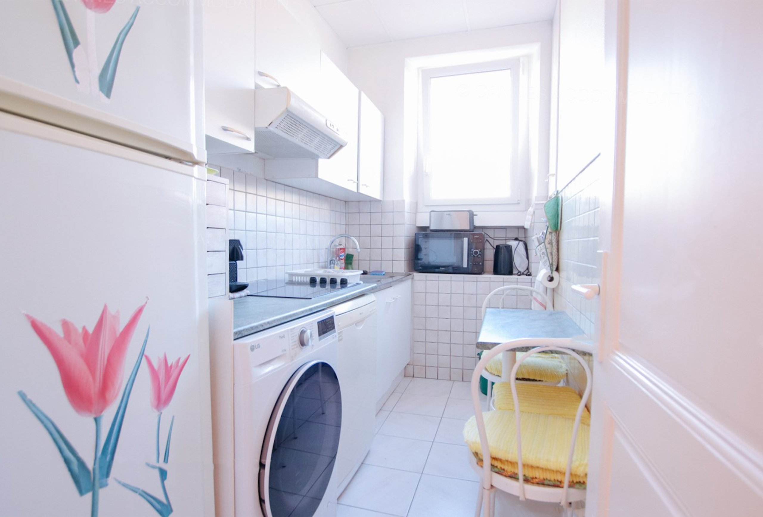 It is in the Carré d’Or, known for its night establishments, that you will find this two bedroom apartment. You are close to the Croisette, less than 5 minutes walk from the Palais des Festivals. The main room is decorated with neutral hues and has a sofa bed. The first bedroom has two single beds which can be turned into a double one on request. The second bedroom, nestled in an alcove separated by a curtain, opens onto the living room and features a double bed. The shower room has its own toilet. The independent kitchen remains plain but well-equipped. This apartment is basic but well maintained. It will suit you perfectly if you are looking for a good price accommodation in the lively district of the Carré d’Or, close to the Croisette.