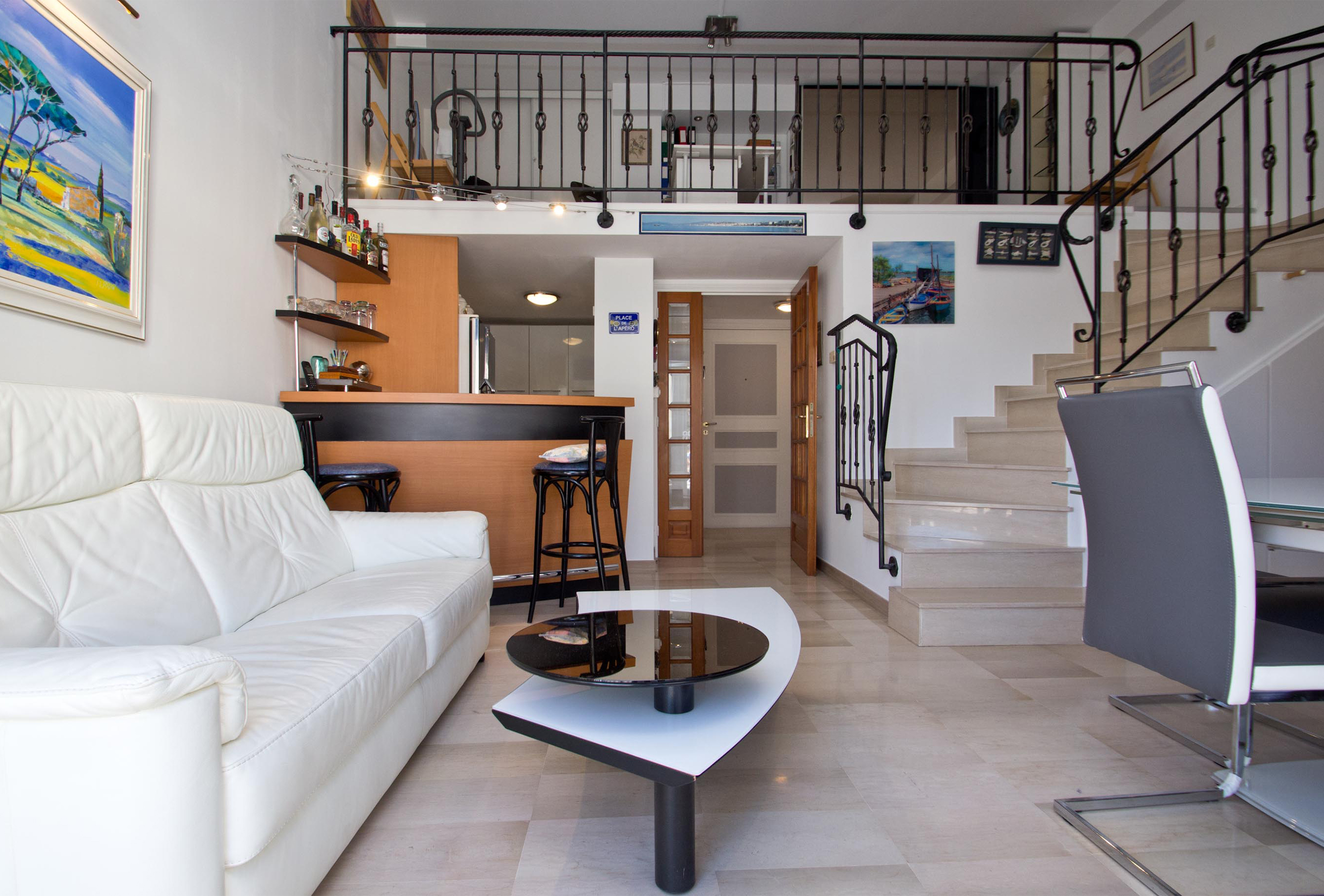 Located at the feet of the old town this apartment is nested on the 4th floor of a nice modern residence. This duplex is perfectly well maintained. It is very pleasant and it offers high quality equipment. The sunny living-room opens onto a nice terrace with view over the old town. The kitchen is well equipped and it also opens onto the living-room. It gives a warm atmosphere to the living area. The lay out of the rooms is unusual. You will find indeed several sleeping areas organised as follows: