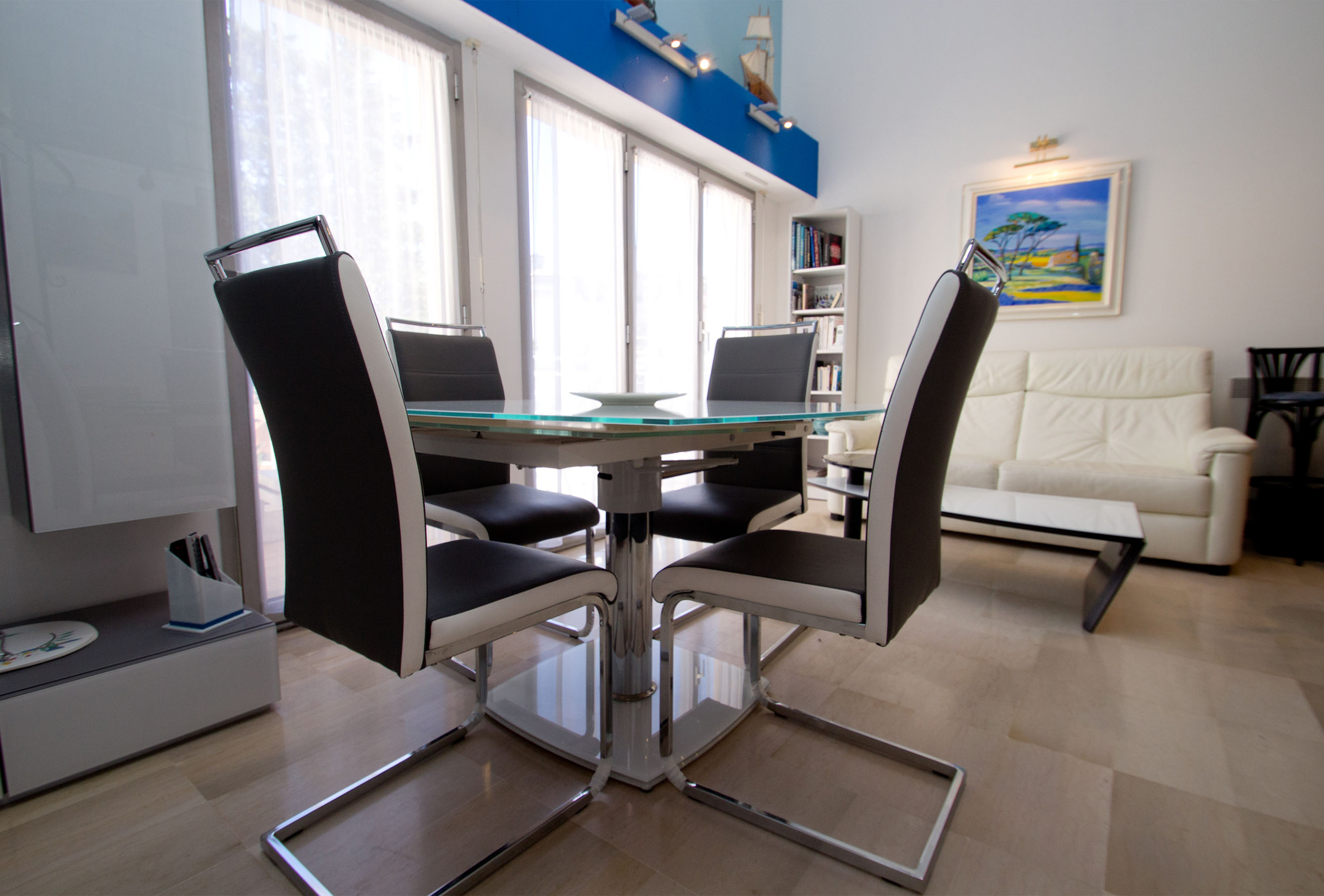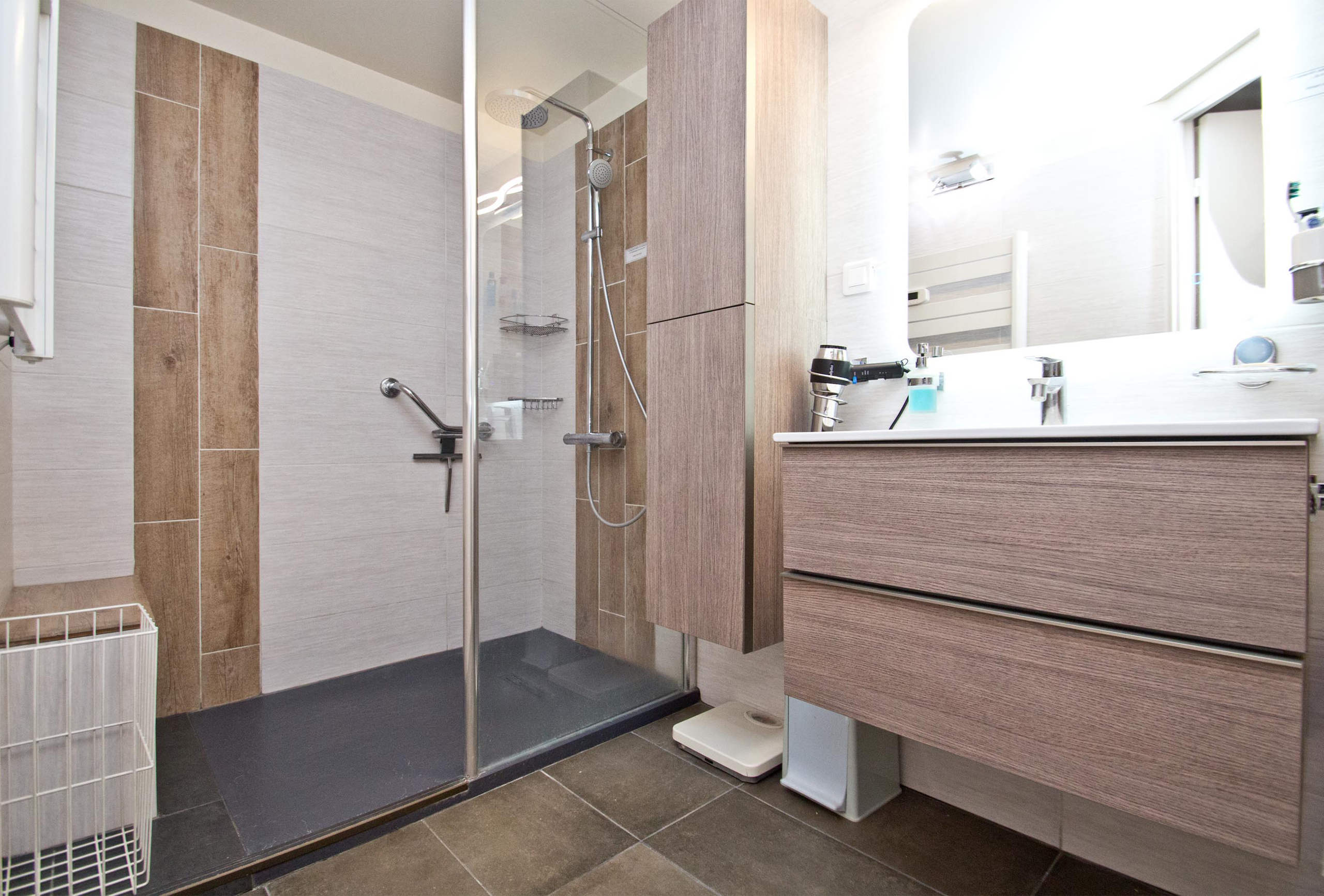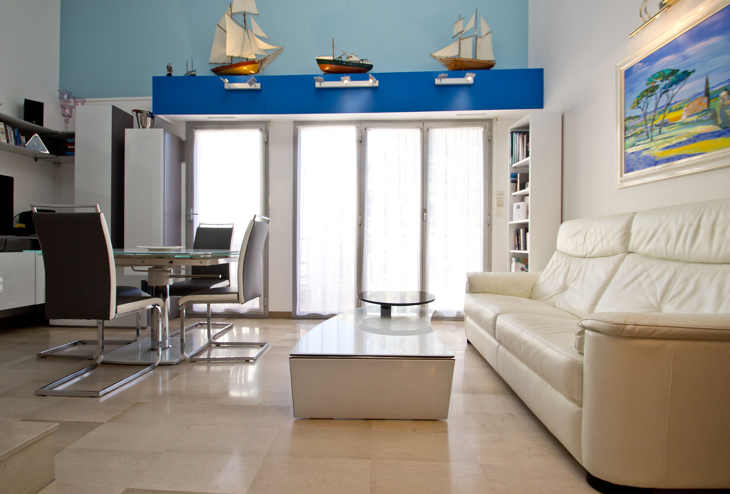 A first bedroom with two single beds that we can assemble into a double if you wish. A second bedroom with mezzanine. The lower level features a double bed. The upper level features two single beds that we can assemble as a double. The mezzanine opens onto the bedroom. You will also find a large mezzanine with a double bed in the living-room. The mezzanine is open. For your comfort, two bathrooms are available. The first one has a shower. The second one offer a bath tub and toilets. Some independent toilets are also available. You will enjoy your stay in Cannes in this modern and well equipped apartment.
