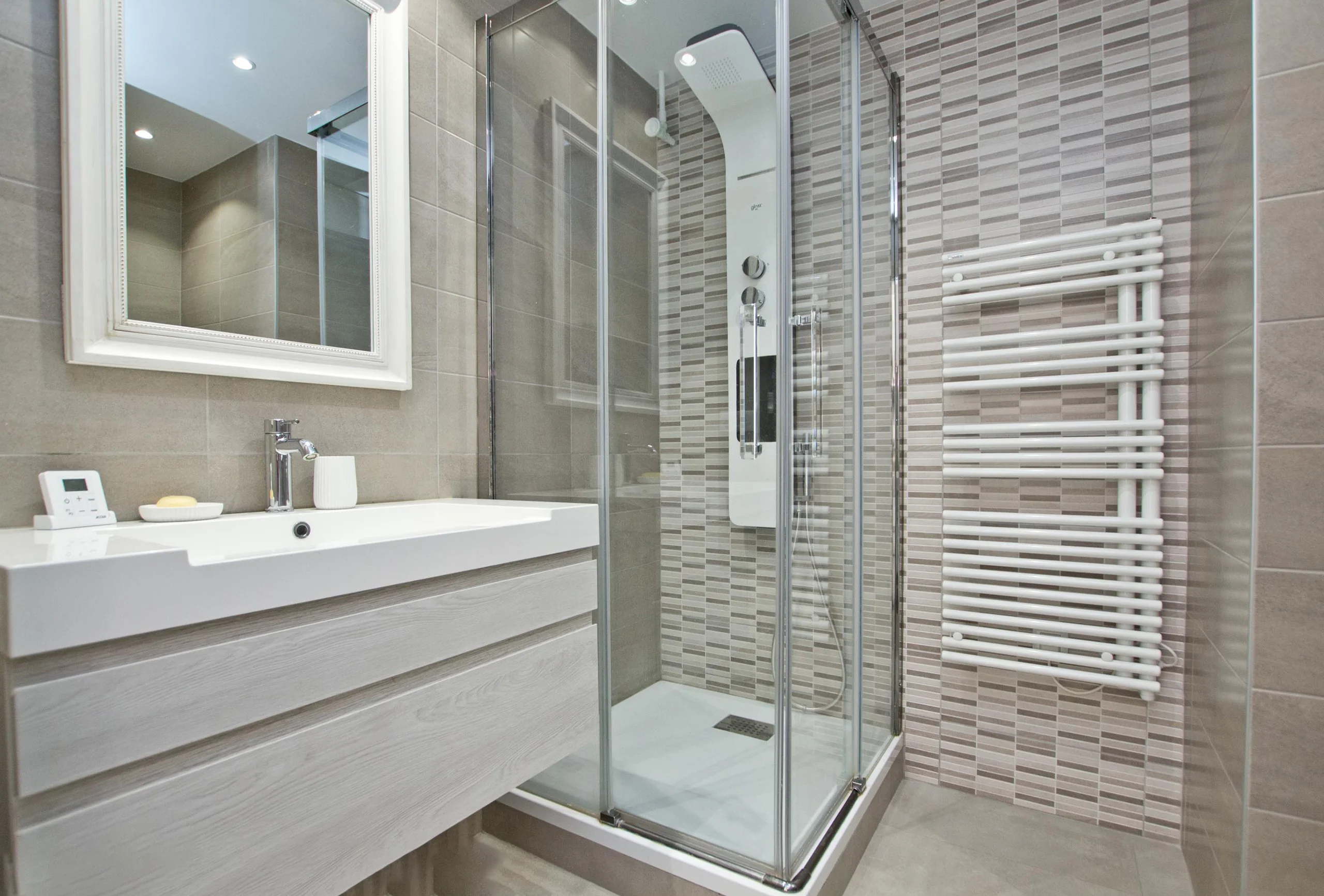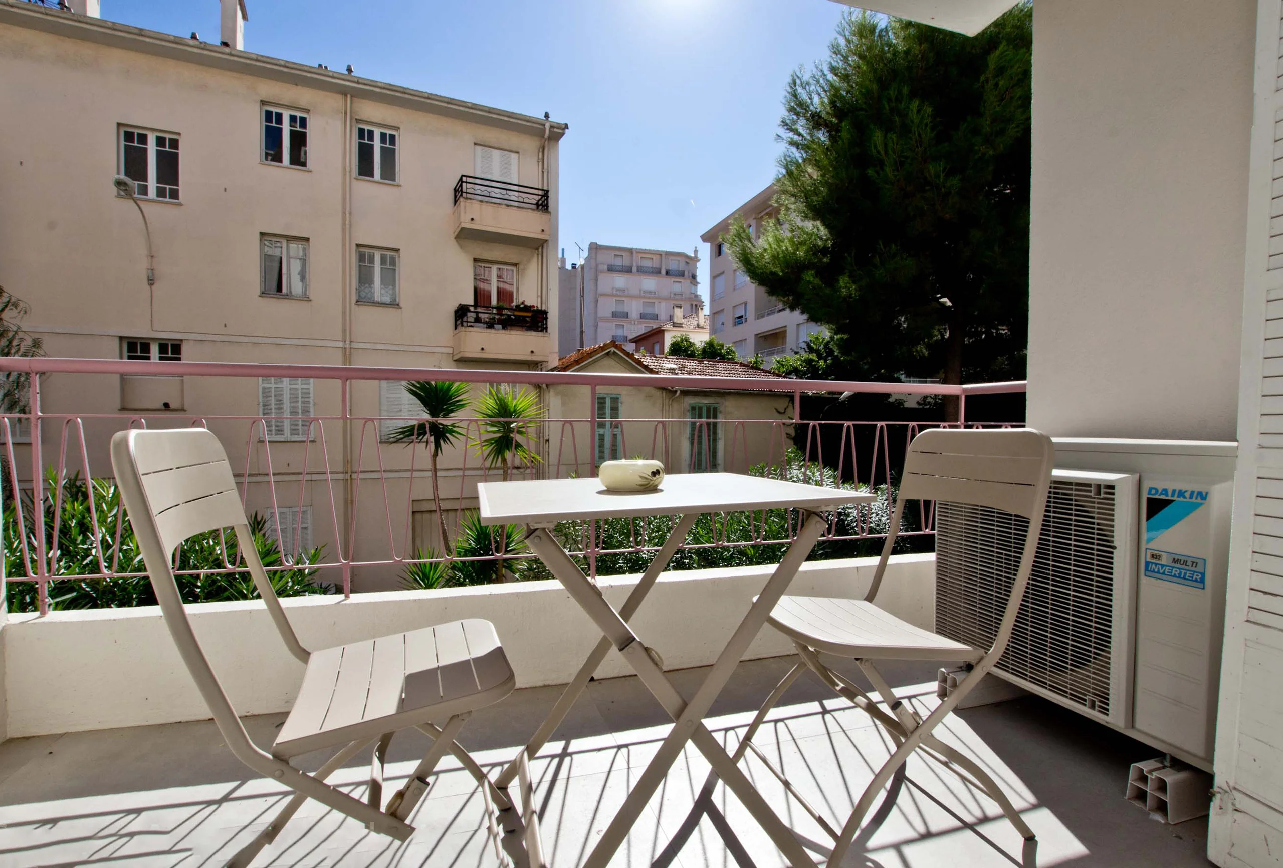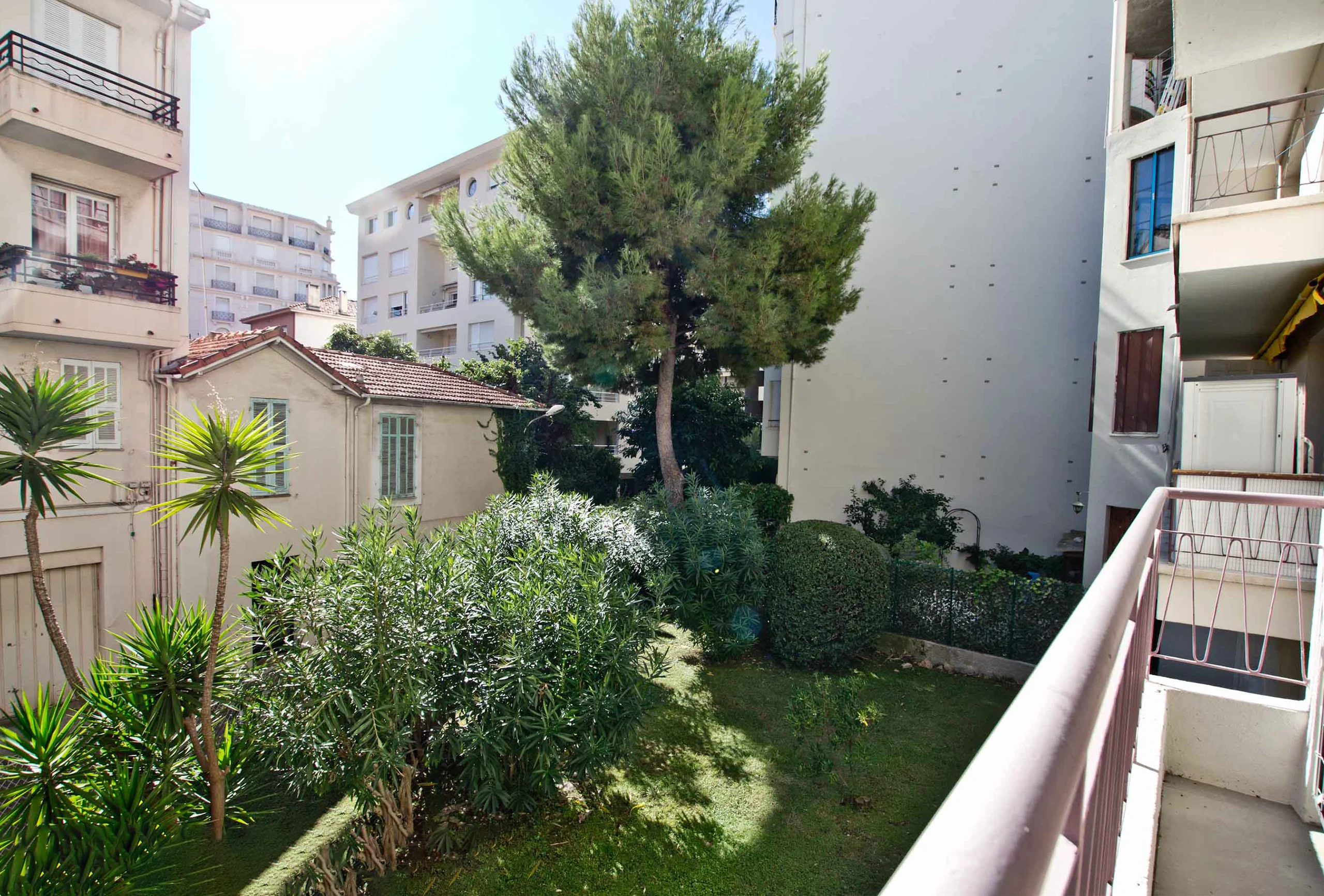 Beautiful modern two- bedroom apartment just a few steps from the Croisette and 14 minutes’ walk from the convention centre. It is on the 1st floor with lift. The living room has a sofa bed, a pleasant dining area and is tastefully furnished. It opens onto a large balcony with garden view. Both bedrooms are equiped with double bed. One bedroom is bigger than the other one. The attractive bathroom has a shower and toilets. There is an equipped open kitchen. All in all, a property that has a lot to offer you. It is modern, bright, well-equipped and comfortable. And you have a lovely walk to the Palais along the Croisette!
