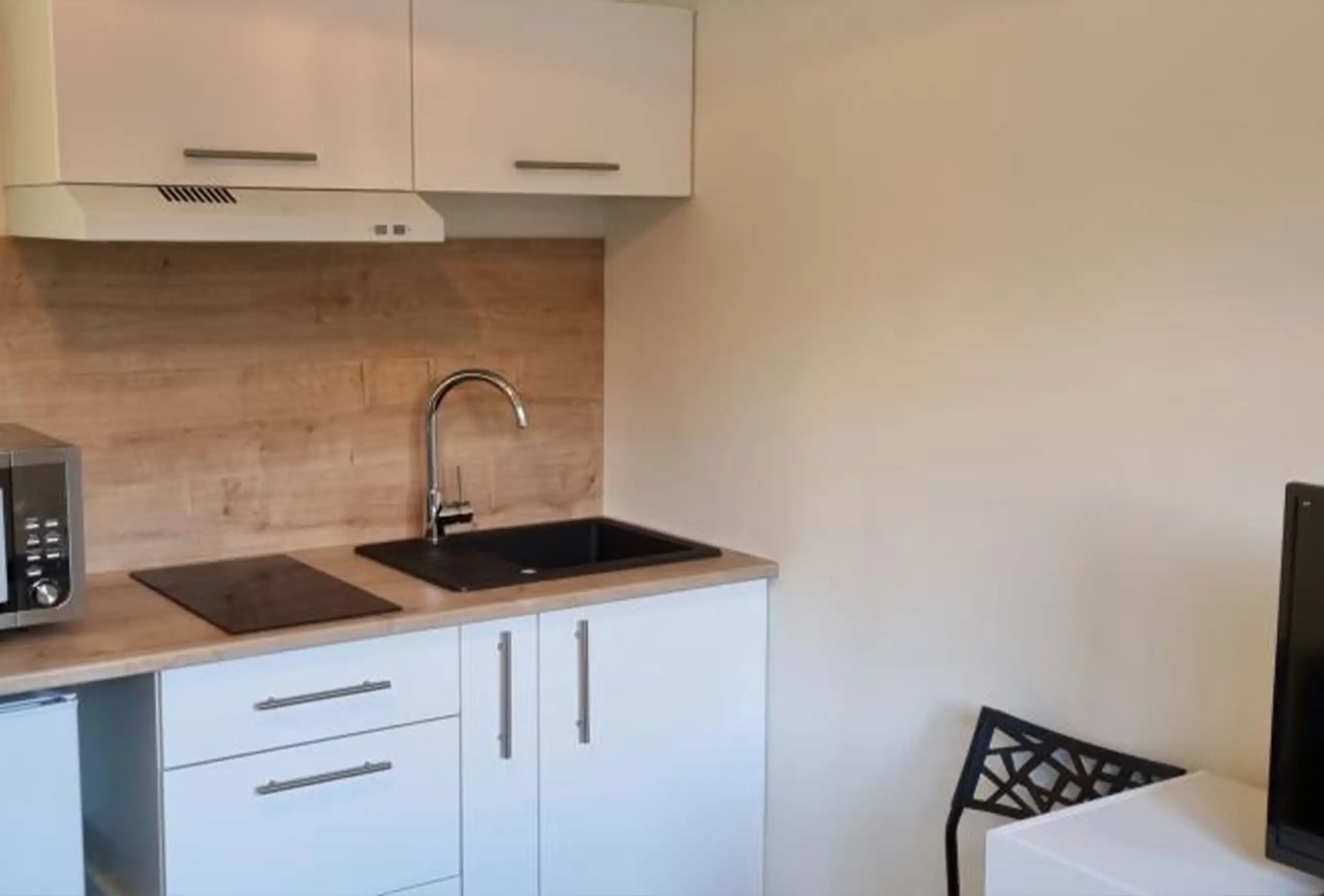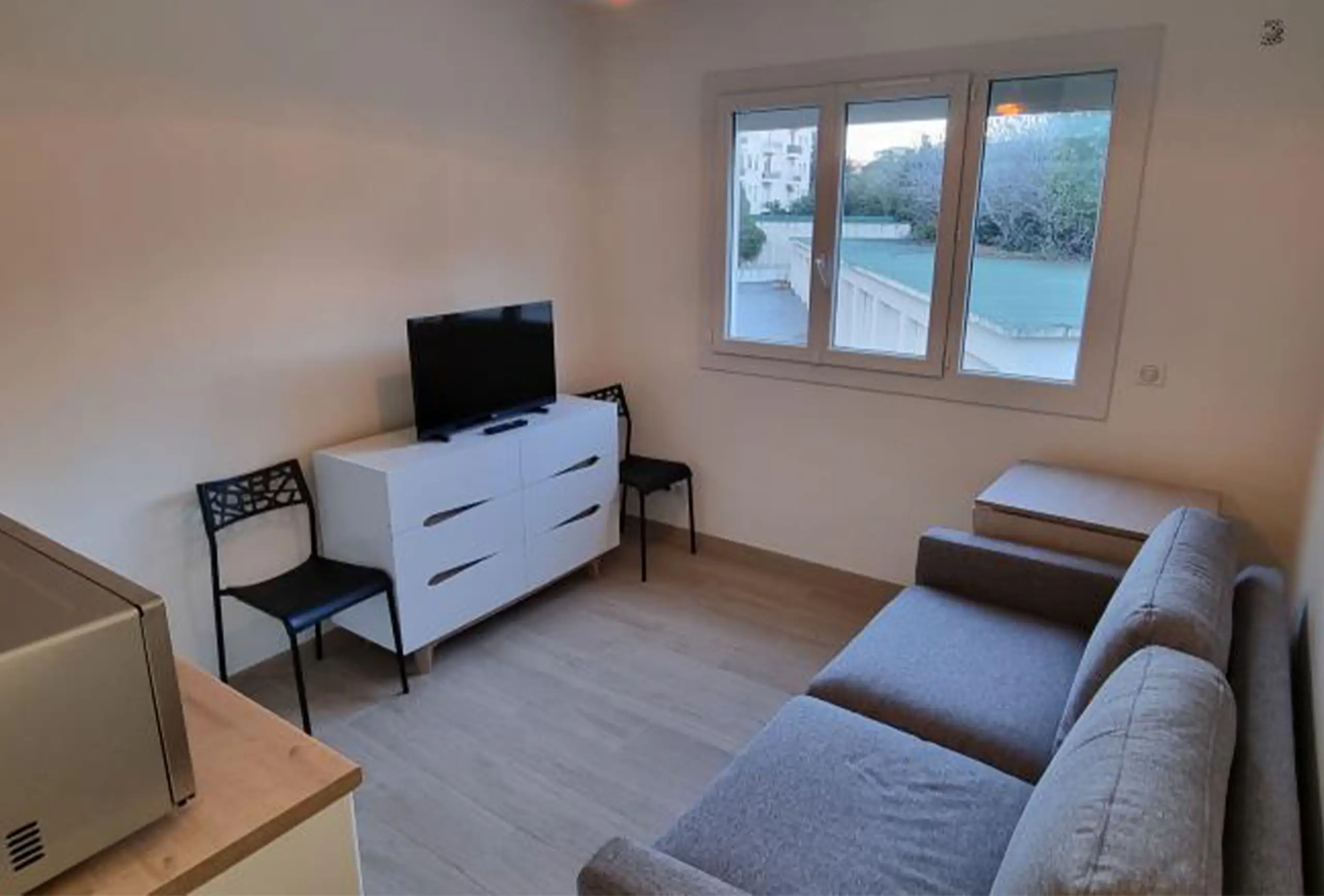 This pretty studio is located in a quiet area, up the rue d’Antibes, in a nice residence with lift. The apartment is on the fourth floor. The décor is modern with fresh neutral tones. The living room is equipped with a quality sofa bed. It also has a large flat screen TV for movie addicts. A dining area is organized in the veranda. The bathroom is roomy. It has a shower, toilets and a washing machine. The open plan kitchen is equipped. This studio has anything you need for your stay in Cannes. It is perfect for a successful rental.