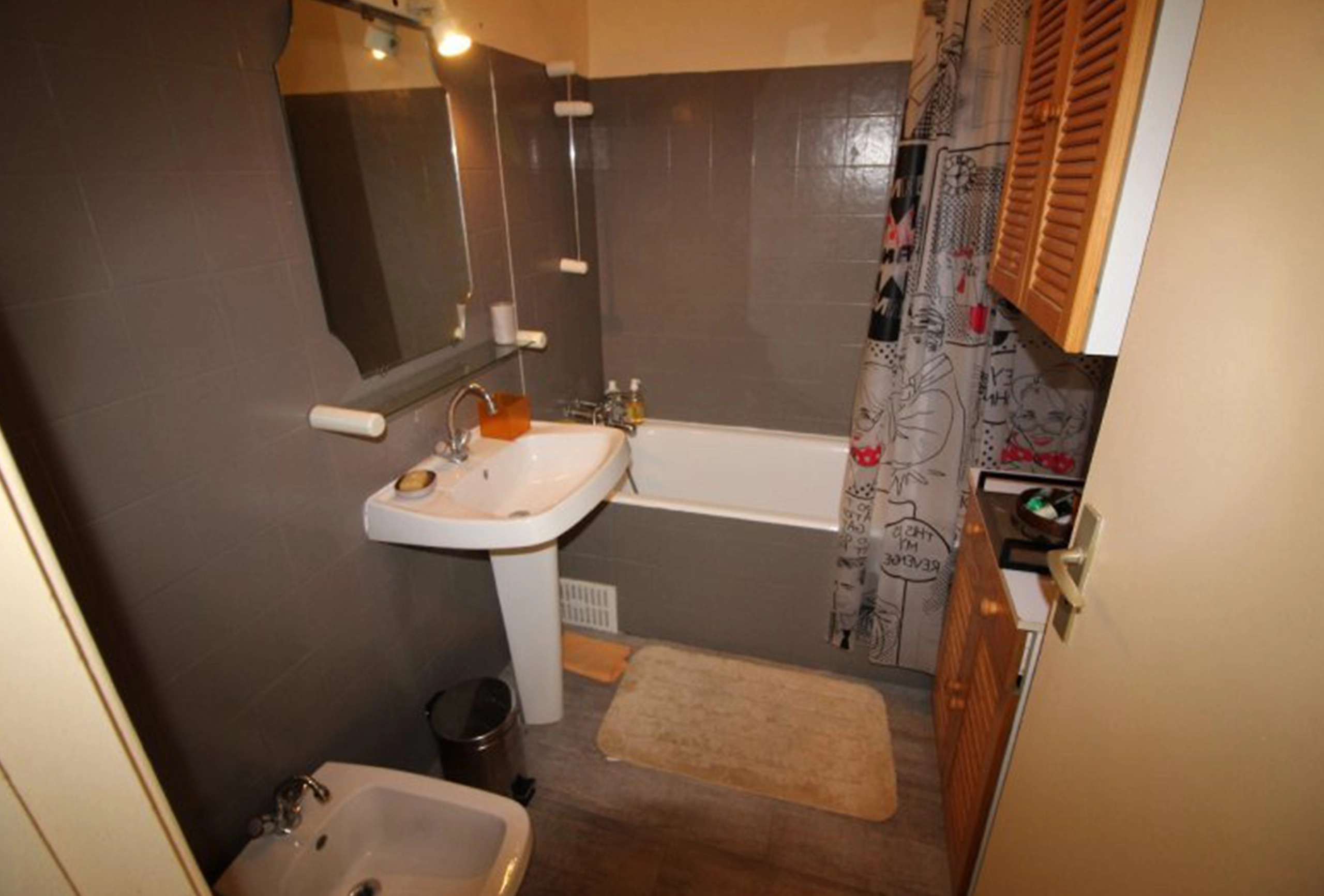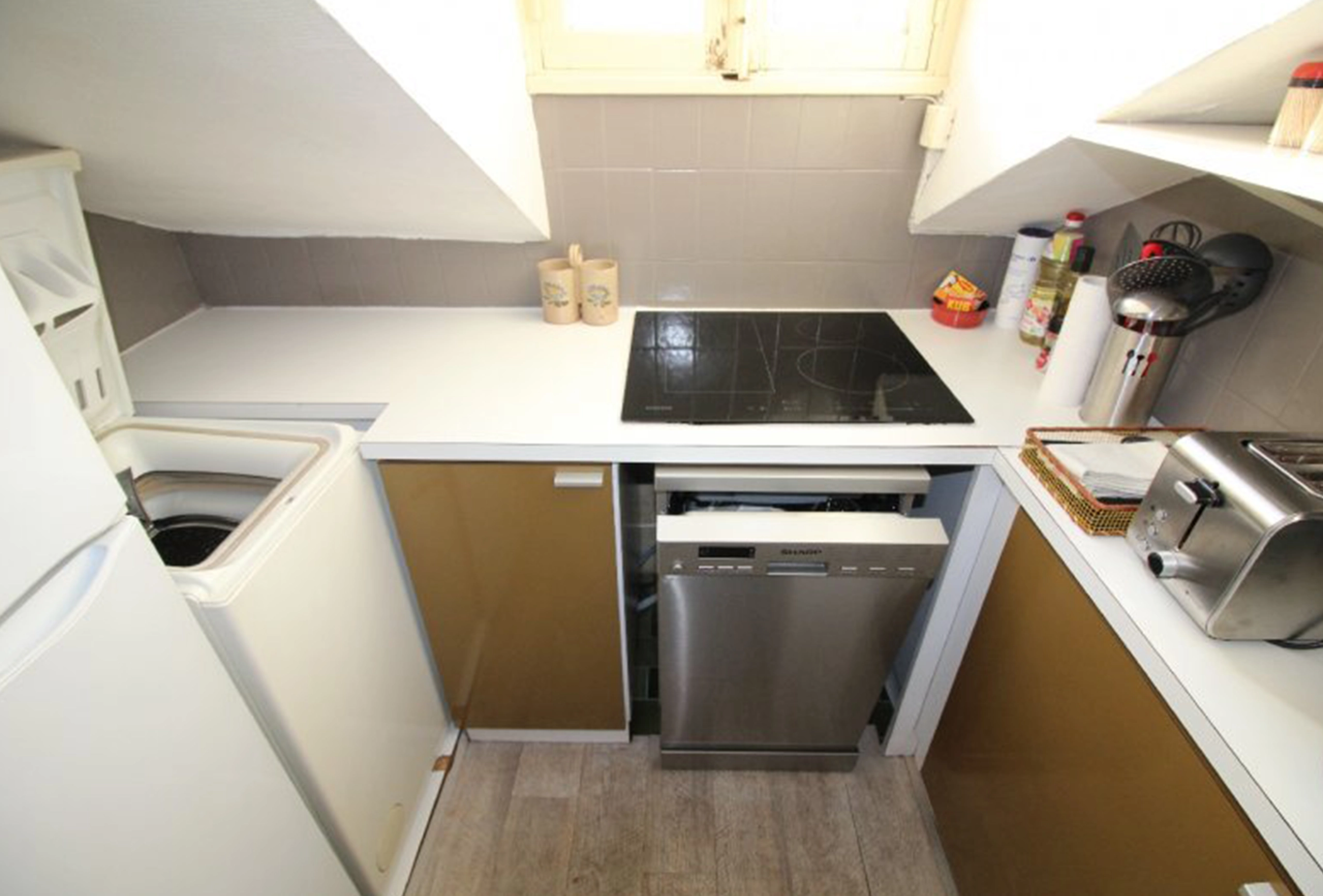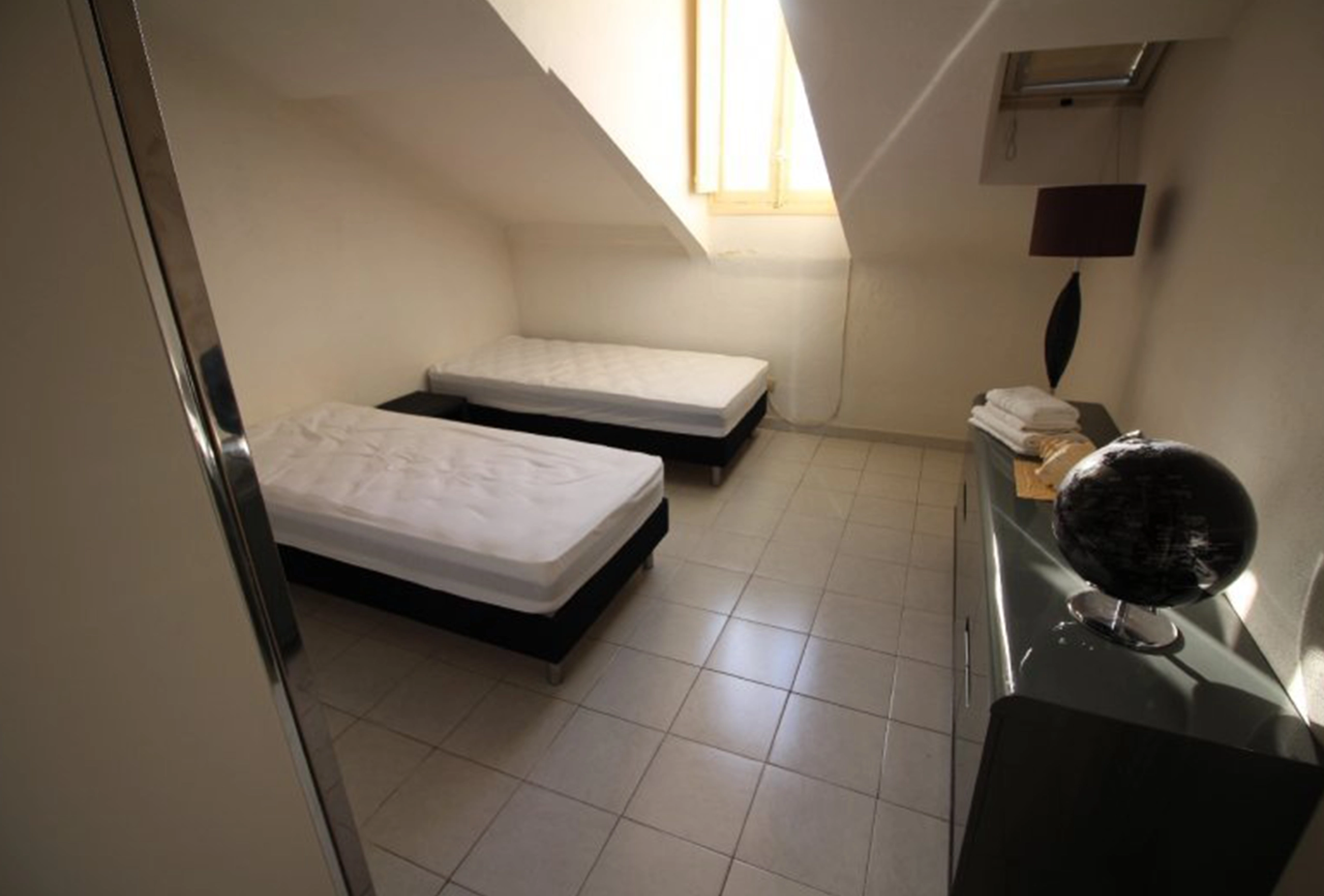 On 4th and last floor of an old building. Elevator till 3rd floor. In the center of Cannes. 6 mins walk from the Palais des Festivals. Attic 1 bedroom. Living room with a sofa bed. Twin beds in the bedroom. Separate kitchen. Bathroom with tub. Air conditioning. Wifi.