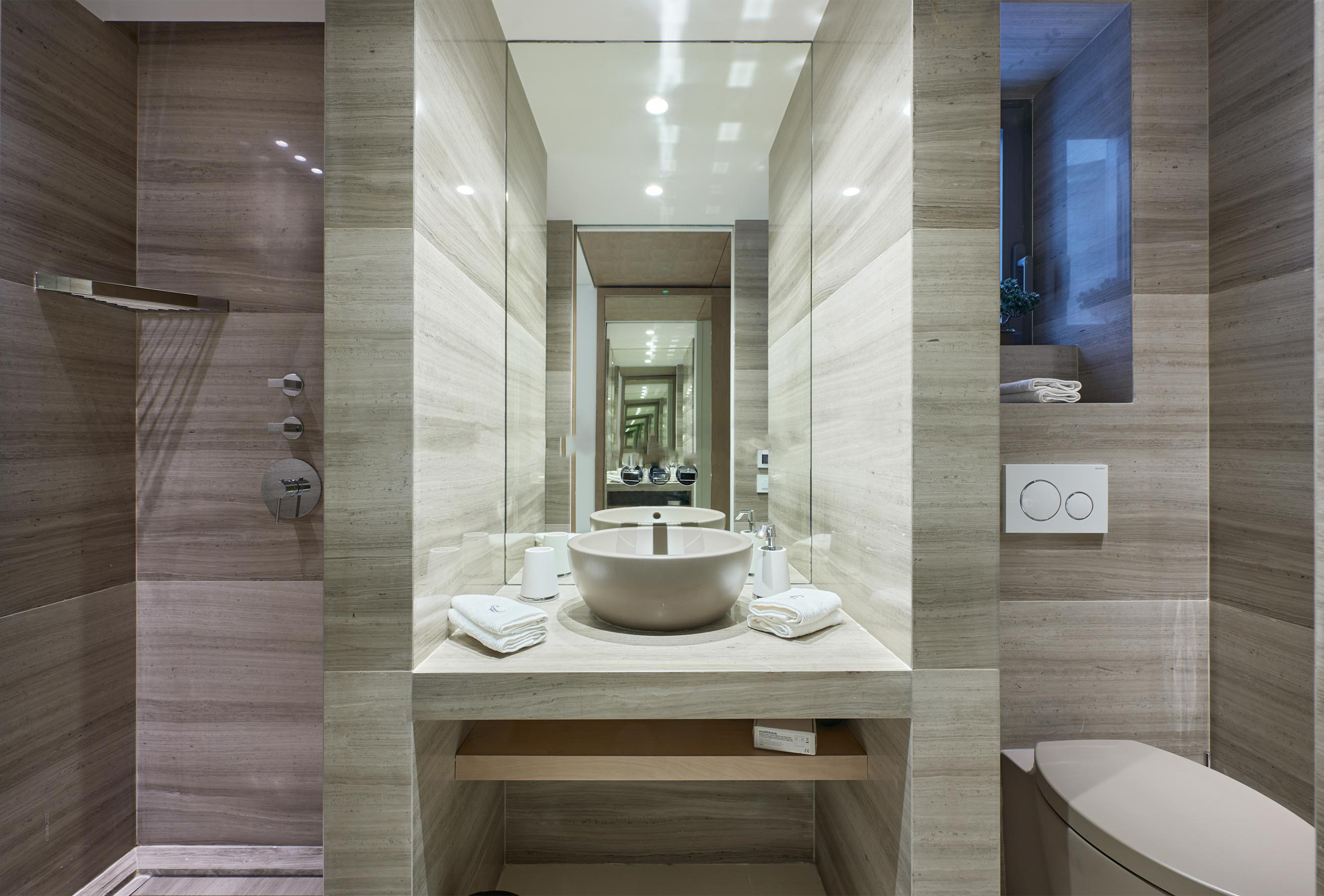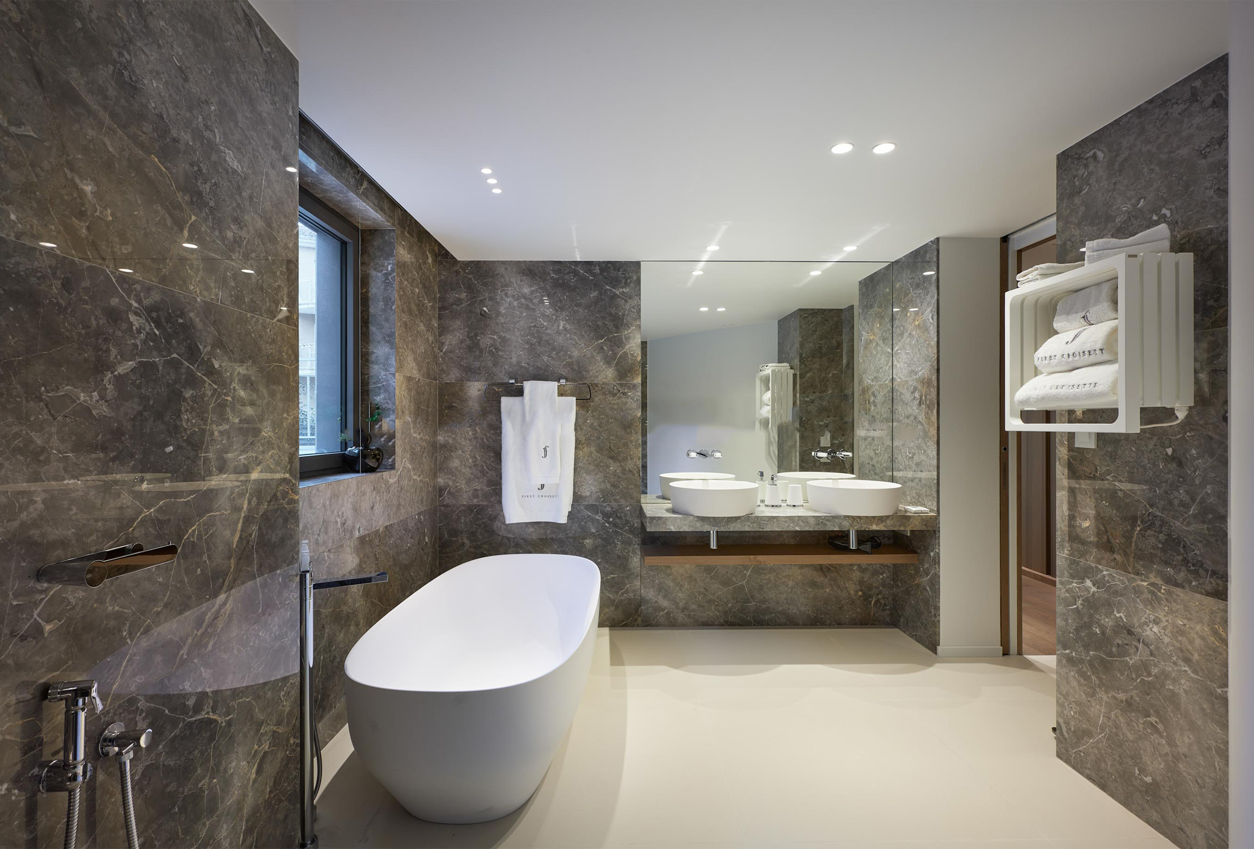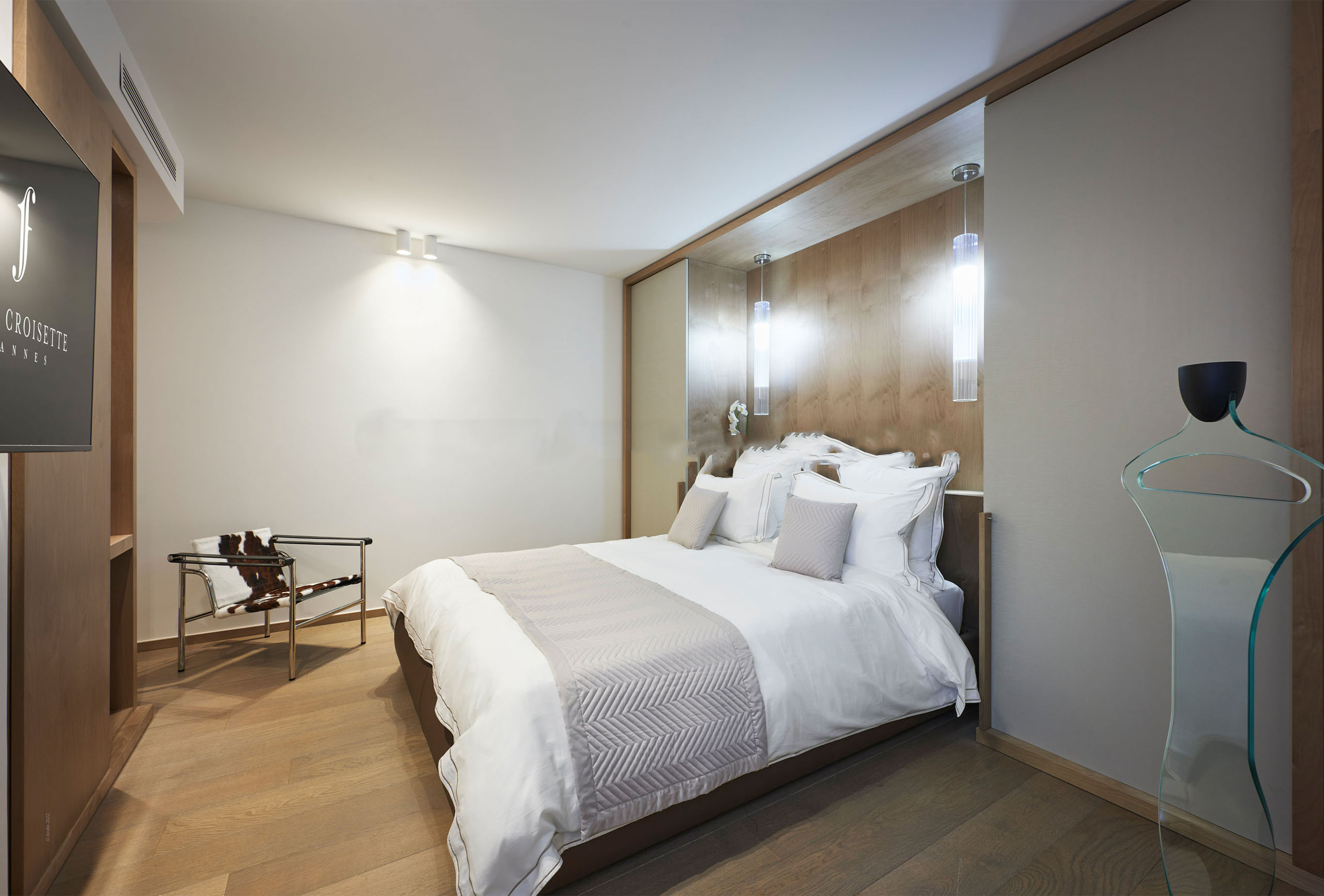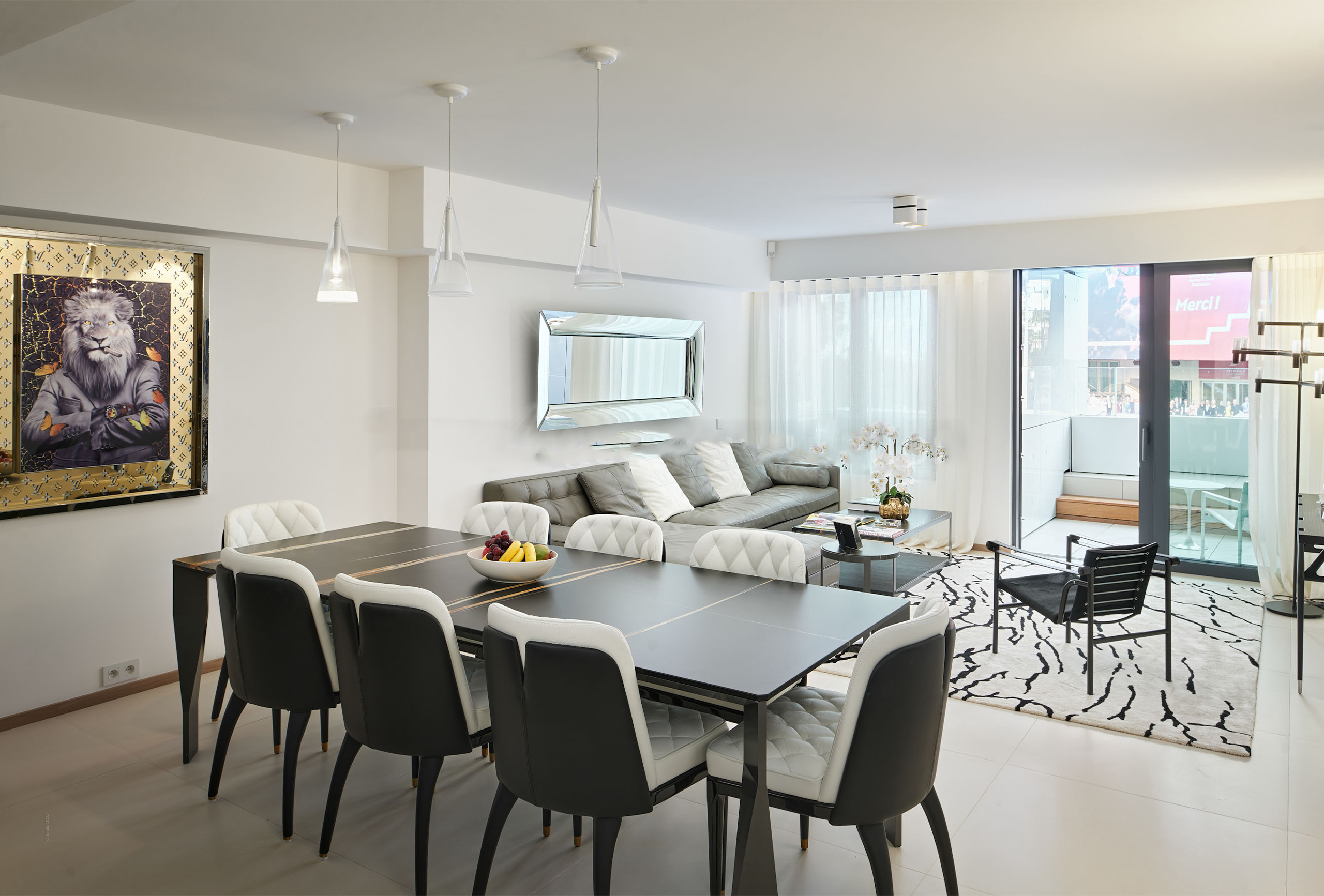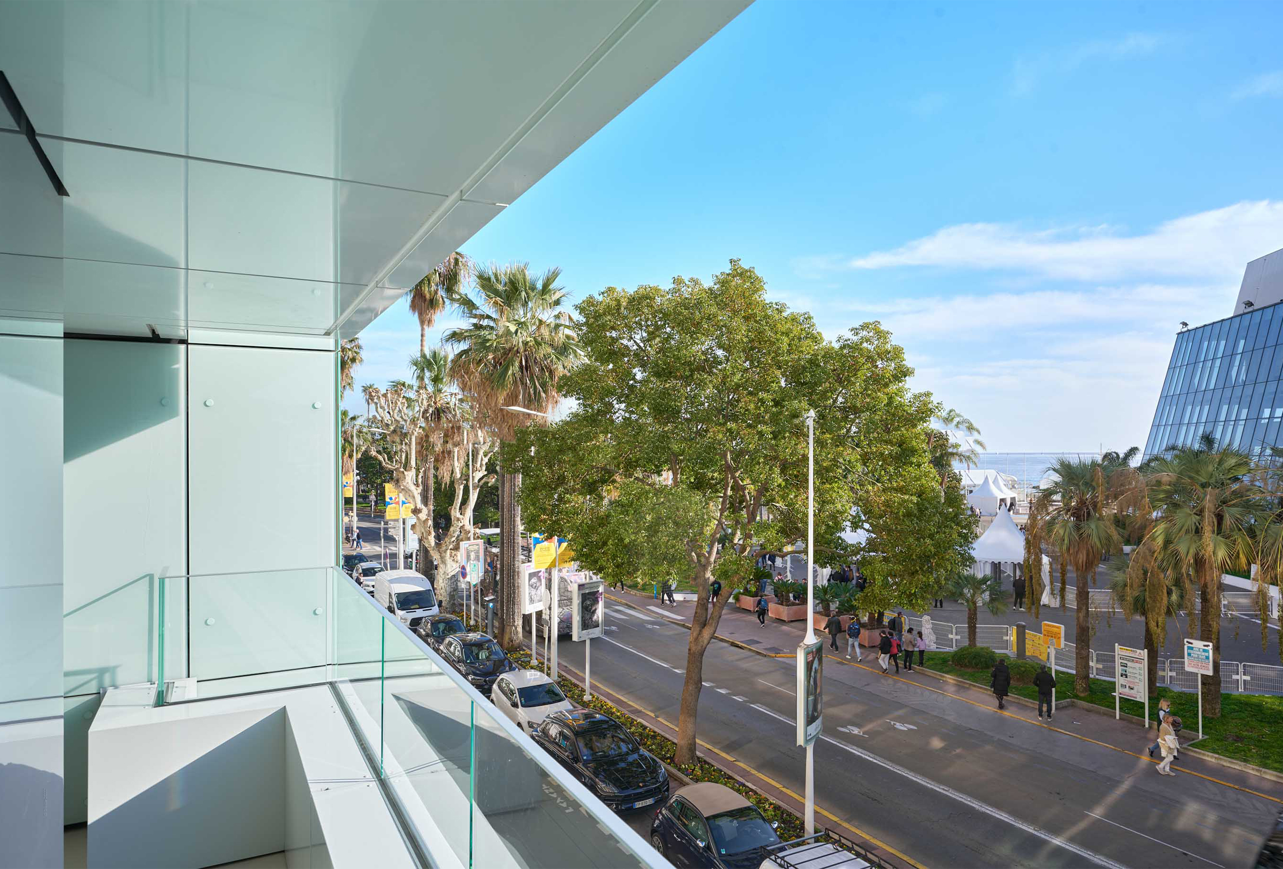 You will find yourself facing the Palais des Festivals, on the 2nd floor of the brand new First Croisette residence, with its sleek and contemporary design, above the impressive Dolce Gabbana boutique. The living room offers a relaxing space with a large sofa and a large table that can be used for meals and meetings. Its bay window opens onto a terrace with a direct view of the Croisette and the Palais des Festivals. The american kitchen, fully equipped and carefully designed, opens onto the living room and benefits from its brightness. The first bedroom, quiet and uncluttered, has a double bed and a very private bathroom with bath, shower and toilet. The second bedroom, equally refined, has a double bed and also has its adjoining bathroom with shower and toilet.