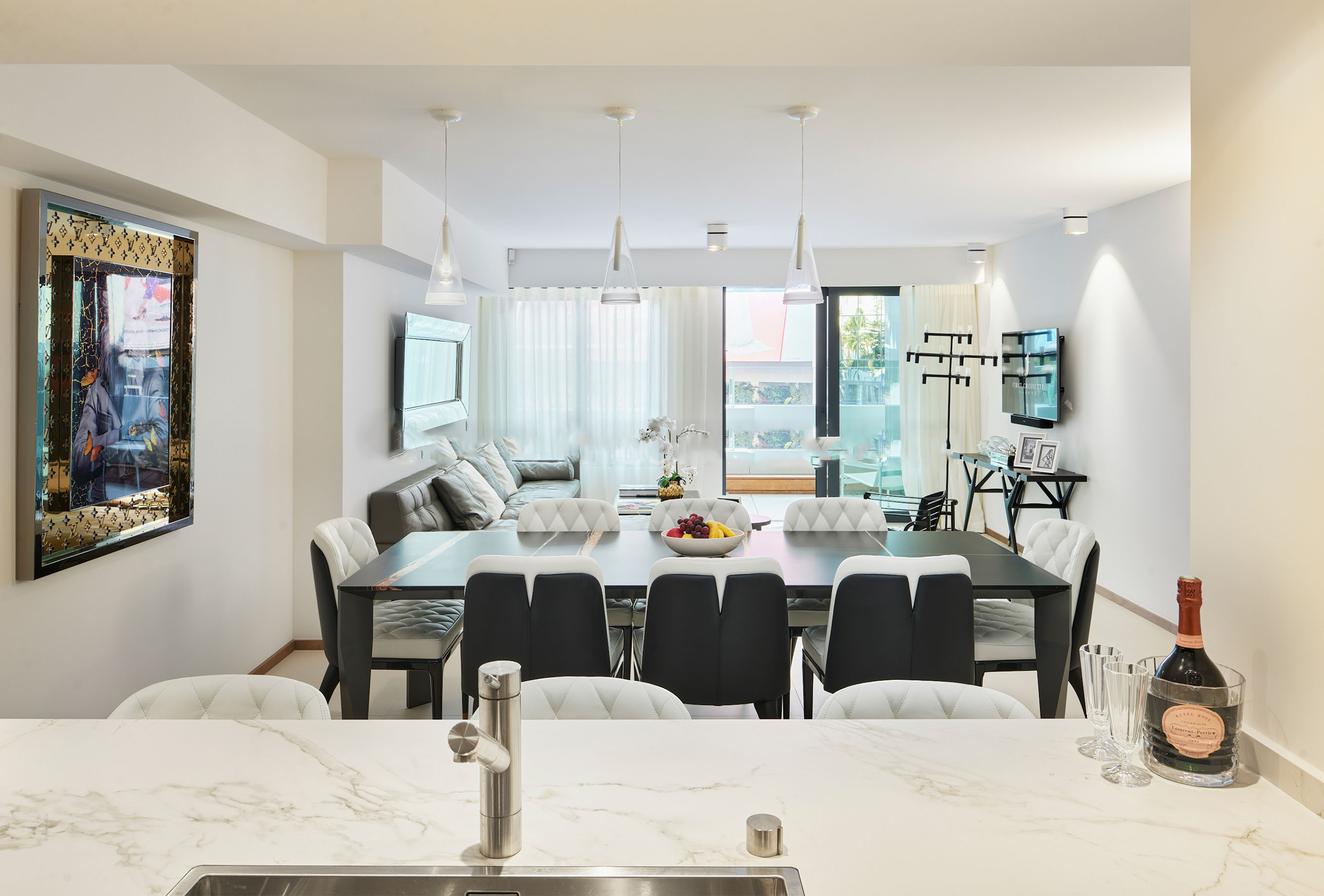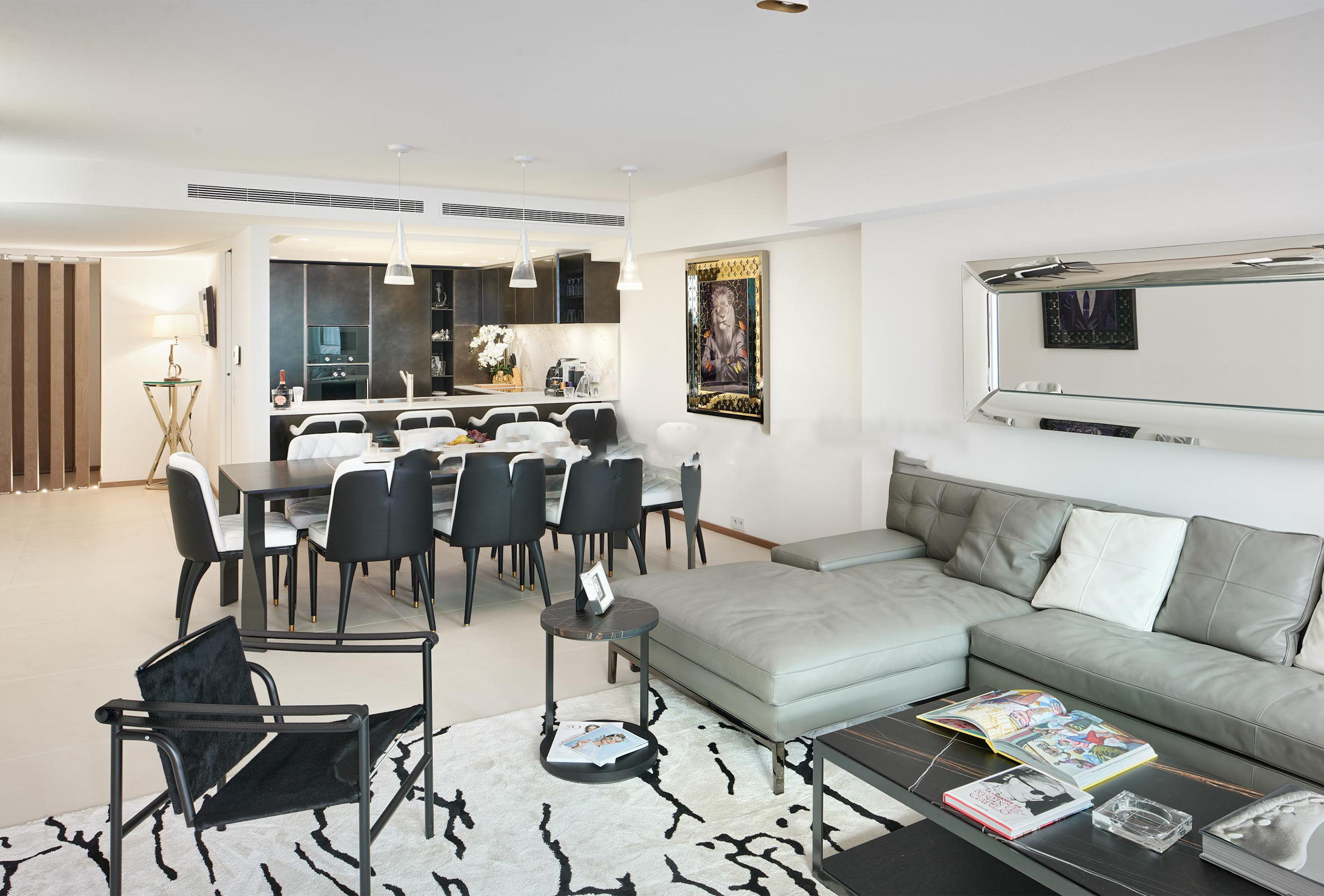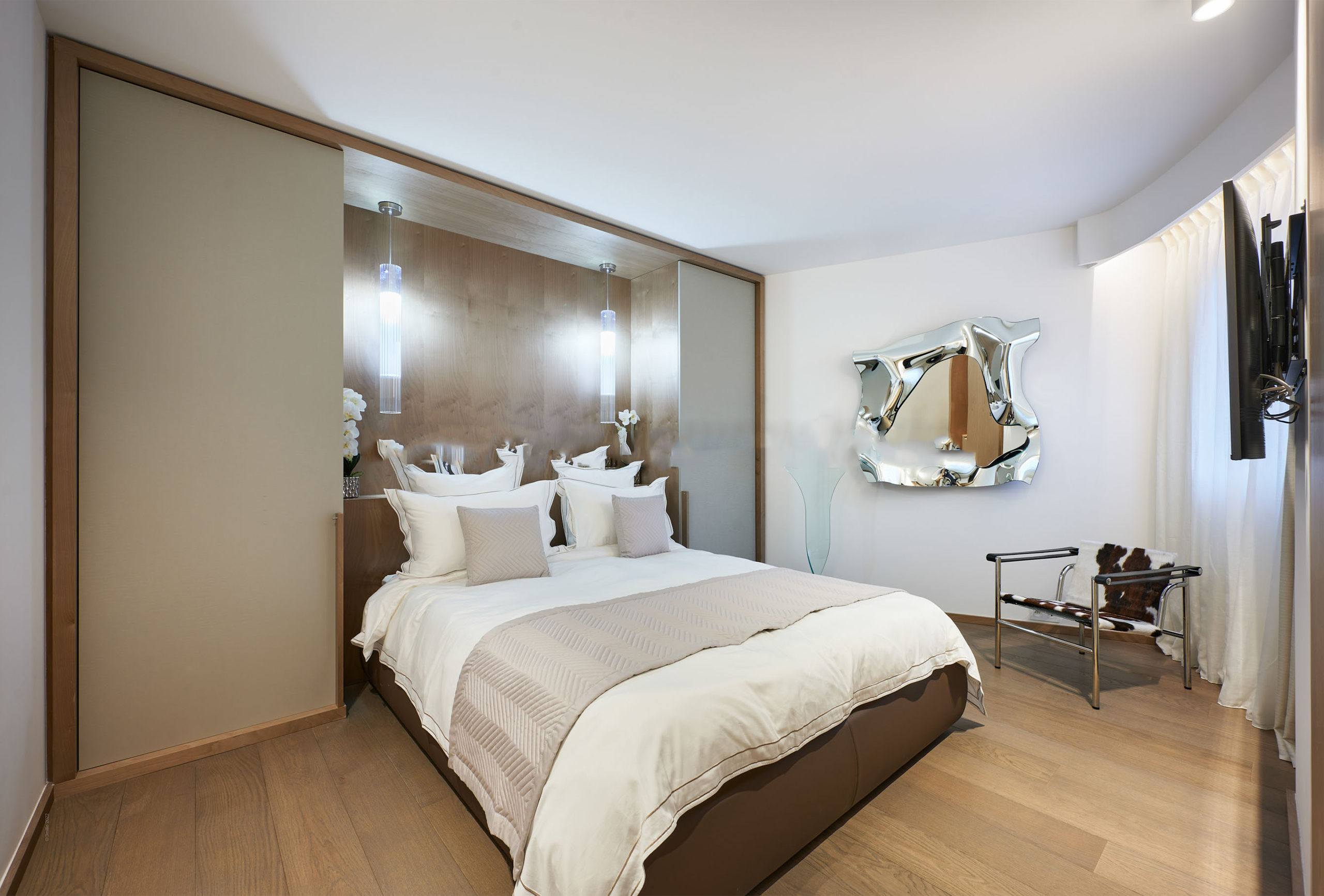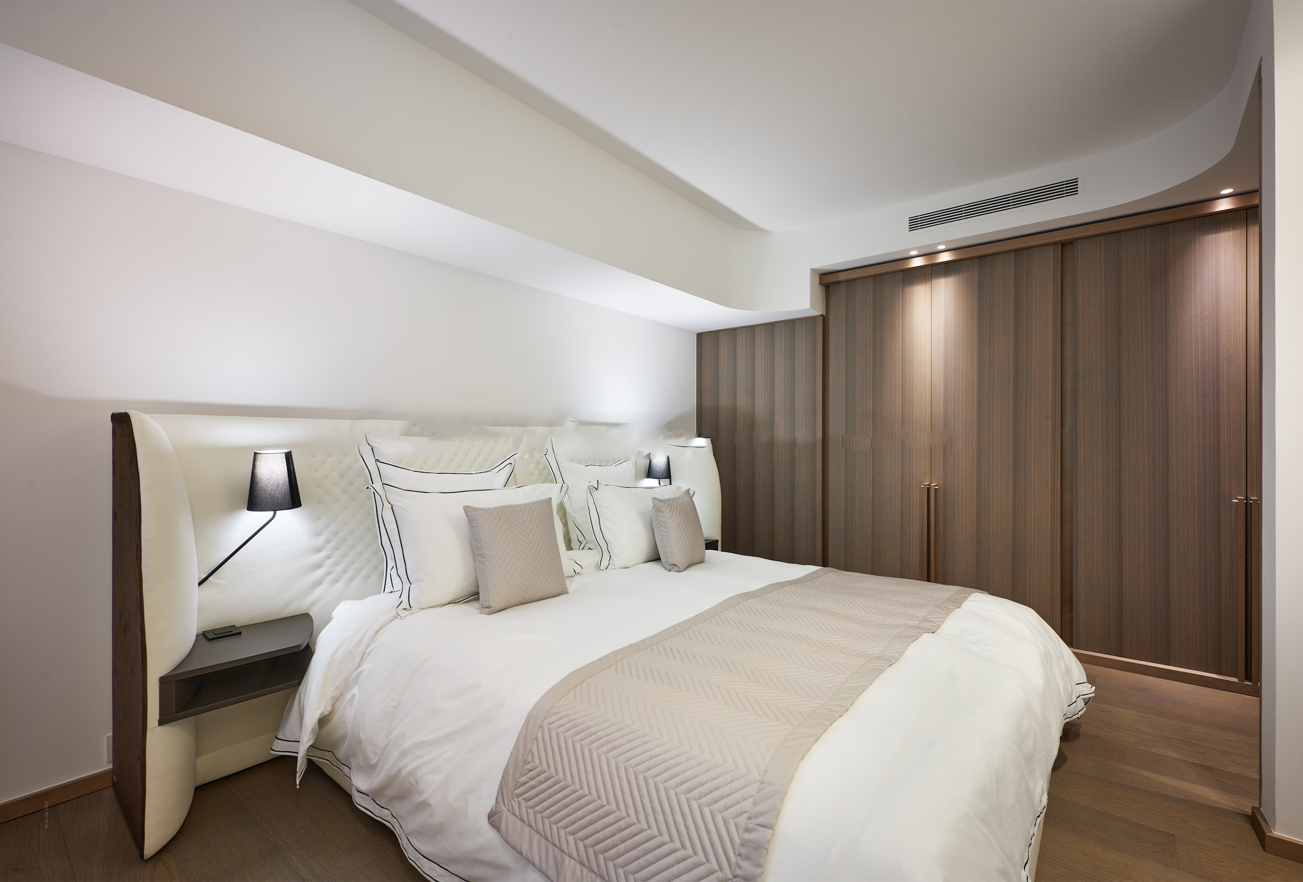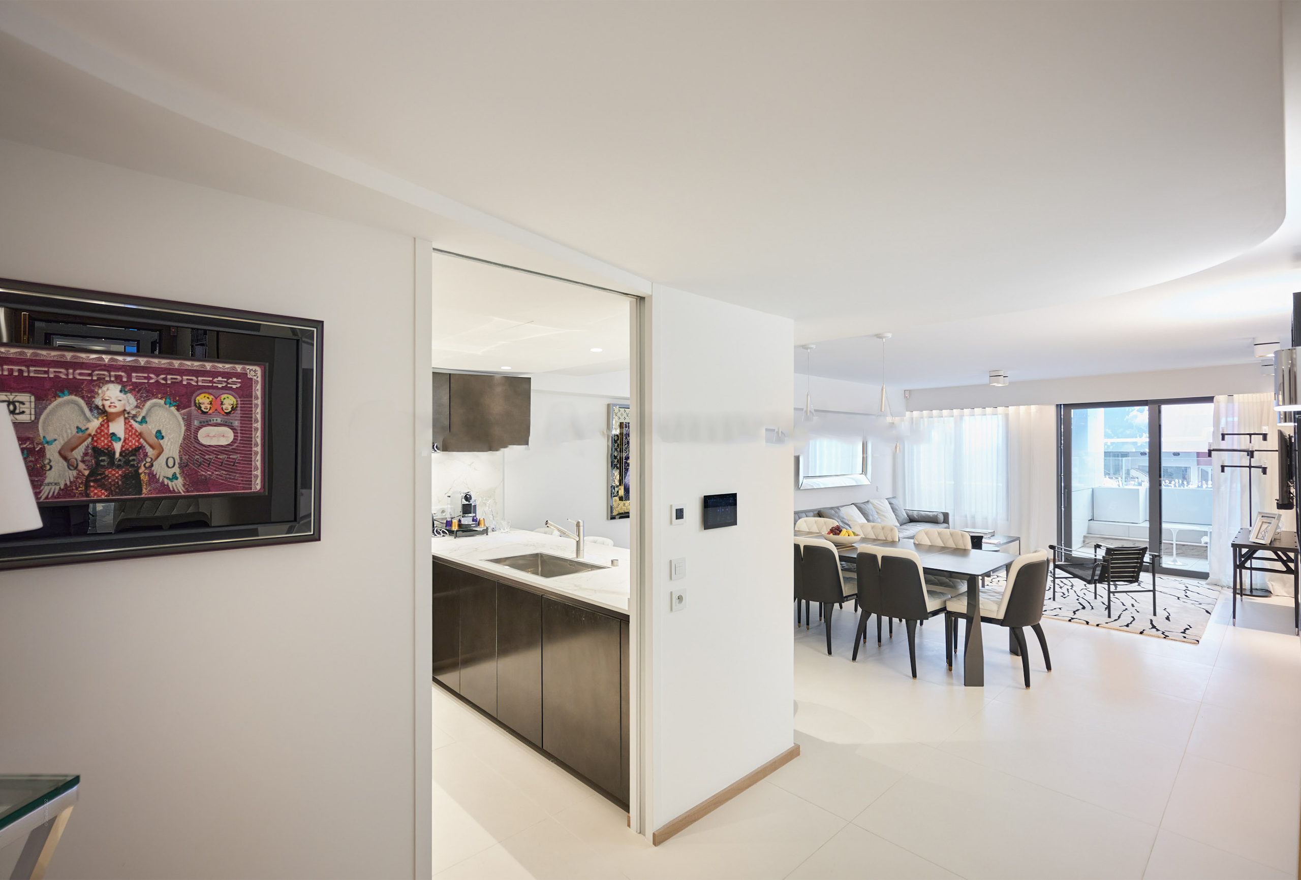 You will find yourself facing the Palais des Festivals, on the 2nd floor of the brand new First Croisette residence, with its sleek and contemporary design, above the impressive Dolce Gabbana boutique. The living room offers a relaxing space with a large sofa and a large table that can be used for meals and meetings. Its bay window opens onto a terrace with a direct view of the Croisette and the Palais des Festivals. The american kitchen, fully equipped and carefully designed, opens onto the living room and benefits from its brightness. The first bedroom, quiet and uncluttered, has a double bed and a very private bathroom with bath, shower and toilet. The second bedroom, equally refined, has a double bed and also has its adjoining bathroom with shower and toilet.