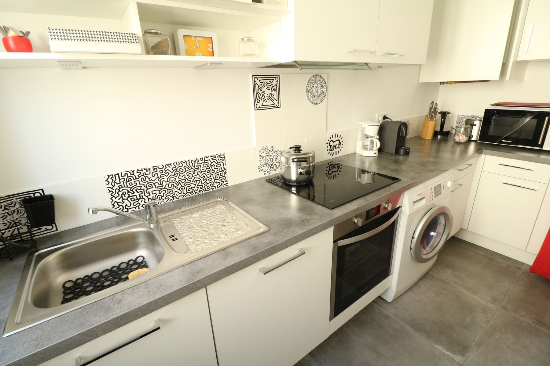 The separate modern kitchen is fully equipped with a dishwasher, washing machine, and all essentials for a comfortable stay. The bedroom includes twin beds, and the renovated bathroom offers a shower and toilet.