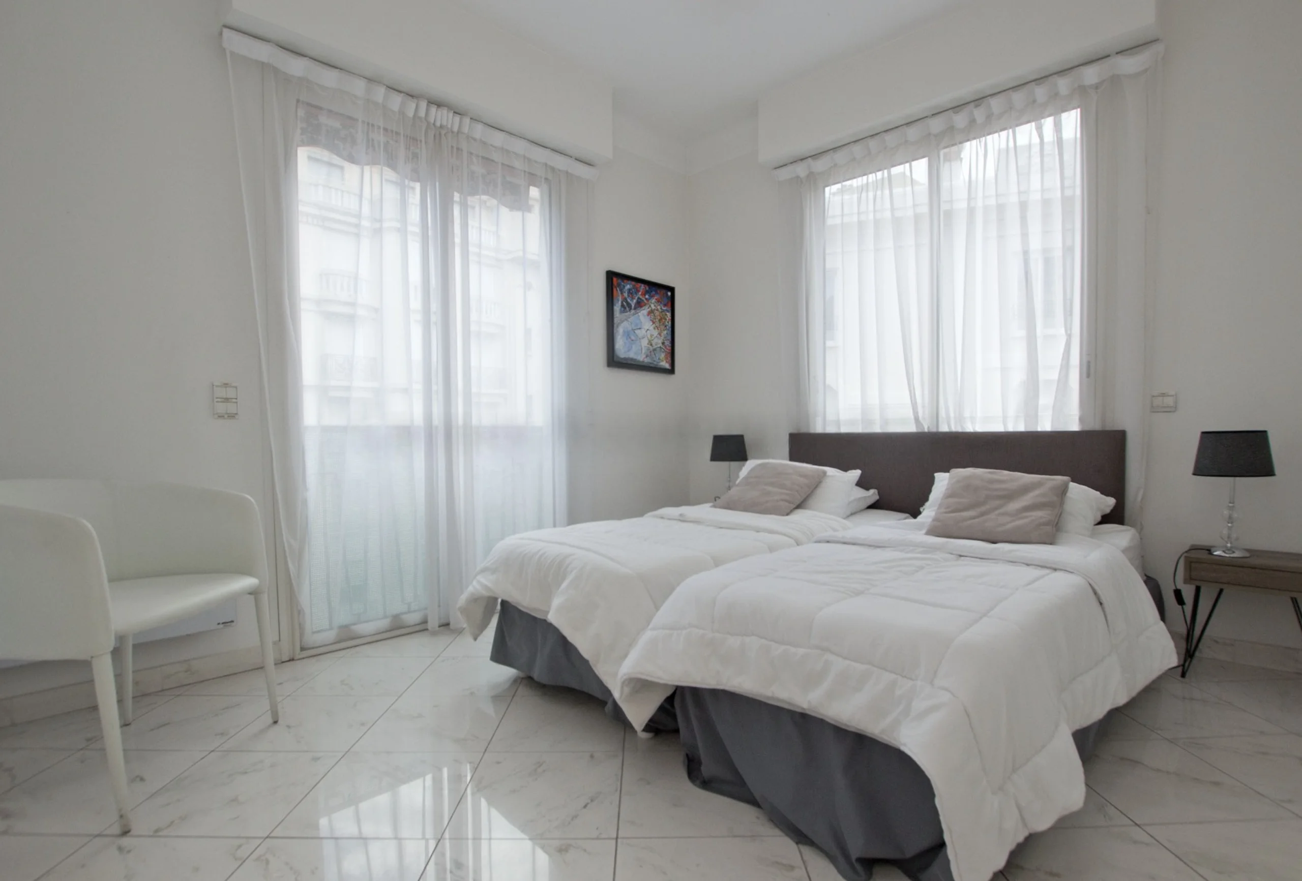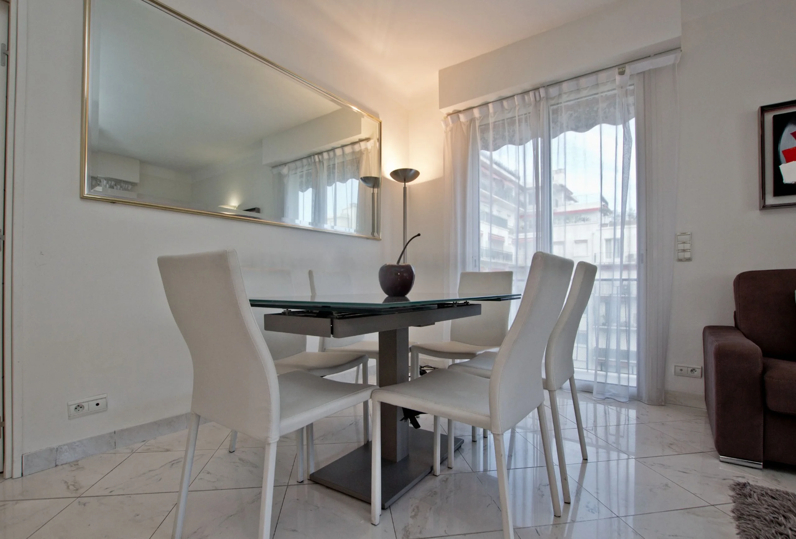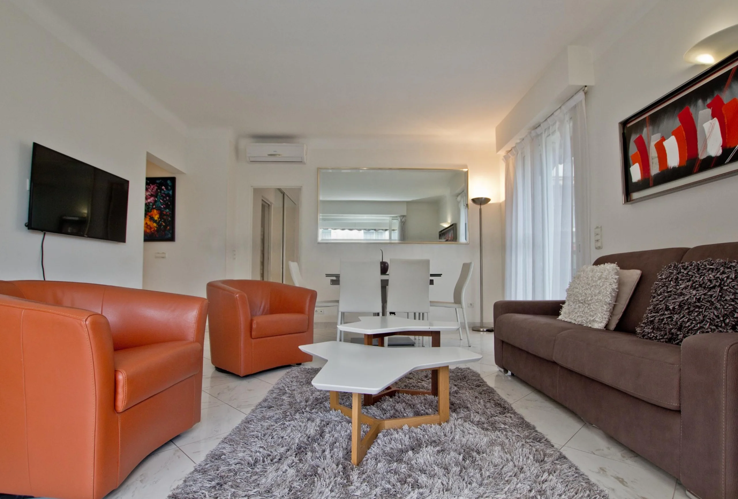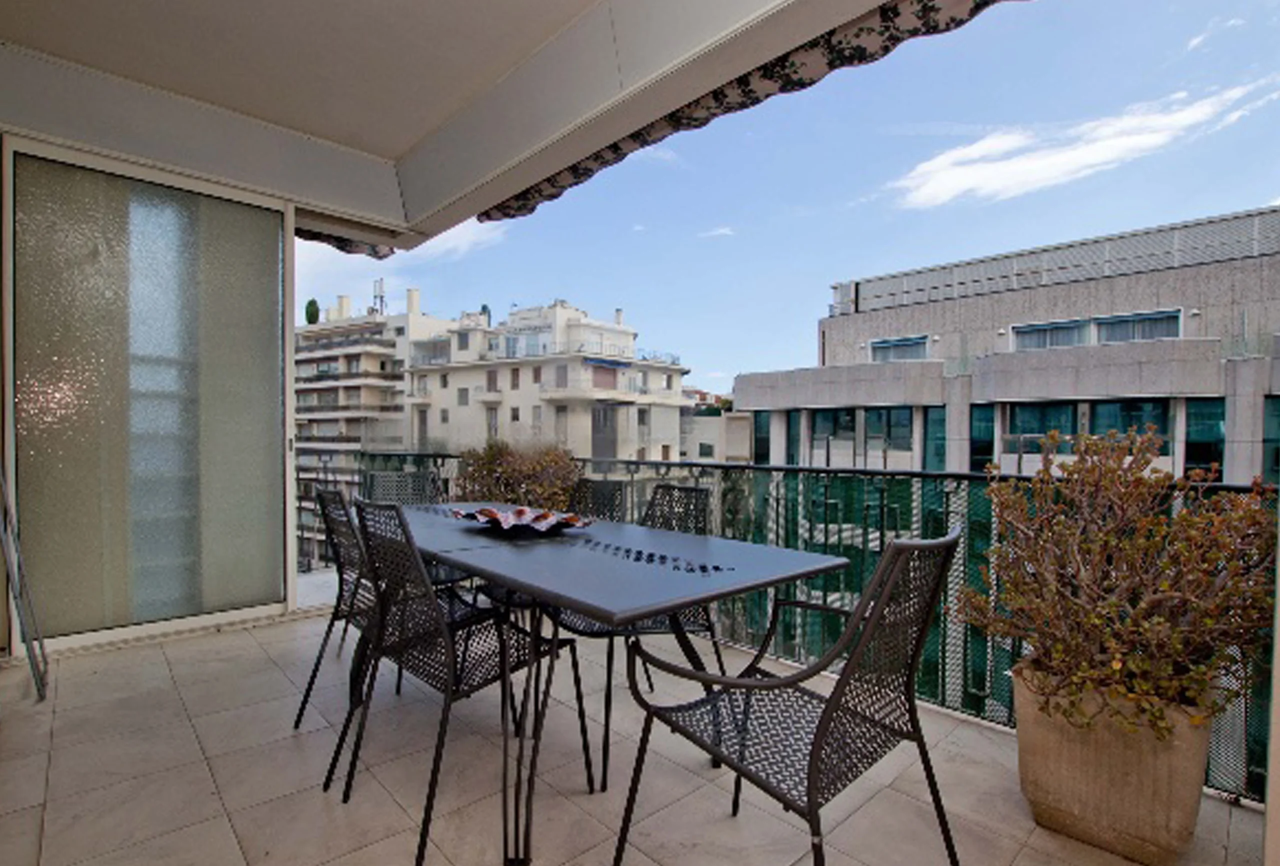 This is a beautifull two-bedroom apartment that has been fully renovated in a refined Scandinavian style. It is ideally located at the back of the Marriott, just a few steps from the Croisette and 8 minutes’ walk from the convention centre. It is on the 4th floor with lift of an high end building. The apartment features a bright and well decorated living room equipped with a sofabed. It opens onto a large terrace south oriented. The first bedroom offers a double bed and an en suite shower room. The second bedroom offers twin beds. A second shower room is available with toilet.