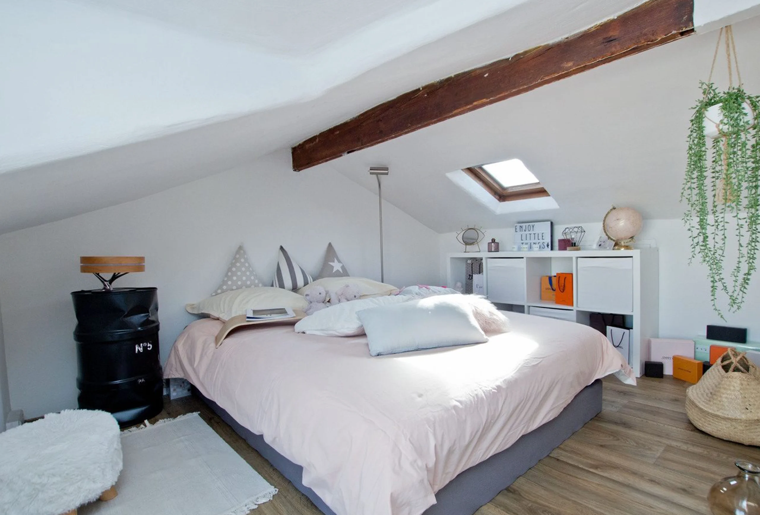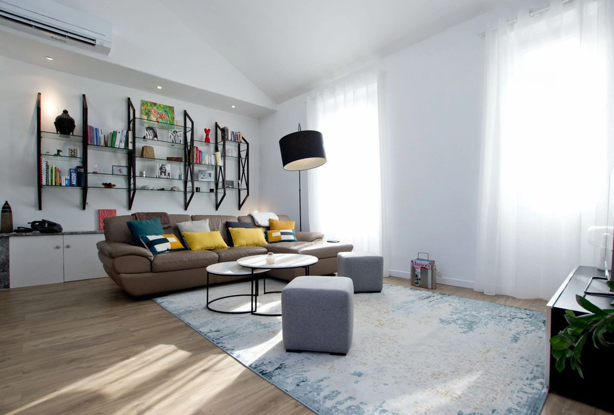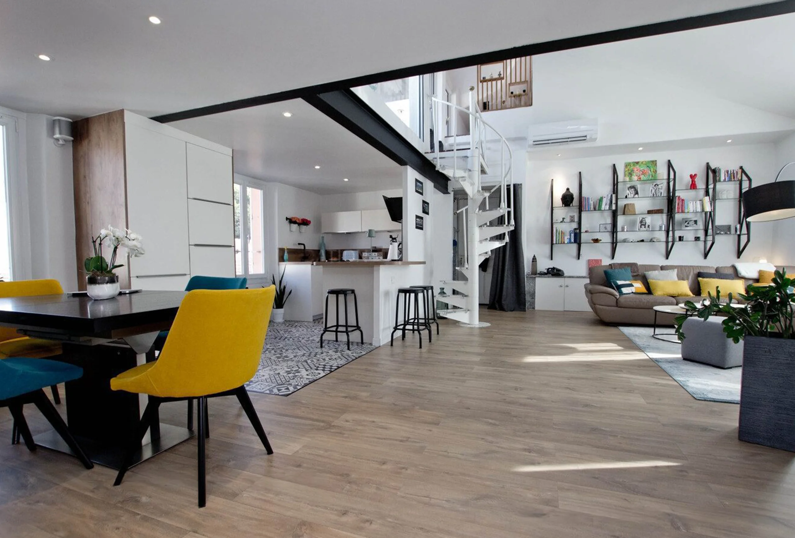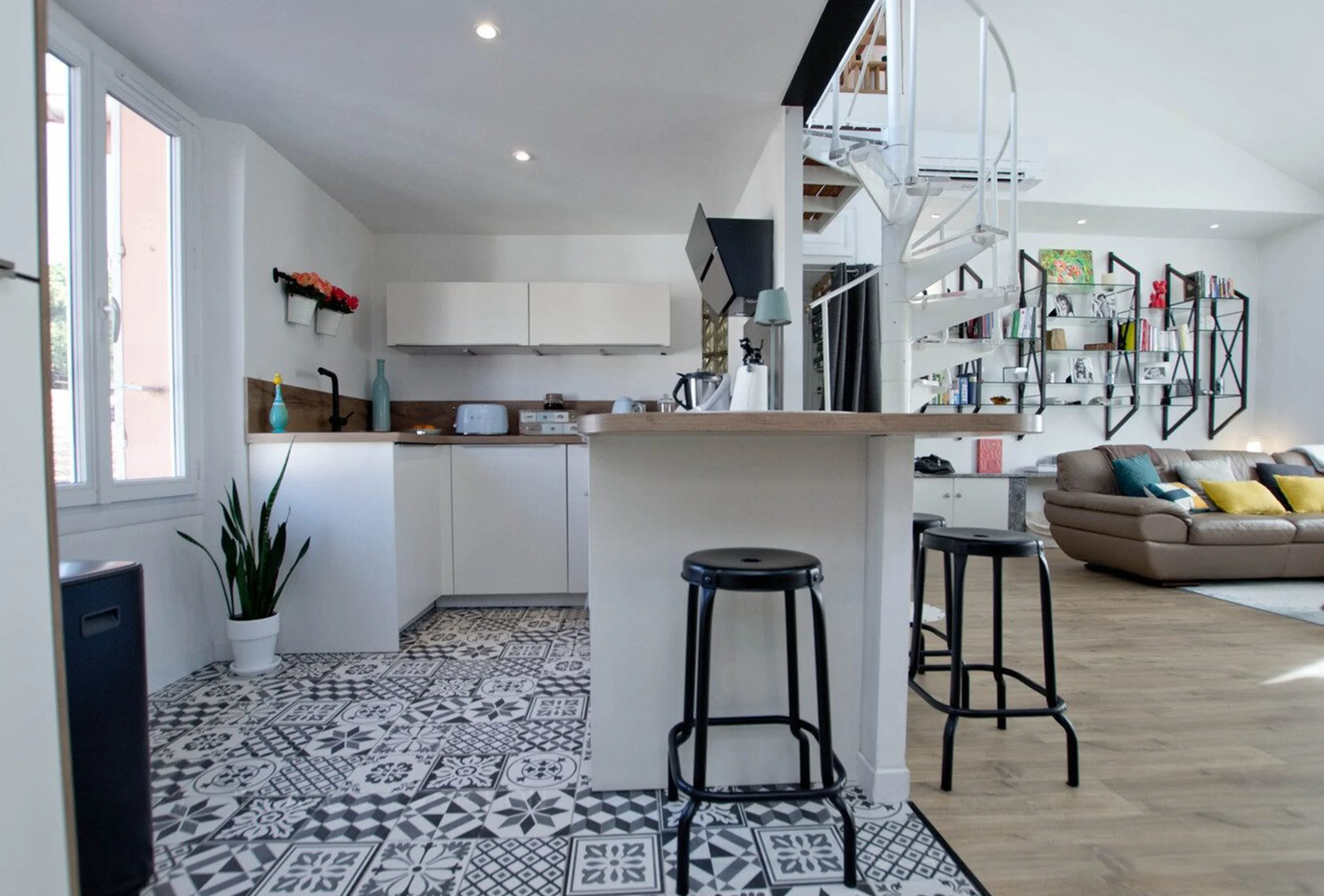 This apartment is located on the edge of the old town just one minute walking from the convention centre. It is on the second floor, without lift, of a well kept building. It is a resolutely modern apartment with good-sized living room. It is located close to the train station. The living room has high ceilings. It is very bright thanks to its many windows overlooking the street. It has a lounge area and a dining area. Both night area are on mezzanine and open onto the living room. The second night area has a low ceiling. The shower room is roomy and modern. The kitchen is entirely opened onto the dining area. It is fully equipped. You will find on the roof a charming terrace. This apartment will please you for sure. It is bright and airy, the decoration is modern