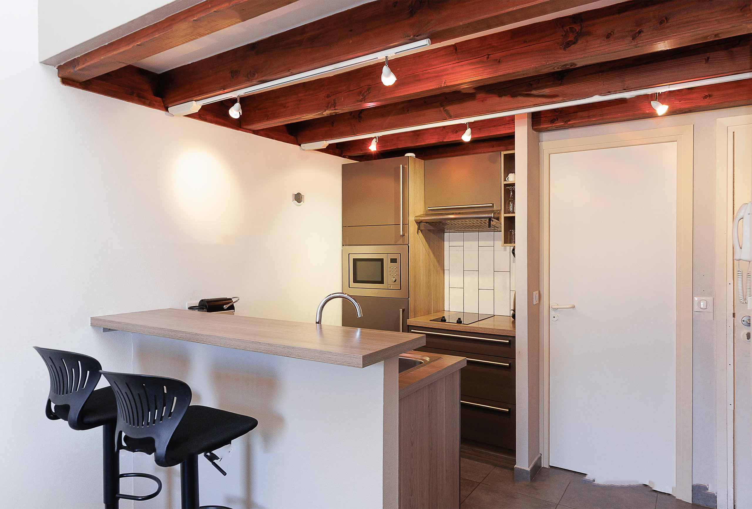 This charming two-room duplex apartment is ideally located in a modern, quiet, and well-maintained residence in the heart of Cannes, just a few minutes’ walk from the Palais des Festivals, shops, and beaches. The residence features an elevator and a shared laundry room with a washing machine and dryer, providing additional convenience for extended stays. The apartment, decorated with care in a contemporary style, offers a bright and functional space at the fourth floor of the residence. The spacious living room is located on the ground floor and includes a comfortable sofa bed, ideal for accommodating additional guests. A well-arranged TV area and a dining table for four create a convivial and welcoming atmosphere. The bedroom is situated on the upper floor, accessible via a staircase, and features two single beds that can be combined to create a double bed. This layout ensures a peaceful and private resting space. The apartment includes a modern and stylish bathroom with a walk-in shower and toilet, offering both practicality and comfort. The open-plan kitchen, located under the staircase, is fully equipped with ample storage, a microwave, stovetop, and coffee machine, providing everything you need to prepare meals during your stay. Whether you’re in Cannes for business or leisure, this duplex apartment guarantees a comfortable and enjoyable stay in an ideal location.
