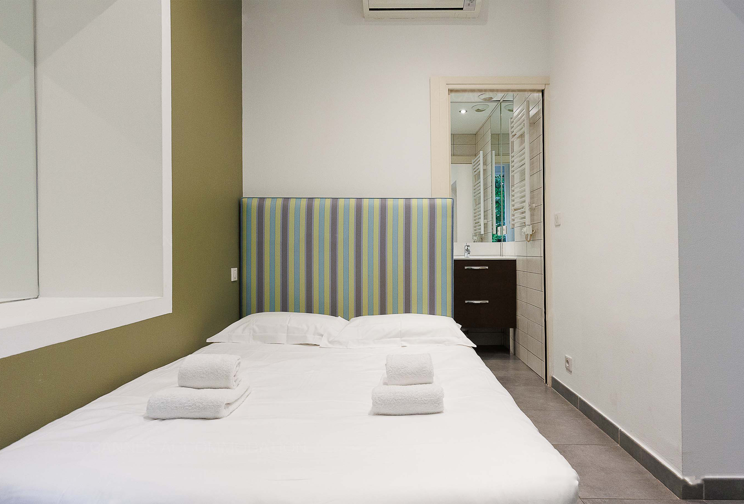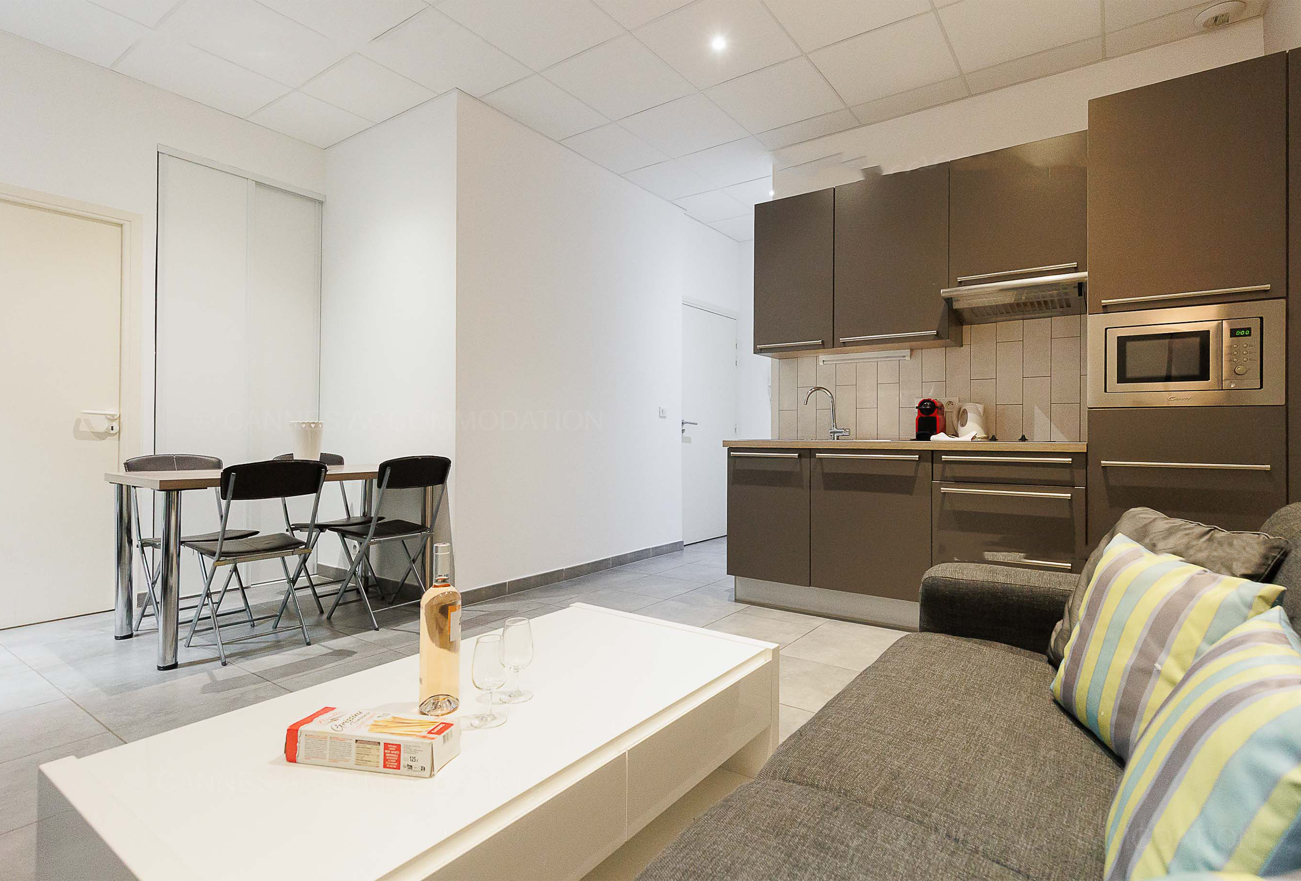 This charming two-room apartment is ideally located in a modern, quiet, and well-maintained residence in the heart of Cannes, just a few minutes’ walk from the Palais des Festivals, shops, and beaches. The residence is equipped with an elevator and features a shared laundry room with a washing machine and dryer, providing additional convenience for extended stays. The apartment, decorated with care in a contemporary style, offers a functional space at the first floor residence. The spacious living room includes a comfortable sofa bed, ideal for accommodating additional guests. A well-arranged TV area and a dining table for four make this space welcoming and convivial. The main bedroom is furnished with a comfortable double bed and features a minimalist and soothing decor, perfect for relaxation after a busy day.
