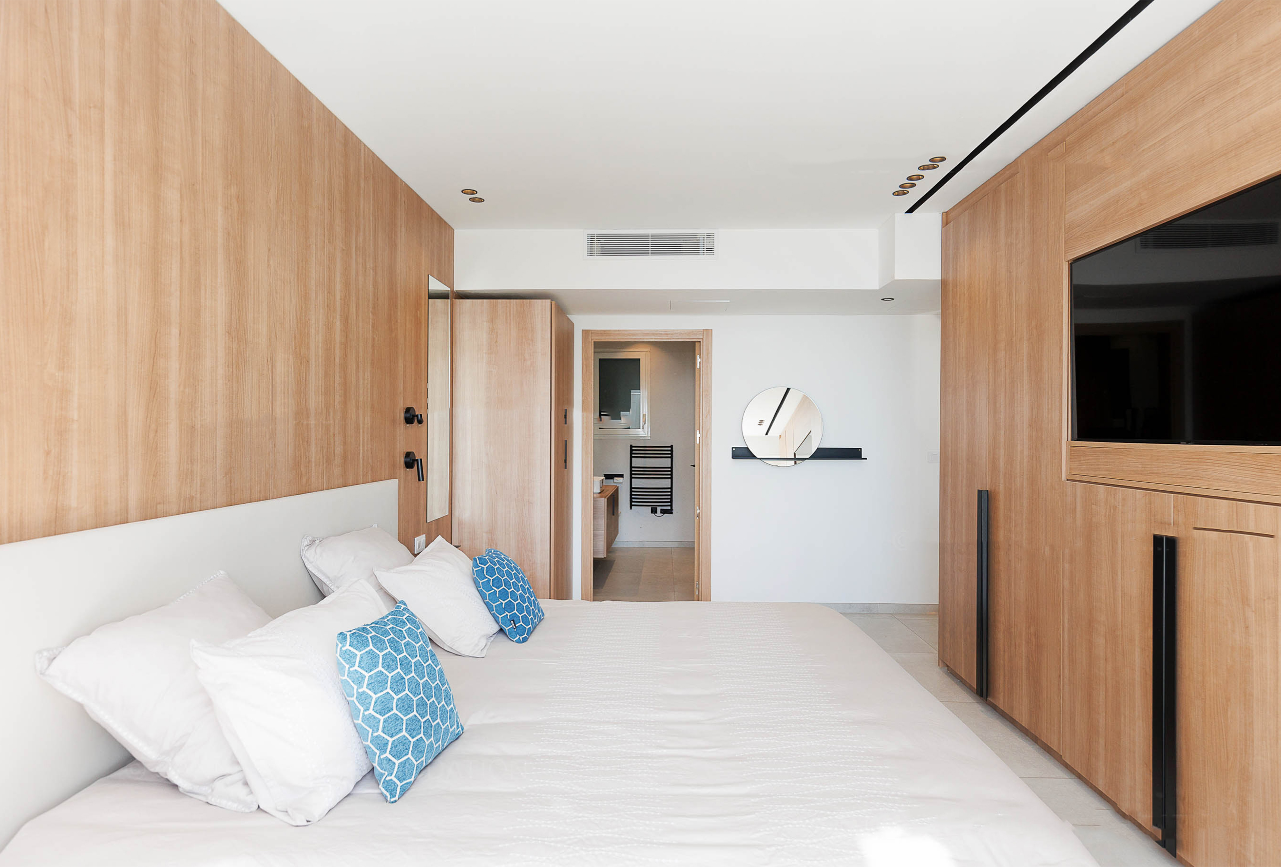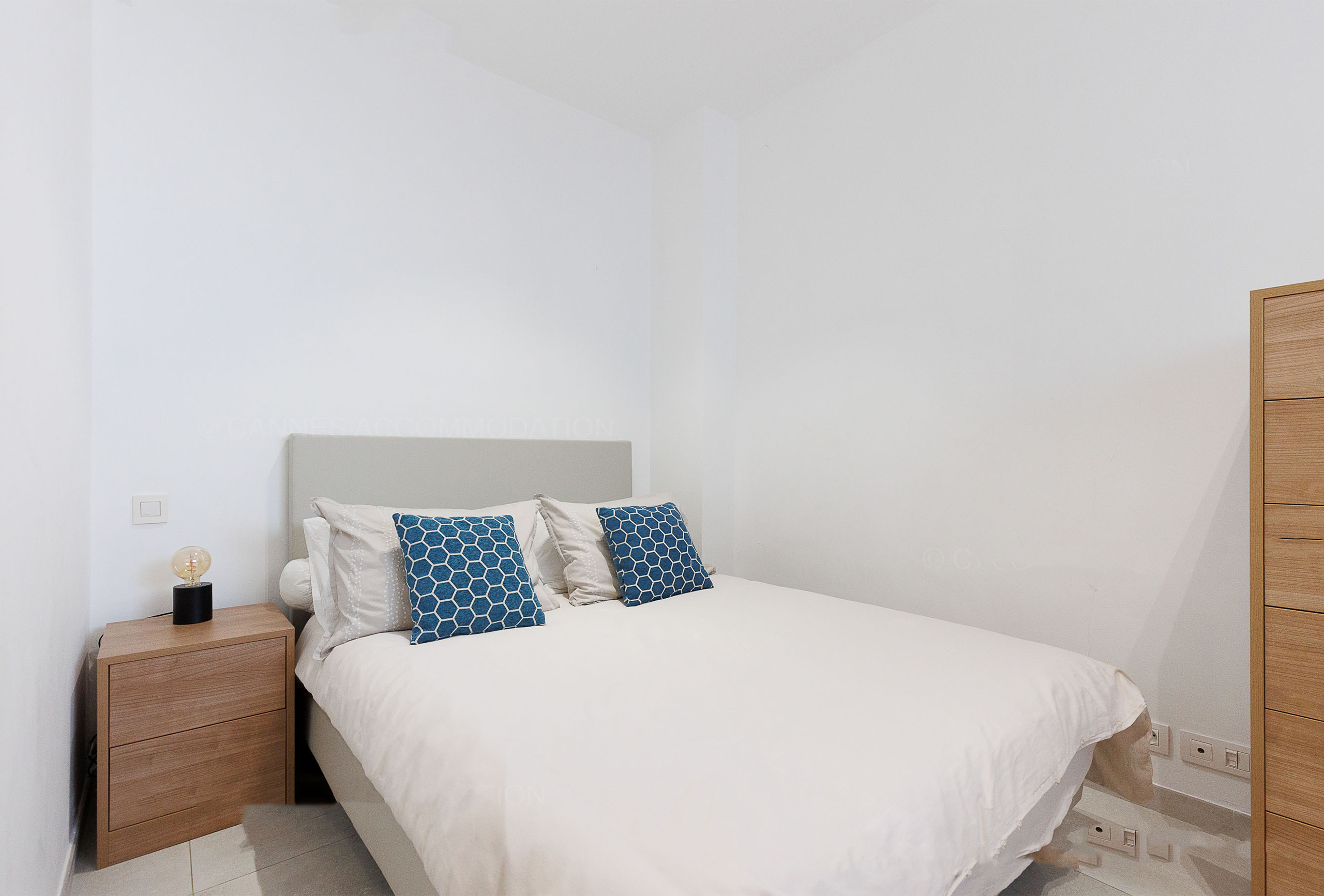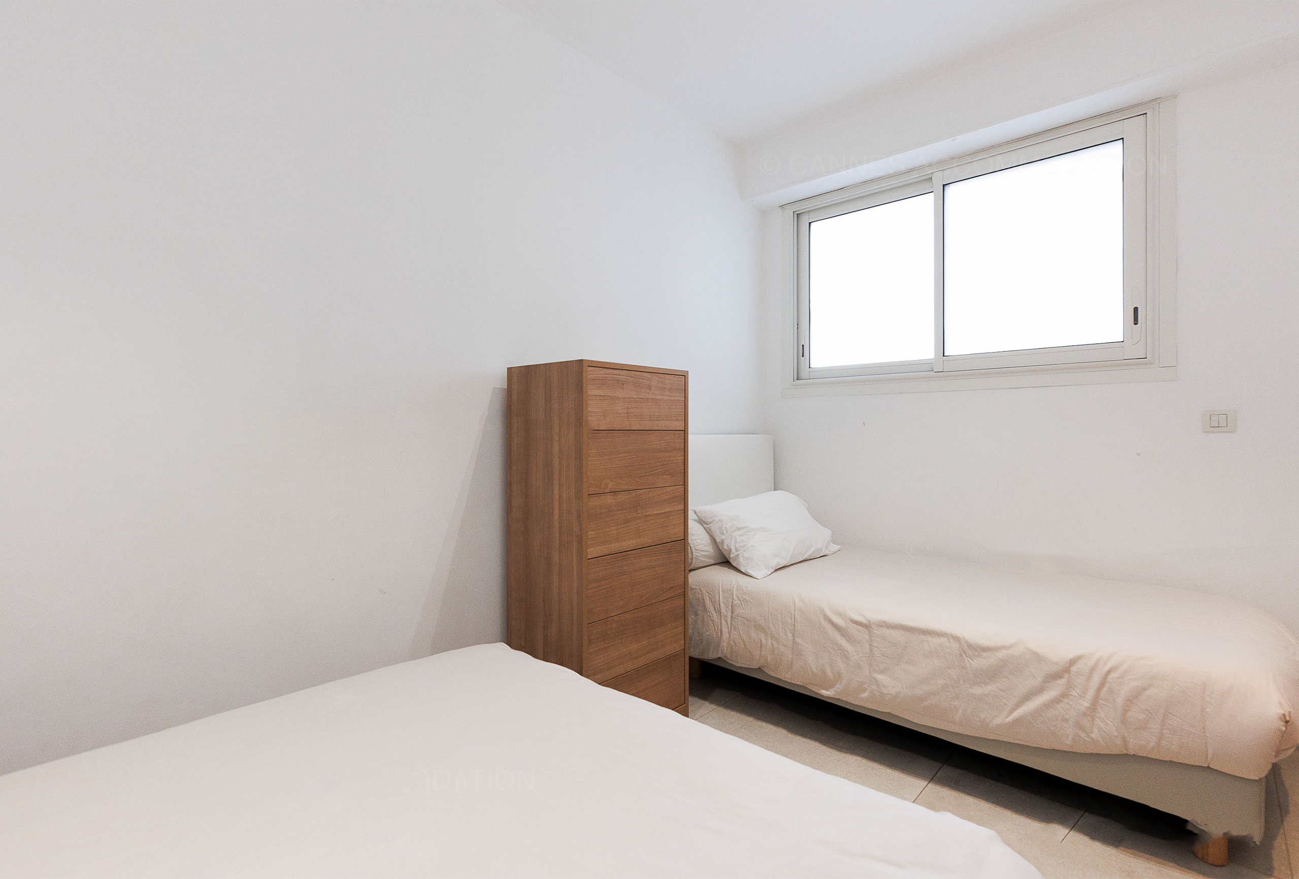 The apartment also boasts a lovely furnished terrace, perfect for enjoying a sunny breakfast facing the crystal-clear waters of the Cannes bay, or for unwinding after a busy day. The master bedroom, designed as a luxurious suite, features a king-size bed, a spacious wardrobe, and a private bathroom with an Italian-style shower for ultimate comfort. The second bedroom, fitted with a comfortable double bed, is the perfect place to rest after a busy day, whether after a conference at the Palais des Congrès or an extensive shopping session.