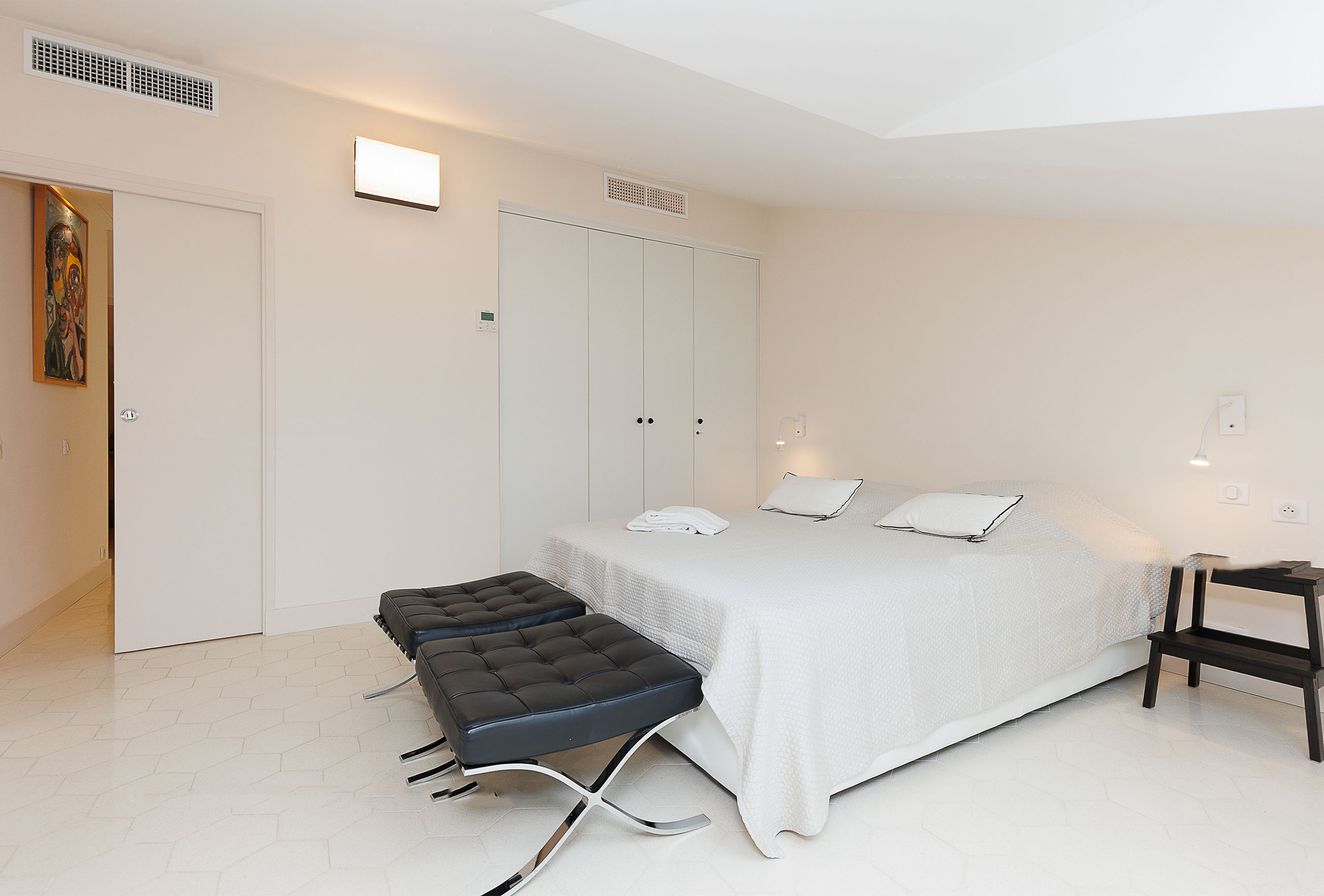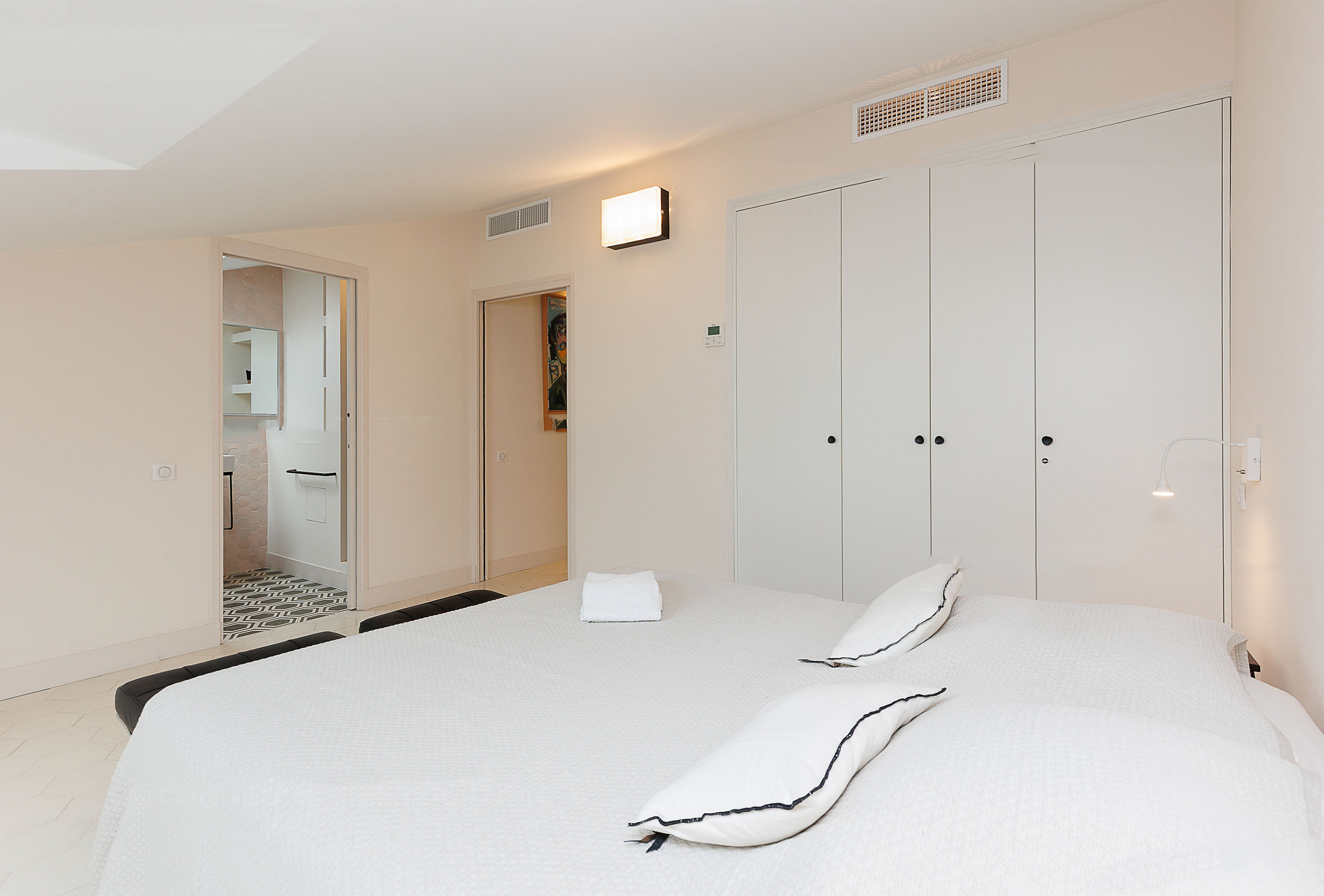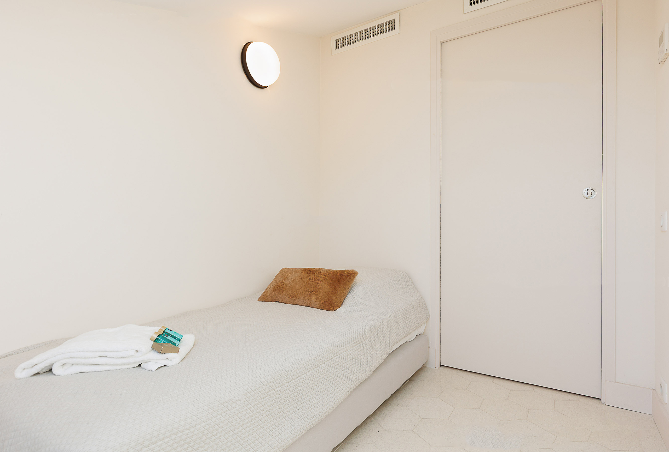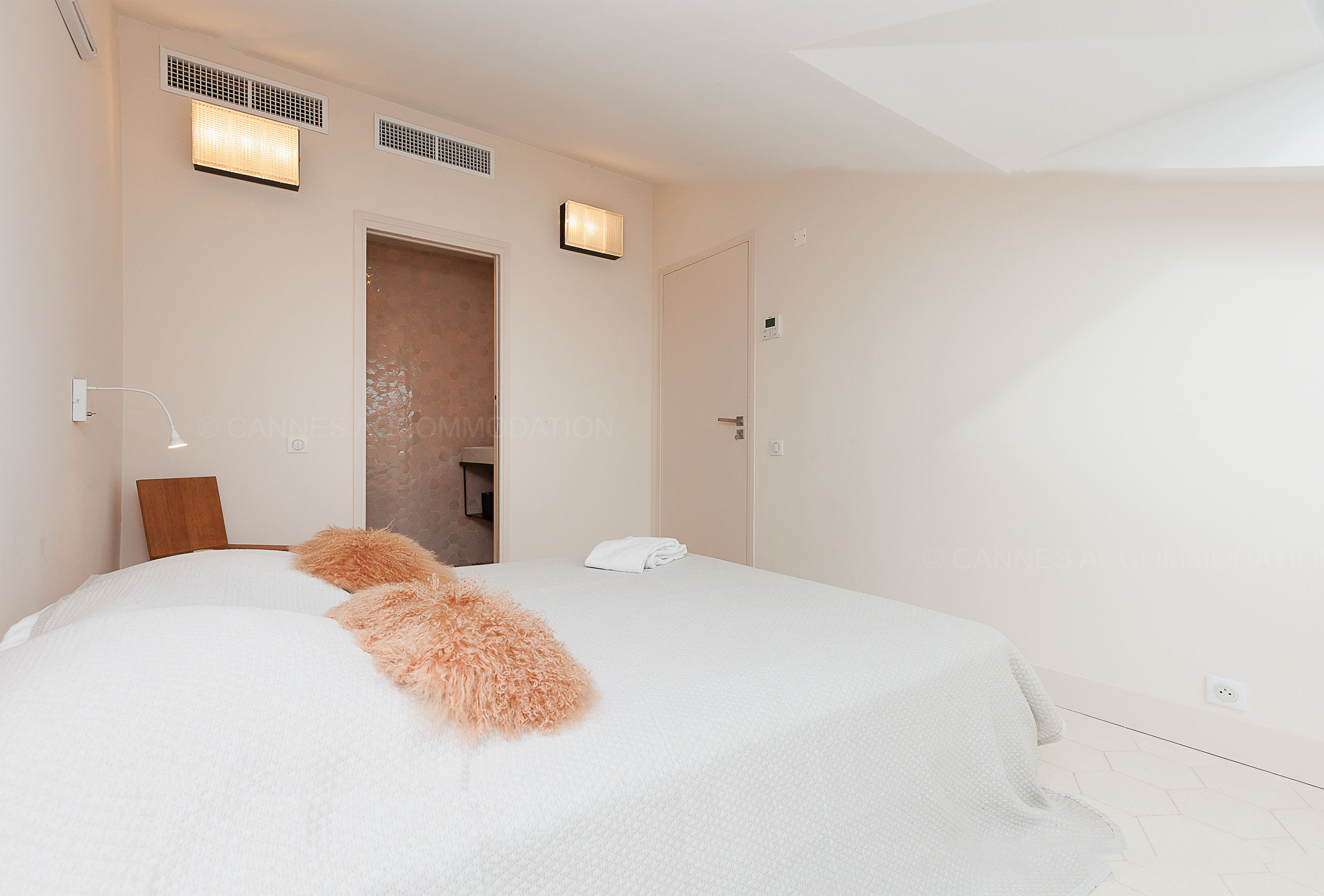 A third, smaller bedroom with an 80 cm bed provides an ideal solution for a child or an additional sleeping arrangement. An independent toilet serves all three bedrooms, ensuring added convenience for guests. With its simple yet elegant decor, this apartment combines comfort and modernity in a refined setting. Its prime location, less than two minutes from the Palais des Congrès, offers easy access to Cannes’ renowned beaches, restaurants, and shops. A perfect address to combine work and relaxation on the French Riviera, ideal for congress attendees and visitors looking for a pleasant and convenient stay.