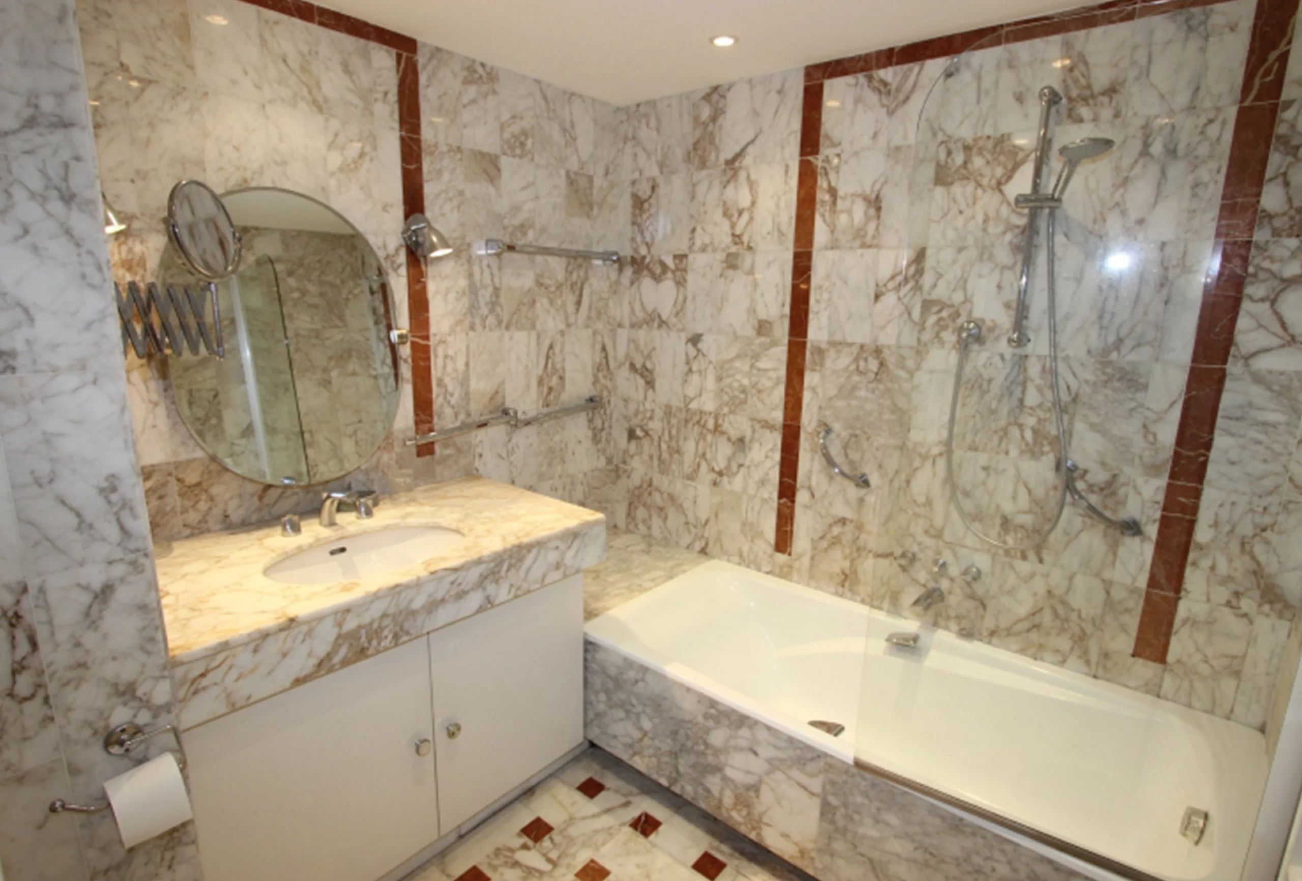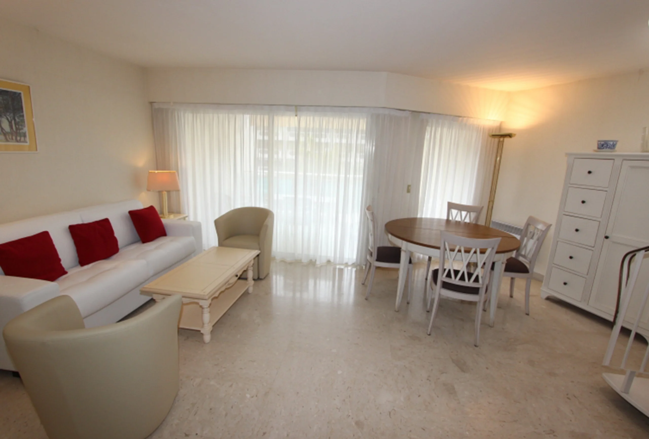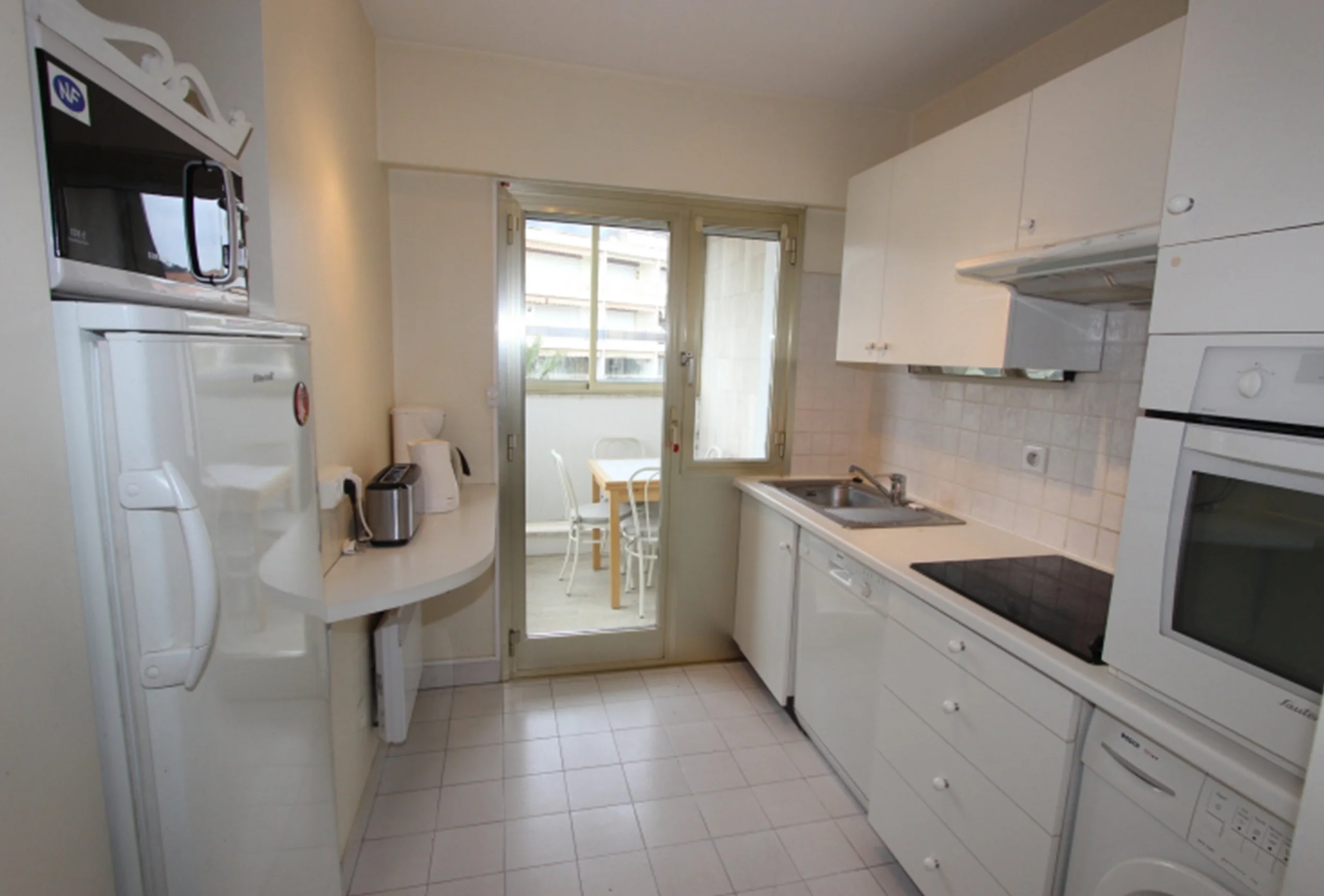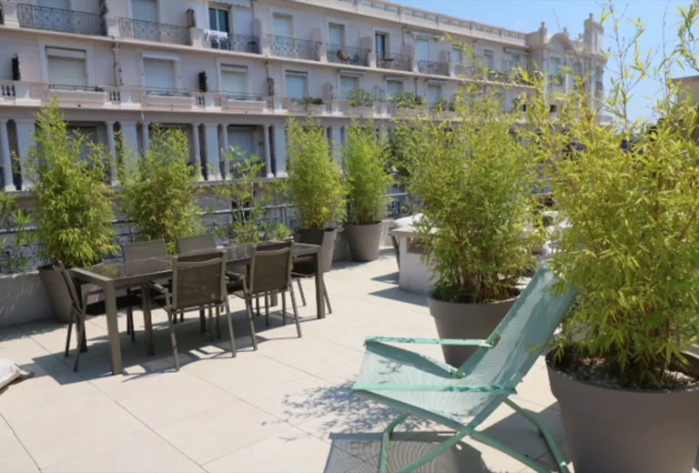 This is a luxury residence located 100 meters from the Croisette between Marriott and Carlton hotels overlooking a landscaped park 5 minutes walk from the Palais des Festivals. This 2 rooms of 55 m2 + terraces is located at 6 ° and last floor with south-north exposure, very calm and bright. It includes an entrance, a living room with south terrace and stairs leading to a roof terrace, a bedroom with two twin beds (2 x 100 cm) and possibility of making a double bed and a dressing room, a fully equipped kitchen ( oven, microwave, hob, dishwasher, washing machine, fridge, freezer …), a bathroom with toilet, a guest toilet, air conditioning, a safe and internet.