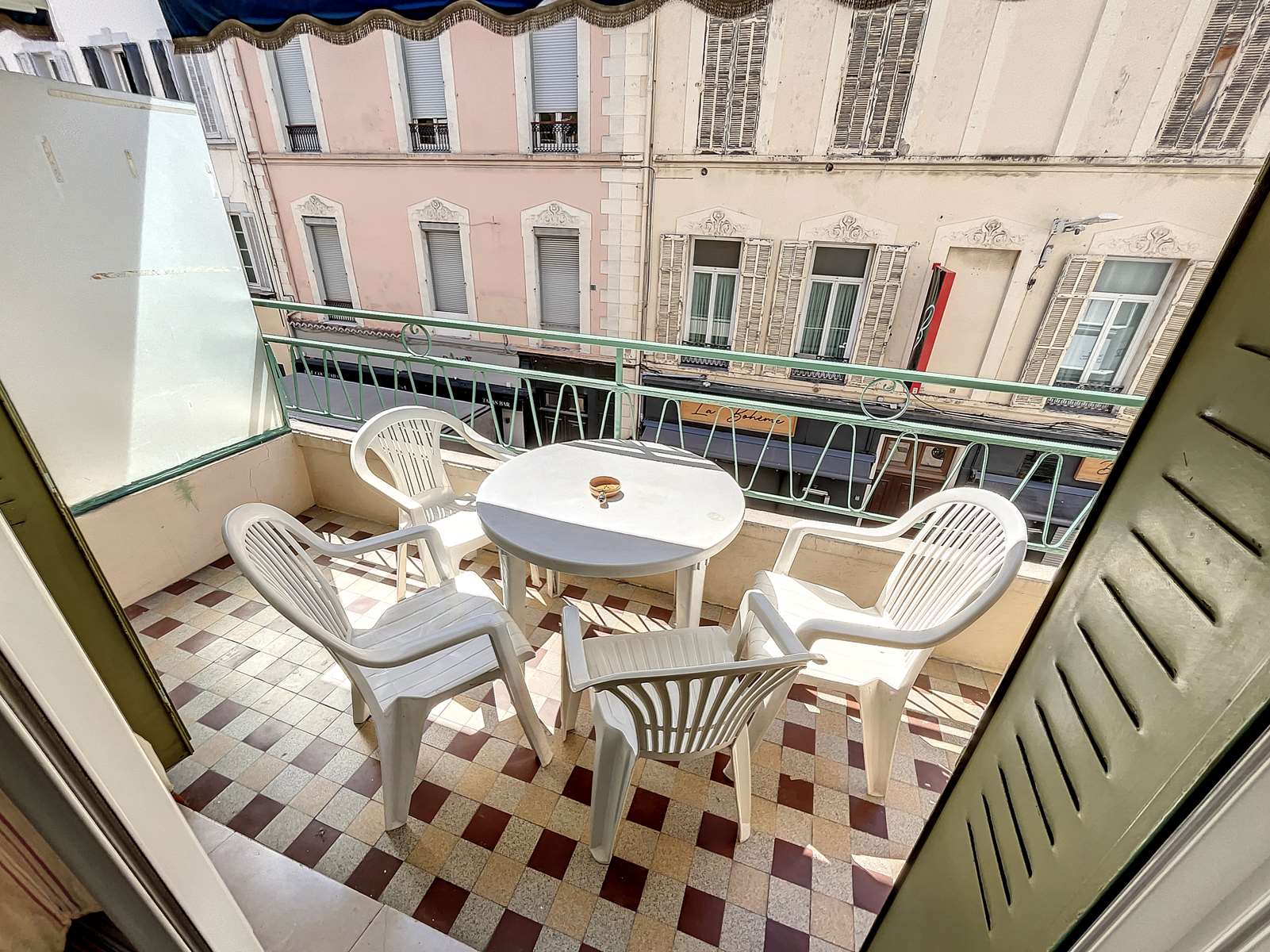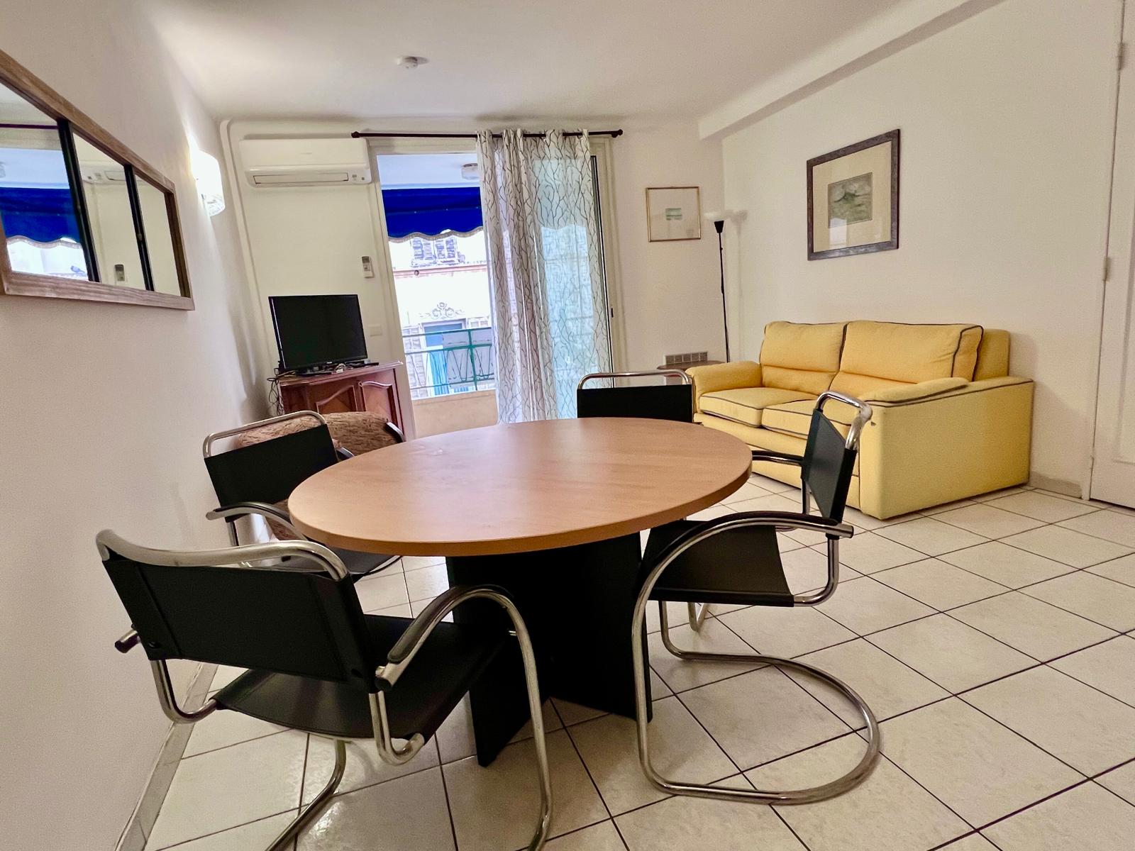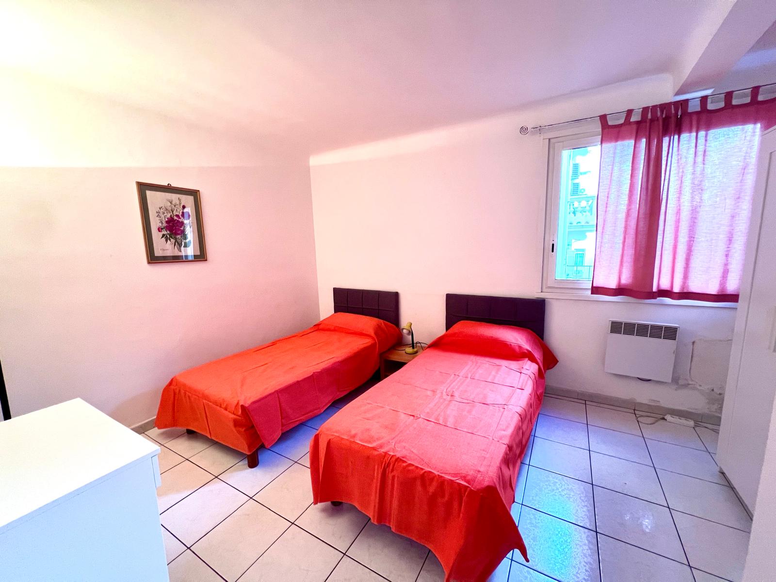 This convenient two-bedroom apartment is situated in the heart of Cannes on Rue Frères Pradignac, just a 3-minute walk from the Palais and two blocks from La Croisette, behind the Grand Hotel, in a vibrant area filled with shops and restaurants. The bedrooms are quietly located at the rear of the building; one features twin beds that can be converted into a queen-size bed, while the other has a single bed. The apartment includes a cozy balcony with a table and chairs, a basic kitchenette in the living room, a TV, a shower, and a separate toilet. Simple yet practical, it also offers Wi-Fi for added convenience.