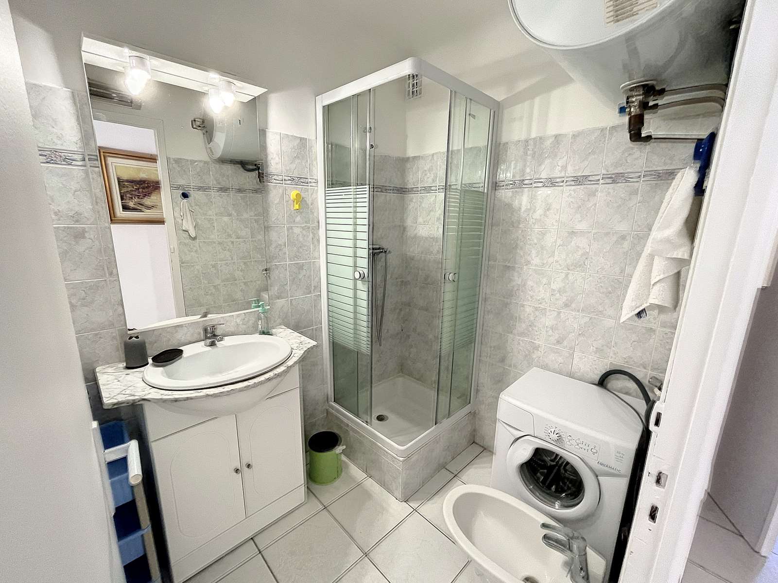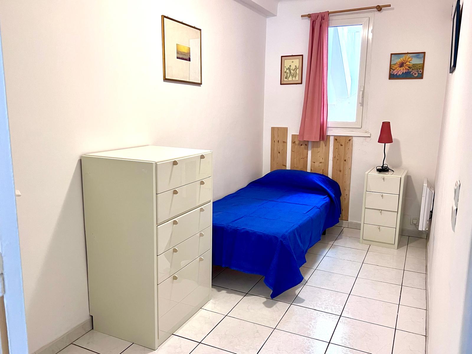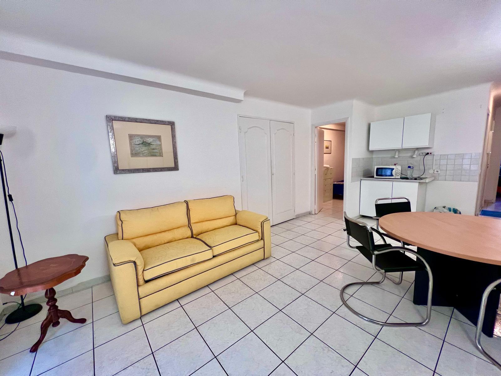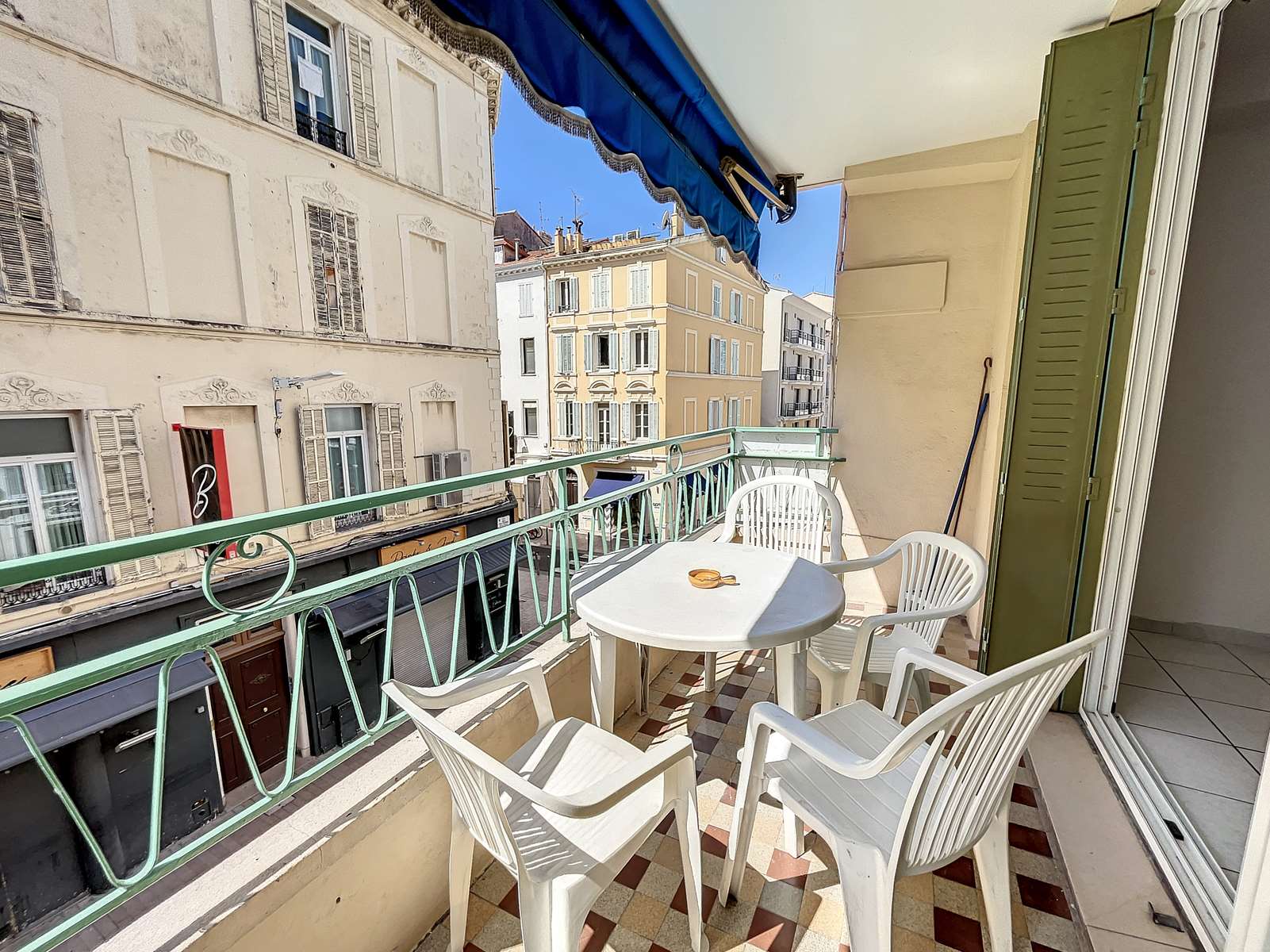This convenient two-bedroom apartment is situated in the heart of Cannes on Rue Frères Pradignac, just a 3-minute walk from the Palais and two blocks from La Croisette, behind the Grand Hotel, in a vibrant area filled with shops and restaurants. The bedrooms are quietly located at the rear of the building; one features twin beds that can be converted into a queen-size bed, while the other has a single bed. The apartment includes a cozy balcony with a table and chairs, a basic kitchenette in the living room, a TV, a shower, and a separate toilet. Simple yet practical, it also offers Wi-Fi for added convenience.
