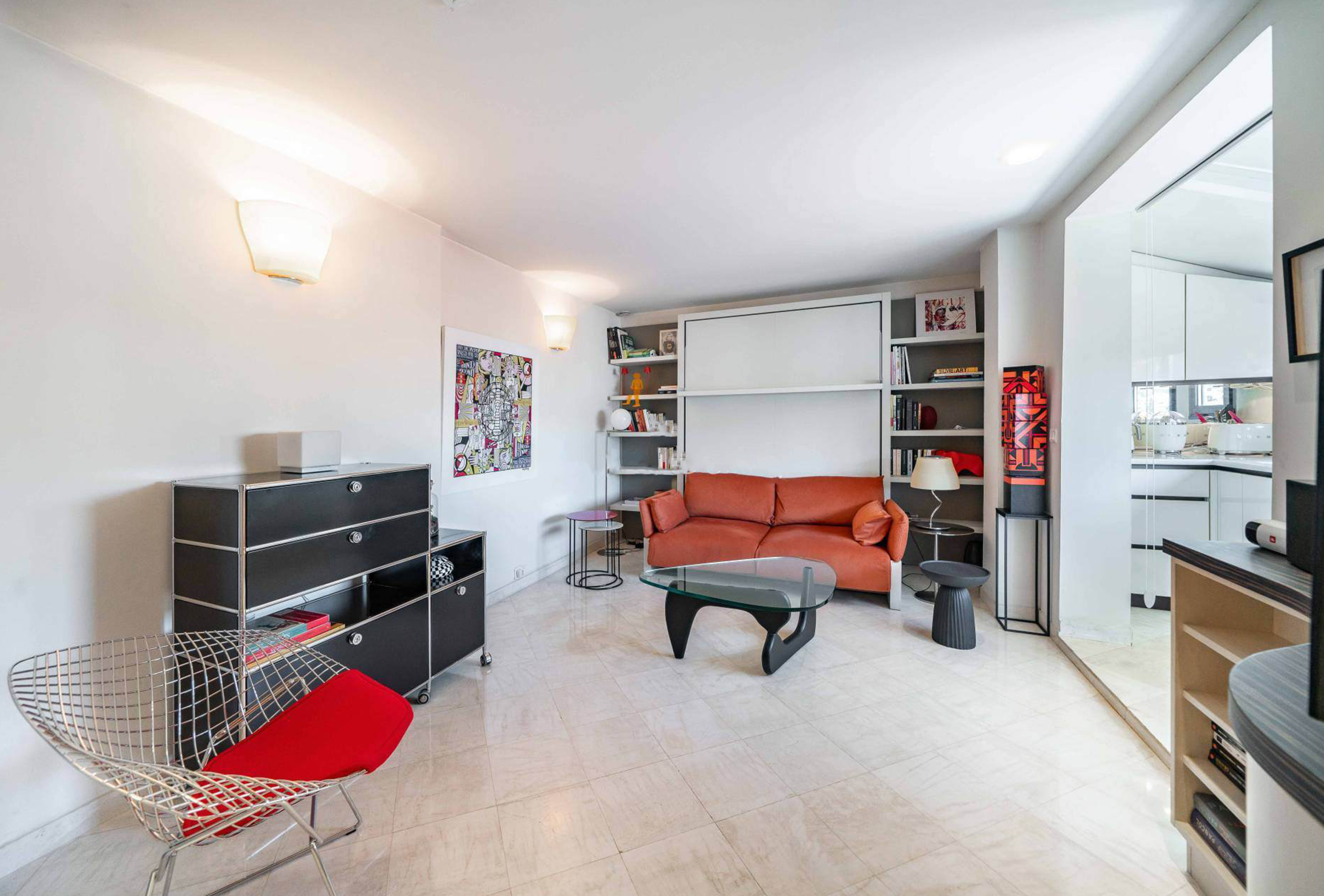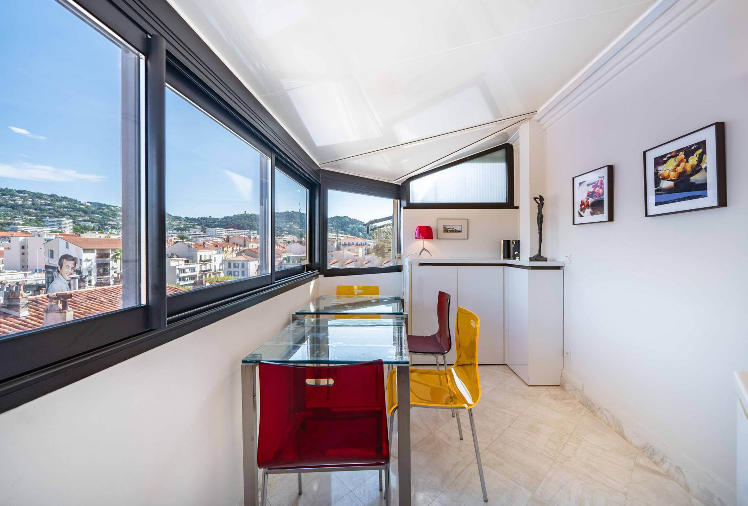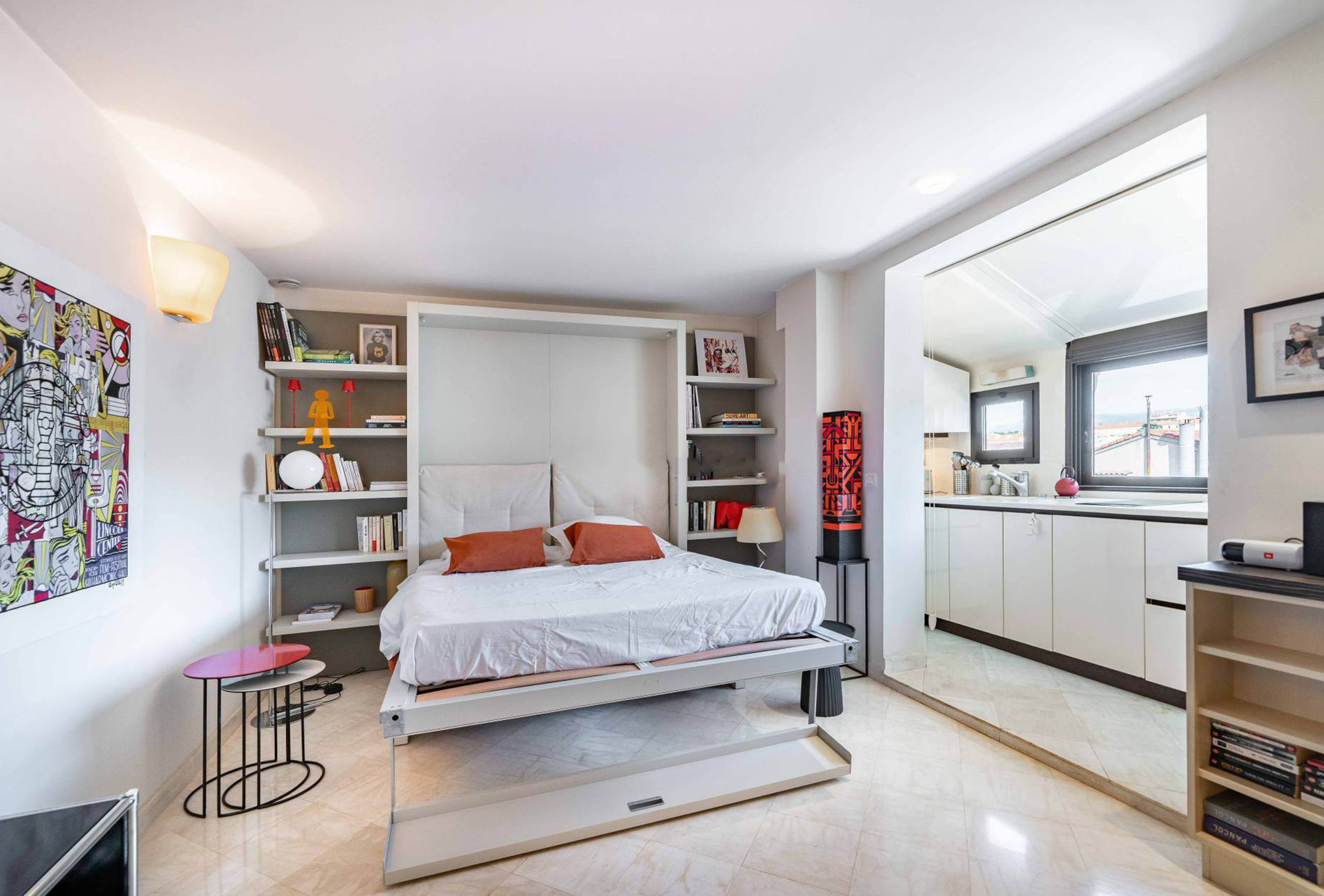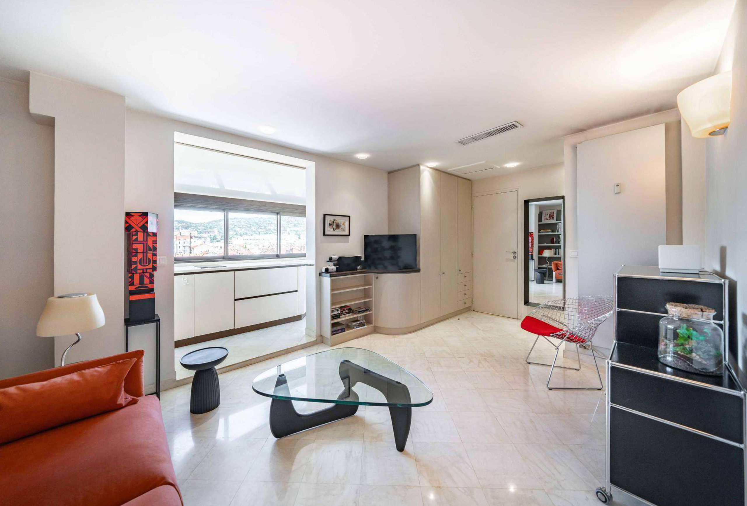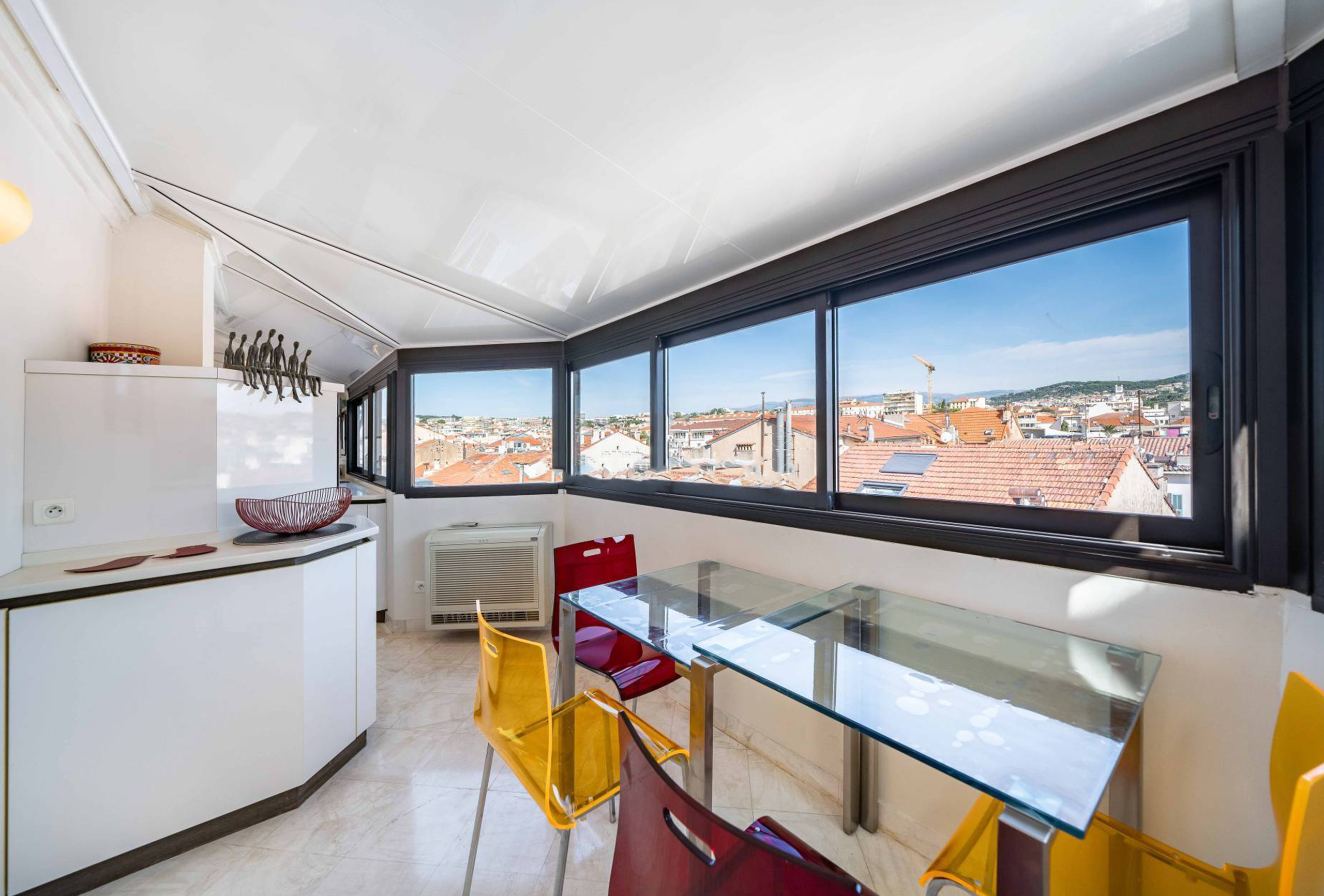 This charming studio apartment entirely renovated by an architect is ideally located in a pedestrian street in the center of Cannes. Large, bright and on the top floor, it has a clear view of the roofs and hills of the city. Perfectly equipped, this studio has a living room with a comfortable sofa bed, a kitchen and a dining area with a view and a bathroom. Less than a minute from the Rue d’Antibes and all the local shops, this studio enjoys an exceptional location.